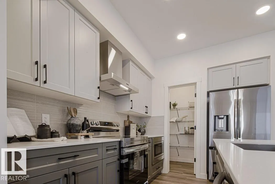 Built by Sterling Homes, this bright and well-designed duplex in Aster offers modern comfort in a family-friendly community. Triple pane windows and 9â ceilings create a warm, open main floor where luxury vinyl plank flooring ties the space together. The kitchen features quartz counters, a central island with seating, upgraded cabinetry, a chimney hood fan, built-in microwave, and a corner pantry. Large windows brighten the dining nook and great room, with a patio door leading to the backyard. Upstairs, a versatile bonus room adds extra living space, while the primary suite offers a walk-in closet and a 3-piece ensuite. Two additional bedrooms, a full bath, and upper-floor laundry complete the layout. With a double attached garage with floor drain, a separate side entrance, upgraded finishes, and basement rough-ins, this home blends value, comfort, and practicality in a vibrant southeast neighbourhood. (id:27476)