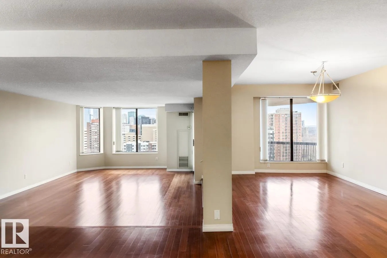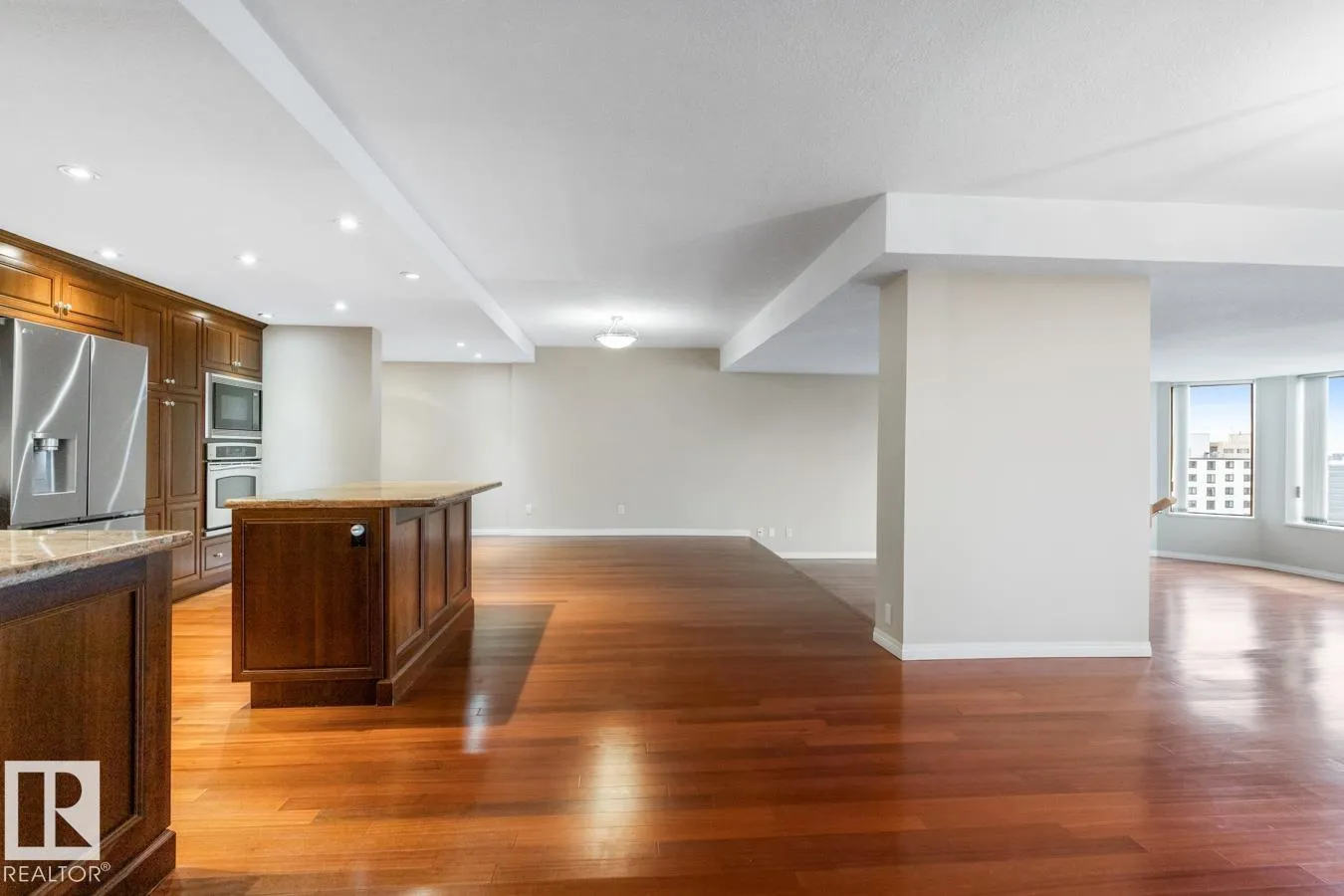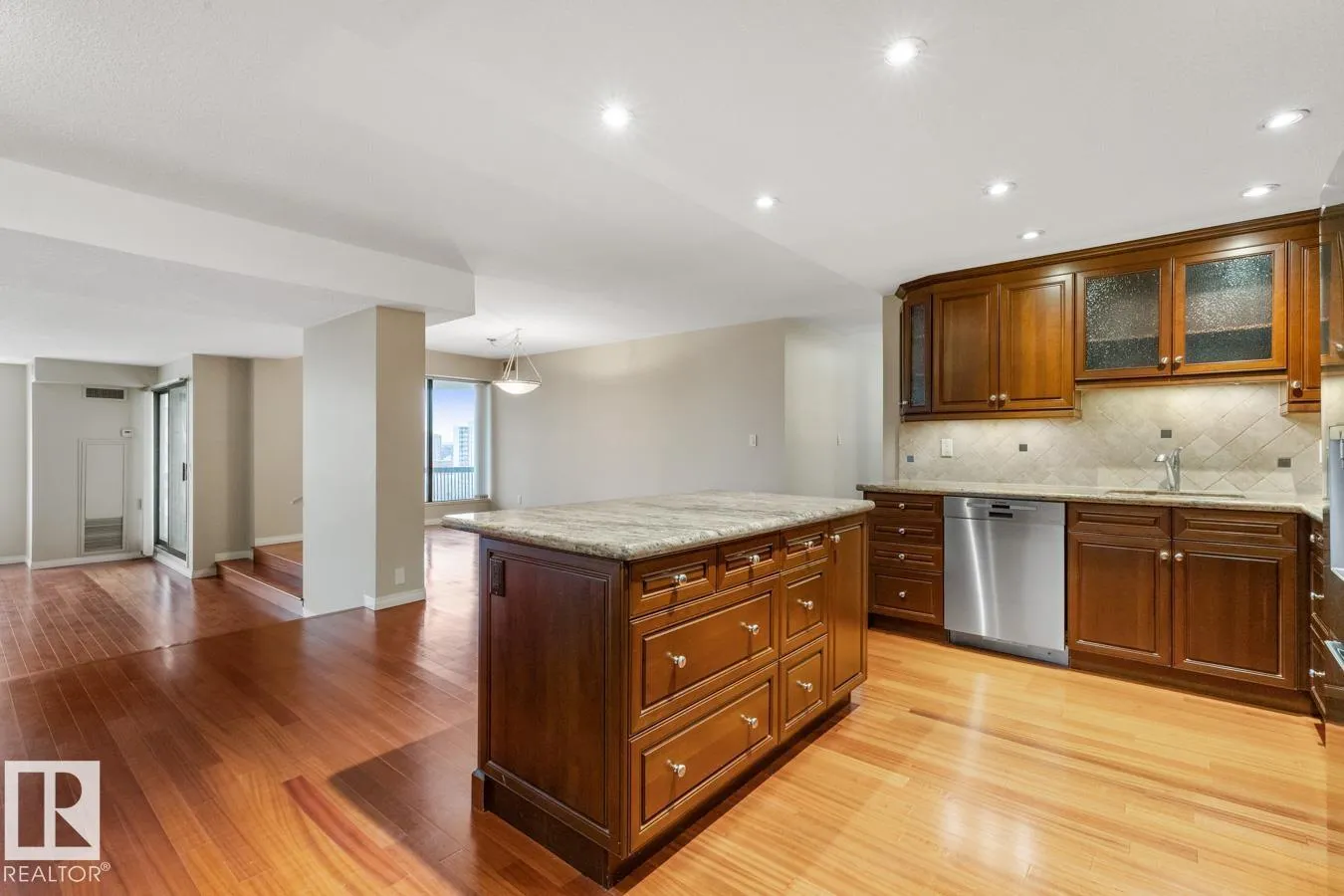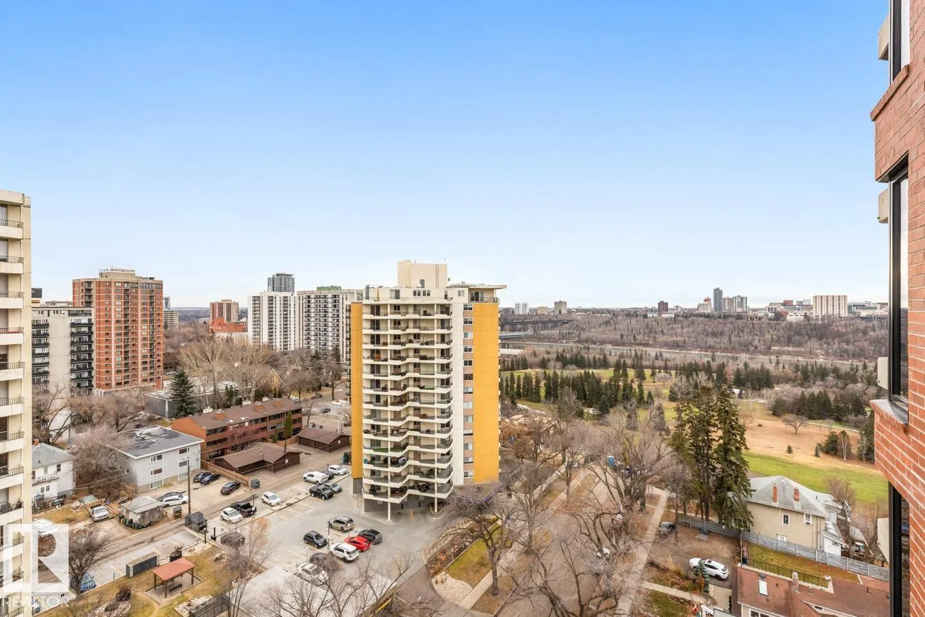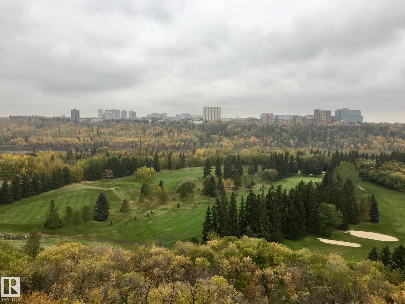 An exceptional opportunity to own a renovated 15th-floor residence in LeMarchand Tower offering over 1,900 sq ft of refined living beside the river valley. Redesigned into an open-concept layout by Anthem Construction, it features Brazilian hardwood floors, a welcoming foyer and a glass French-door coat closet. The sunken living room and formal dining room create an elegant, inviting space for entertaining. The custom kitchen boasts rich cabinetry, granite countertops, premium appliances, an island, breakfast nook, pot lighting and a butler's pantry. The primary bedroom has his-and-hers closets and a spa inspired ensuite. The second bedroom includes dual closets, and the main bathroom is a beautifully finished 4-piece. A generous laundry/storage room with newer washer and dryer and two underground parking stalls complete the home. Building amenities includes a chandeliered lobby, secure video entry and a multi-use social room, guest suite; all steps from the river valley, Victoria Golf Course, and trails. (id:27476)