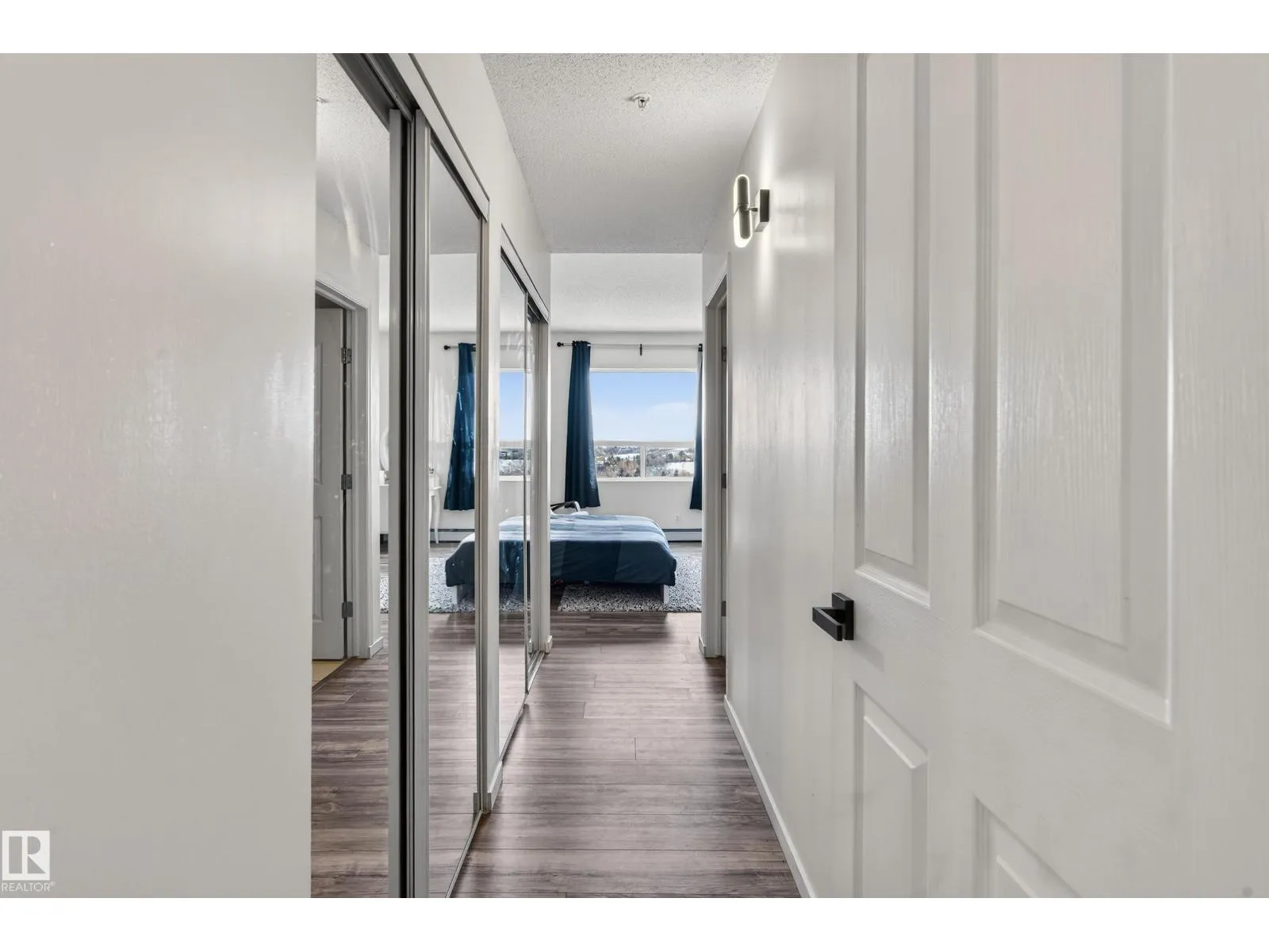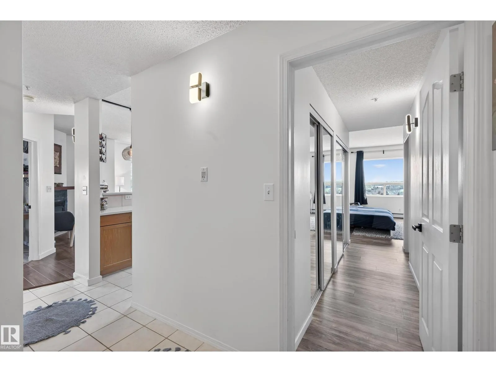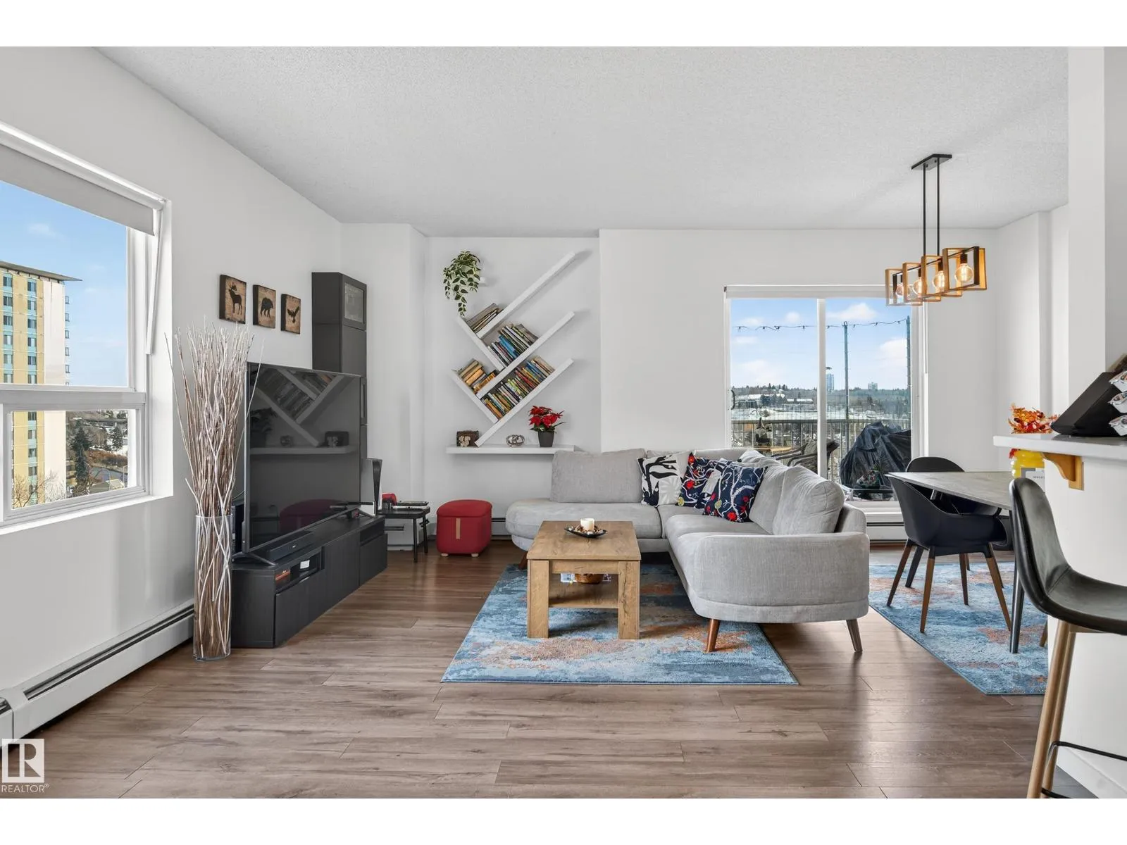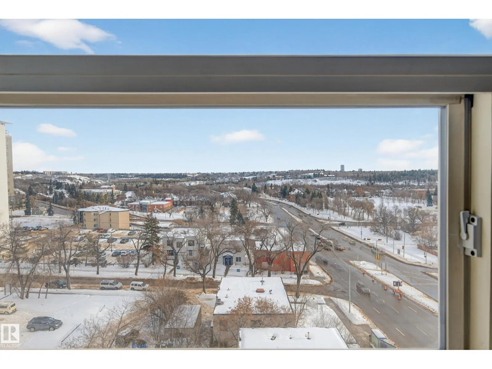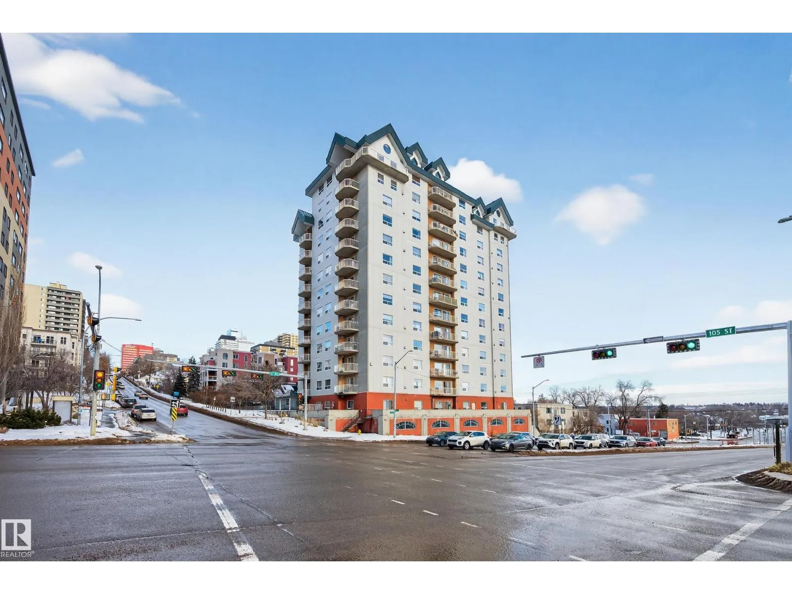 Live in the heart of downtown with stunning river valley views and over 1200 sq ft of living space in this beautiful corner unit! This two bedroom, two bathroom unit has titled underground parking and many updates such as flooring, lighting, paint + more. Located on the seventh floor of a concrete high-rise, you are a short walk from the LRT/transit system, Grant MacEwan, Norquest, Rogers Place, and the heart of the river valley trail system. The open-concept galley kitchen features stainless steel appliances, ample cupboard space and a oversized raised eating bar perfect for entertaining. The master bedroom easily fits a king-size bedroom set and boasts a five-piece ensuite with dual sinks. A second bedroom works as a bedroom or home office plus a 3pc bathroom. Enjoy the convenience of in-suite laundry & storage. Relax on your private balcony and take in city and river valley views. The building is pet friendly with board approval. Move in and embrace the ultimate river valley lifestyle! (id:27476)