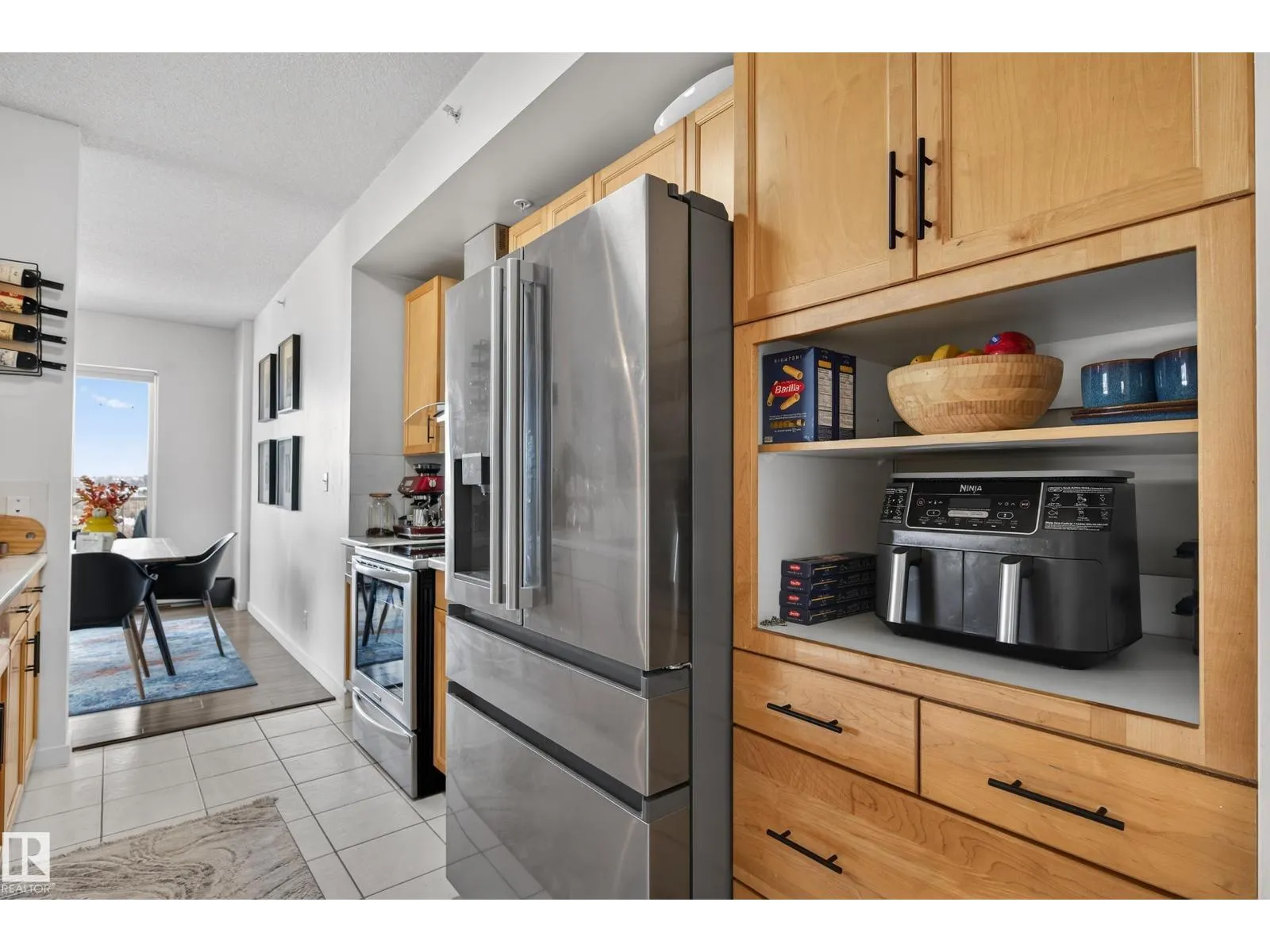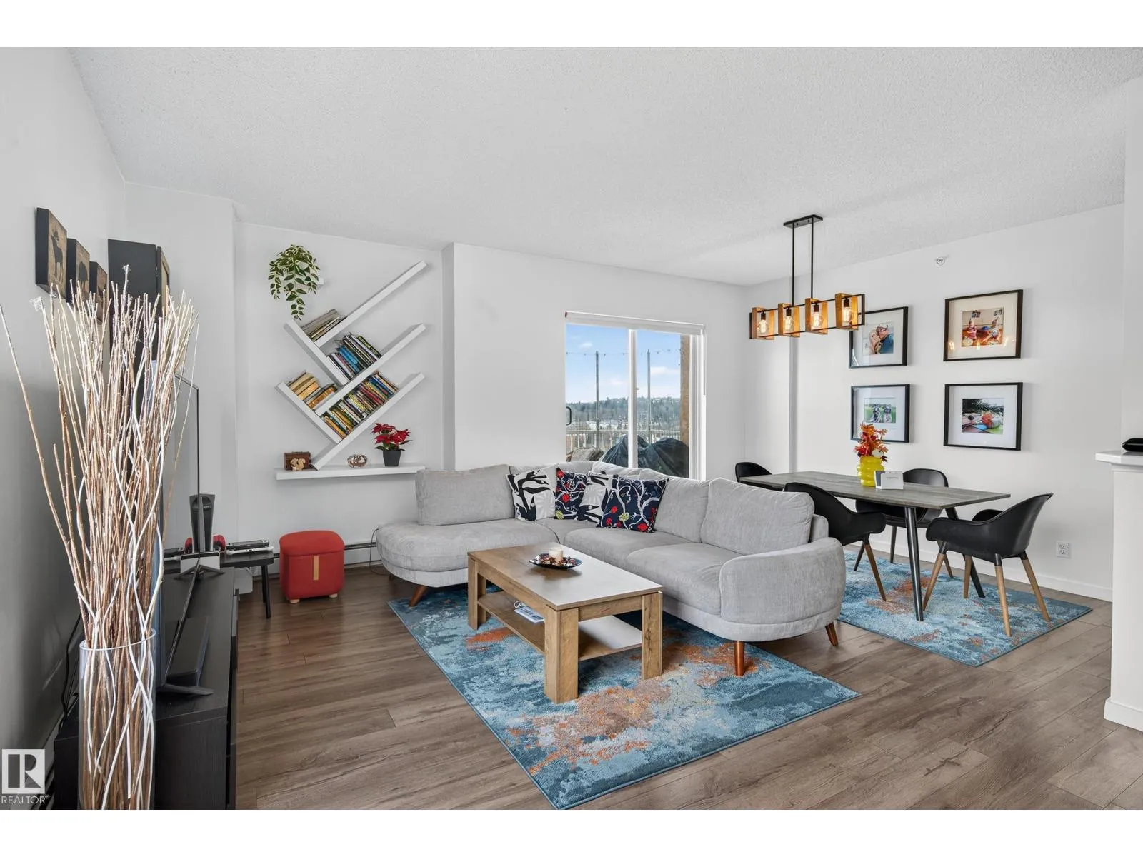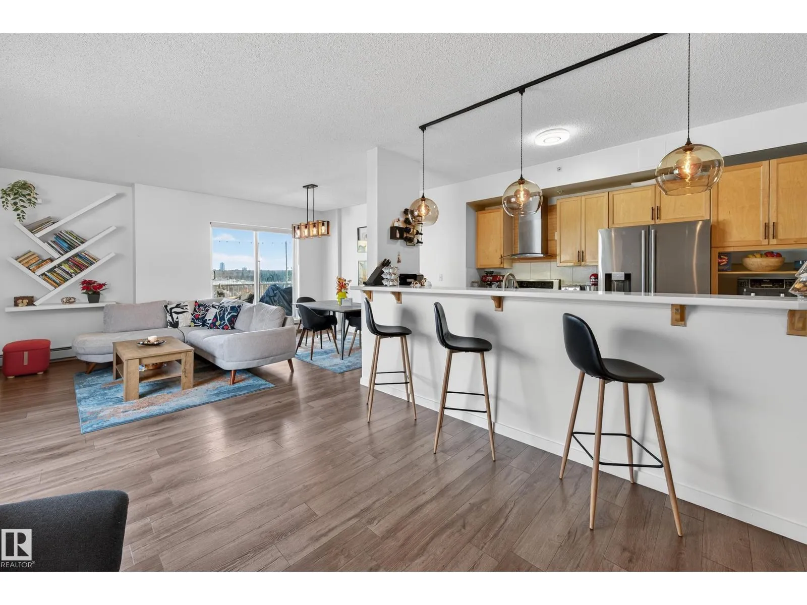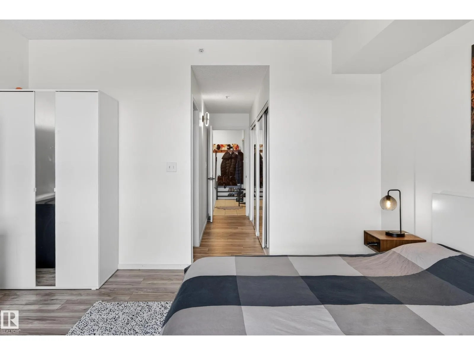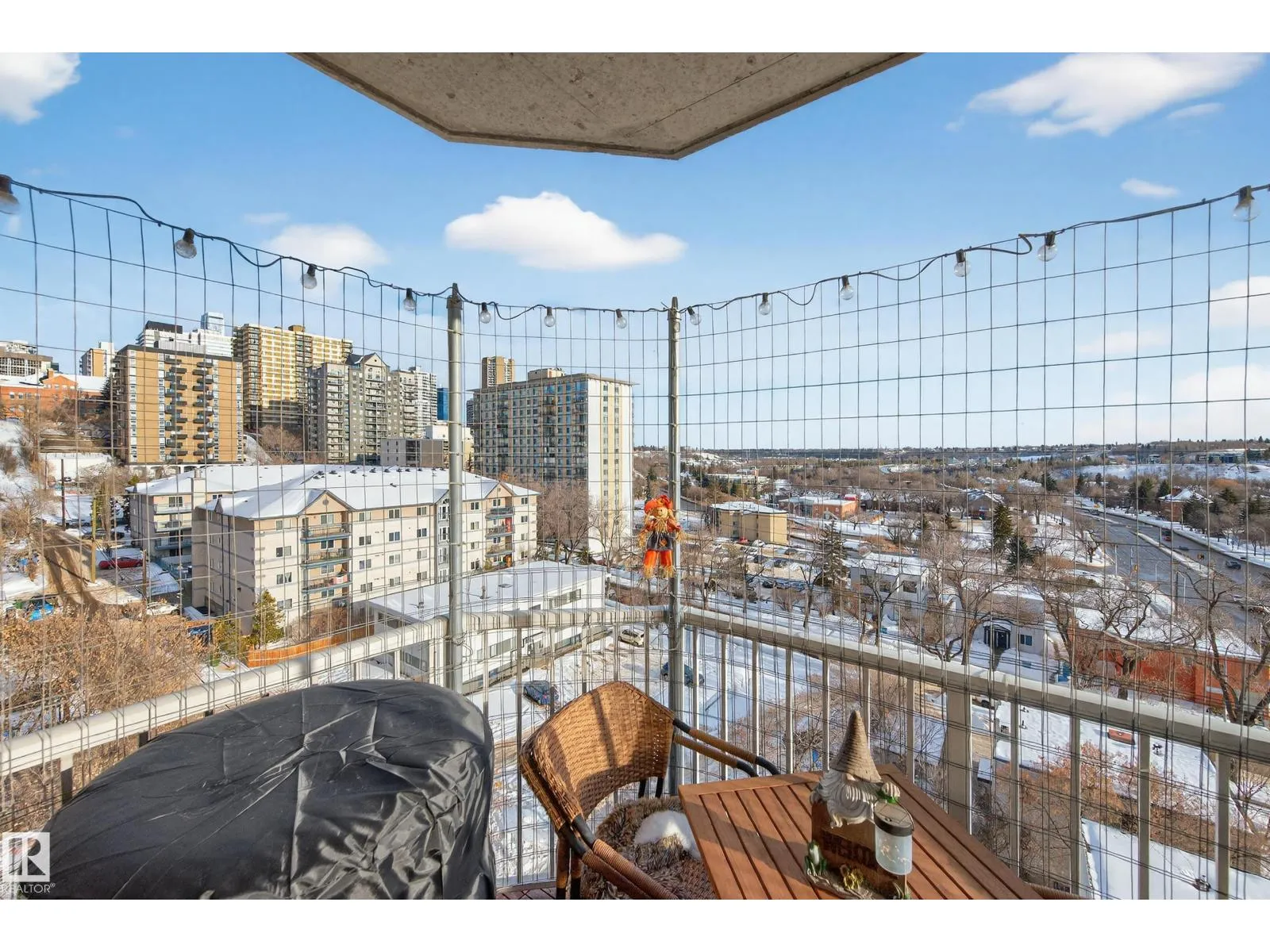 Live in the heart of downtown with stunning river valley views and over 1200 sq ft of living space in this beautiful corner unit! This two bedroom, two bathroom unit has titled underground parking and many updates such as flooring, lighting, paint + more. Located on the seventh floor of a concrete high-rise, you are a short walk from the LRT/transit system, Grant MacEwan, Norquest, Rogers Place, and the heart of the river valley trail system. The open-concept galley kitchen features stainless steel appliances, ample cupboard space and a oversized raised eating bar perfect for entertaining. The master bedroom easily fits a king-size bedroom set and boasts a five-piece ensuite with dual sinks. A second bedroom works as a bedroom or home office plus a 3pc bathroom. Enjoy the convenience of in-suite laundry & storage. Relax on your private balcony and take in city and river valley views. The building is pet friendly with board approval. Move in and embrace the ultimate river valley lifestyle! (id:27476)