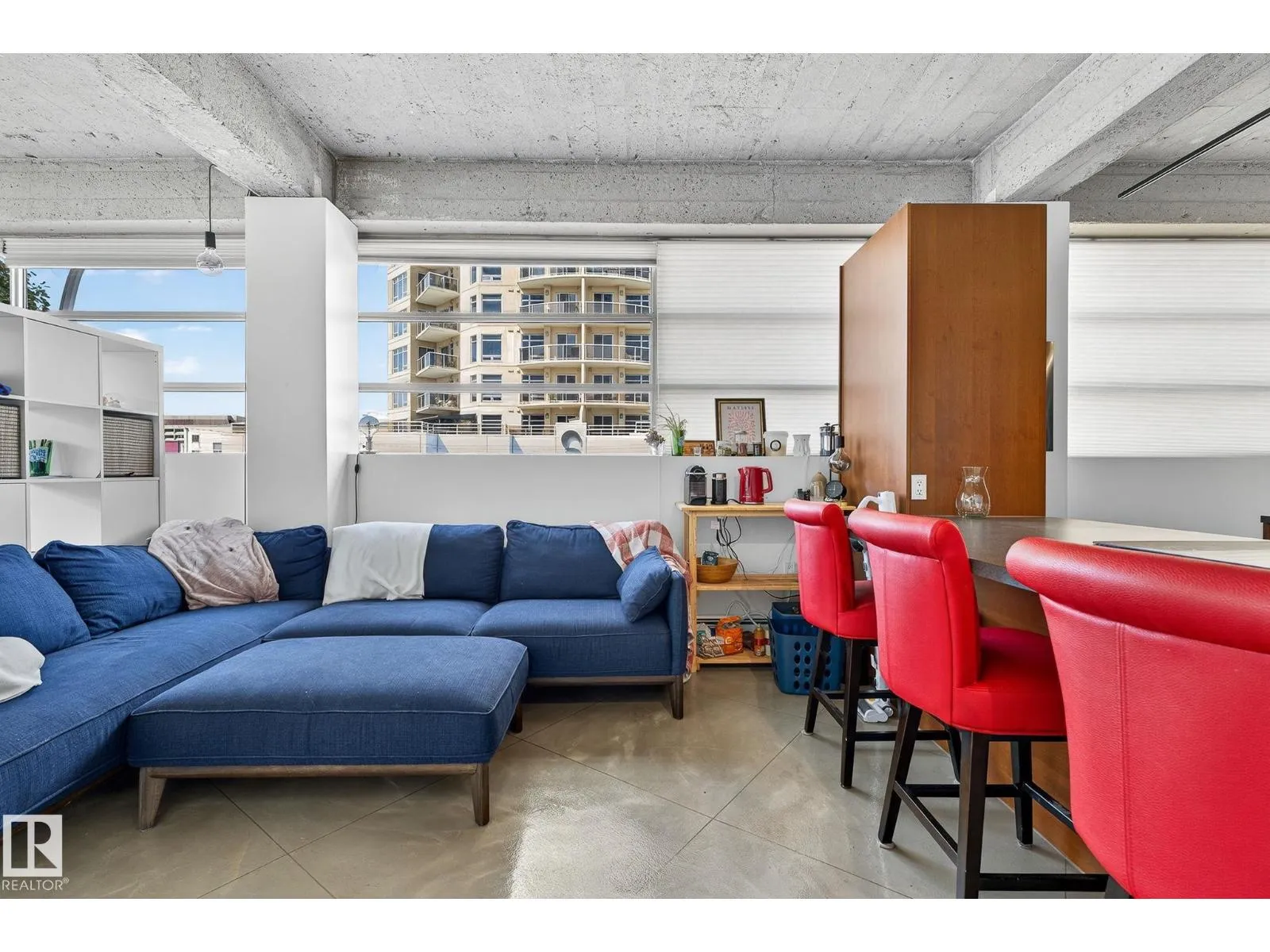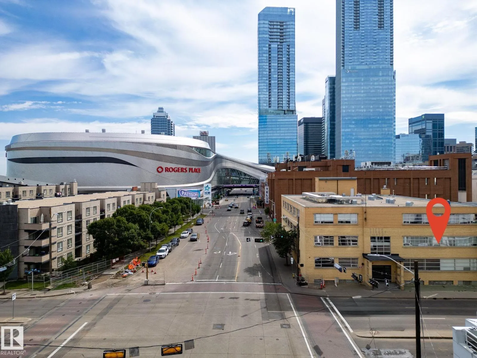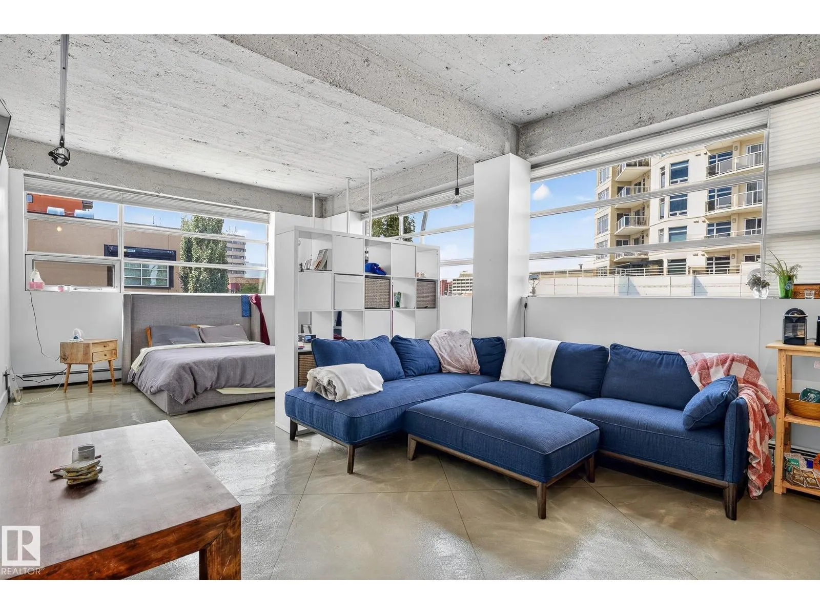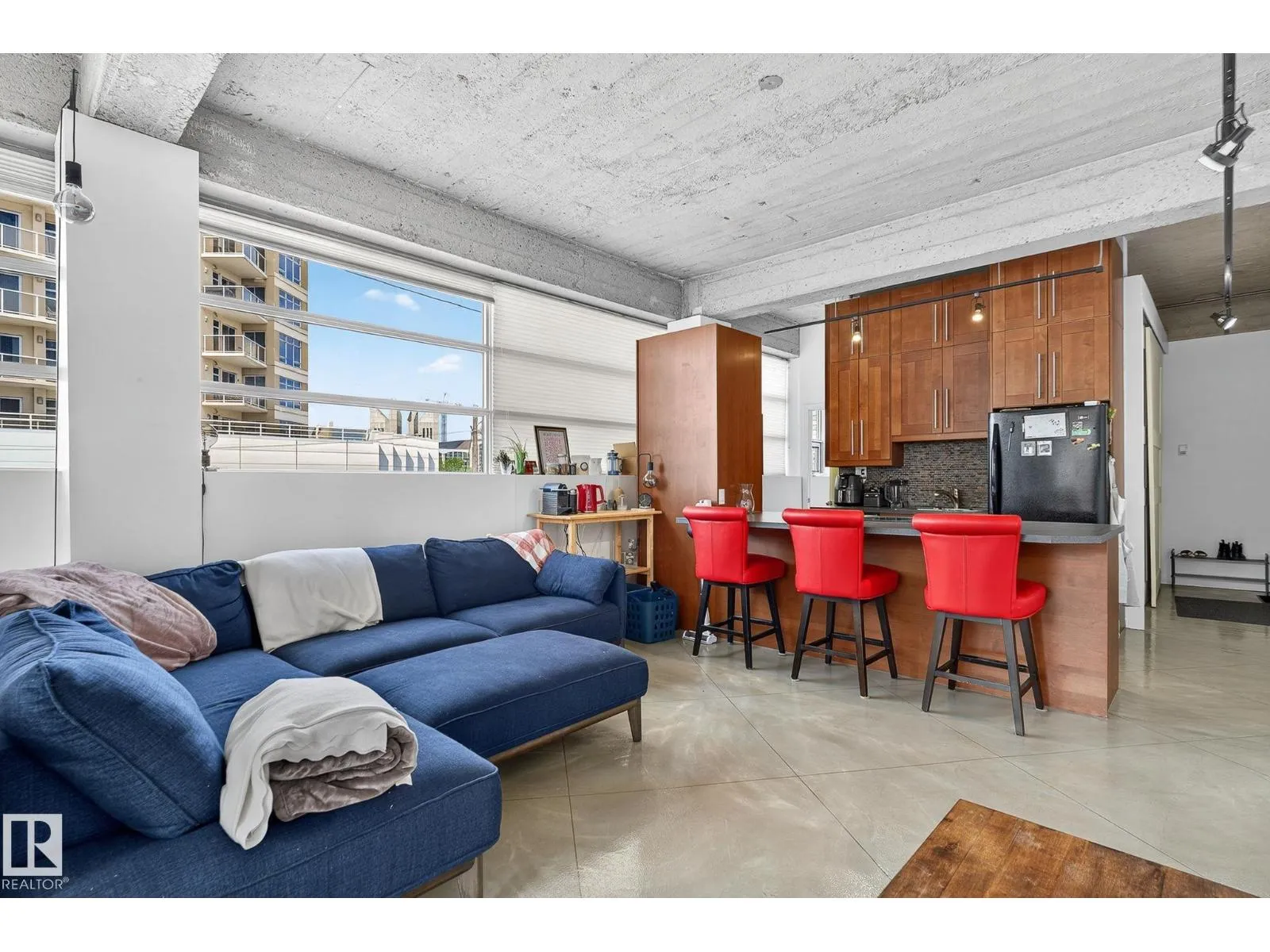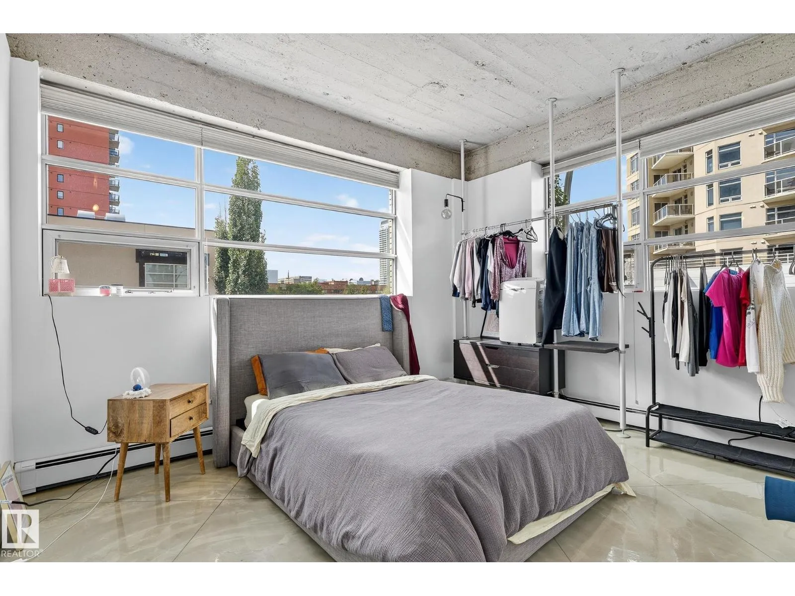 FIFTH STREET LOFTS! RARE CORNER UNIT WITH WRAP-AROUND WINDOWS! Looking for a turnkey rental? MOST OF THE FURNITURE IS INCLUDED (bed, couch, coffee table, bar stools, night stand) IF BUYER DESIRES! This building was initially built by Poole Construction (PCL) in 1951 for the Goodyear Tire Company, and was later converted into lofts by renowned local firm Dub Architects in 1999. You will love this bright corner unit with 12ft ceilings, updated kitchen, & polished concrete flooring! This location can't be beat. You are steps from Grant MacEwan University, Rogers Place, Downtown's best restaurants, pubs, & coffee shops. Quick access to LRT, UofA, & River Valley. This condo is perfect for Downtown professionals, students, or anybody who enjoys living in a unique property with central location. Unit comes with a secured (gated) & energized parking stall, plus an indoor storage cage! Own a unique piece of Edmonton's history while enjoying a stylish, affordable condo and incredible location! Come check it out! (id:27476)