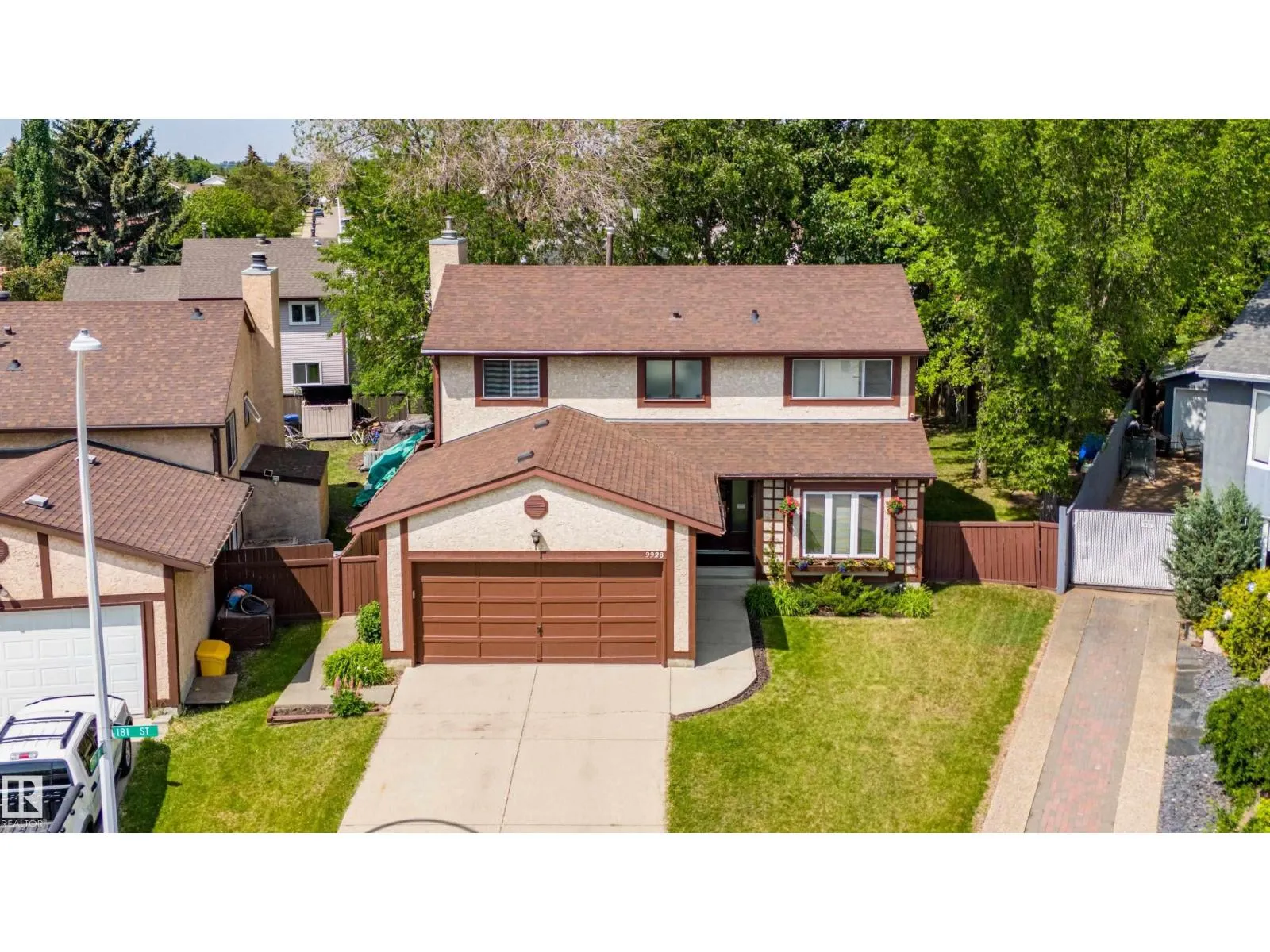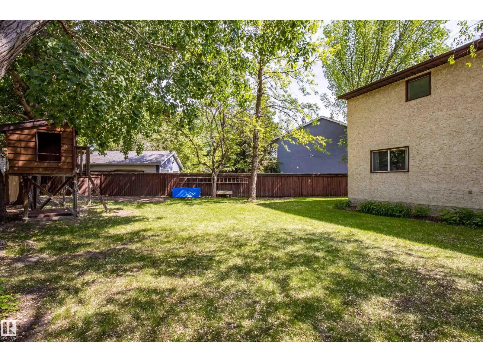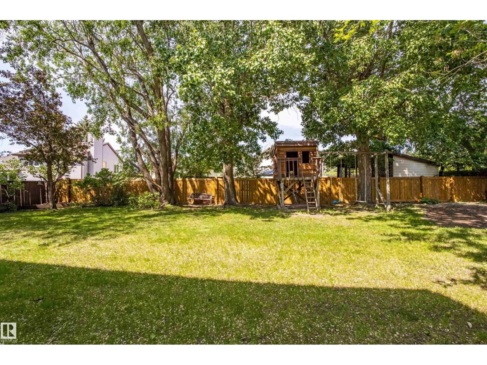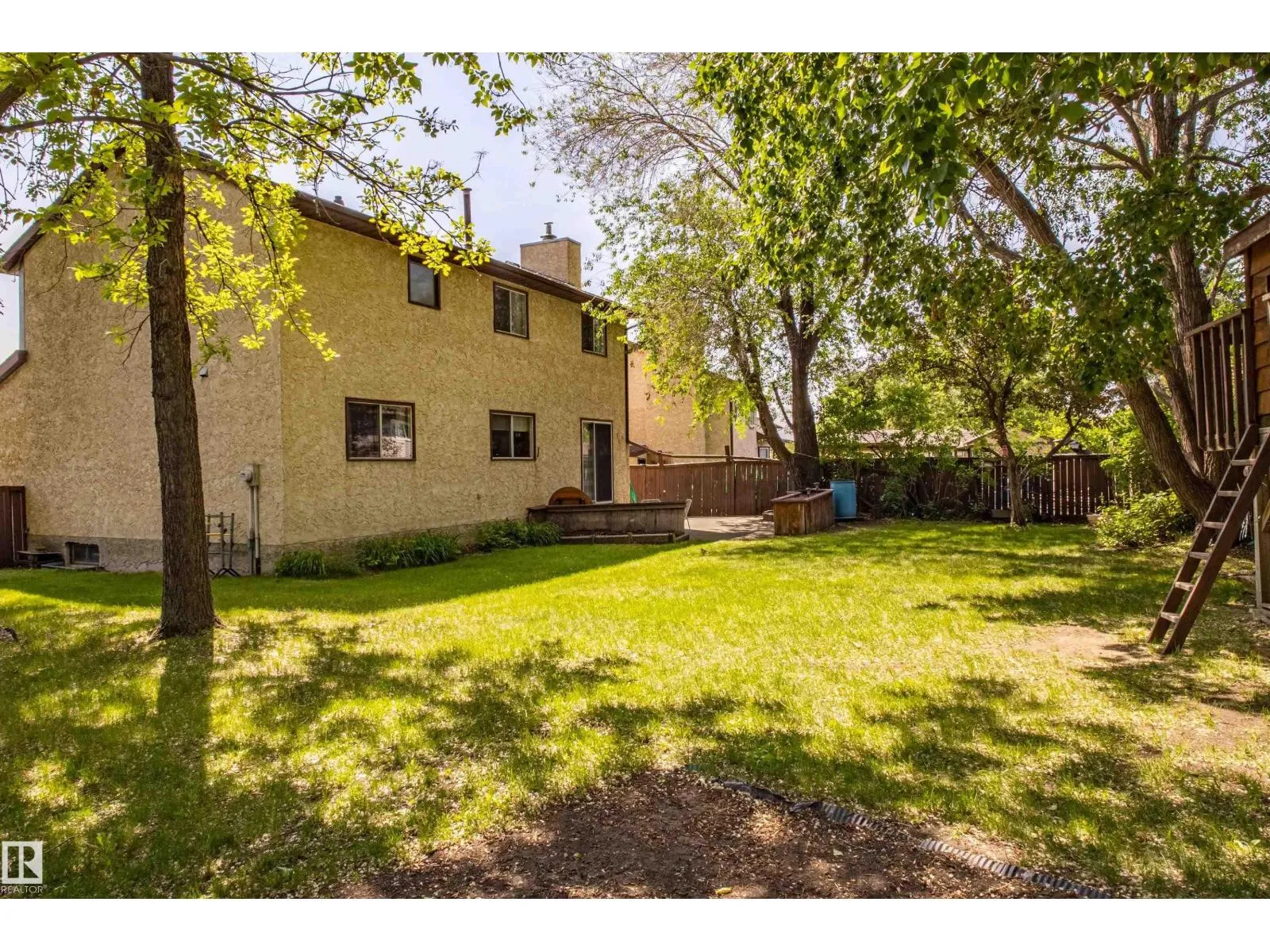 This spacious home is tucked away in a pie-shaped lot, surrounded by mature trees, in a quiet corner of LaPerle, with a cul-de-sac feel. Freshly painted and ready for it's next family. Upstairs you'll find FOUR bedrooms with newer carpet and a 4-piece bath. The large primary bedroom has a walk-in closet and your own 4-piece ensuite. On the main floor: a bright front living room with vinyl window (2017), newer hardwood in the dining room, a roomy kitchen with a newer dishwasher, family room with wood-burning stove insert, 2-piece bathroom, plus a convenient laundry space with a newer dryer. The partly finished basement is roughed in for a future 4th bathroom and has space for a 5th bedroom. Updates include: roof (2018), furnace fan motor (2023), water heater (2021, under warranty), back fence (2024), and exterior wood trim painted in 2023. In the large private backyard, find a playhouse with a sandbox and swings! Just a 15-min walk to La Perle School, minutes to shopping, and quick access to freeways. (id:27476)