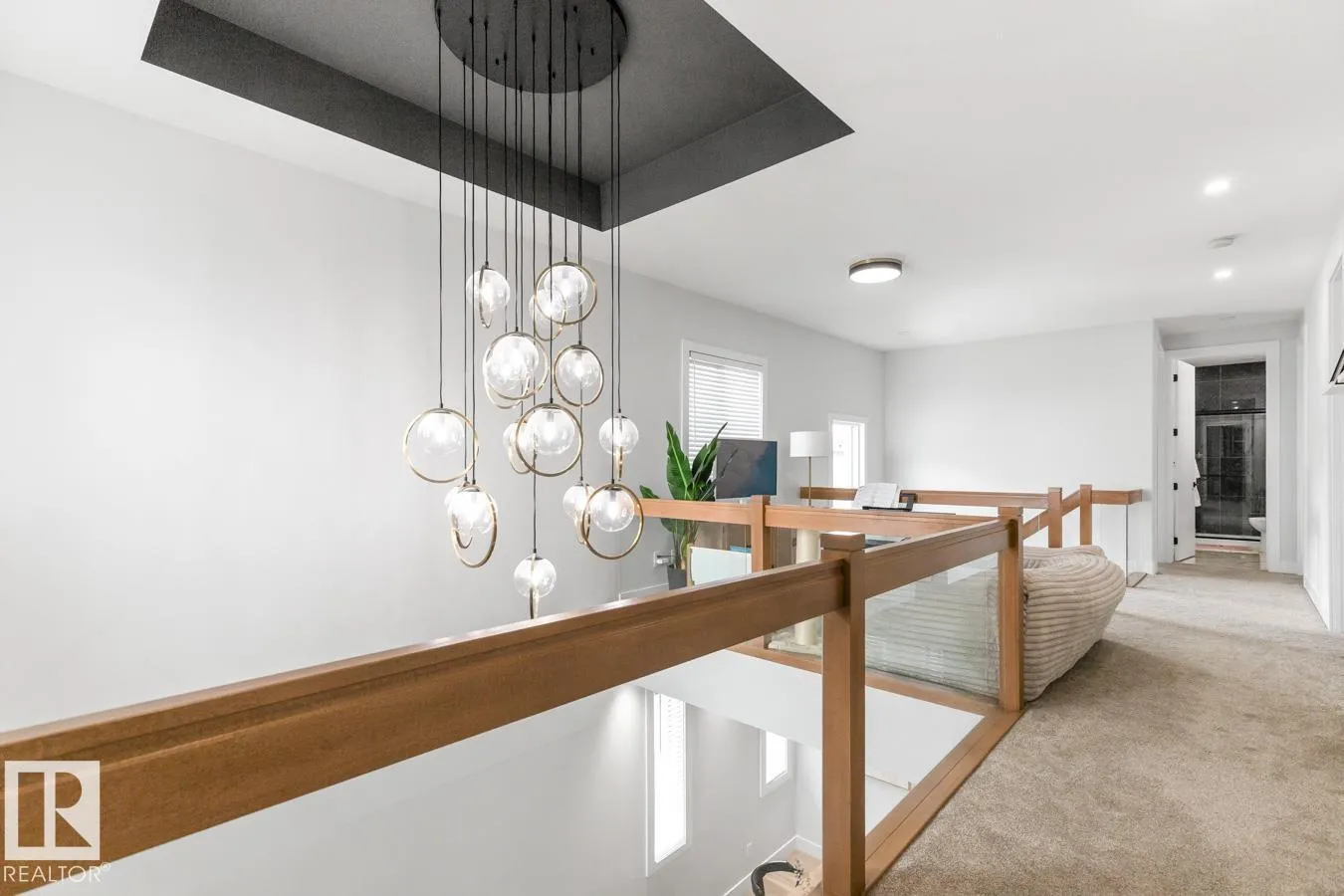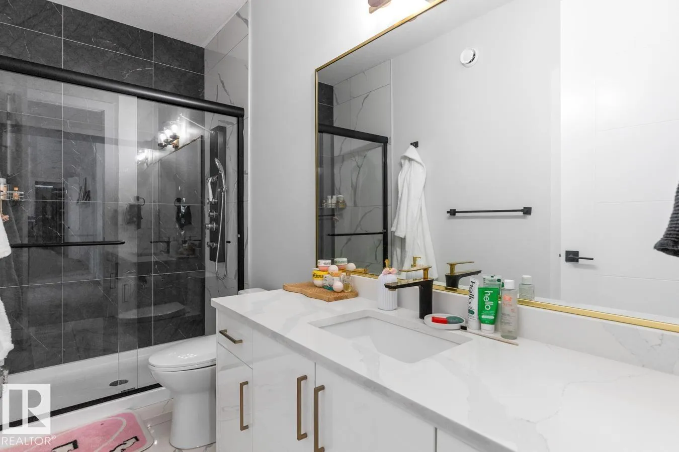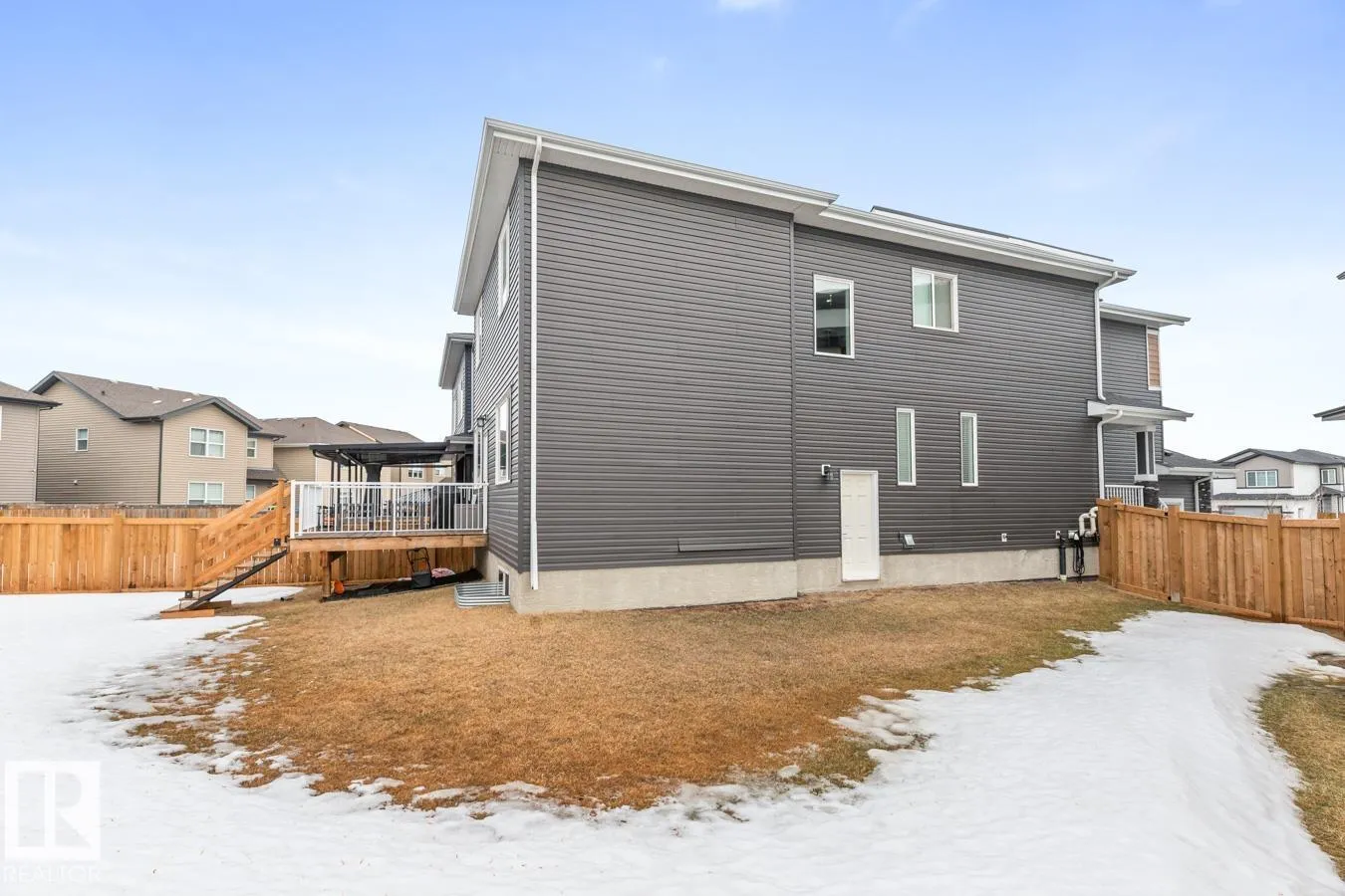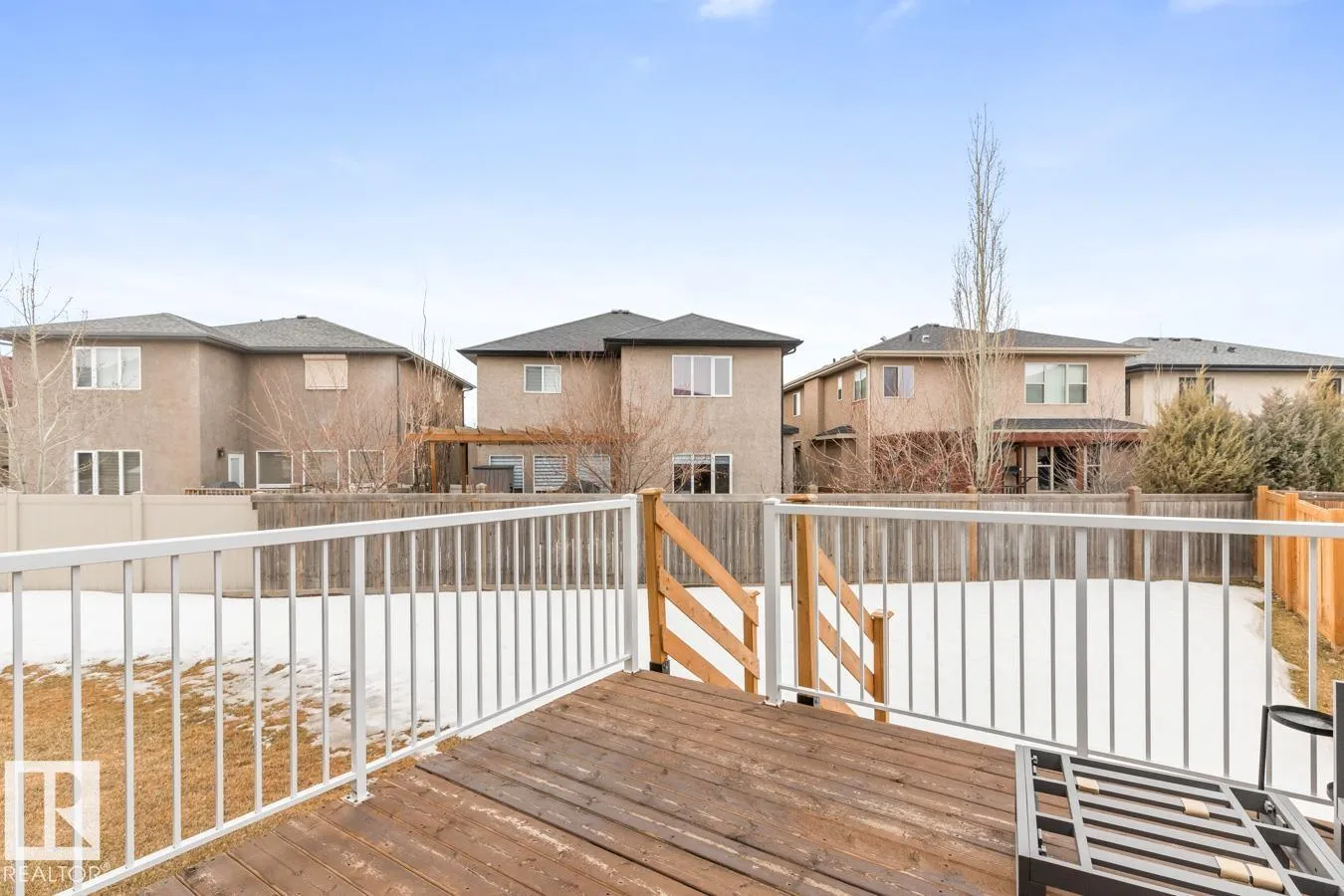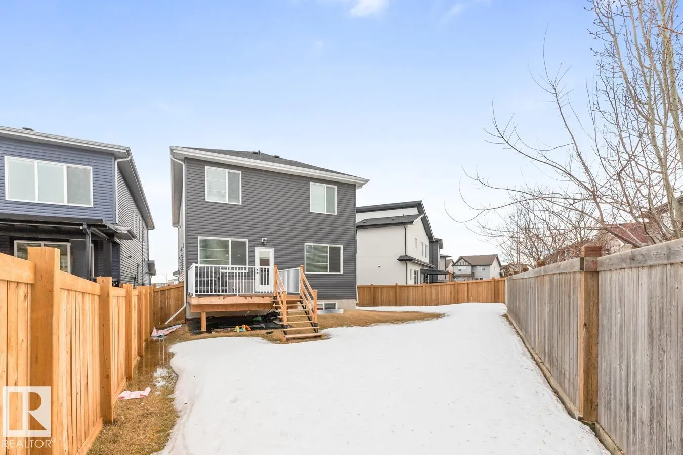 Deluxe Custom Built home on a pie shape lot in a Cul De Sac featuring 5 Bedrooms, & 4 Baths. You will enjoy 9 foot ceilings on all levels and an opening from the main to the upper floor giving a airy open feeling. 8 ft doors all around. Main floor has a living room, family room, formal dining room, bedroom, full bath, and a spacious kitchen with large island, upgraded cabinetry, quartz countertops/backsplash, breakfast nook and a adjoining spice kitchen with a gas stove. Family room has a decorative electric fireplace and designed ceilings. The upper floor has four good size bedrooms. The master suite has a walk in closet, indent ceilings, huge ensuite with separate shower and jetted tub. Two other bedrooms having a jack & Jill bath also a fourth bedroom and a third bathroom. Upstairs laundry and a loft/bonus room and glass railings. The basement is open for future development with a separate side entrance. Located in the great neighbourhood of Schonsee close to Henday, shopping, lake, park, and bus. (id:27476)
