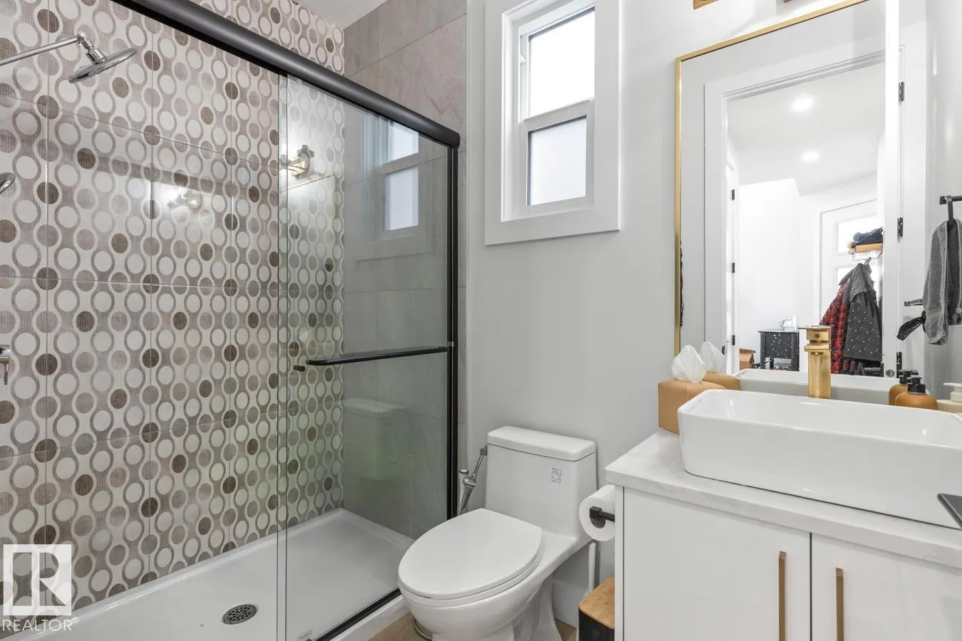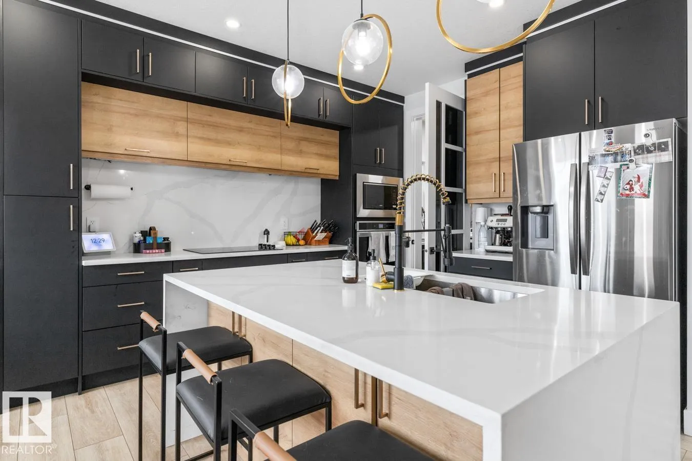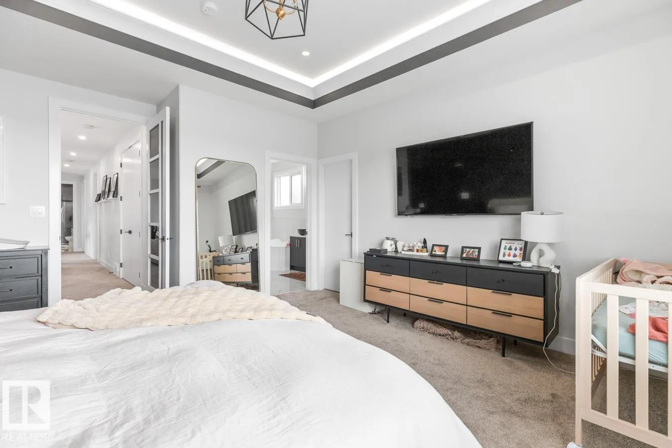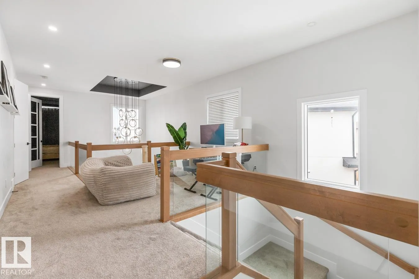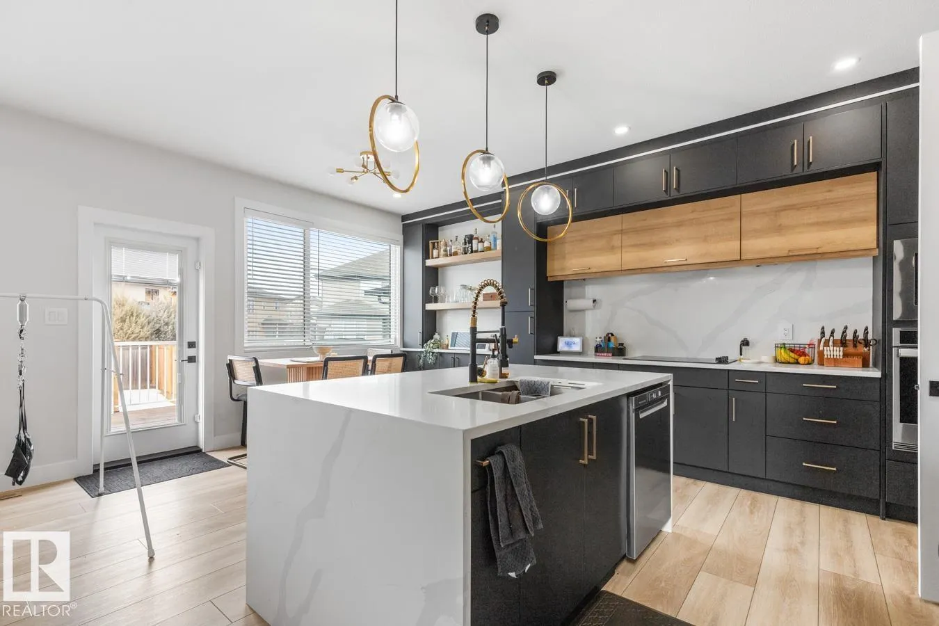 Deluxe Custom Built home on a pie shape lot in a Cul De Sac featuring 5 Bedrooms, & 4 Baths. You will enjoy 9 foot ceilings on all levels and an opening from the main to the upper floor giving a airy open feeling. 8 ft doors all around. Main floor has a living room, family room, formal dining room, bedroom, full bath, and a spacious kitchen with large island, upgraded cabinetry, quartz countertops/backsplash, breakfast nook and a adjoining spice kitchen with a gas stove. Family room has a decorative electric fireplace and designed ceilings. The upper floor has four good size bedrooms. The master suite has a walk in closet, indent ceilings, huge ensuite with separate shower and jetted tub. Two other bedrooms having a jack & Jill bath also a fourth bedroom and a third bathroom. Upstairs laundry and a loft/bonus room and glass railings. The basement is open for future development with a separate side entrance. Located in the great neighbourhood of Schonsee close to Henday, shopping, lake, park, and bus. (id:27476)