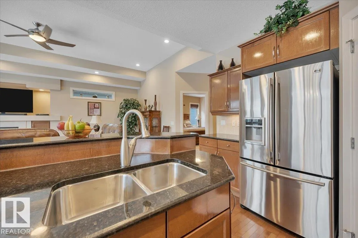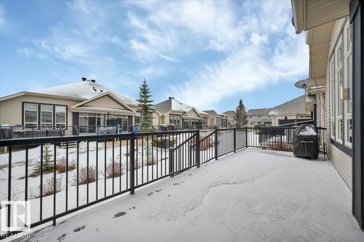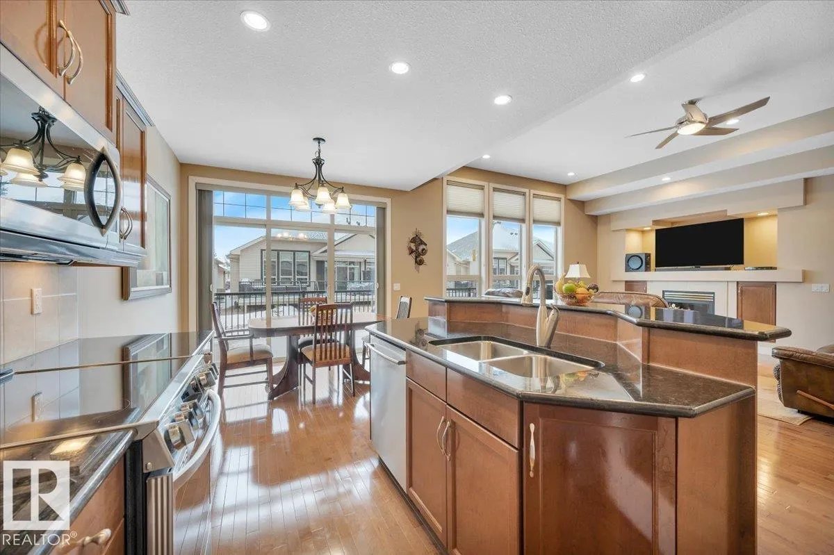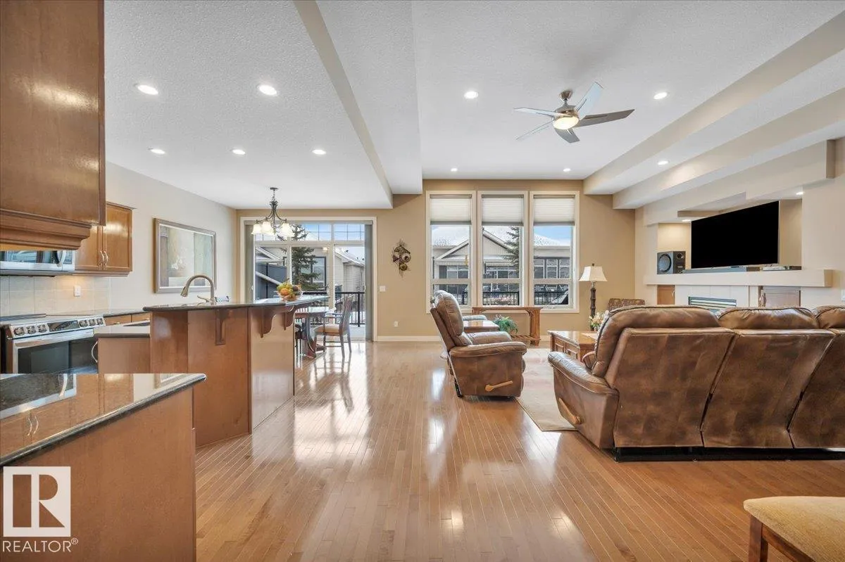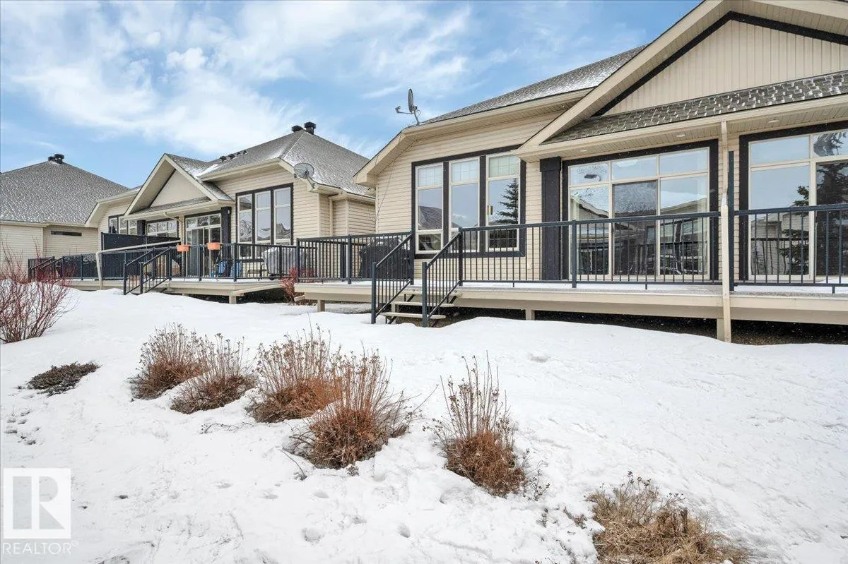 Welcome to BRINDAVAN ESTATES! The perfect retirement community consisting of half duplex bungalows situated in a private setting with only local traffic, adjacent to a large pond which attracts ducks & a variety of birds. This A/C home has an open design with high ceilings & huge windows allowing plenty of natural light. Spacious living/dining room with gas fireplace, hardwood floors, gorgeous kitchen with island, granite counters, stainless steel appliances & walk-in pantry. The den offers privacy with French doors, the primary bedroom has a 5 piece ensuite and walk-in closet. Additional guest bathroom & laundry room complete the main floor. Excellent basement development perfect for out of town guests with two bedrooms, 4 pce bath, big recreation area with second gas fireplace, wet bar & fridge plus a hobby room & plenty of storage. In summer enjoy BBQs on the large deck & take leisurely walks on the trails nearby. Quick access to shopping & Anthony Henday Dr. You'll love the easy lifestyle here! (id:27476)