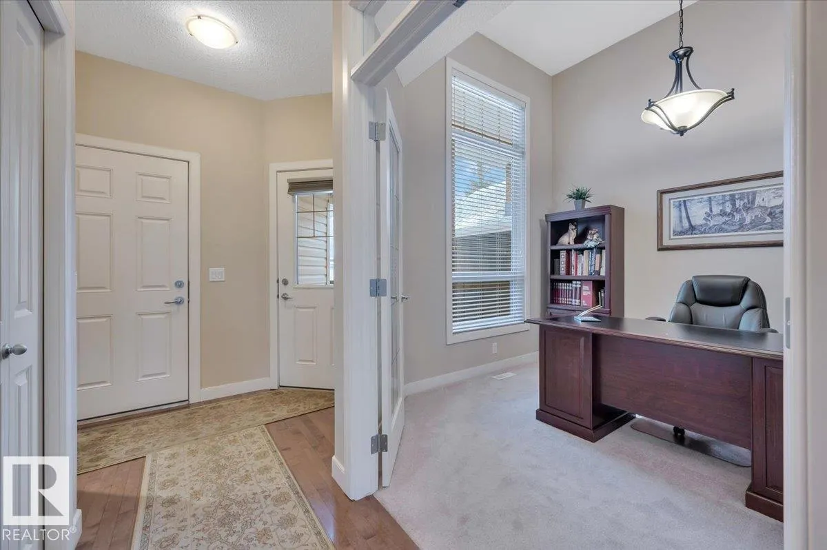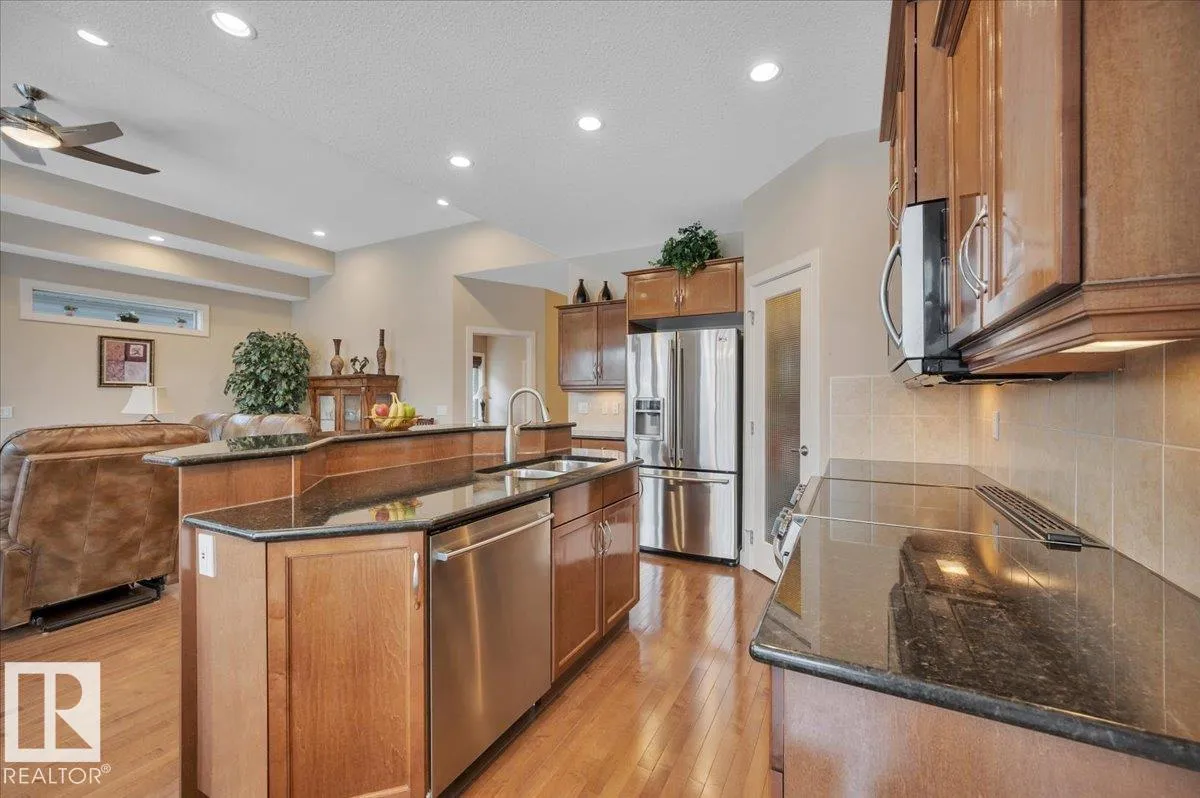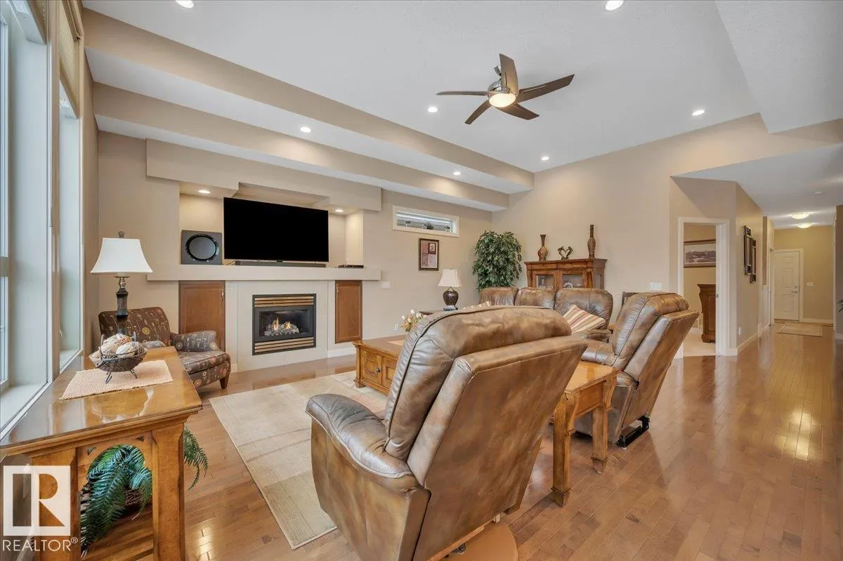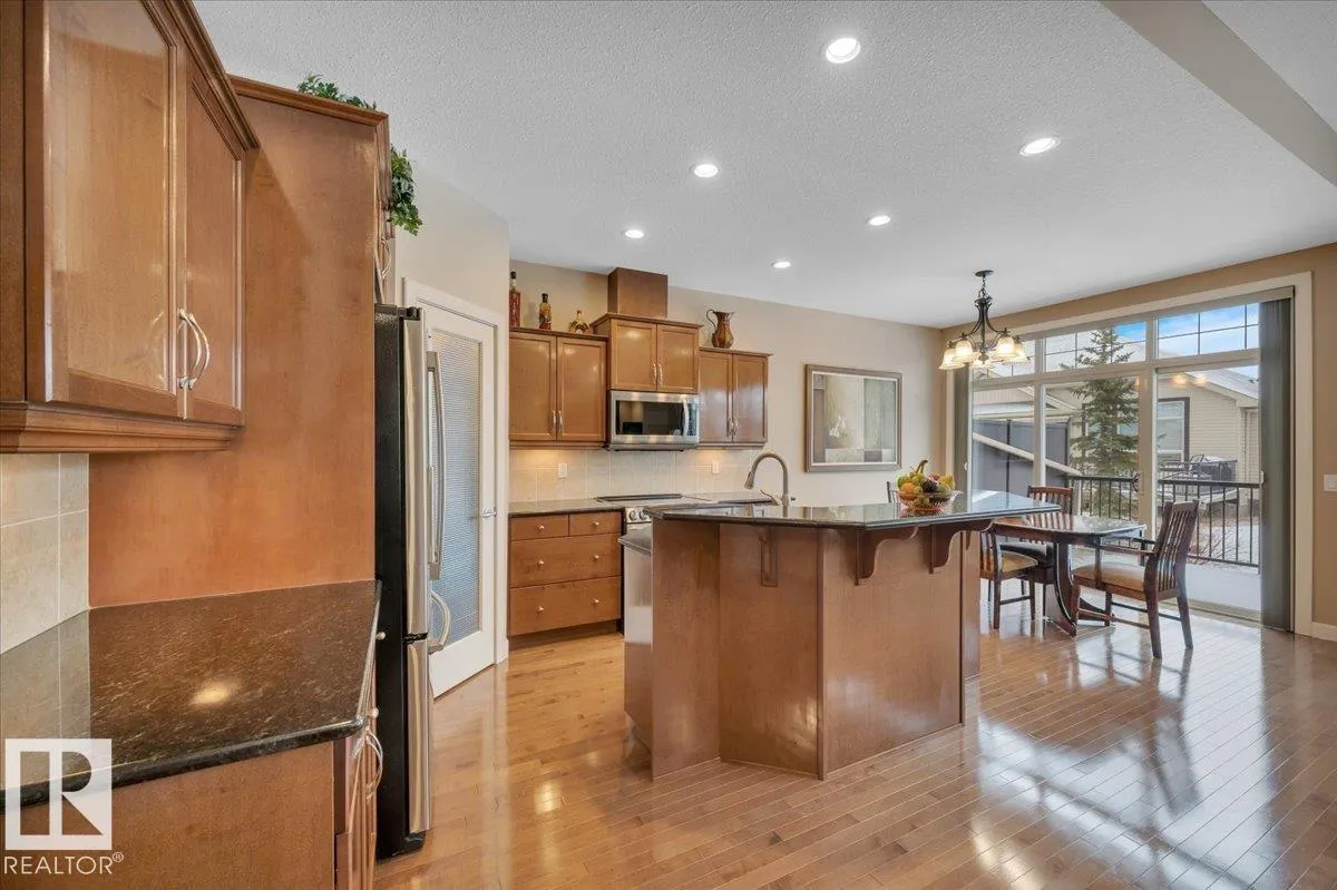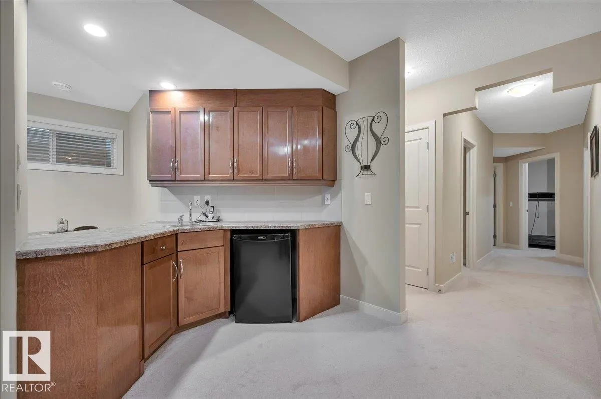 Welcome to BRINDAVAN ESTATES! The perfect retirement community consisting of half duplex bungalows situated in a private setting with only local traffic, adjacent to a large pond which attracts ducks & a variety of birds. This A/C home has an open design with high ceilings & huge windows allowing plenty of natural light. Spacious living/dining room with gas fireplace, hardwood floors, gorgeous kitchen with island, granite counters, stainless steel appliances & walk-in pantry. The den offers privacy with French doors, the primary bedroom has a 5 piece ensuite and walk-in closet. Additional guest bathroom & laundry room complete the main floor. Excellent basement development perfect for out of town guests with two bedrooms, 4 pce bath, big recreation area with second gas fireplace, wet bar & fridge plus a hobby room & plenty of storage. In summer enjoy BBQs on the large deck & take leisurely walks on the trails nearby. Quick access to shopping & Anthony Henday Dr. You'll love the easy lifestyle here! (id:27476)