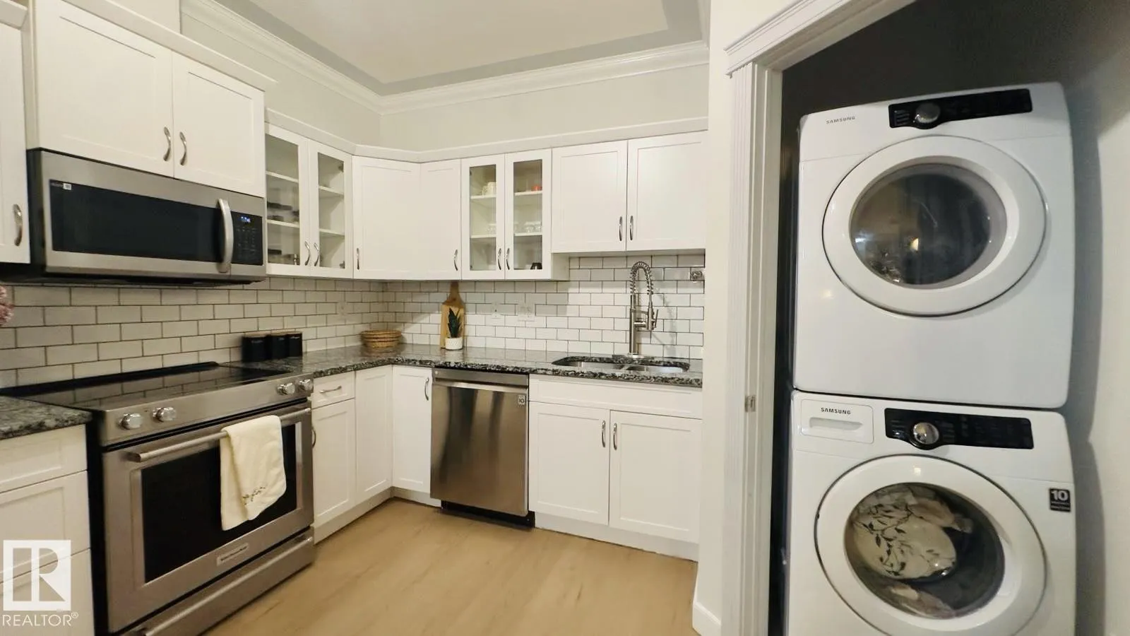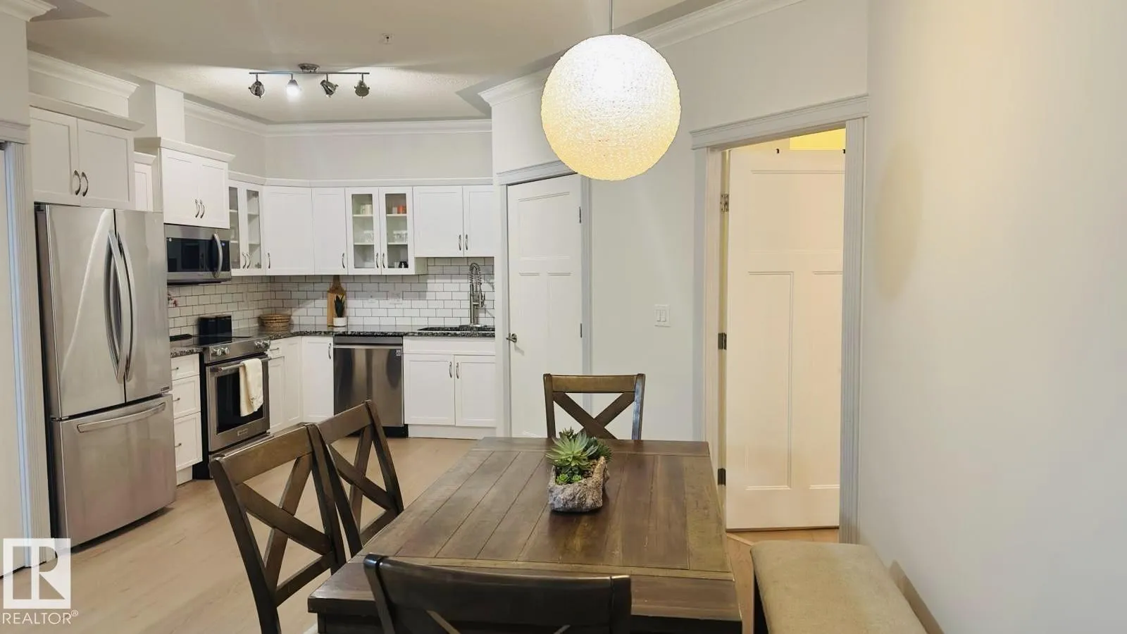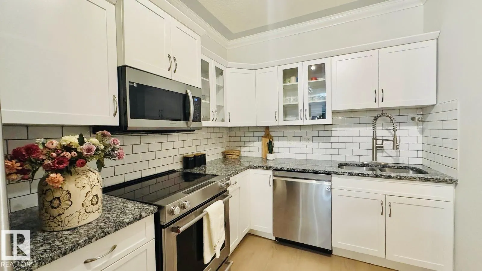 Experience FANTASTIC VALUE in this bright, open-concept 2-bedroom, 2-bathroom ground-floor retreat! The modern kitchen shines with GRANITE COUNTERTOPS, a stylish ceramic backsplash, and premium stainless-steel appliances. Elegance meets function with crown moldings, a spacious living area separating the bedrooms for privacy, and in-suite laundry. Pet owners will love the secure patio door offering direct outdoor access. This well-managed building boasts a fitness center, sauna, social room, and titled underground parking. Nestled in a vibrant Northeast Edmonton hub, you are minutes from the scenic River Valley and Clareview Recreation Centre. Enjoy ultimate convenience with elite shopping at Manning Town Centre and easy access to the LRT system for a seamless commute downtown or to the University. With the Anthony Henday and Manning Freeway nearby, this is a perfect home for starters, students, or investors seeking a turnkey property in a growing community near parks and schools! (id:27476)
