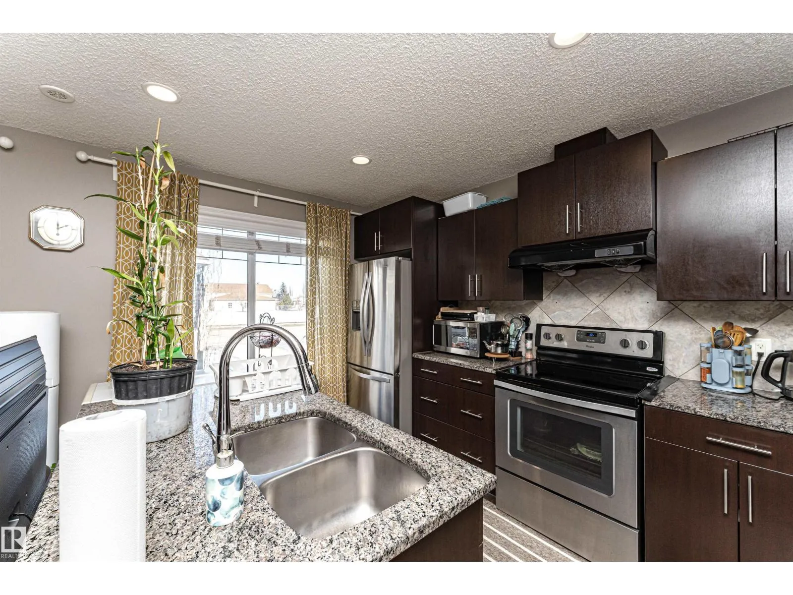Stunning 1,332 sq ft 2-storey townhouse in the desirable community of Clareview Towne Centre! This well-maintained home features 3 bedrooms, 2.5 baths, and a double attached garage. The bright, open-concept main floor offers hardwood flooring and large windows that fill the space with natural light. The modern kitchen features SS appliances, granite countertops, a center island, and a spacious dining area overlooking the beautifully landscaped front yard. A 2-pc bath and convenient laundry complete the main level. Upstairs offers 3 generously sized bedrooms, a 4-pc main bath. The primary bedroom features a walk-in closet and a 4-pc ensuite. The lower level includes a mudroom, utility room, and direct access to the double garage. Ideally located close to schools, parks, transit, Manning Town Centre, and all amenities (id:27476)