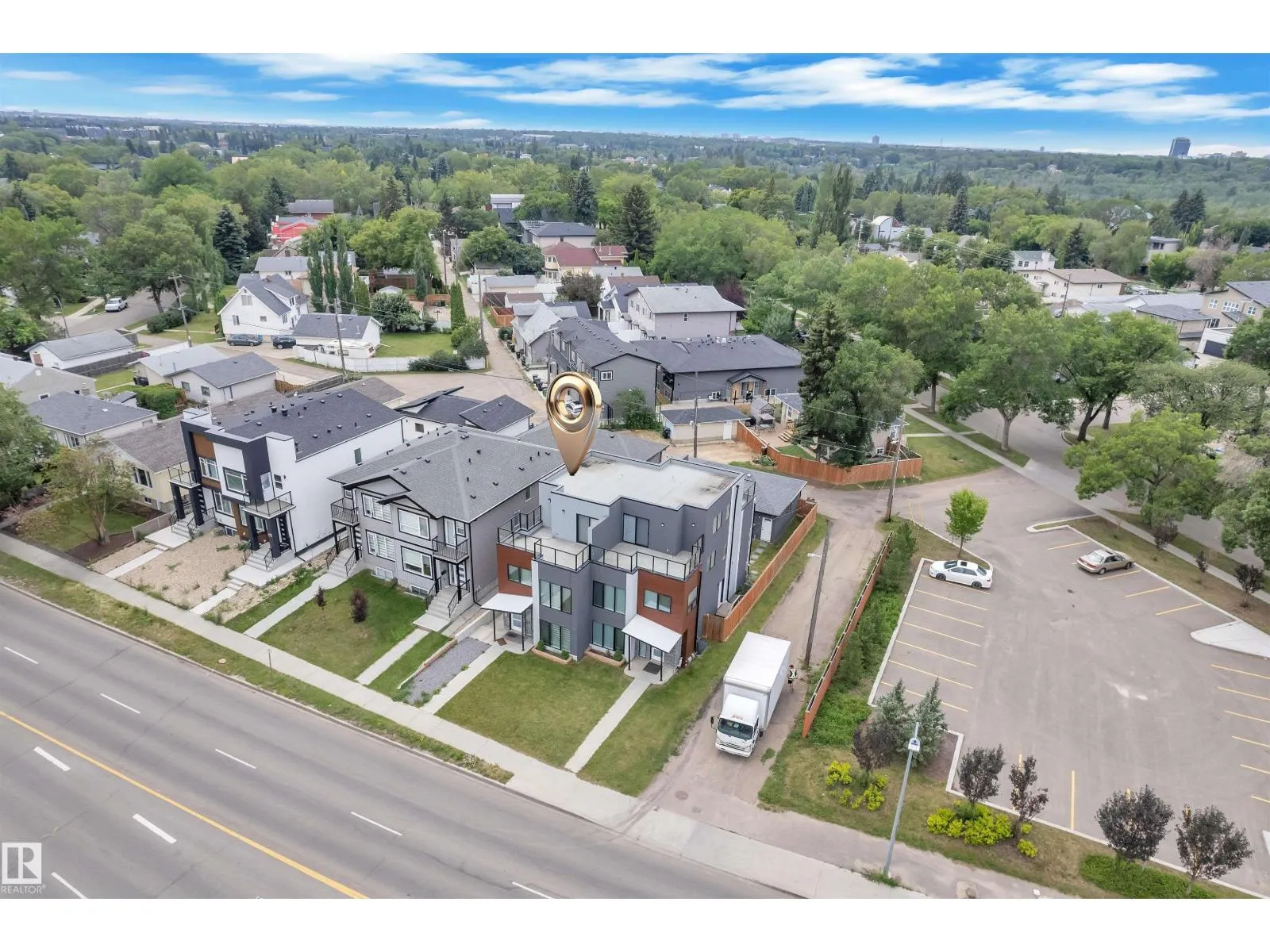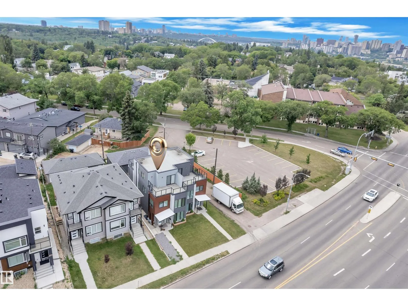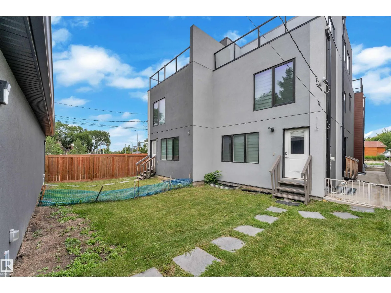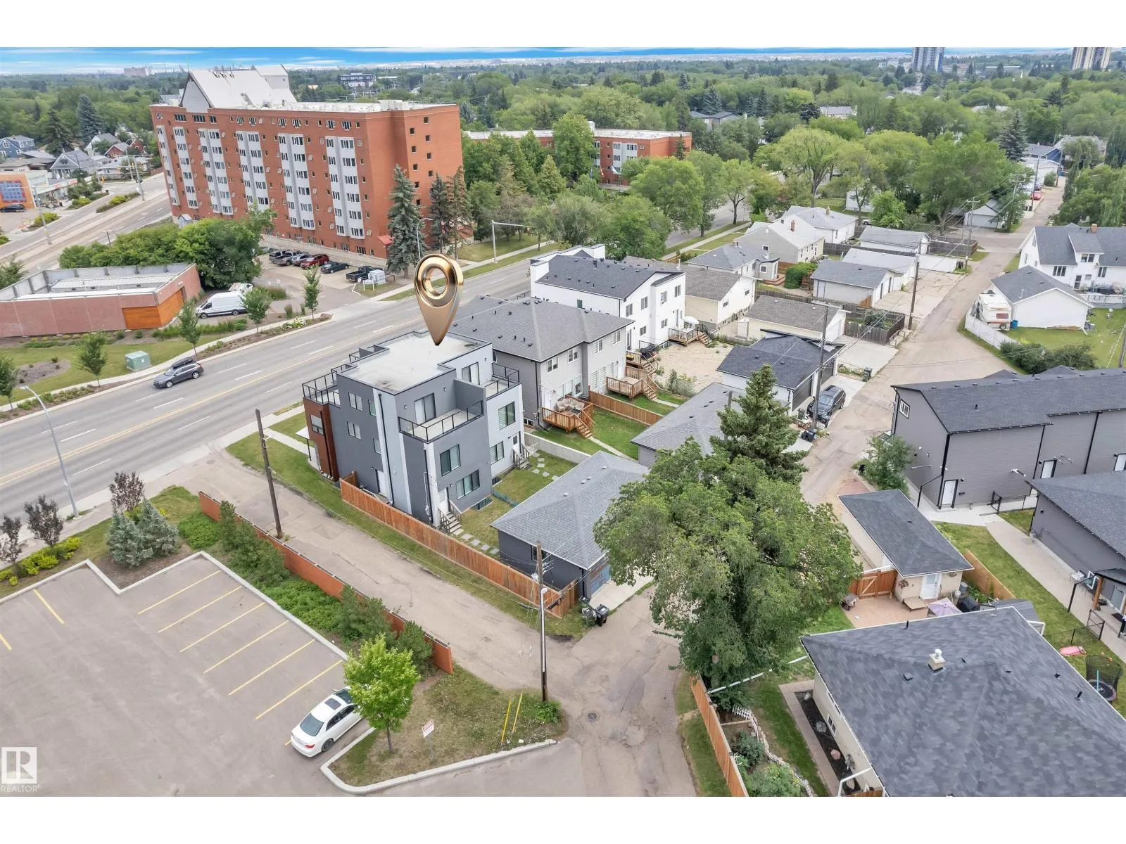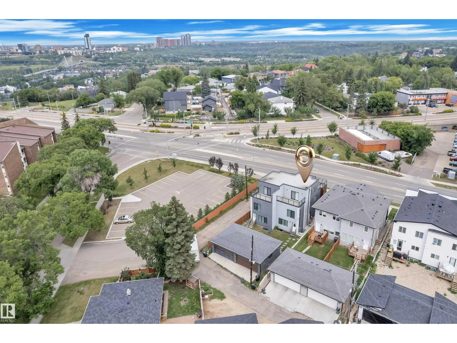 One-of-a-kind, fully finished three-storey duplex with a legal basement suite located in the highly desirable community of Bonnie Doon, right on the edge of Downtown Edmonton. This beautifully upgraded home features hardwood flooring throughout, triple pane windows, and high-end finishes on every level. The main floor offers a modern kitchen with quartz countertops, high-end appliances, a half bathroom, and double patio doors that lead to the backyard and double detached garage. The second level includes a spacious primary bedroom with a double-sink ensuite, two additional bedrooms, and a full common bathroom. The third level is a rare findâfeaturing a large bonus room and two rooftop terraces at the front and rear, offering stunning views of Downtown. The fully finished basement is a legal one-bedroom suite with a full bathroom, heated tile flooring, and its own high-end kitchen appliancesâideal for rental income or extended family. This property truly stands out with its design, upgrades, and unbeatable (id:27476)