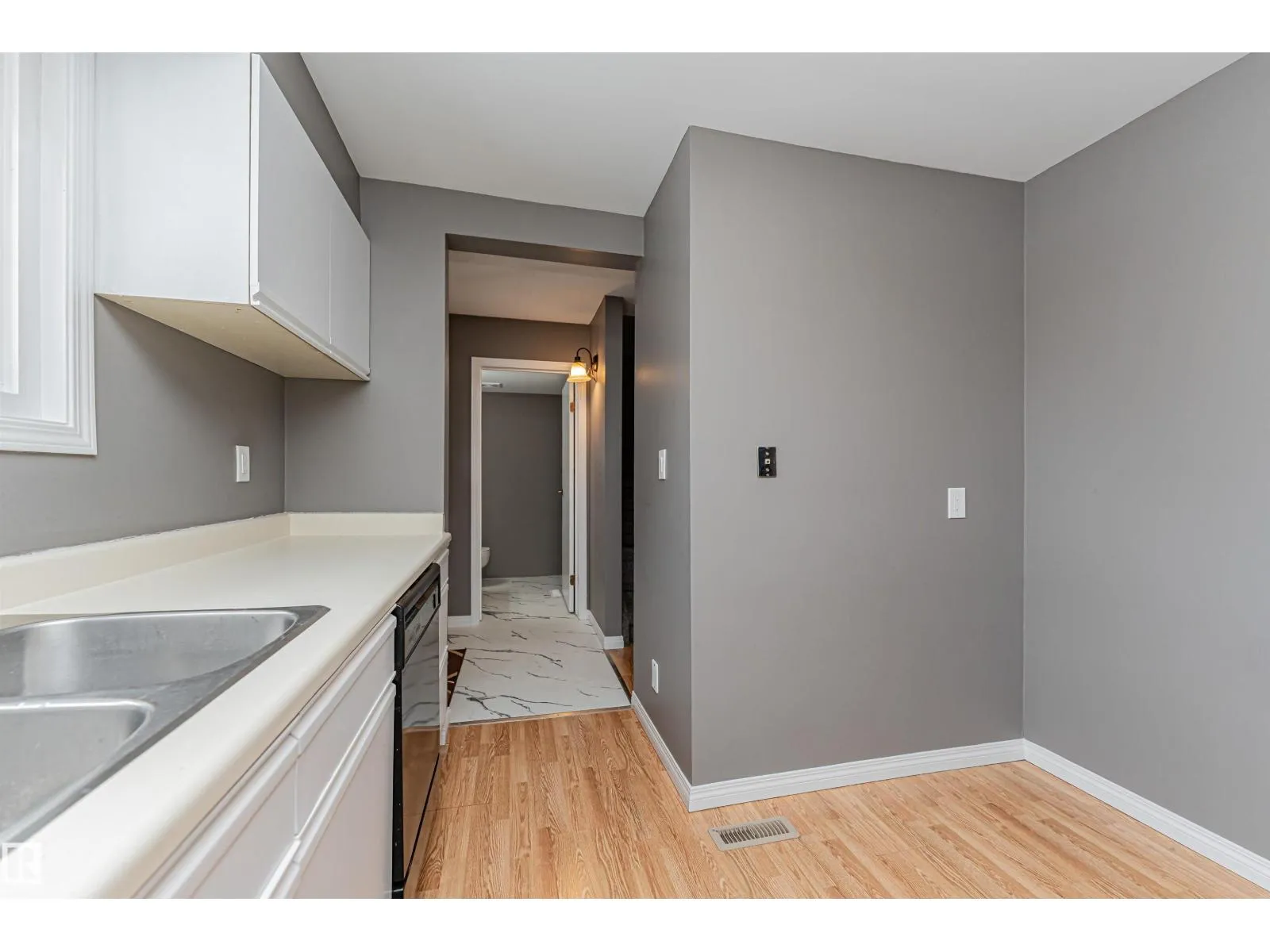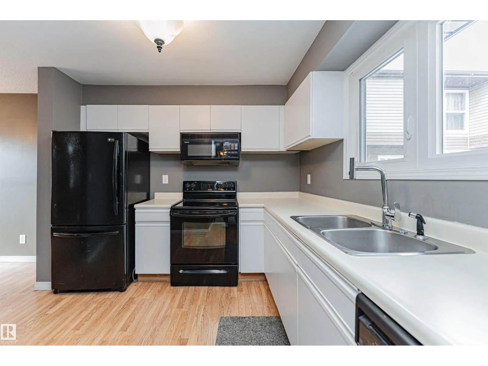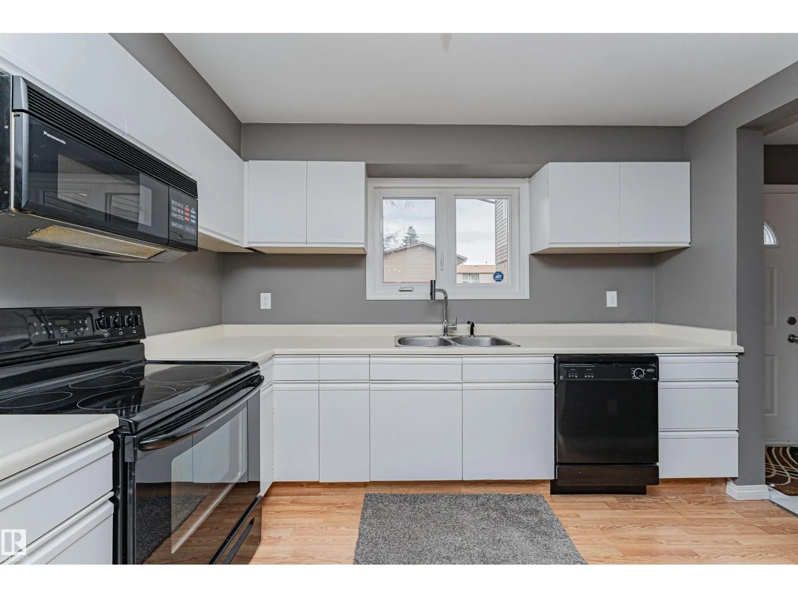 Stylishly updated corner unit townhouse in a well-managed complex. Fresh paint, modern lighting, new flooring, and an updated kitchen create a clean, move-in ready feel. The bright main floor offers great flow and a convenient powder room near the rear entry. Upstairs features three well-sized bedrooms and a spacious bathroom with double vanity. The partially finished basement adds extra living space with a rec area and a separate den, ideal for an office or flex room. Enjoy front and back entrances, a fenced front yard, and visitor parking nearby. The assigned parking stall is located just outside the back entrance, with option to rent another. The complex is well cared for with newer windows, attractive landscaping, and condo fees that support long-term value and maintenance. (id:27476)