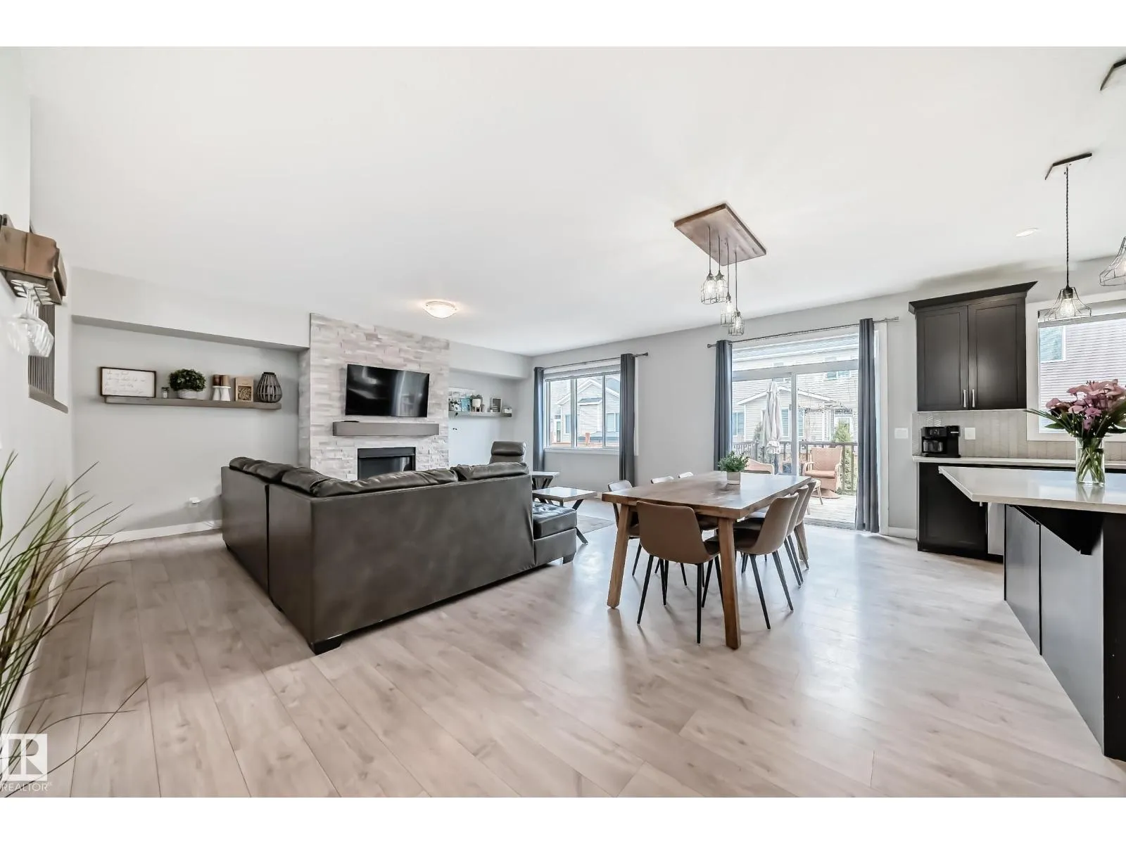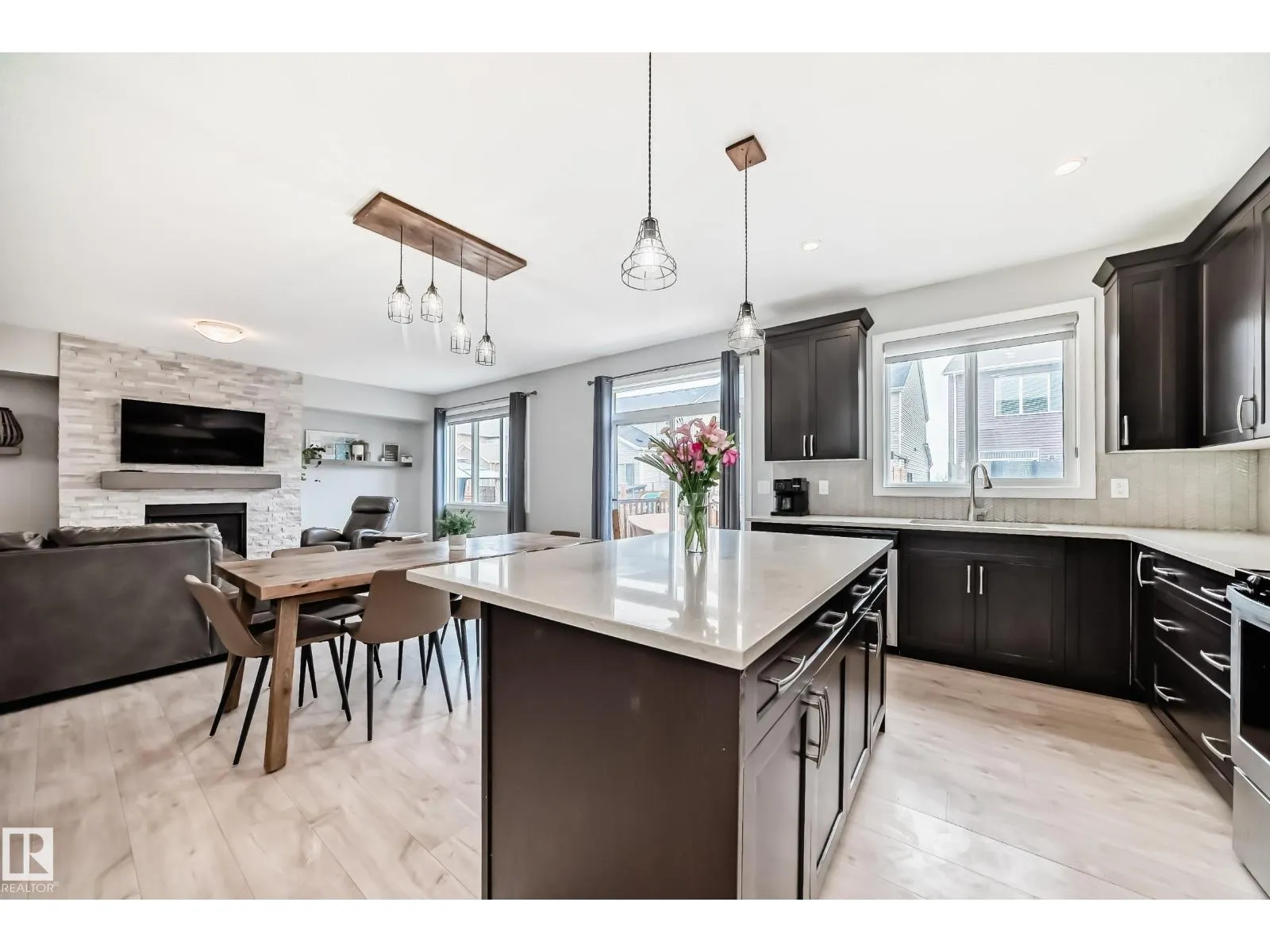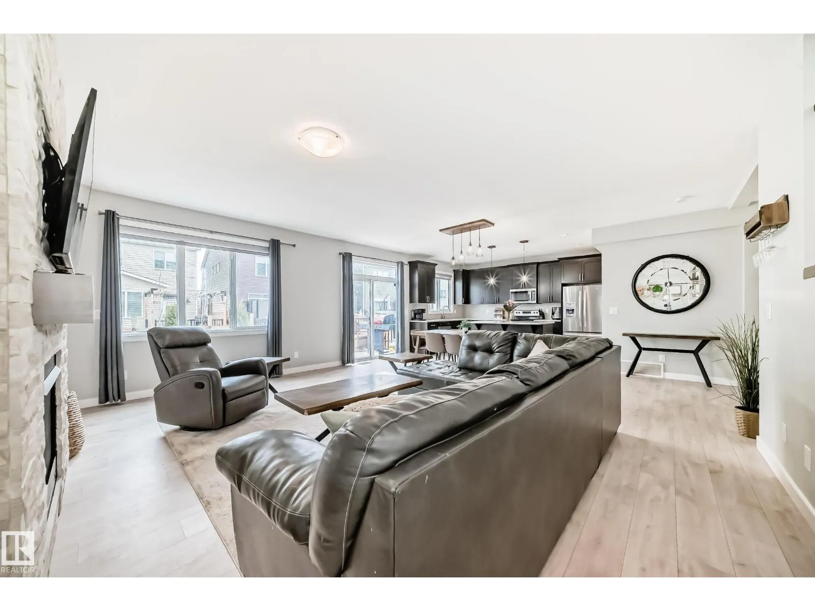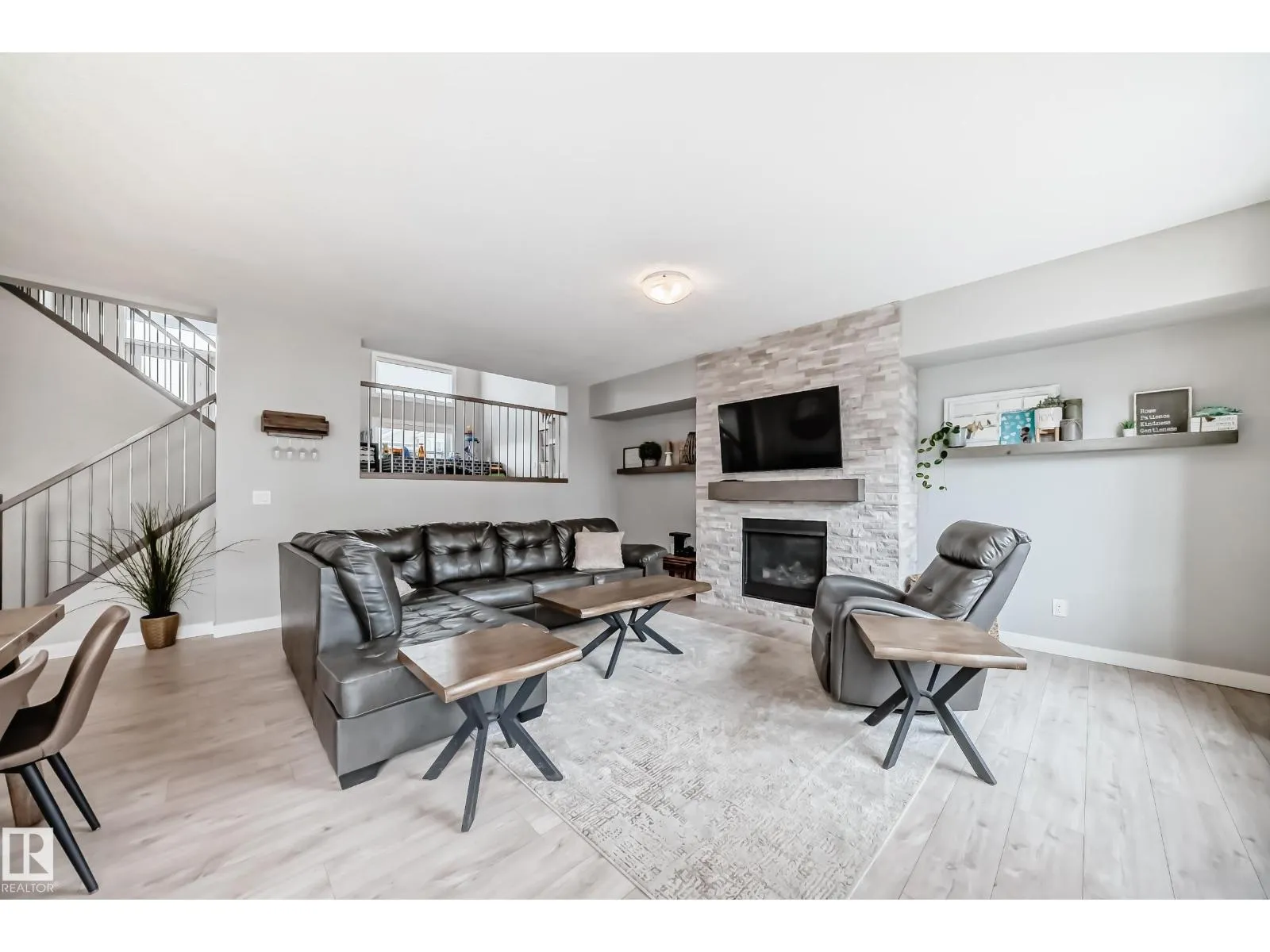 Welcome to the popular Banff model by Mattamy, located in the desirable quiet and relaxing community of Stillwater. This open-concept home offers luxury quality throughout and a functional layout perfect for families. The main floor features 9â ceilings, large windows for plenty of natural light, and a mix of carpet, ceramic tile, and vinyl plank flooring with flush-mount vents. The gourmet kitchen includes quartz countertops, stylish cabinetry, a large island with breakfast bar, and a spacious pantry. The living room is highlighted by a cozy gas fireplace located in a fantastic feature wall, while the dining area provides plenty of space for gatherings. Upstairs features a vaulted bonus room with access to a covered veranda, plus two generous bedrooms and a spacious primary suite with walk-in closet and ensuite. Conveniently located near shopping, amenities, West Edmonton Mall, and Anthony Henday Drive, this home offers comfort, space, and a unique design. Time to move in! (id:27476)