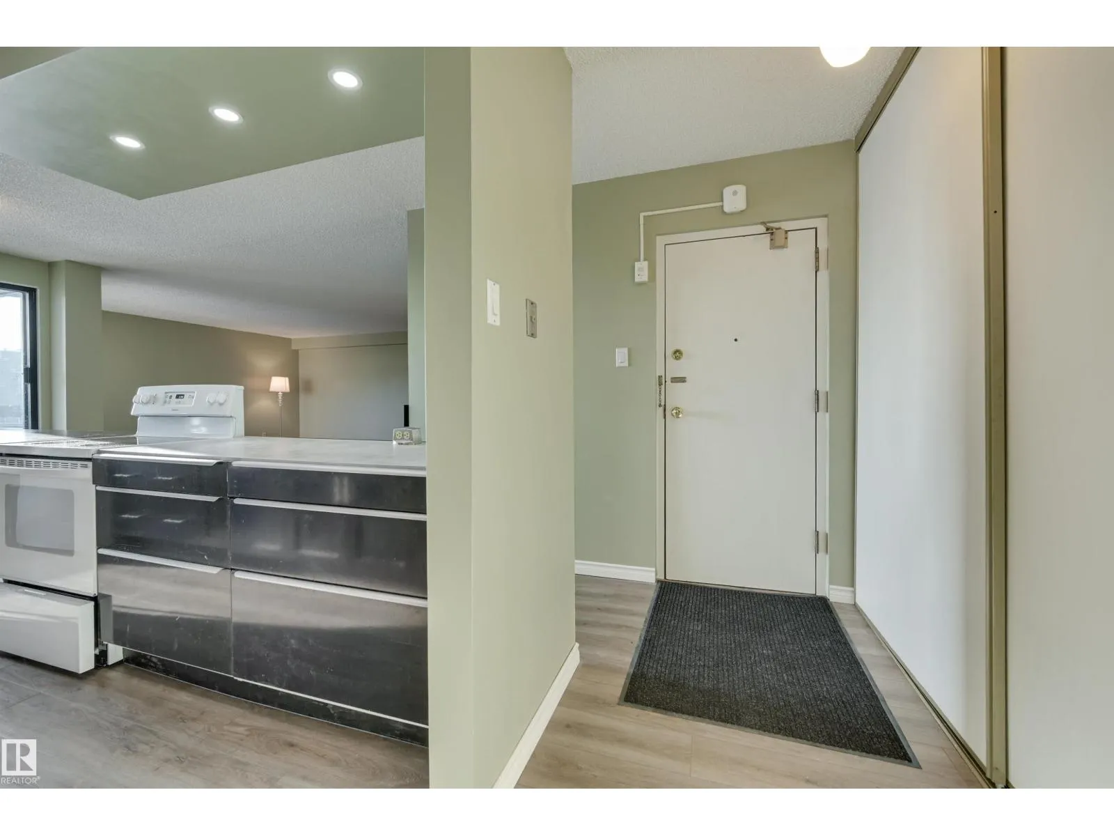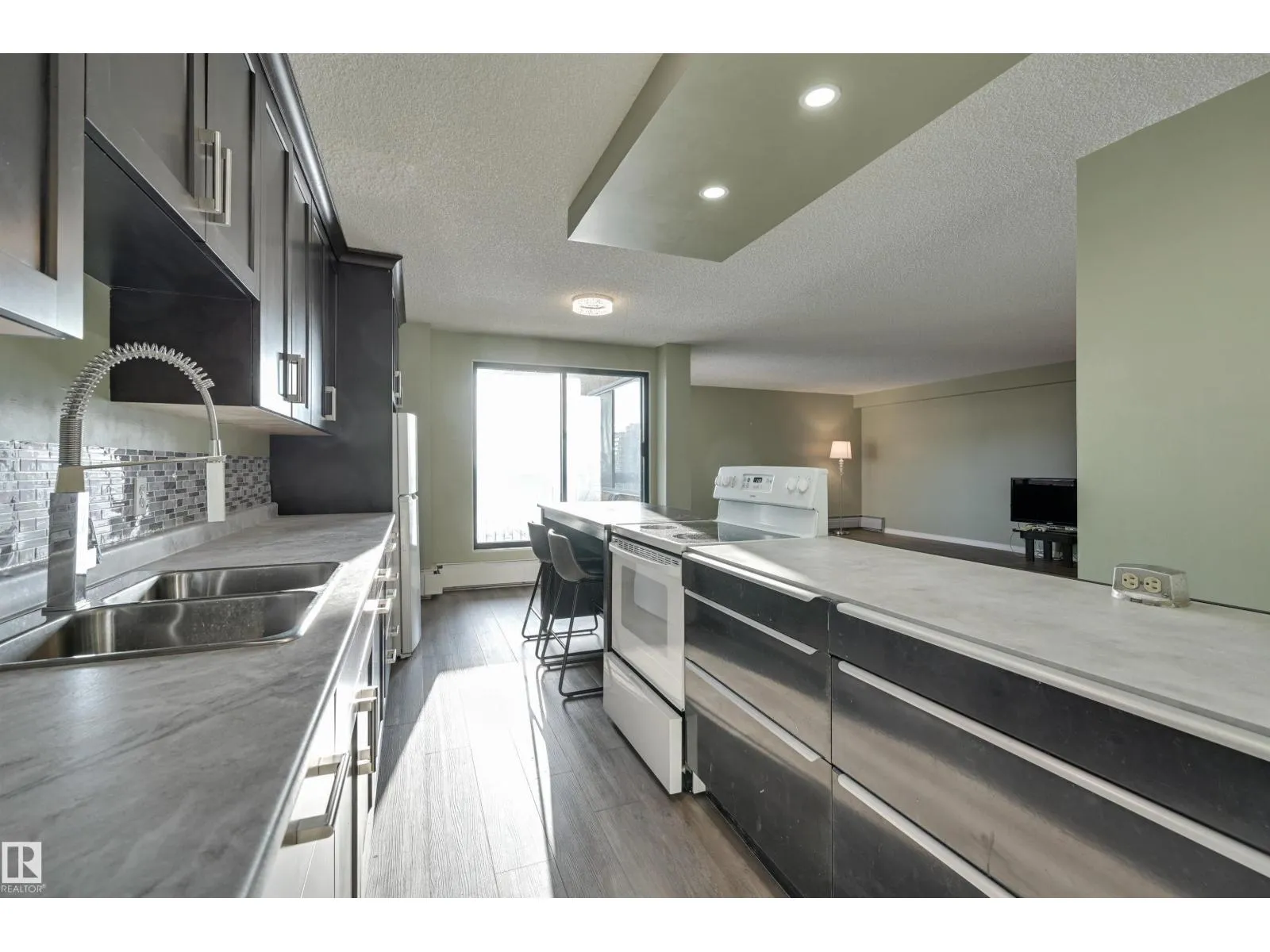 Welcome home to this SOUTHEAST FACING, RENOVATED, TOP FLOOR condo in B & H TOWERS conveniently located close to transportation, restaurants, coffee shops, shopping, the river valley/walking trails, MacEwan University & quick access to the U of A, Brewery & ICE Districts. This OPEN CONCEPT, BRIGHT condo has a gourmet kitchen with an oversize island with room for an eating area & an area for preparing your meals. This upgraded kitchen has Kitchen Craft espresso color cabinetry with soft close cupboards & drawers with lots of room for storage. The spacious living room can be split into two separate rooms because of the abundance of space. The sunny, south balcony can be your garden oasis with all the light. The 2nd bedroom & primary suite have views of Downtown. There is a sink in the primary suite for convenience. 4 piece main bathroom with a new toilet, pedestal sink & tub surround. Luxury vinyl plank flooring throughout & new baseboards. INSUITE LAUNDRY. Shows very well. (id:27476)