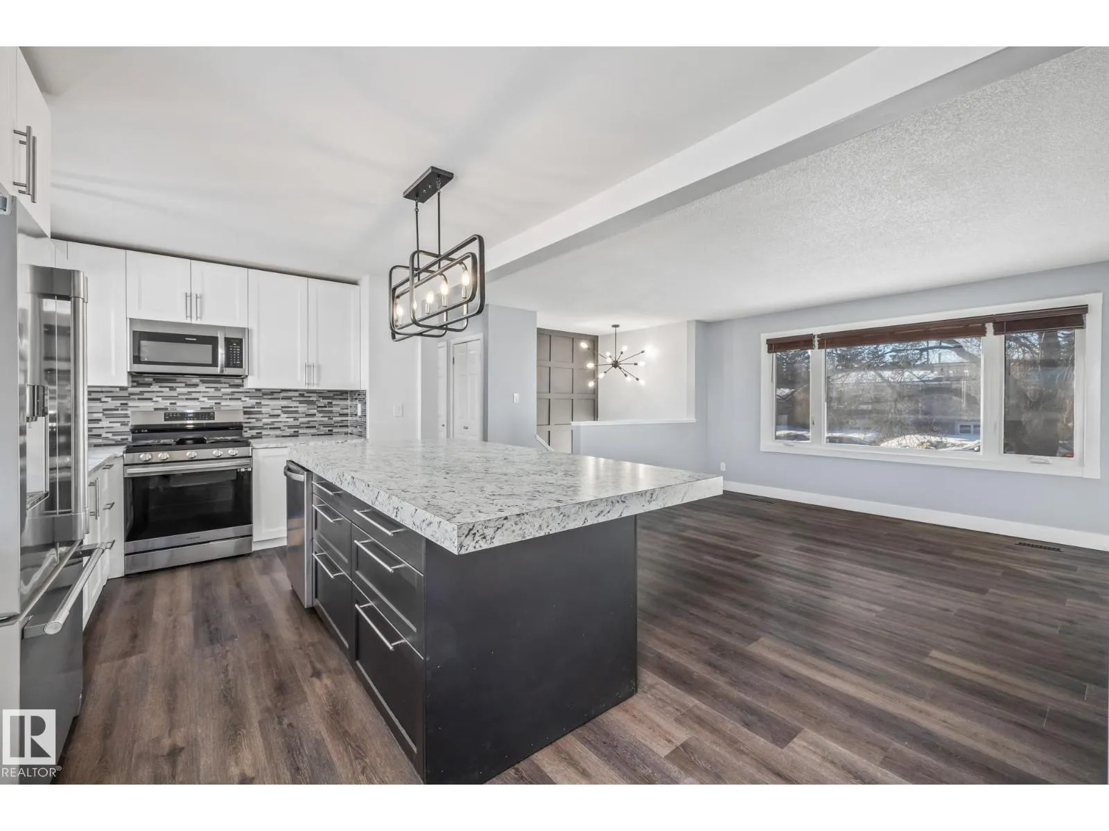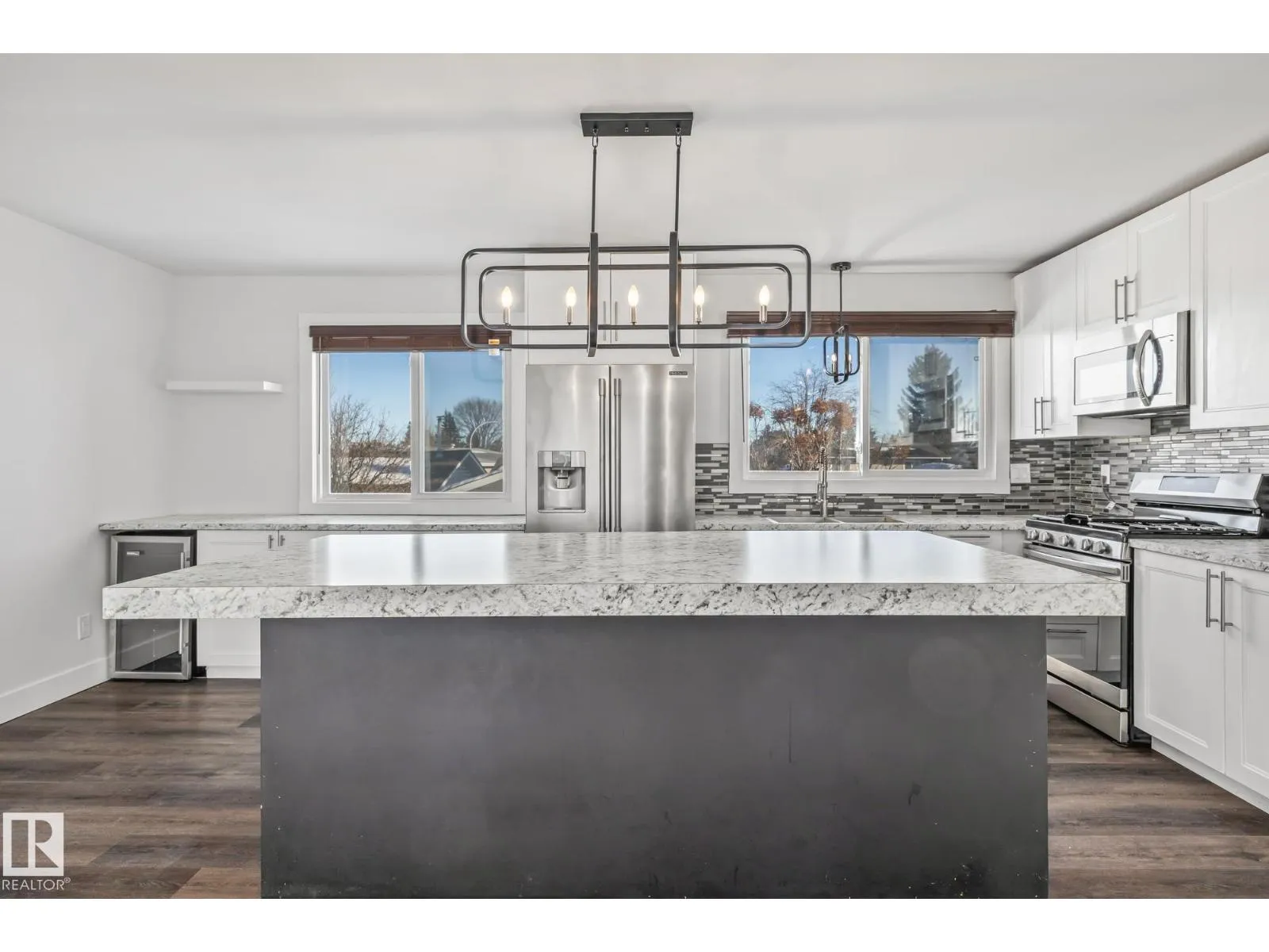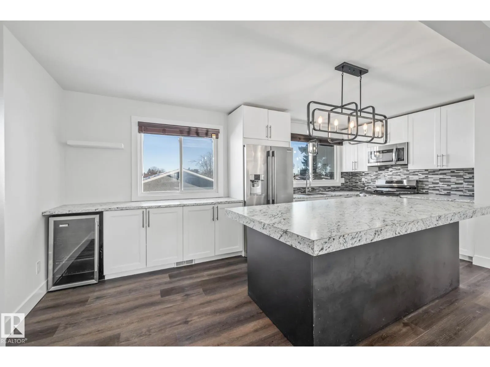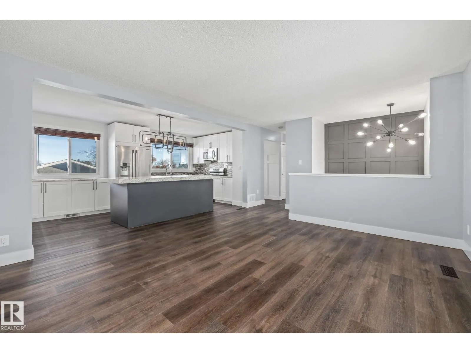 Welcome to Evansdale. This renovated home offers modern updates throughout, starting with a bright white kitchen featuring stainless steel appliances, a large island, and views of the expansive backyard through oversized windows. Brand-new flooring and fresh paint throughout the main floor create a clean, cohesive look, complemented by updated lighting and a feature stairwell wall. The main level includes two spacious bedrooms and a full bathroom. The basement is bright and functional with newer windows, a large family room, two additional bedrooms, and a full bathroom. The home is also equipped with central air conditioning and features a double detached garage with two newer garage door openers and ample parking. Recent upgrades include Windows (2019), Hot water tank (2019), Kitchen (2020), Lighting (2020), Furnace (Dec 2020), Carpet (Dec 2020), A/C (2022) and Paint (2026). Nothing has been forgotten in this move in-ready home! (id:27476)