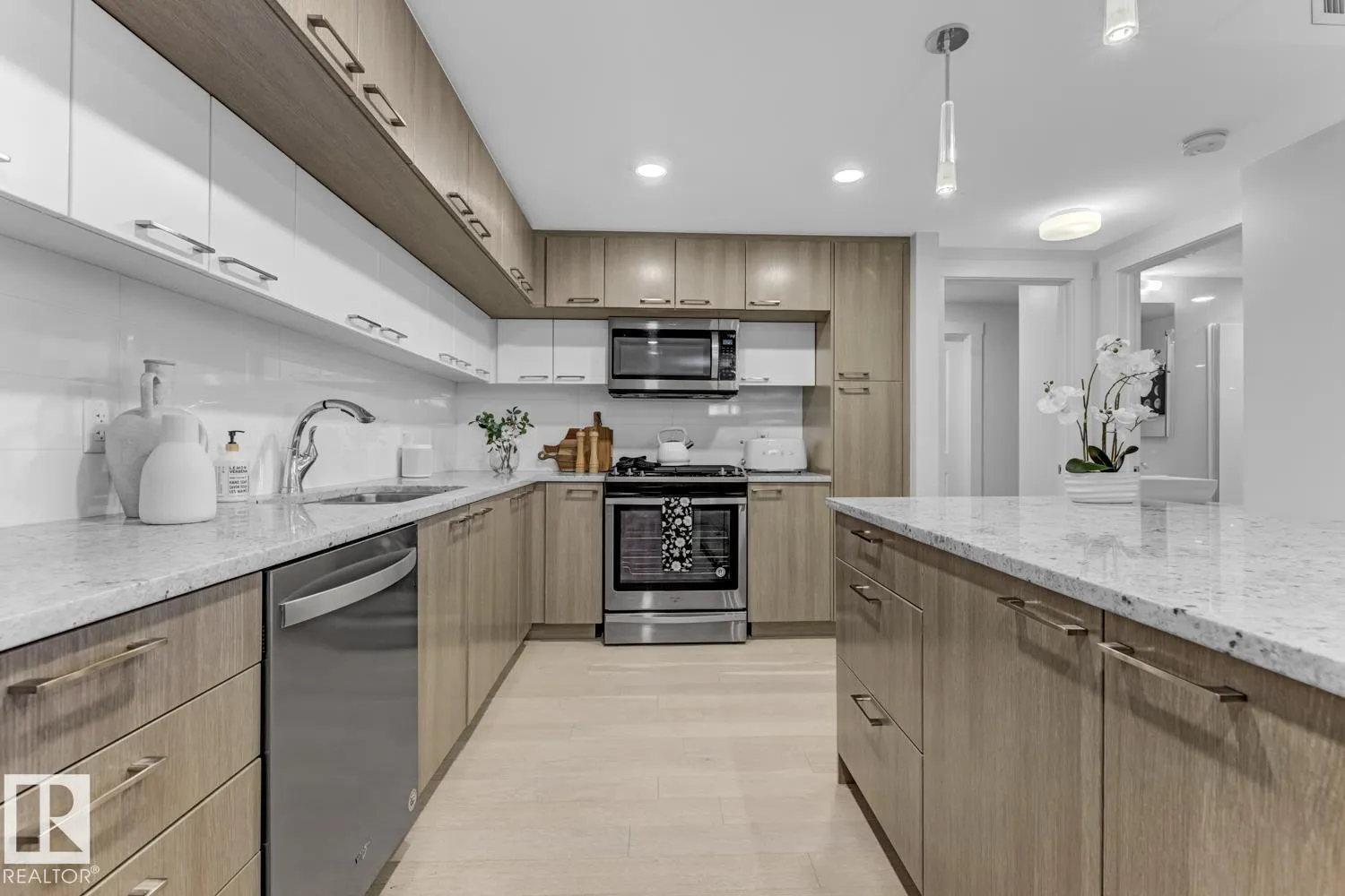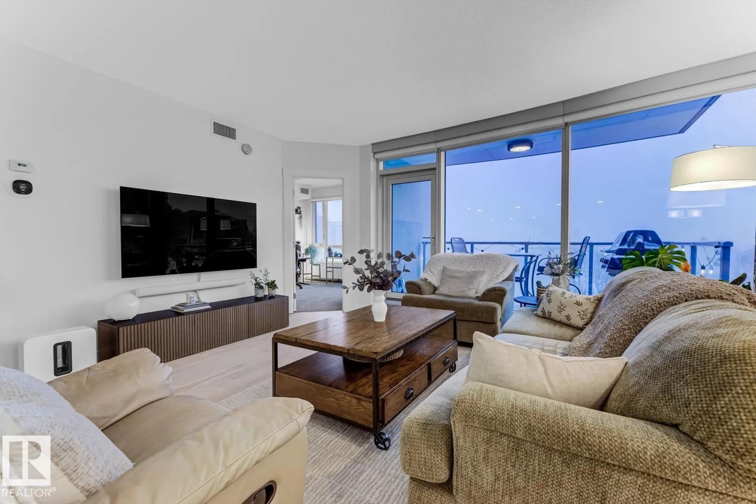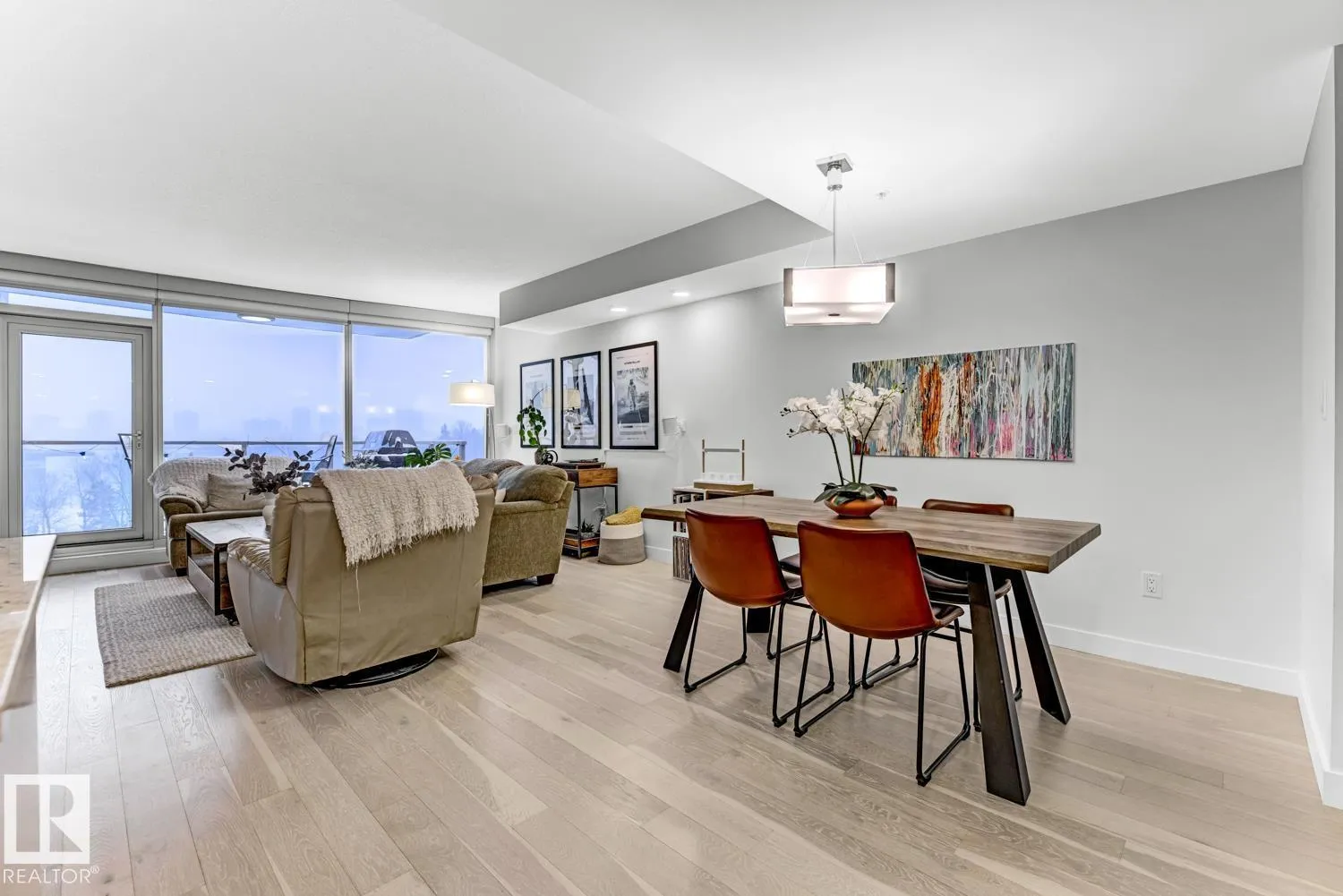Set in prestigious Symphony Tower, this impressive 2-bed, 2-bath condo offers an elevated lifestyle in one of downtown Edmontonâs most desirable locations. Perfectly positioned along edge of the Alberta Legislative Grounds, this residence combines style, comfort, & convenience. The open-concept design features a beautifully appointed kitchen with a large island, two-tone Kitchen Craft cabinetry, pendant & recessed lighting, & stainless steel appliances including a gas range. Porcelain tile, engineered brushed hardwood, central A/C, & dramatic floor-to-ceiling glass curtain walls create a bright & polished living space. Enjoy stunning views from 2 glass balconies, from the Walterdale & the Legislature to the Muttart Conservatory, along with outstanding building amenities including a fitness facility, social room with kitchen, 4th floor outdoor patio, & secure heated underground parking with keyless entry & car wash. Enjoy upscale condo living just steps from downtown, parks, golf & the river valley. (id:27476)