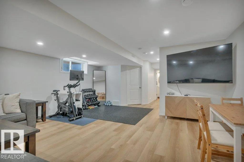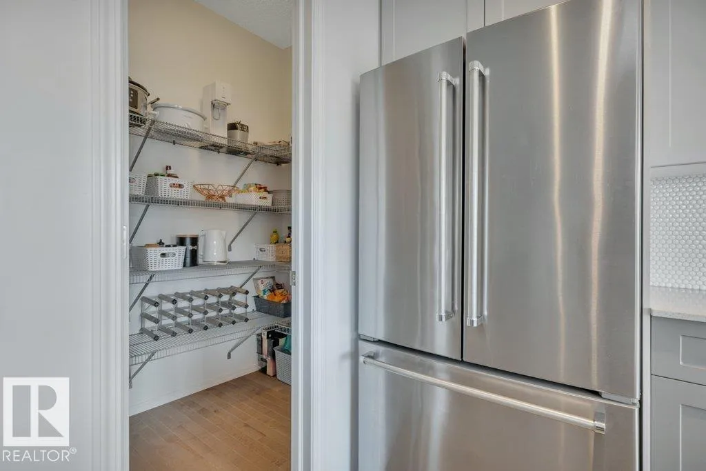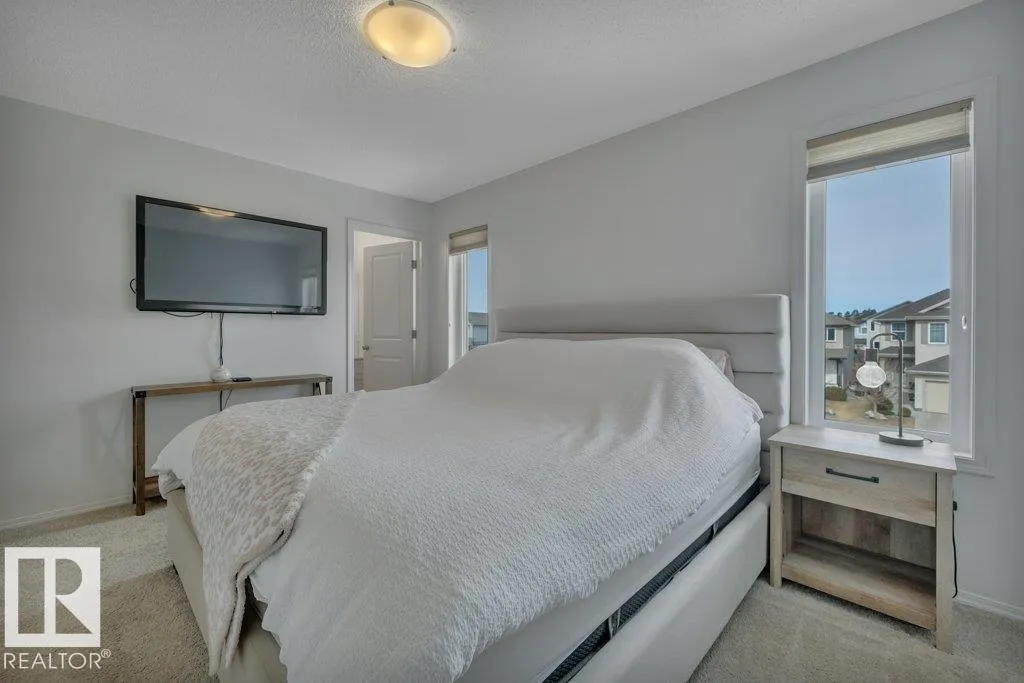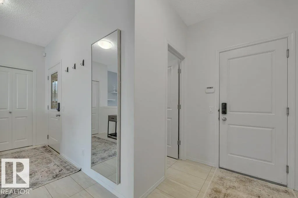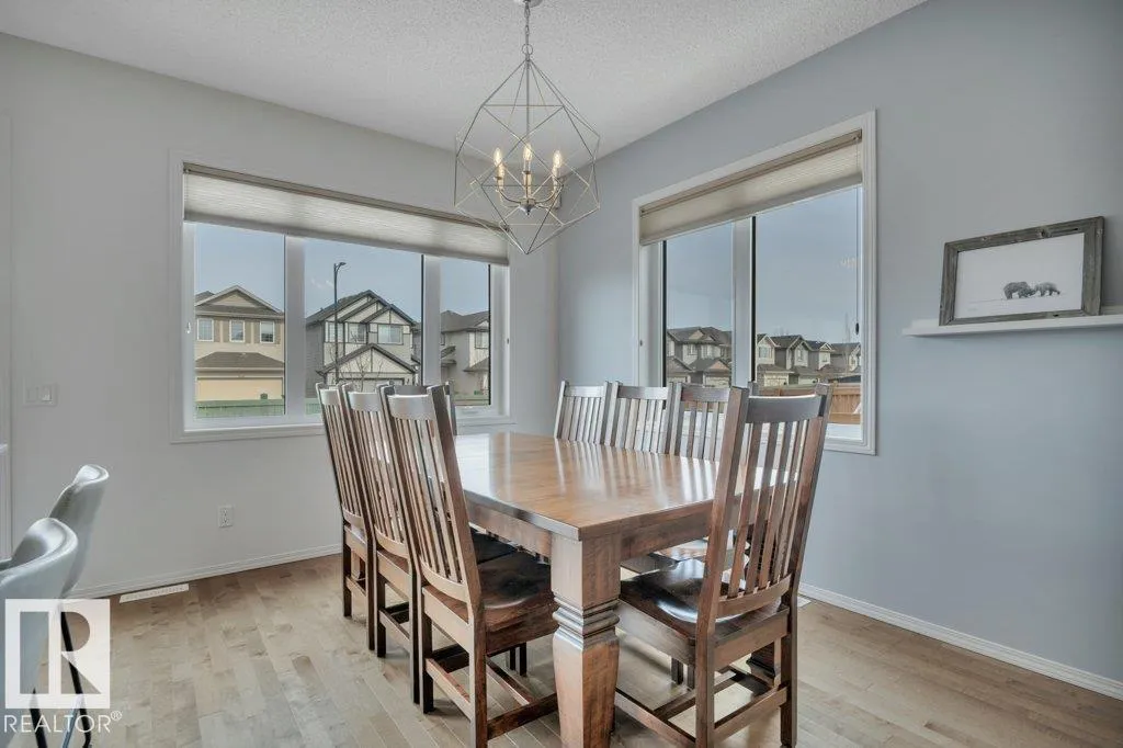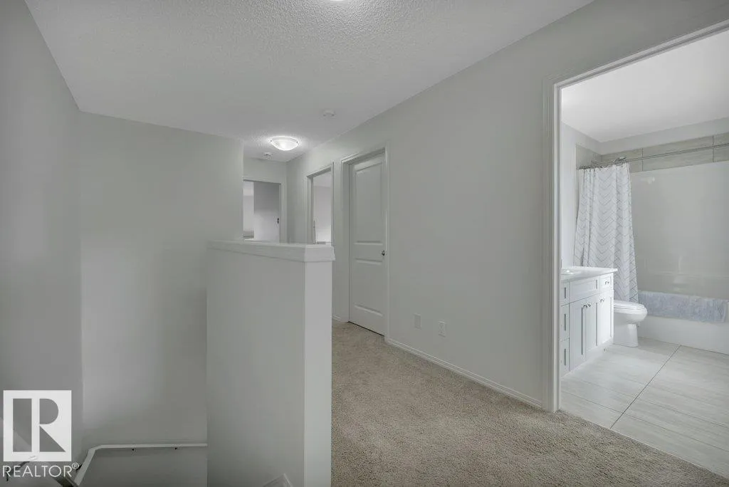 Bright, 2017 built, beautifully maintained half duplex in Webber Greens, just half a block from two schools! Over 1,600 sq ft above grade plus a fully finished basement (2024), 3 bedrooms, 2 full & 2 half bathsârare at this price! Minutes to the Henday, Whitemud, WEM & Lewis Farms Transit Centre. Main floor features 9â ceilings, hardwood floors, cozy electric fireplace with gorgeous floor-to-ceiling tile accent, tile entry, large windows & a stylish kitchen with quartz counters, extended cabinets, gas range, modern penny tile backsplash, a spacious pantry & central island with eating bar & feature lighting. Upstairs: 3 generous bedrooms, primary with walk-in closet & 4-piece ensuite with soaker tub, plus upper laundry room with storage. Basement (2024) fully finished with striking vinyl plank flooring, an impressive rec room/home gym, trendy 2-piece bath & separate storage room. Central A/C, fully fenced private yard with deck, no backyard neighbors, & a double attached insulated garage on a quiet street! (id:27476)