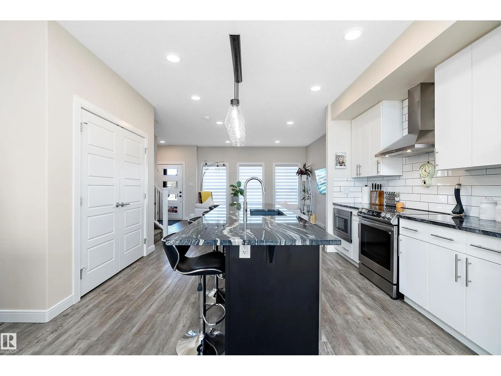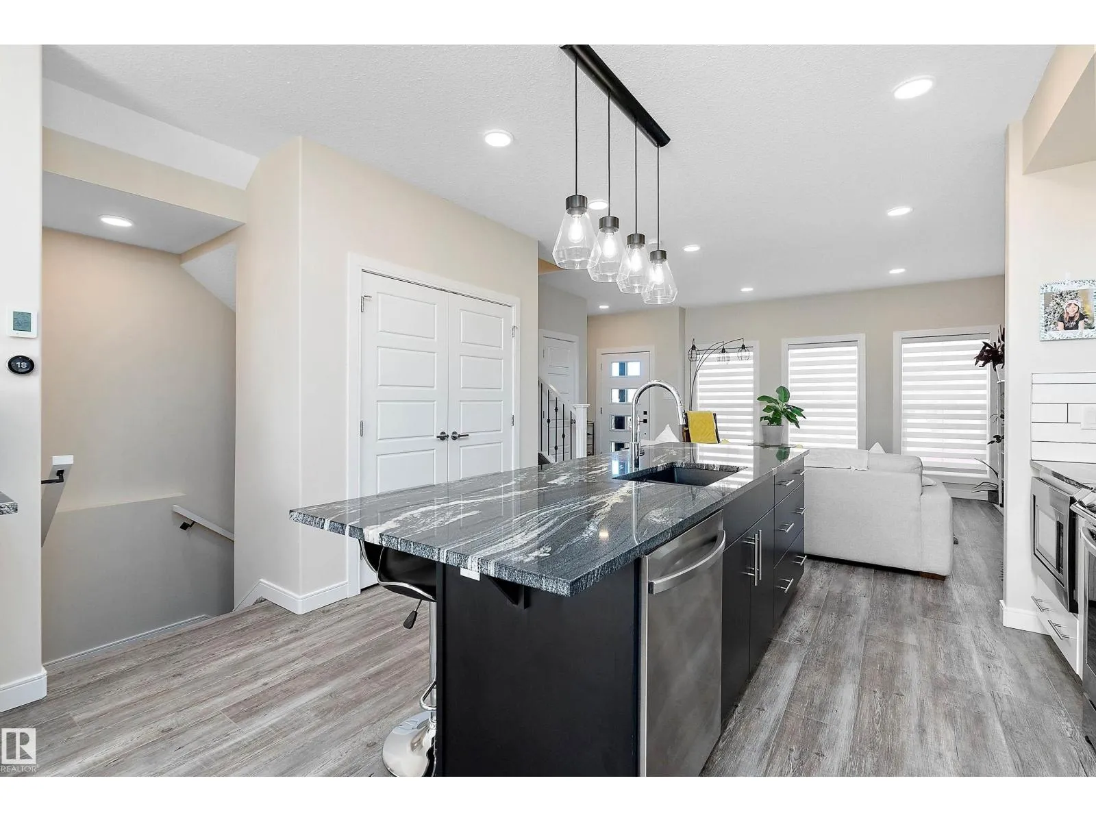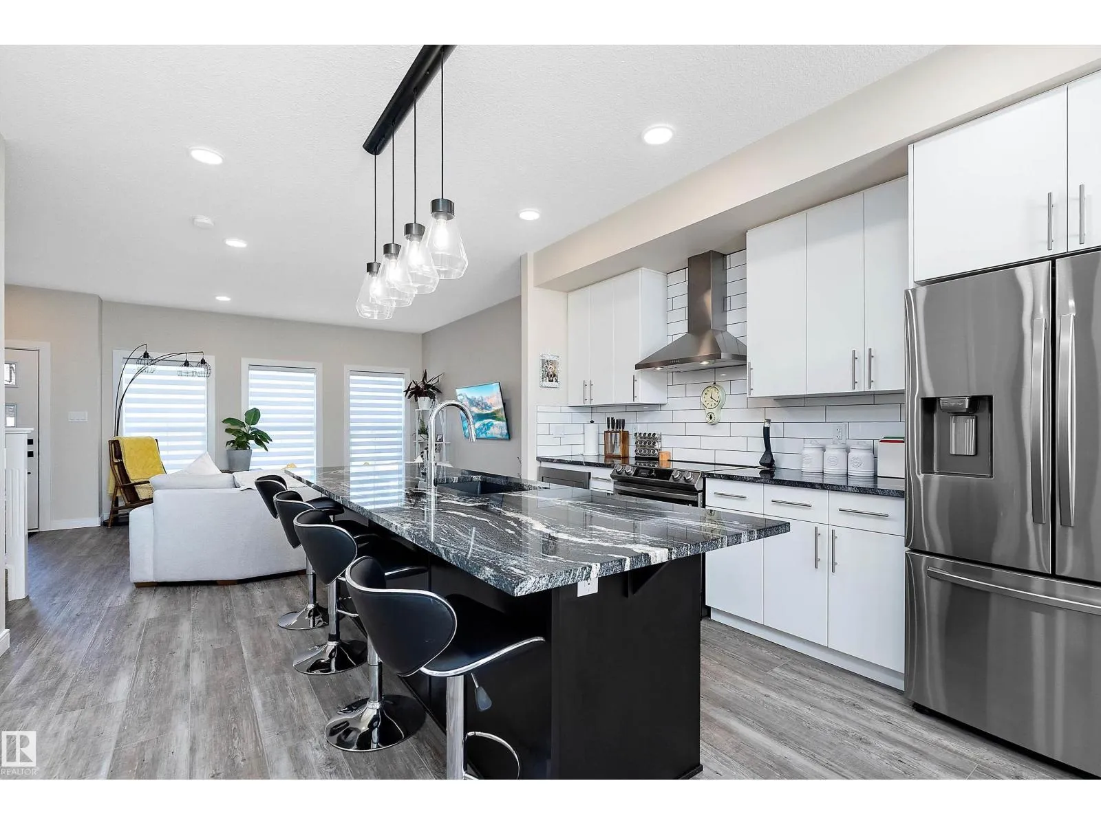 This one of a kind, energy-efficient custom 3-storey home in Edmontonâs award-winning Blatchford community offers environmentally conscious buyers a rare blend of sustainable living and unbeatable urban convenience, featuring geothermal heating and cooling, smart thermostats, and a thoughtfully designed layout that includes three true primary bedrooms, each with its own full ensuite and walk-in closet, plus a private rooftop patio for low-carbon outdoor living in the heart of the city; the main floor showcases 9-ft ceilings, a stylish galley kitchen and HUGE chef inspired island with custom cabinetry, quartz countertops, a coffee station, high-end smart stainless appliances, and a side-by-side pantry, complemented by custom iron railings and durable luxury vinyl plank flooring. Outside youâll find a fully fenced, landscaped yard and a double detached garage, all just steps from the new LRT station and minutes to NAIT, Royal Alex, and the ICE District, with no condo fees or HOA fees. (id:27476)