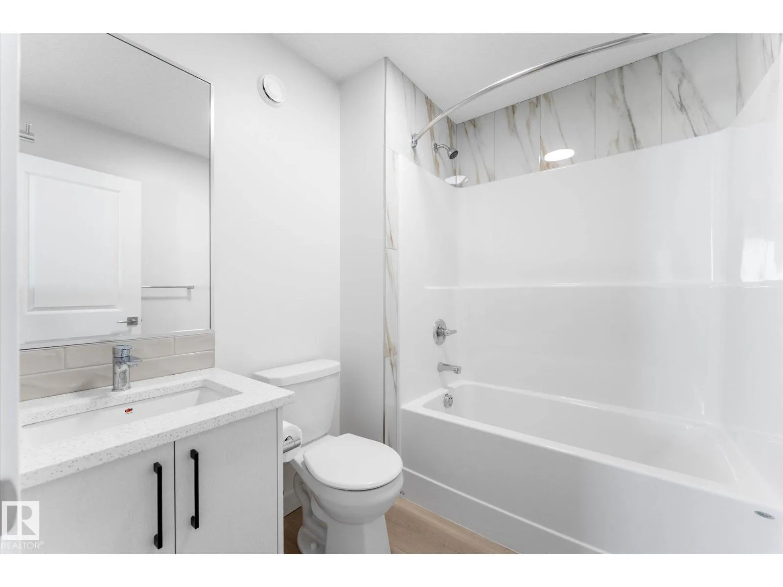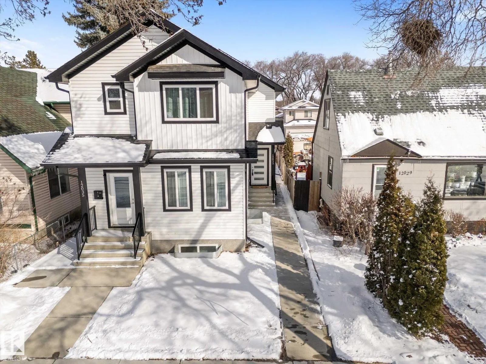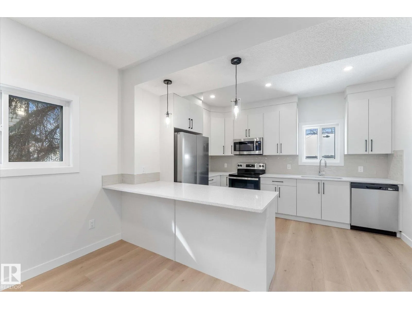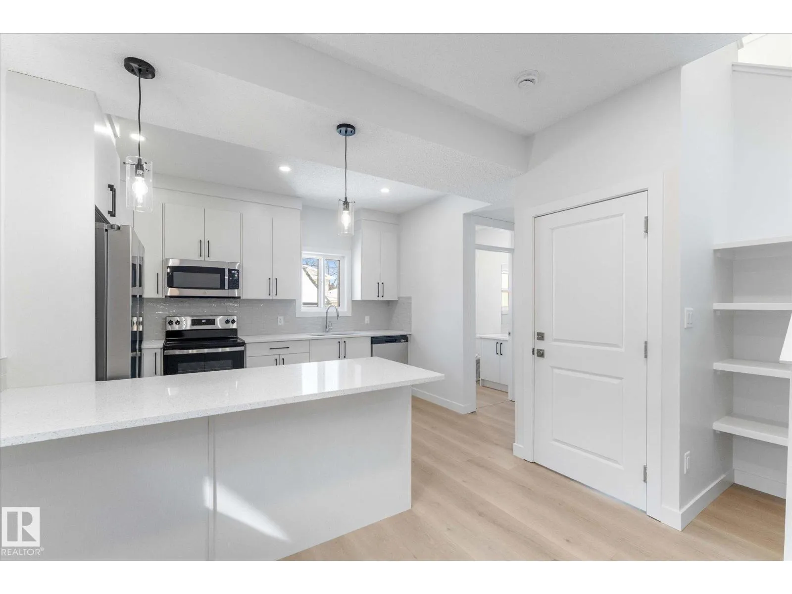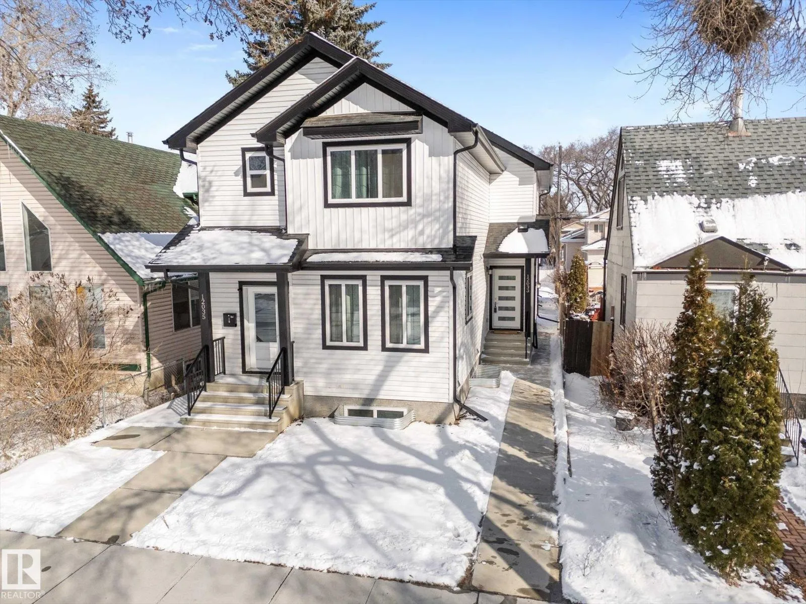 BRAND NEW half duplex on a beautiful mature tree-lined street with SIDE ENTRANCE and SUITE POTENTIAL! The finished basement includes a 4-piece bath and cabinet with rough-in for a future wet bar sink. Step inside to a front entry with mirrored closet leading to an open-concept main floor with gorgeous vinyl plank flooring and 9' ceilings. The modern layout is perfect for entertaining and includes a convenient 2-piece bath. The kitchen features QUARTZ countertops, ceiling-height cabinetry, soft-close drawers/hinges, and a pantry. Upstairs offers TWO LARGE BEDROOMS, each with its own 4-piece ensuite, plus upper-level laundry. Complete with a SINGLE DETACHED GARAGE, STAINLESS STEEL APPLIANCES, and a $1,750 washer/dryer credit. Located close to public transit, downtown, Ice District, NAIT, Kingsway, and Yellowhead Trail. (id:27476)
