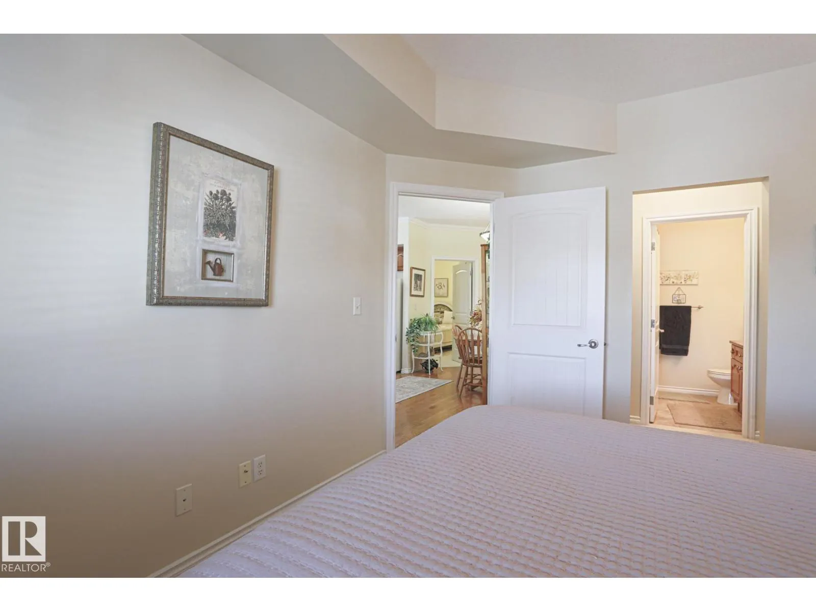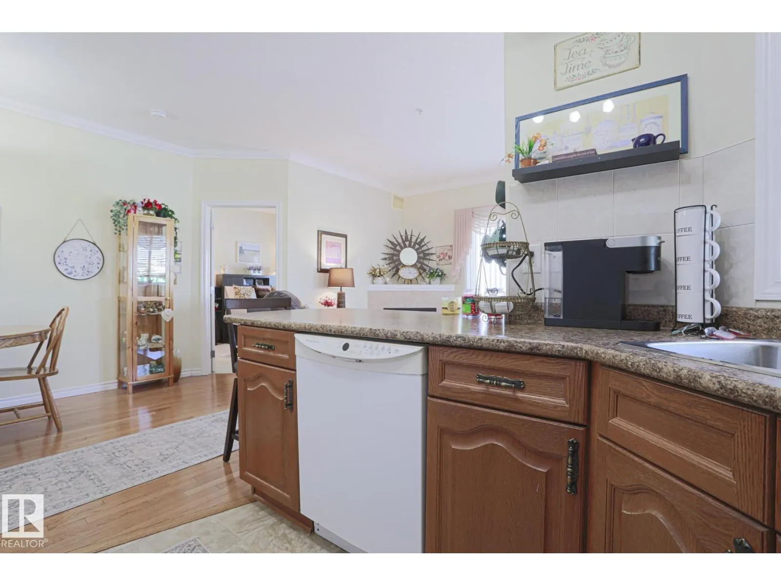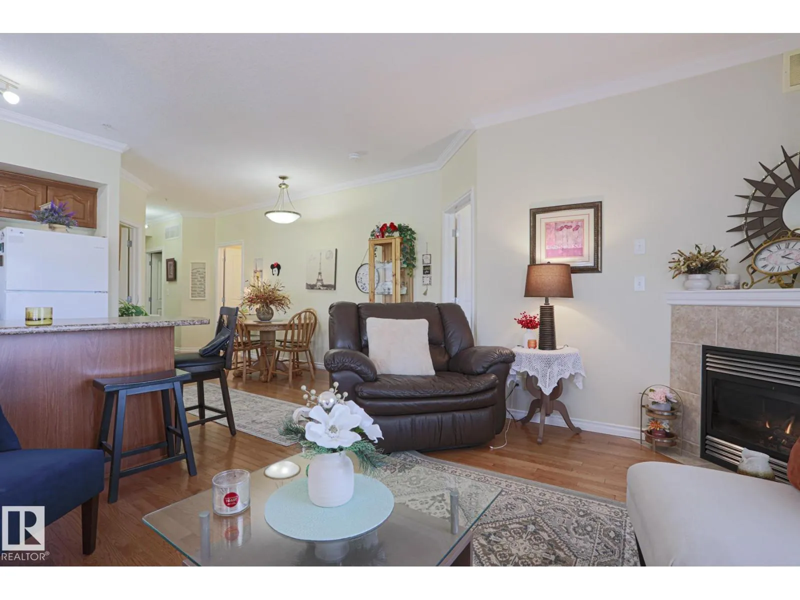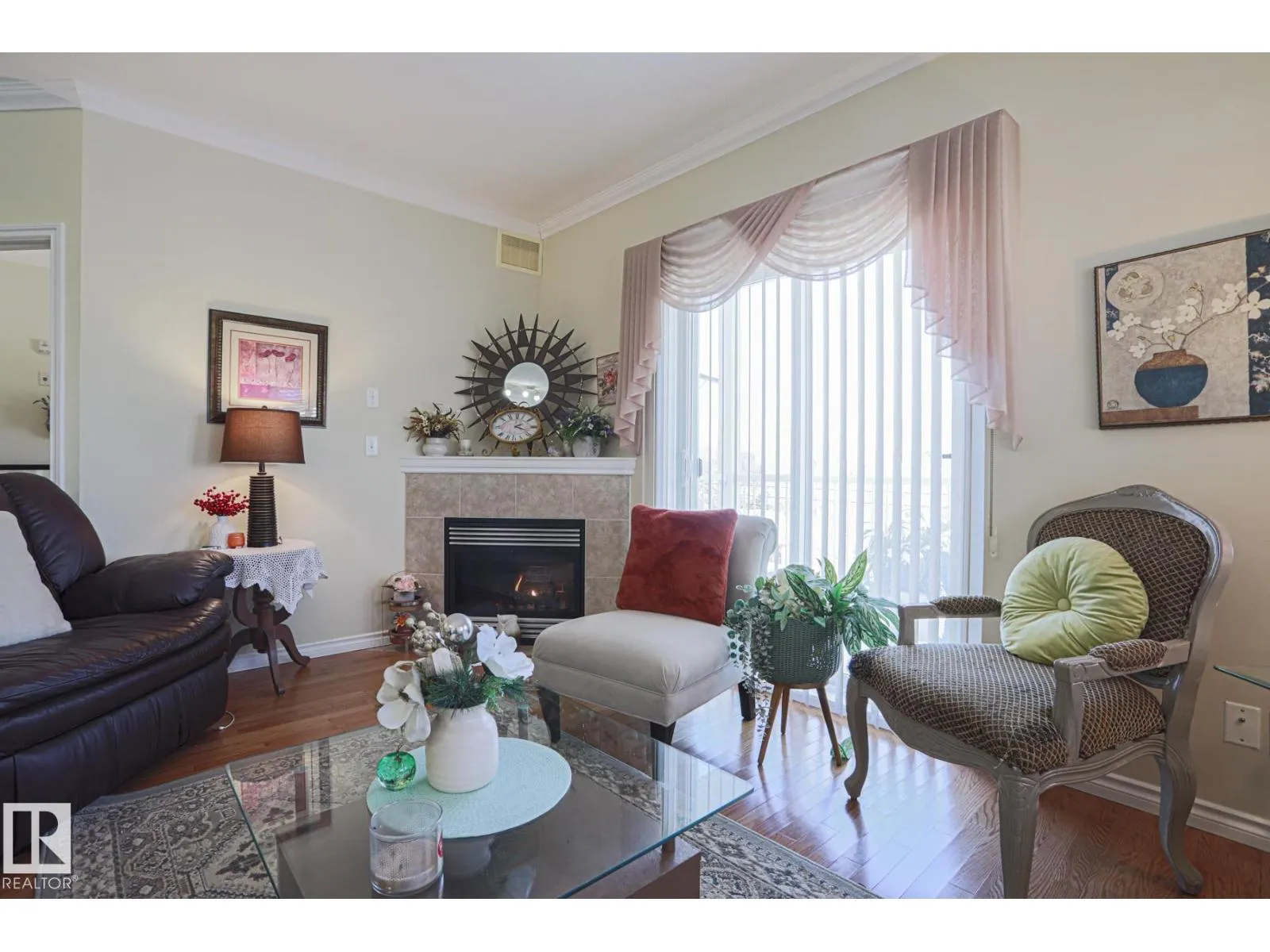 Adult living at its best in Belcanto Court in desirable Bonnie Doon. Beautiful 3rd floor north and east facing suite has lovely primary bedroom, walk through closet and three piece ensuite. Gorgeous hardwood floor adorns the living room with 9' ceilings which features a heartwarming natural gas fireplace with mantle to display your favorite photos and art. Bright kitchen with oak cabinets has a step saving wrap-around style that makes meal prep easy and convenient to serve the breakfast bar and smart dinette. A huge den (which can technically be a bedroom as it has a sprinkler head) makes for a great guest room, office, hobby/craft or relaxing private TV/reading room. You decide! Nice four piece bath for guests with tub. Large laundry room with stacker washer/dryer, lots of shelving and space for your collectibles too. Underground heated parking, carwash, guest suite and social room for savings, value and comfort. Bonnie Doon Mall + Valley Line LRT is close-by for your shopping and travelling convenience. (id:27476)