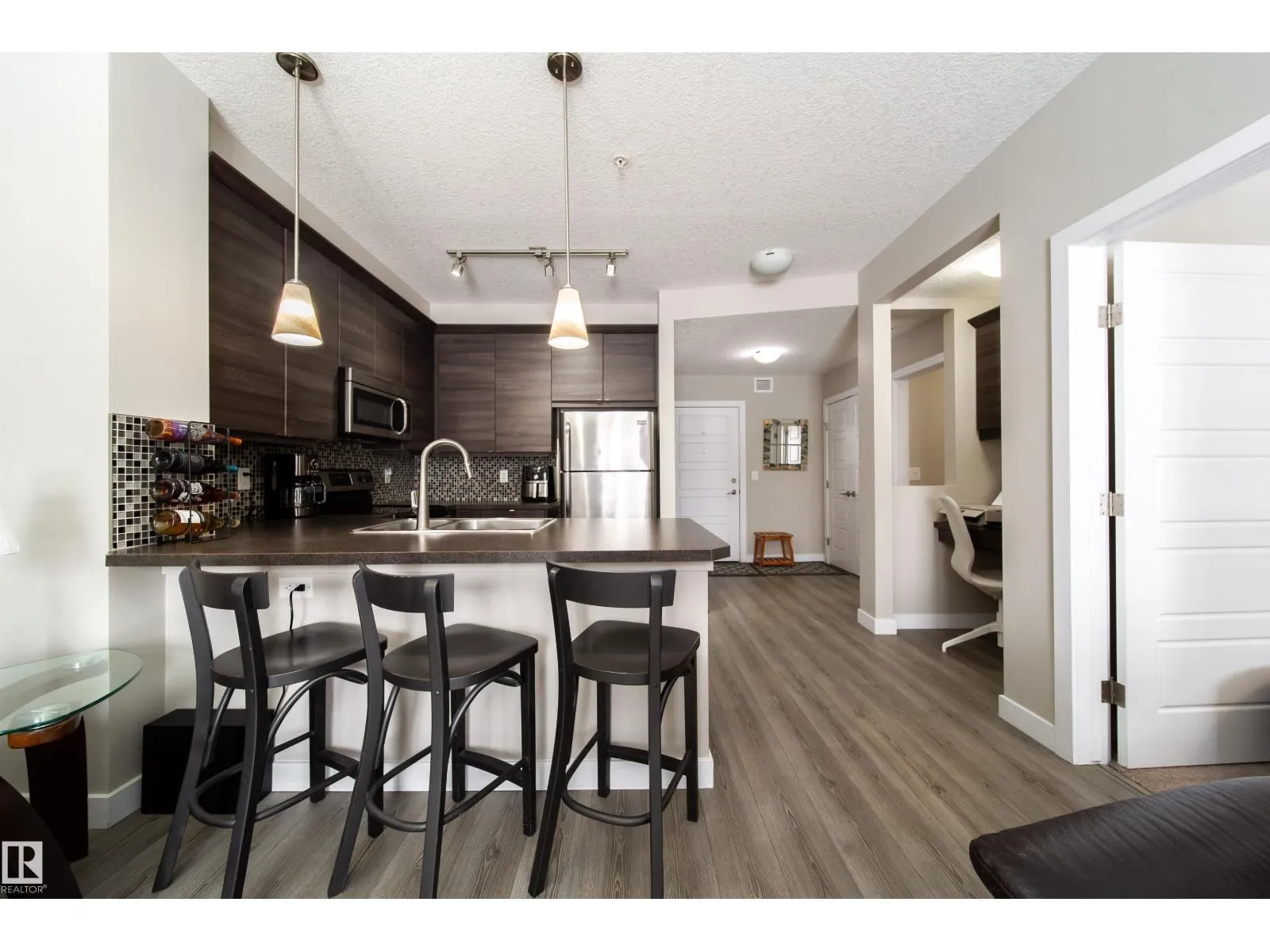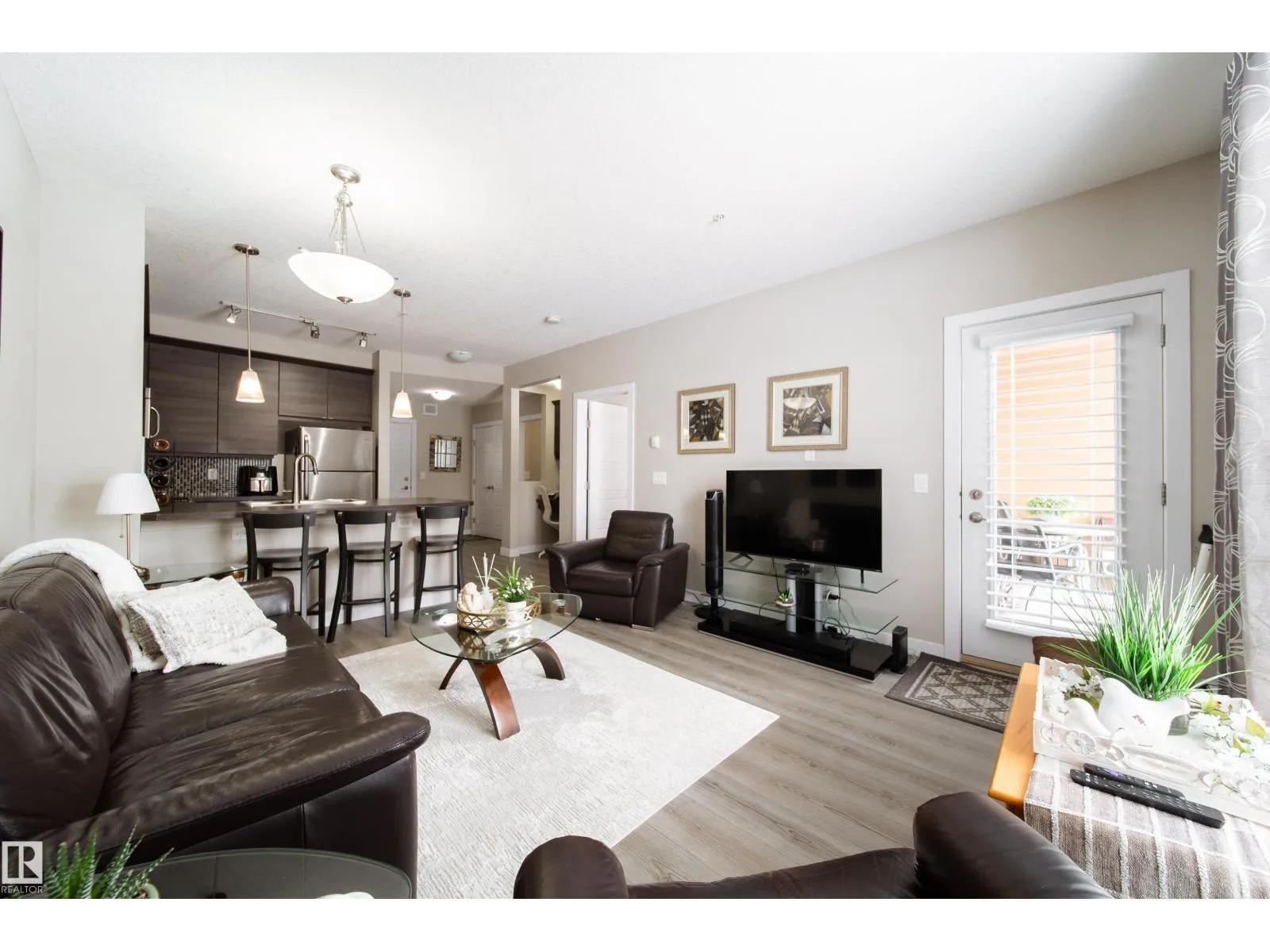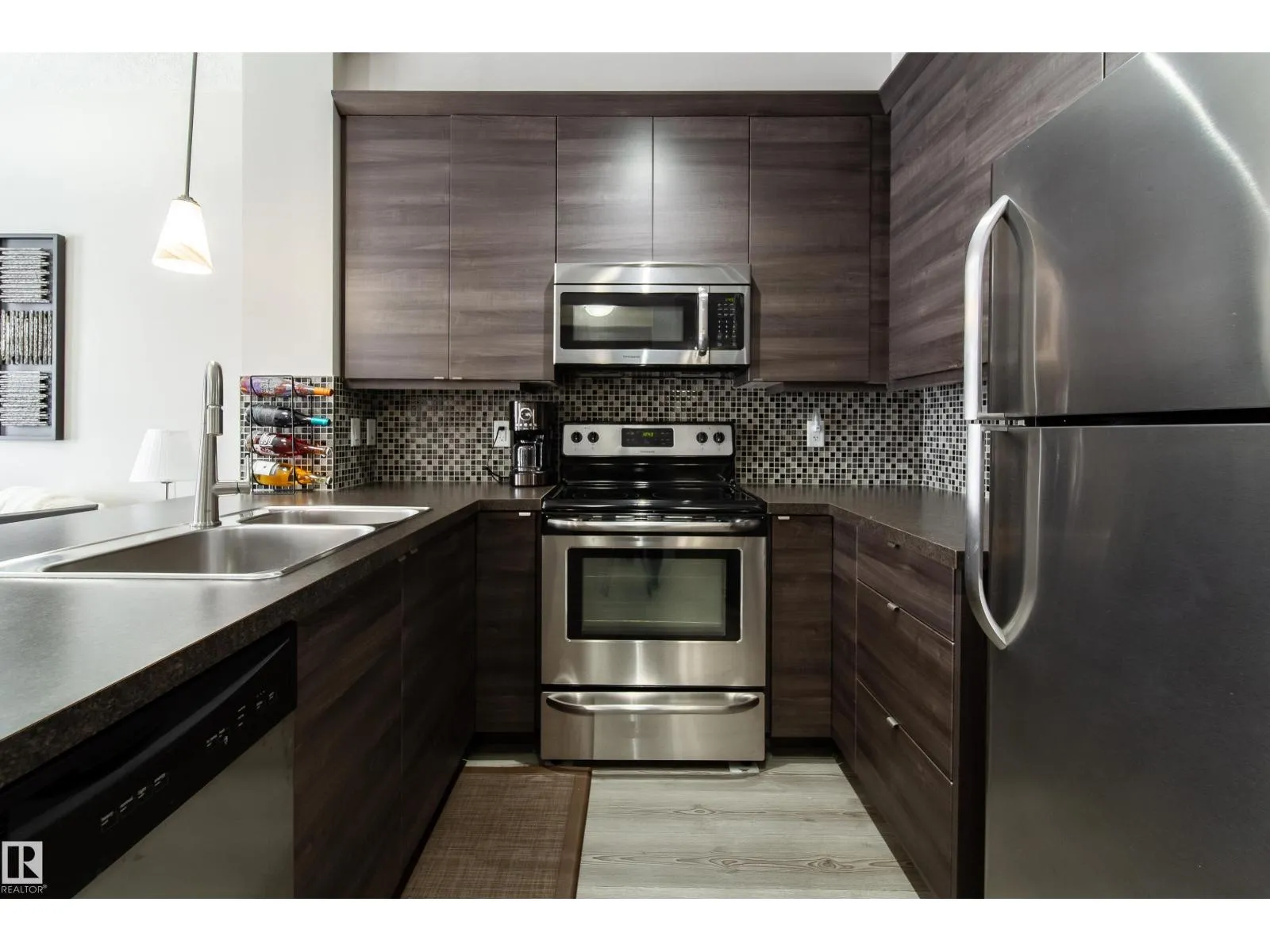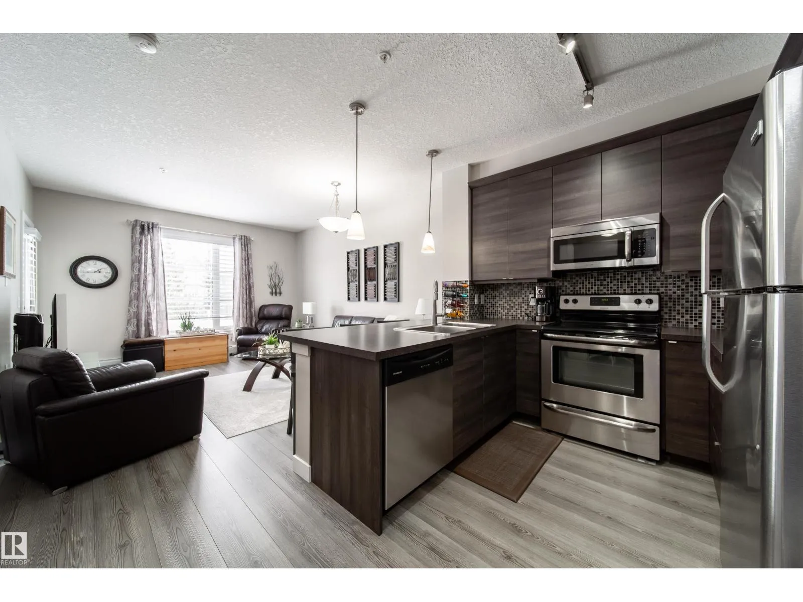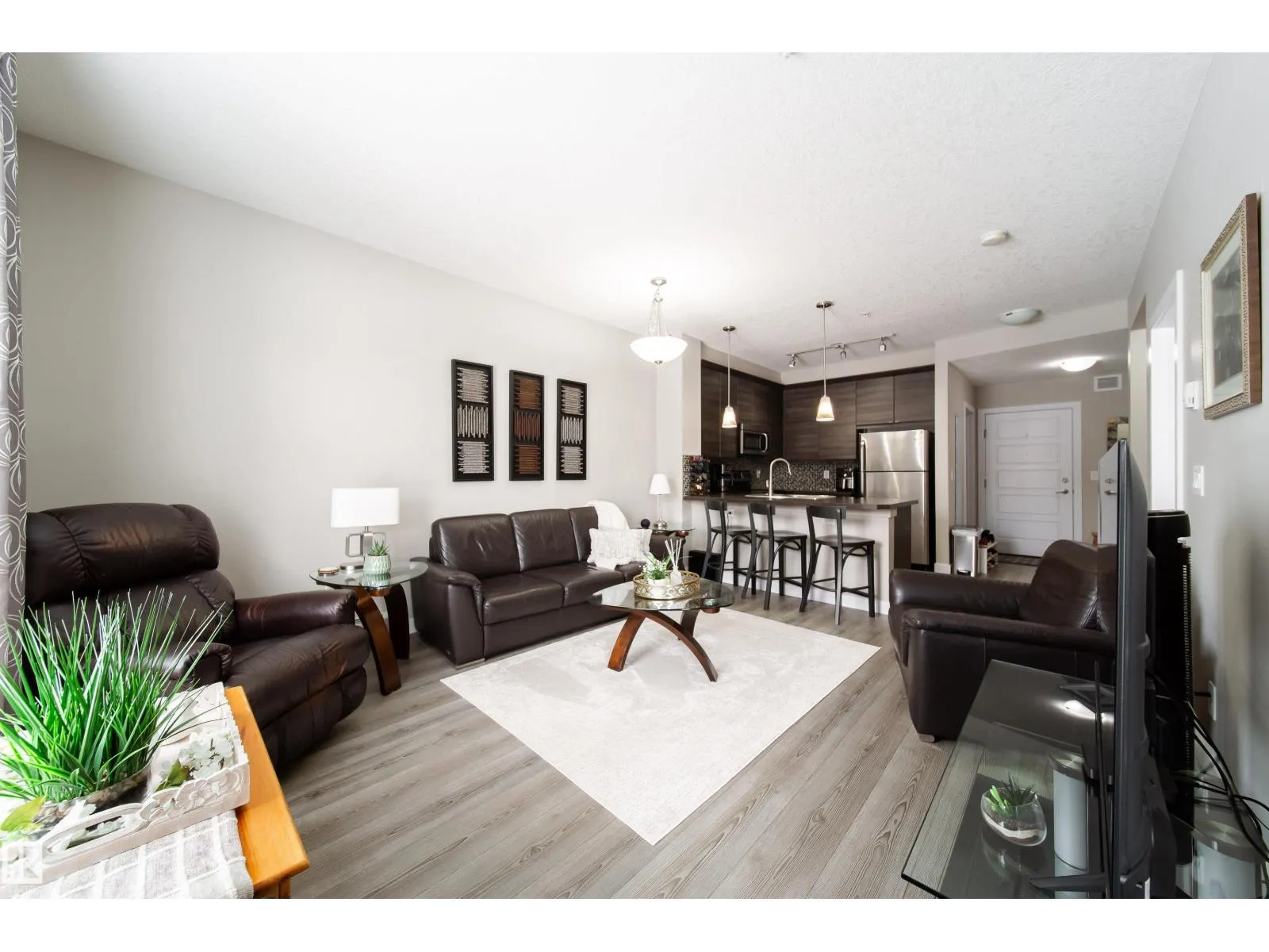 Welcome to The Ion in Ambleside - one of Southwest Edmonton's most sought-after urban communities. This stylish main-floor 1 bed/1 bath condo is tucked on the quiet side of the building, directly adjacent to the pond and offering a peaceful retreat from the bustle of the city. Inside, you'll find a bright, open-concept layout with luxury vinyl plank flooring. The sleek kitchen impresses with rich dark cabinetry, mosaic tile backsplash, stainless steel appliances, pendant lighting, and a raised breakfast bar perfect for entertaining. The spacious living room is flooded with natural light and opens to your private patio. The well-sized bedroom features a large window overlooking the tranquil surroundings. A generous foyer with a closet and in-suite laundry add everyday convenience, while titled underground parking completes this turnkey package. Residents enjoy access to a well-equipped fitness centre and guest suite within the complex. Steps to Ambleside's vibrant dining, shops, and walking! (id:27476)