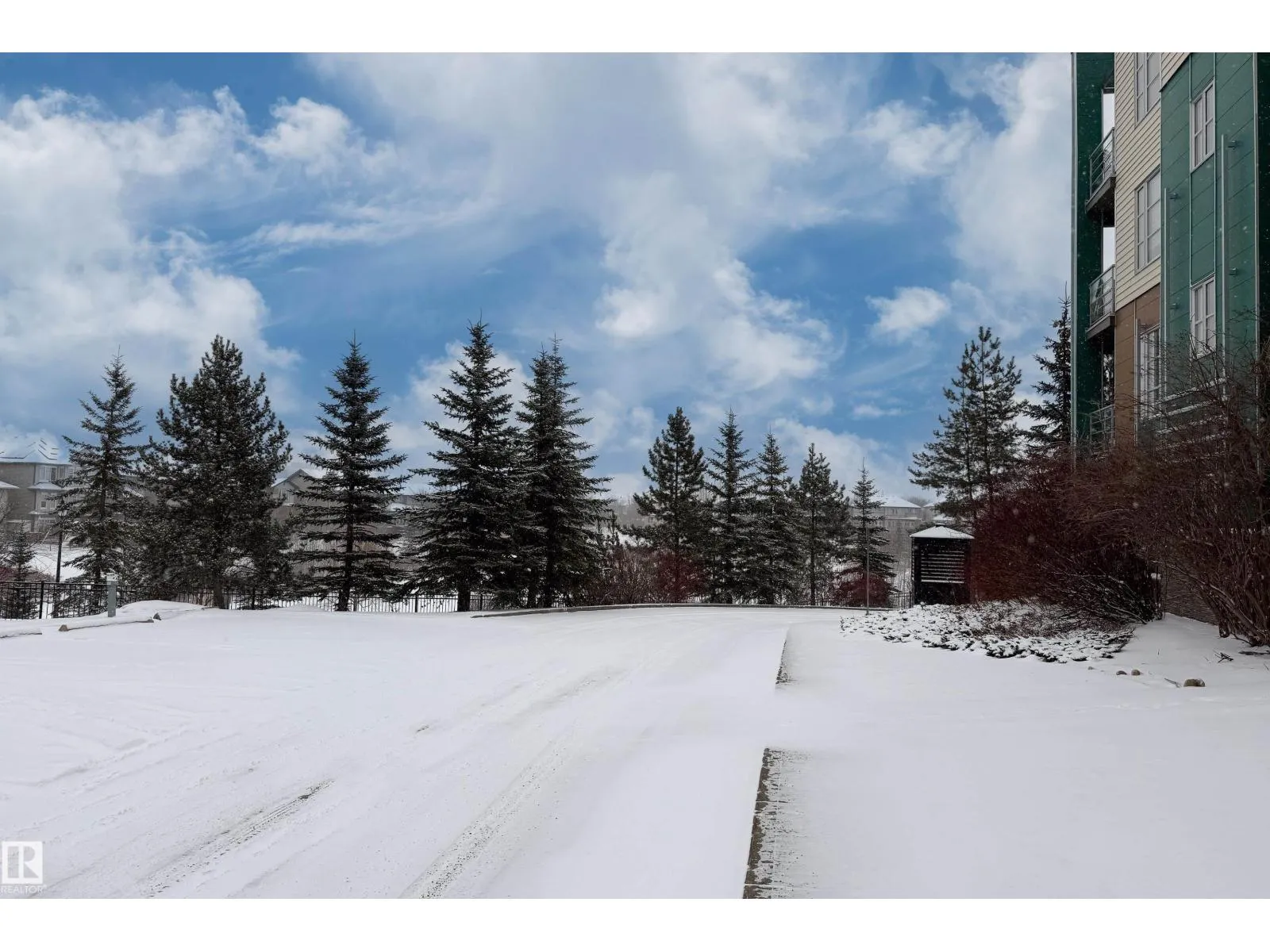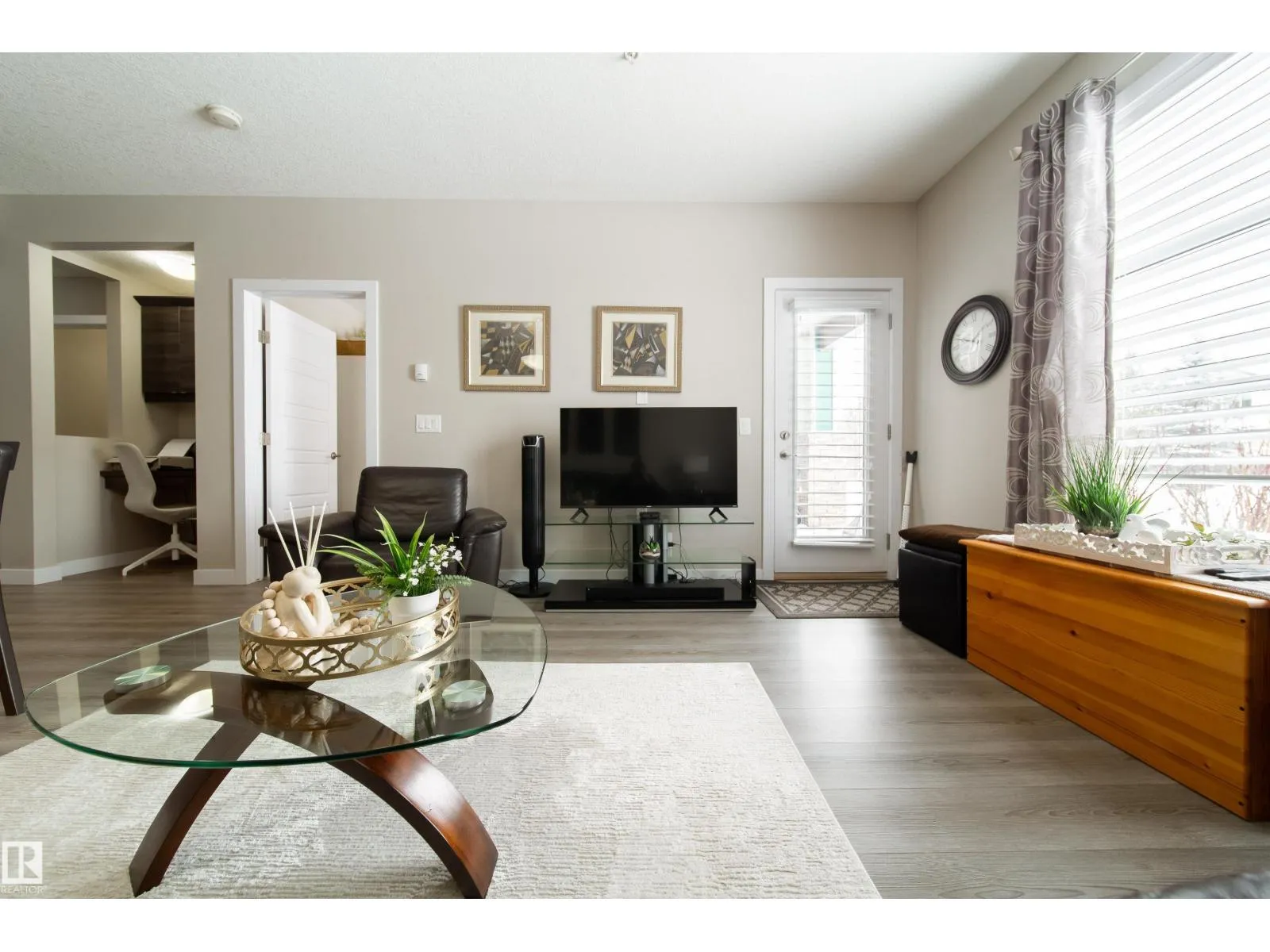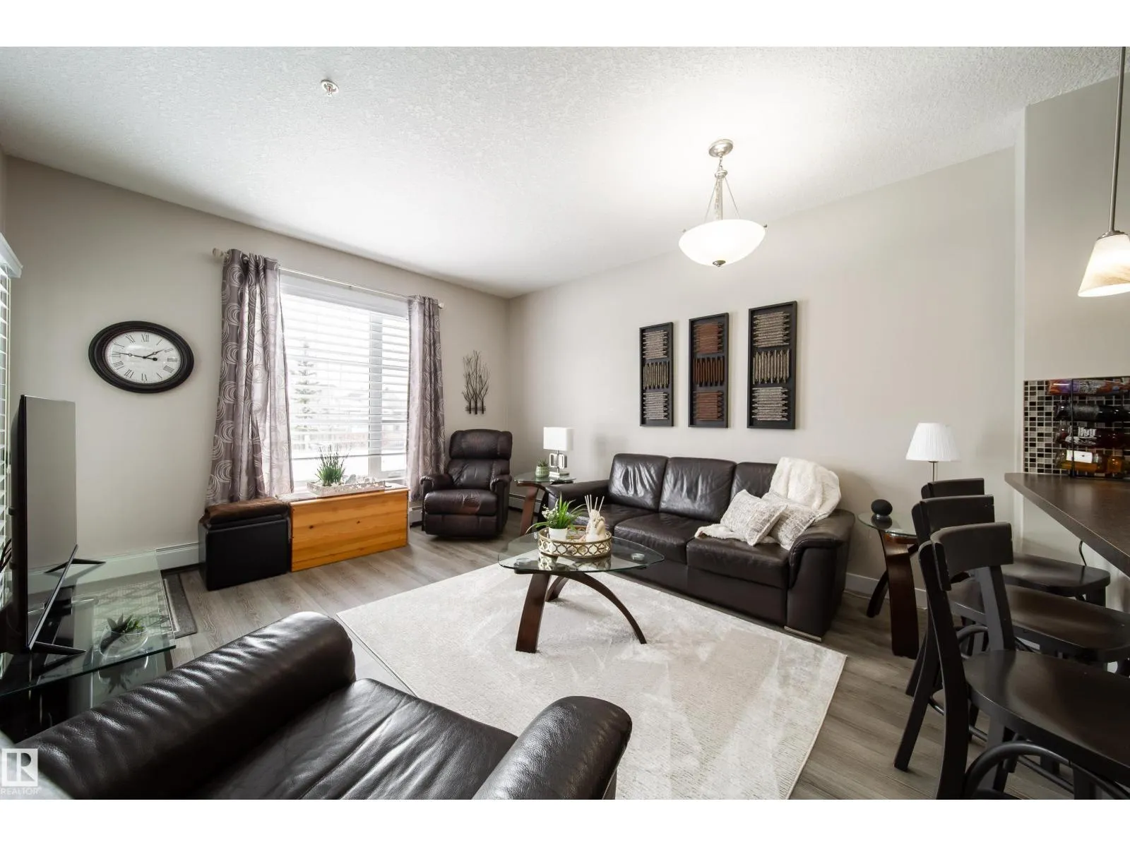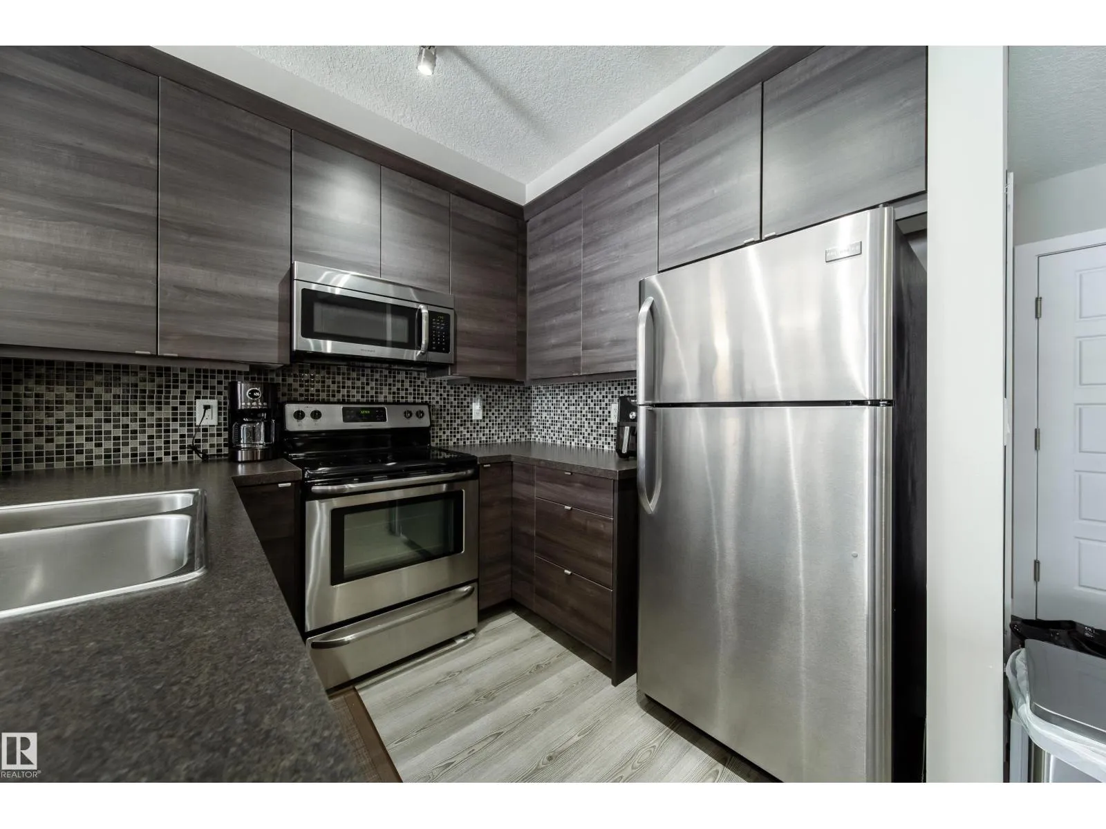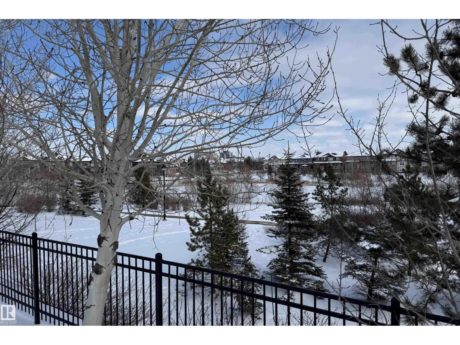 Welcome to The Ion in Ambleside - one of Southwest Edmonton's most sought-after urban communities. This stylish main-floor 1 bed/1 bath condo is tucked on the quiet side of the building, directly adjacent to the pond and offering a peaceful retreat from the bustle of the city. Inside, you'll find a bright, open-concept layout with luxury vinyl plank flooring. The sleek kitchen impresses with rich dark cabinetry, mosaic tile backsplash, stainless steel appliances, pendant lighting, and a raised breakfast bar perfect for entertaining. The spacious living room is flooded with natural light and opens to your private patio. The well-sized bedroom features a large window overlooking the tranquil surroundings. A generous foyer with a closet and in-suite laundry add everyday convenience, while titled underground parking completes this turnkey package. Residents enjoy access to a well-equipped fitness centre and guest suite within the complex. Steps to Ambleside's vibrant dining, shops, and walking! (id:27476)