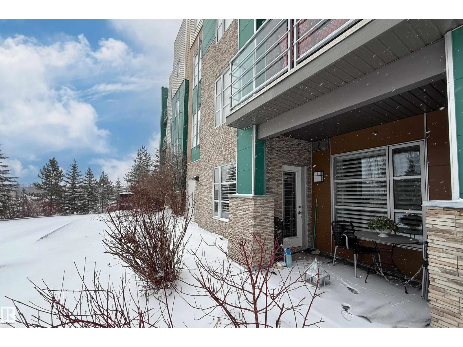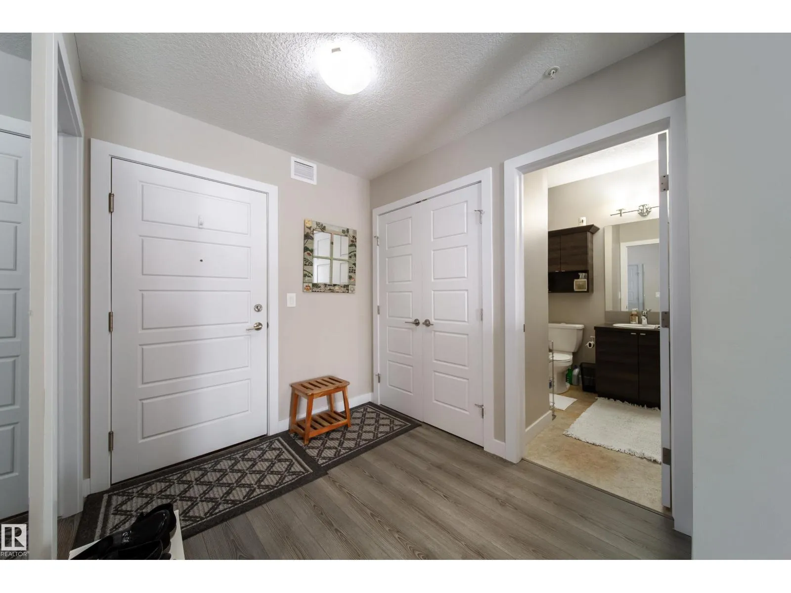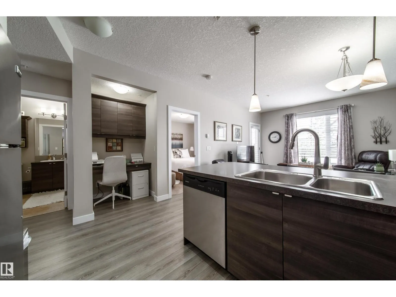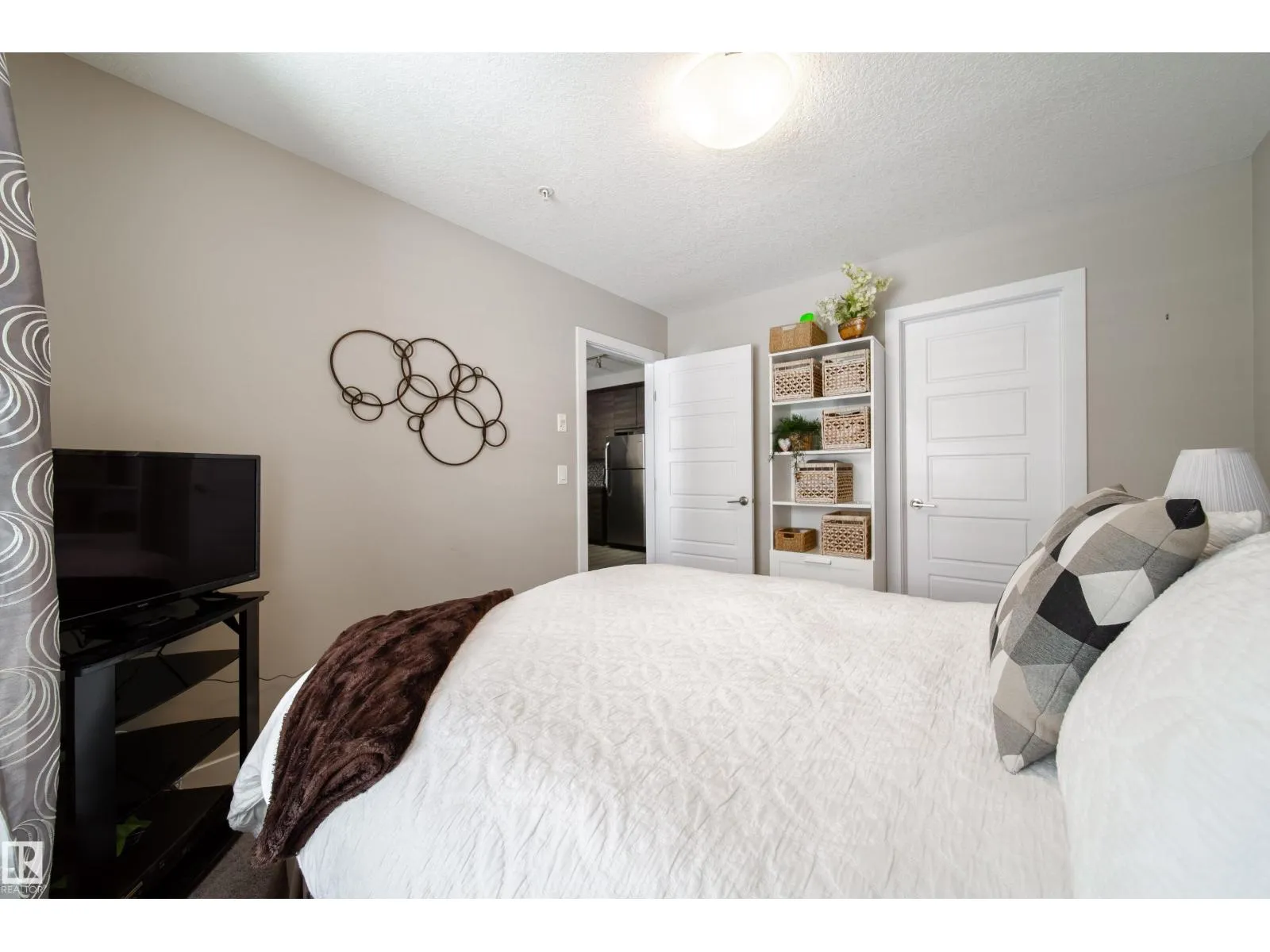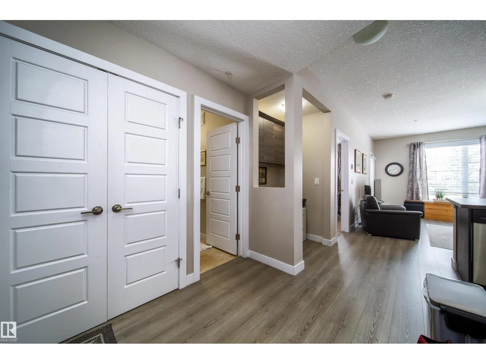 Welcome to The Ion in Ambleside - one of Southwest Edmonton's most sought-after urban communities. This stylish main-floor 1 bed/1 bath condo is tucked on the quiet side of the building, directly adjacent to the pond and offering a peaceful retreat from the bustle of the city. Inside, you'll find a bright, open-concept layout with luxury vinyl plank flooring. The sleek kitchen impresses with rich dark cabinetry, mosaic tile backsplash, stainless steel appliances, pendant lighting, and a raised breakfast bar perfect for entertaining. The spacious living room is flooded with natural light and opens to your private patio. The well-sized bedroom features a large window overlooking the tranquil surroundings. A generous foyer with a closet and in-suite laundry add everyday convenience, while titled underground parking completes this turnkey package. Residents enjoy access to a well-equipped fitness centre and guest suite within the complex. Steps to Ambleside's vibrant dining, shops, and walking! (id:27476)