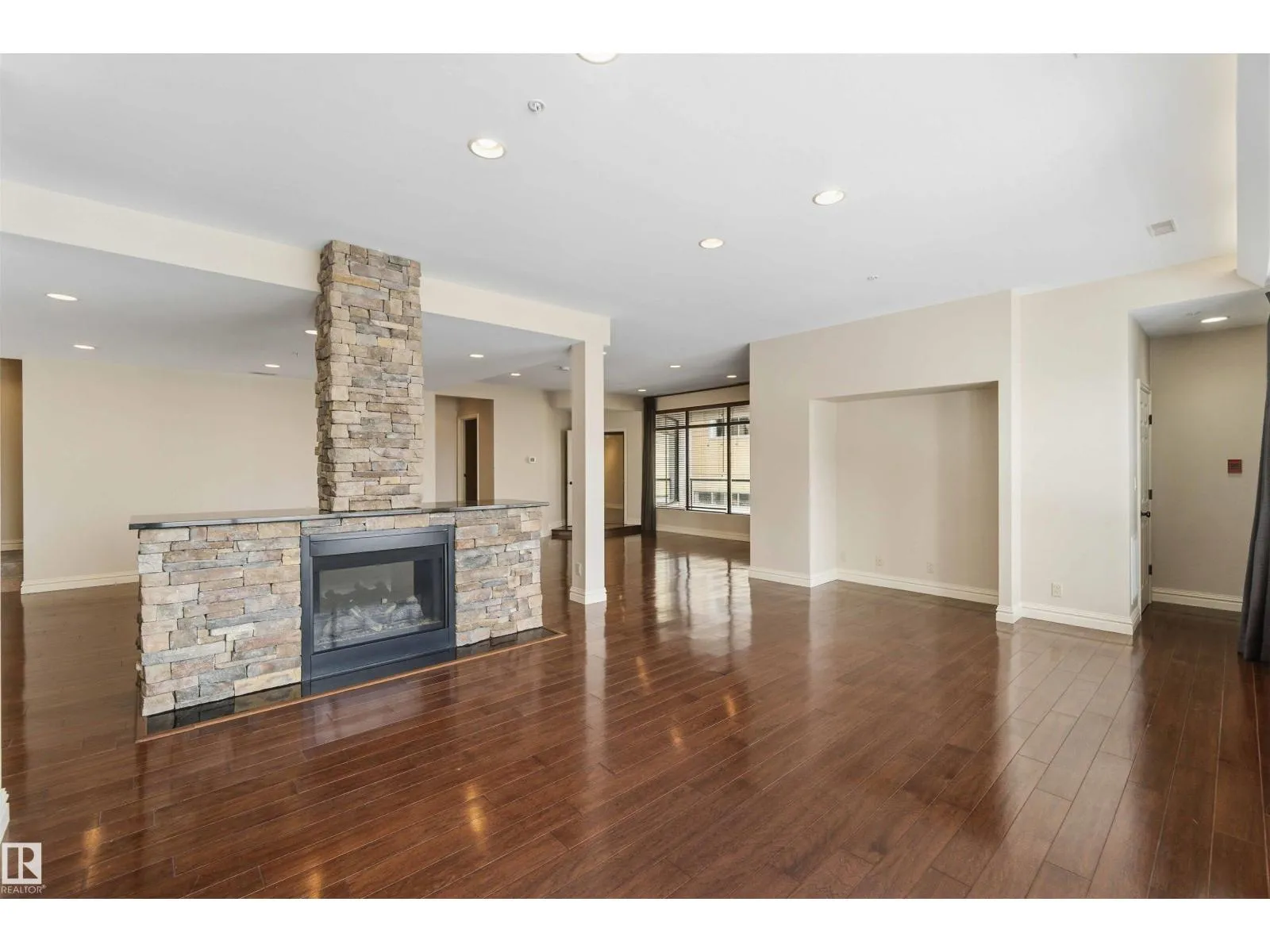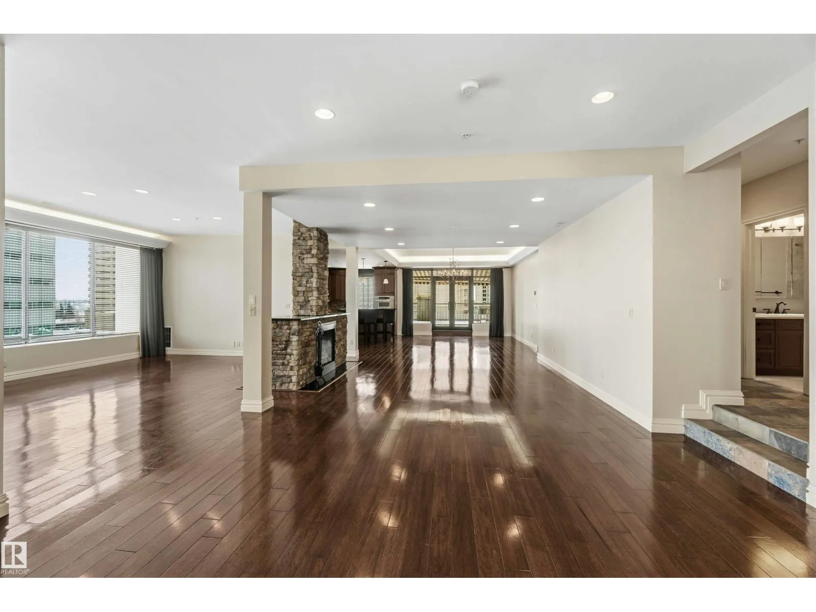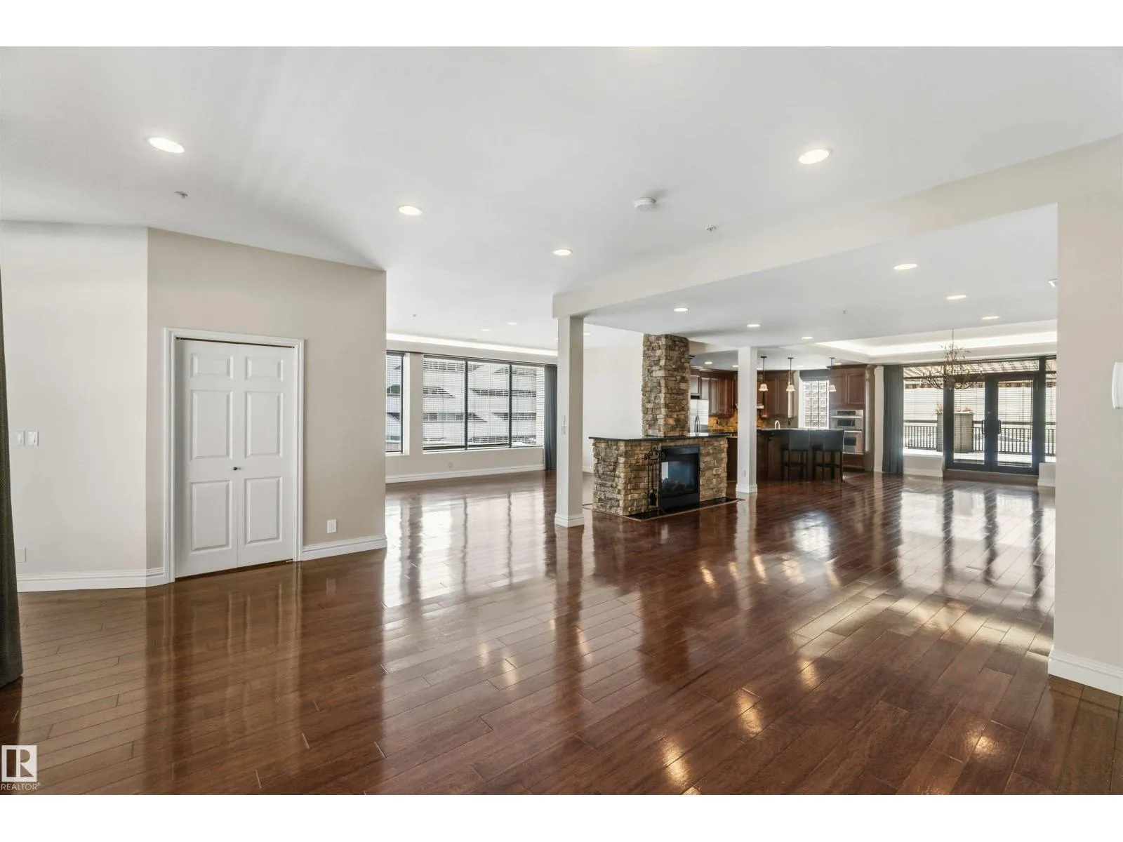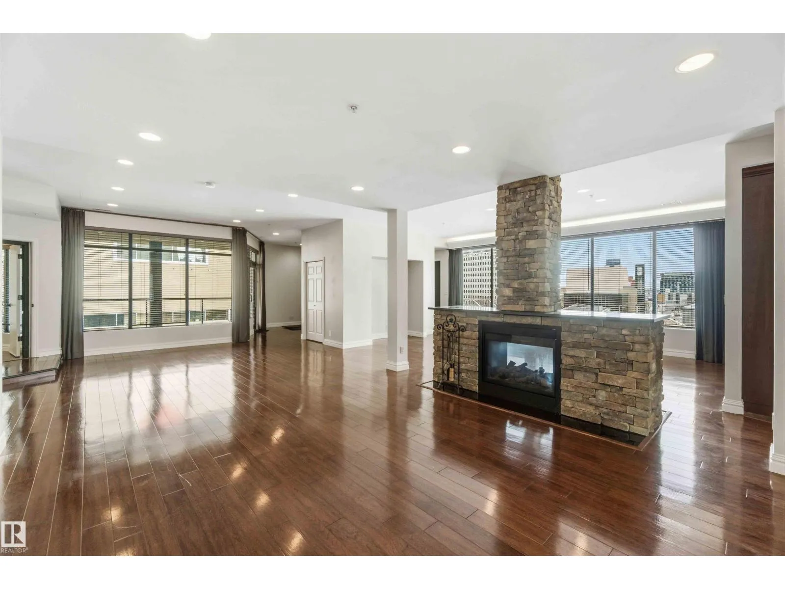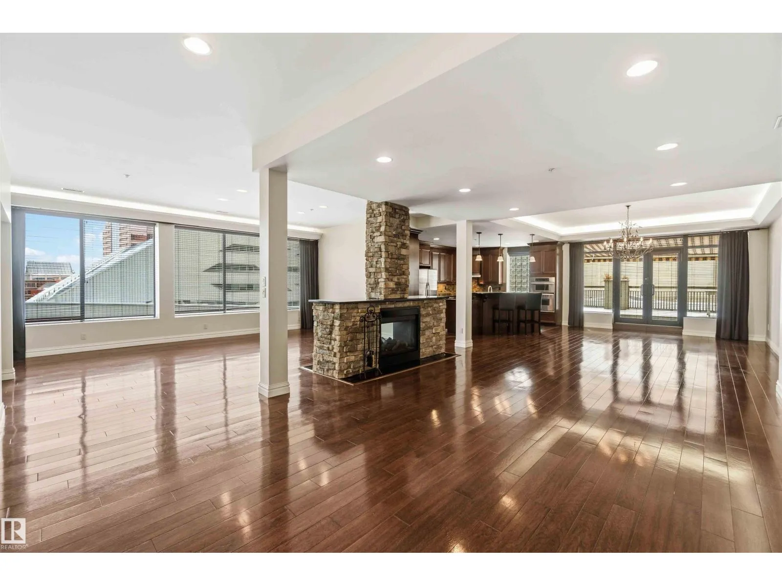 Gorgeous, impeccably maintained penthouse in the prestigious Churchill Exchange, offering 2,389 sq. ft. of refined living space with exceptional privacy and two private balconies. This elegant residence features an open-concept design with rich hardwood flooring and a spacious living room anchored by a striking two-sided gas fireplace.The adjoining family and dining area is perfect for everyday living and entertaining, with patio doors leading to a large, secluded terrace. The kitchen is thoughtfully appointed with abundant cabinetry, granite countertops, and a raised breakfast bar.The primary suite offers a walk-in closet & a bright 3-piece ensuite with skylight. Two additional bedrooms provide flexibility, with the third ideal as a den and offering access to the main 4-piece bath. Ample in-suite storage adds convenience. Complete with two titled underground parking stalls, additional storage & direct elevator access, this exceptional residence is ideally located near shopping, dining, and entertainment. (id:27476)