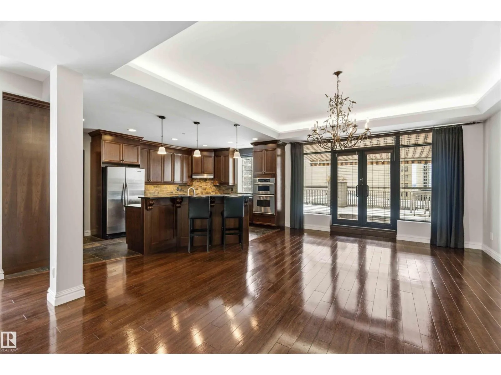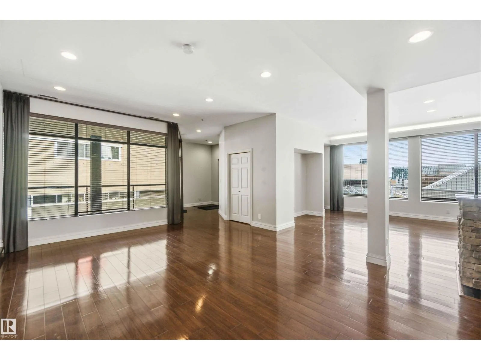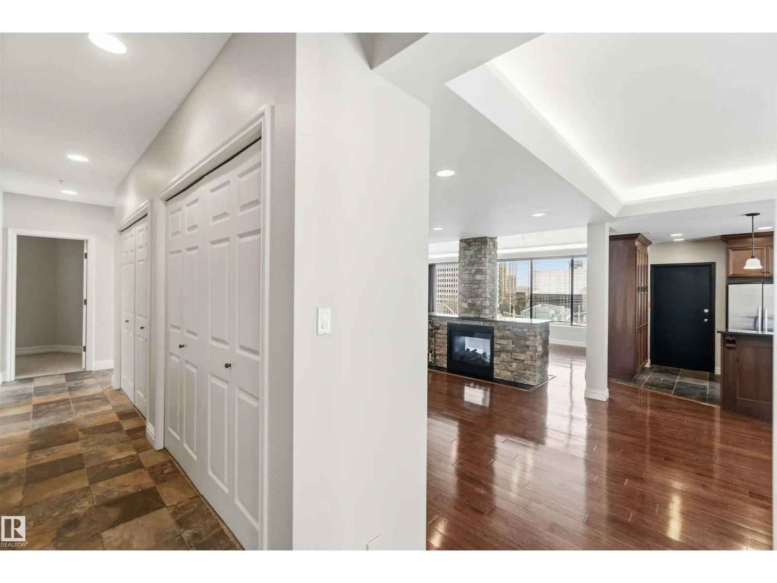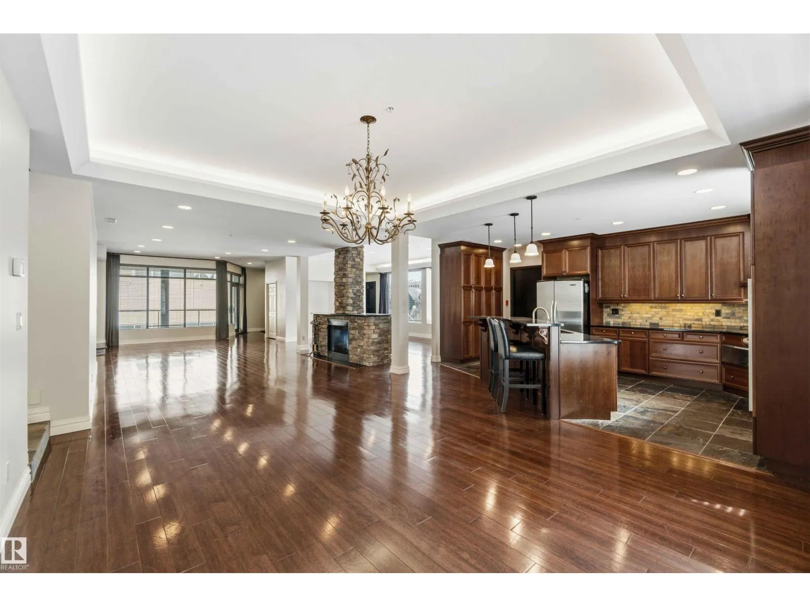 Gorgeous, impeccably maintained penthouse in the prestigious Churchill Exchange, offering 2,389 sq. ft. of refined living space with exceptional privacy and two private balconies. This elegant residence features an open-concept design with rich hardwood flooring and a spacious living room anchored by a striking two-sided gas fireplace.The adjoining family and dining area is perfect for everyday living and entertaining, with patio doors leading to a large, secluded terrace. The kitchen is thoughtfully appointed with abundant cabinetry, granite countertops, and a raised breakfast bar.The primary suite offers a walk-in closet & a bright 3-piece ensuite with skylight. Two additional bedrooms provide flexibility, with the third ideal as a den and offering access to the main 4-piece bath. Ample in-suite storage adds convenience. Complete with two titled underground parking stalls, additional storage & direct elevator access, this exceptional residence is ideally located near shopping, dining, and entertainment. (id:27476)