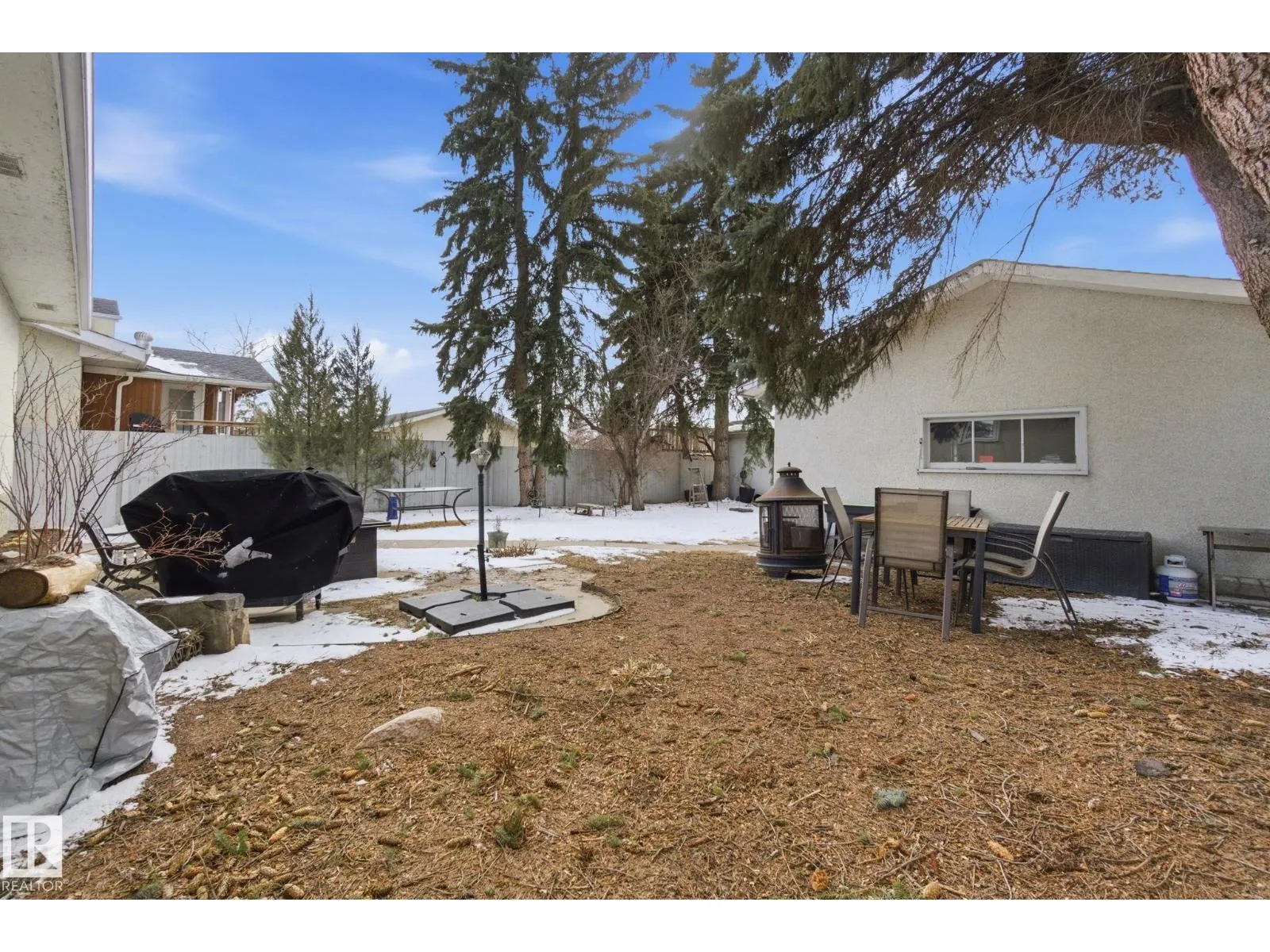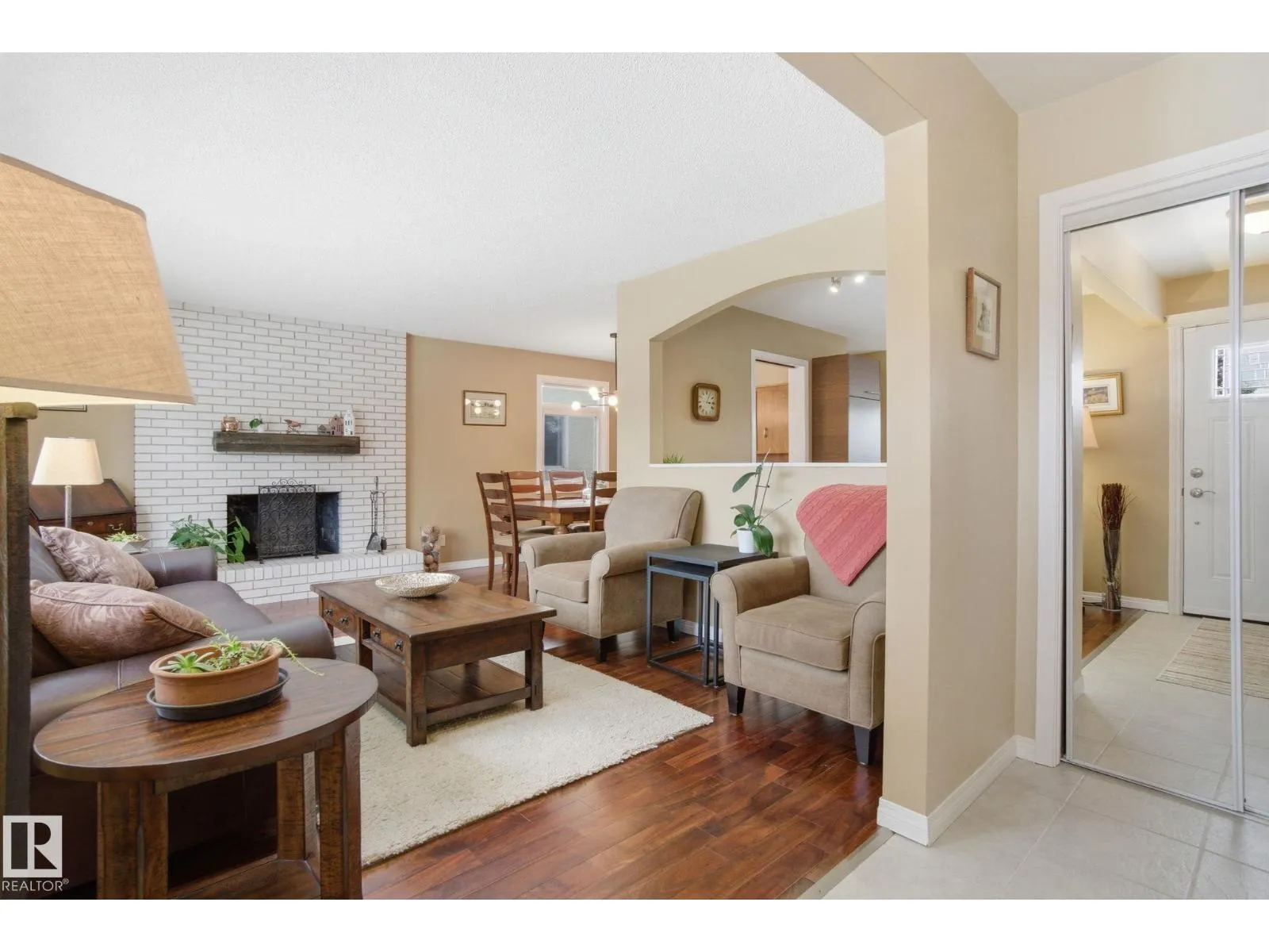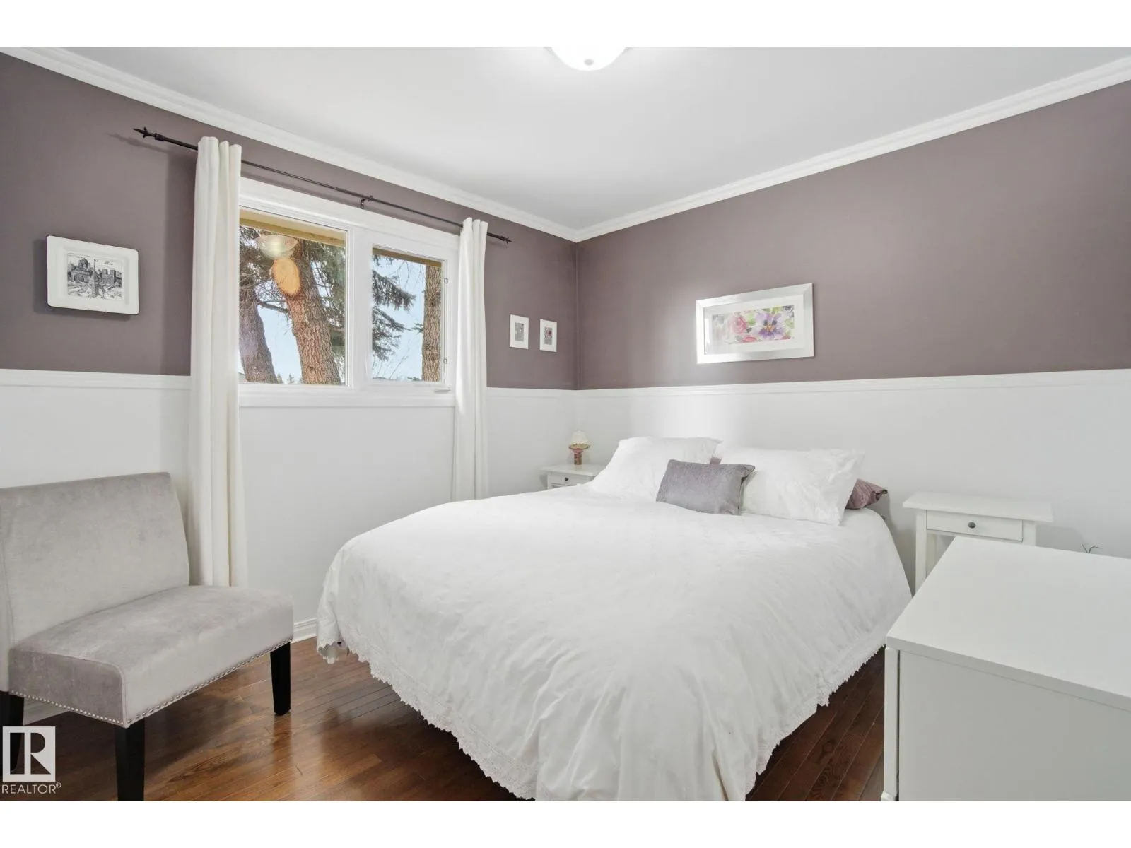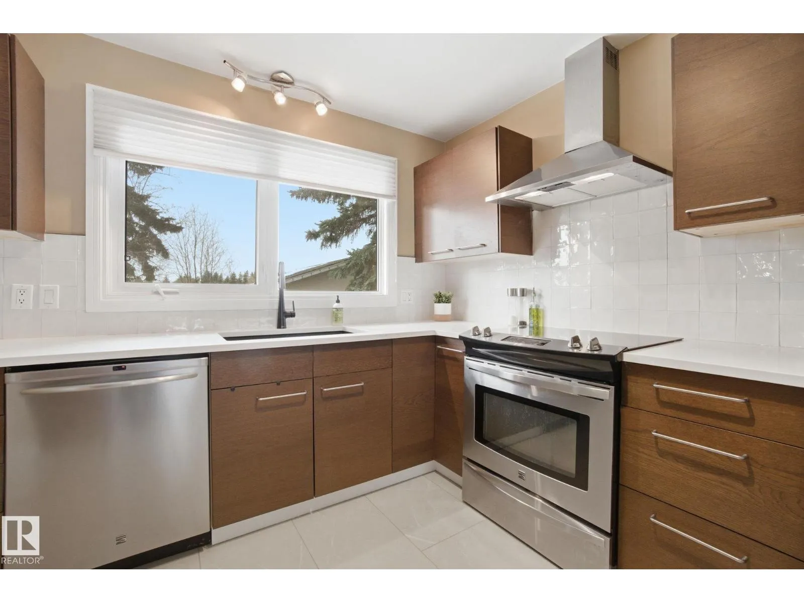 BACKING LANSDOWNE PARK! This gorgeous 4 bed 2.5 bath bungalow is perfectly located, spacious, bright and substantially updated! The kitchen has modern 2-tone wood & white cabinets, quartz counters, artisan tile backsplash & stainless steel appliances. There's a breakfast bar for seating & a formal dining area with a modern chandelier & mid-mod built-in china cabinet. The large living room has huge vinyl windows, hardwood floors & a brick wood-burning fireplace. 3 bedrooms on the main, an updated bathroom with quartz counters, 2 sinks, black faucets & custom tile tub surround. The primary has a 2pc ensuite & 2 closets. The basement is fully finished with vinyl flooring & carpet, a 2nd wood burning fireplace in the cozy family room, a flex space which can host an office, gym, or games area. There's also a 4th full bedroom, another full bathroom with a shower, laundry room & storage. Incredible neighbourhood - quick to Whitemud, University / Downtown. Backs onto Lansdowne Park & School / Community Hall. (id:27476)