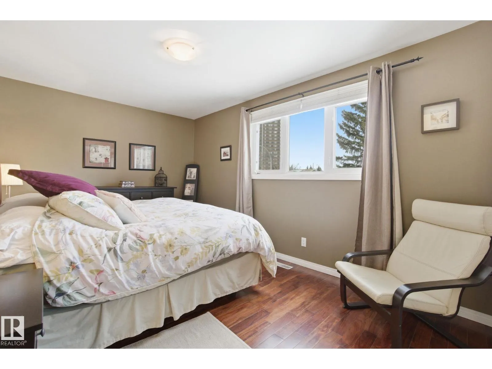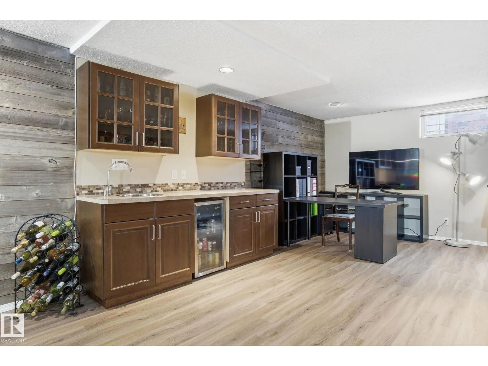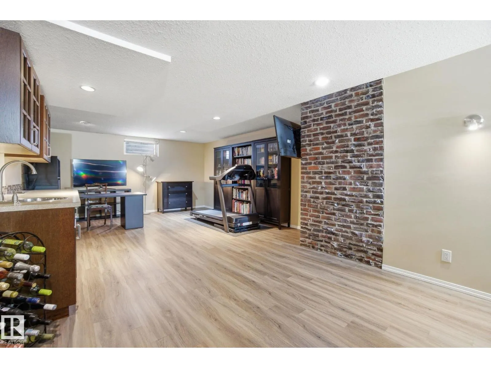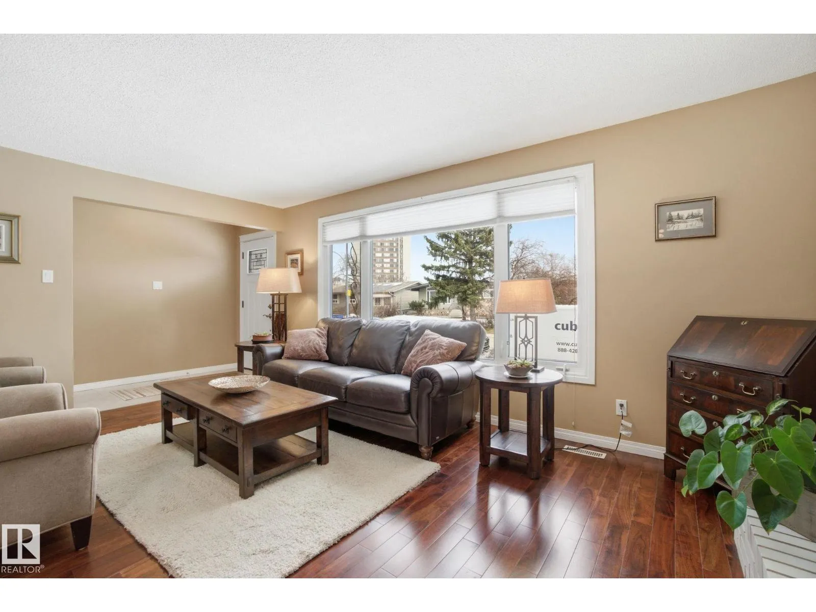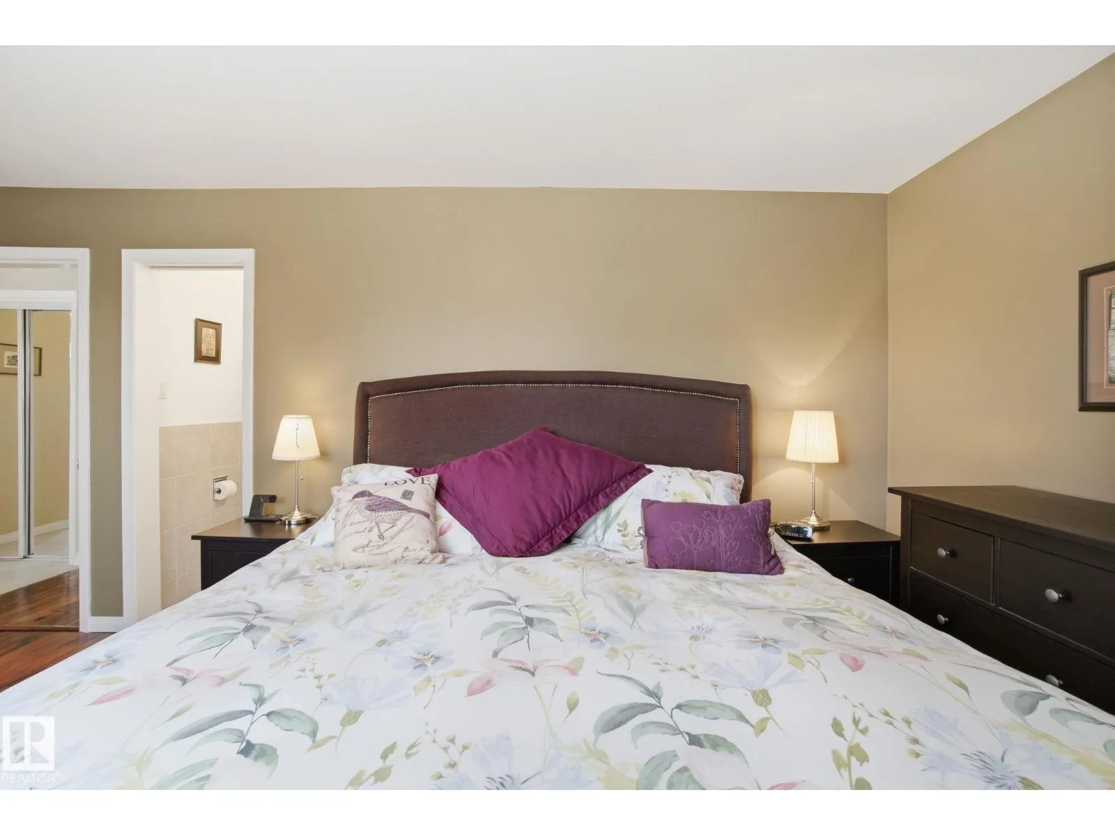 BACKING LANSDOWNE PARK! This gorgeous 4 bed 2.5 bath bungalow is perfectly located, spacious, bright and substantially updated! The kitchen has modern 2-tone wood & white cabinets, quartz counters, artisan tile backsplash & stainless steel appliances. There's a breakfast bar for seating & a formal dining area with a modern chandelier & mid-mod built-in china cabinet. The large living room has huge vinyl windows, hardwood floors & a brick wood-burning fireplace. 3 bedrooms on the main, an updated bathroom with quartz counters, 2 sinks, black faucets & custom tile tub surround. The primary has a 2pc ensuite & 2 closets. The basement is fully finished with vinyl flooring & carpet, a 2nd wood burning fireplace in the cozy family room, a flex space which can host an office, gym, or games area. There's also a 4th full bedroom, another full bathroom with a shower, laundry room & storage. Incredible neighbourhood - quick to Whitemud, University / Downtown. Backs onto Lansdowne Park & School / Community Hall. (id:27476)