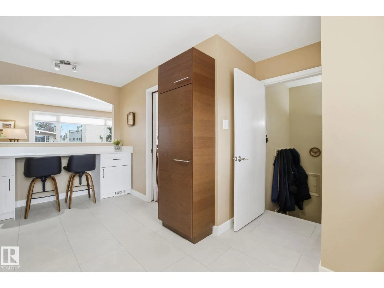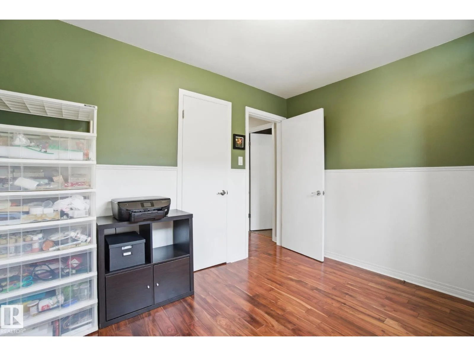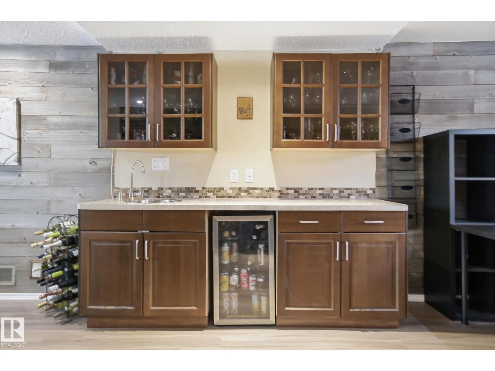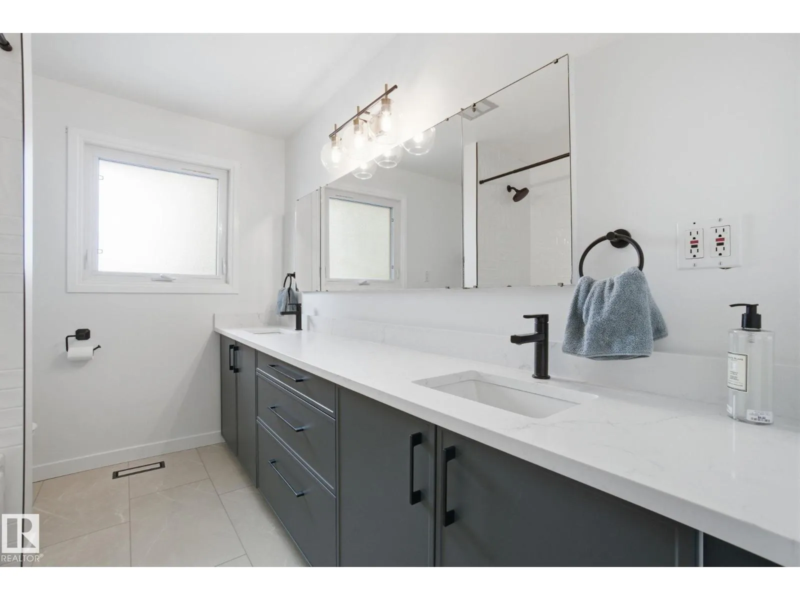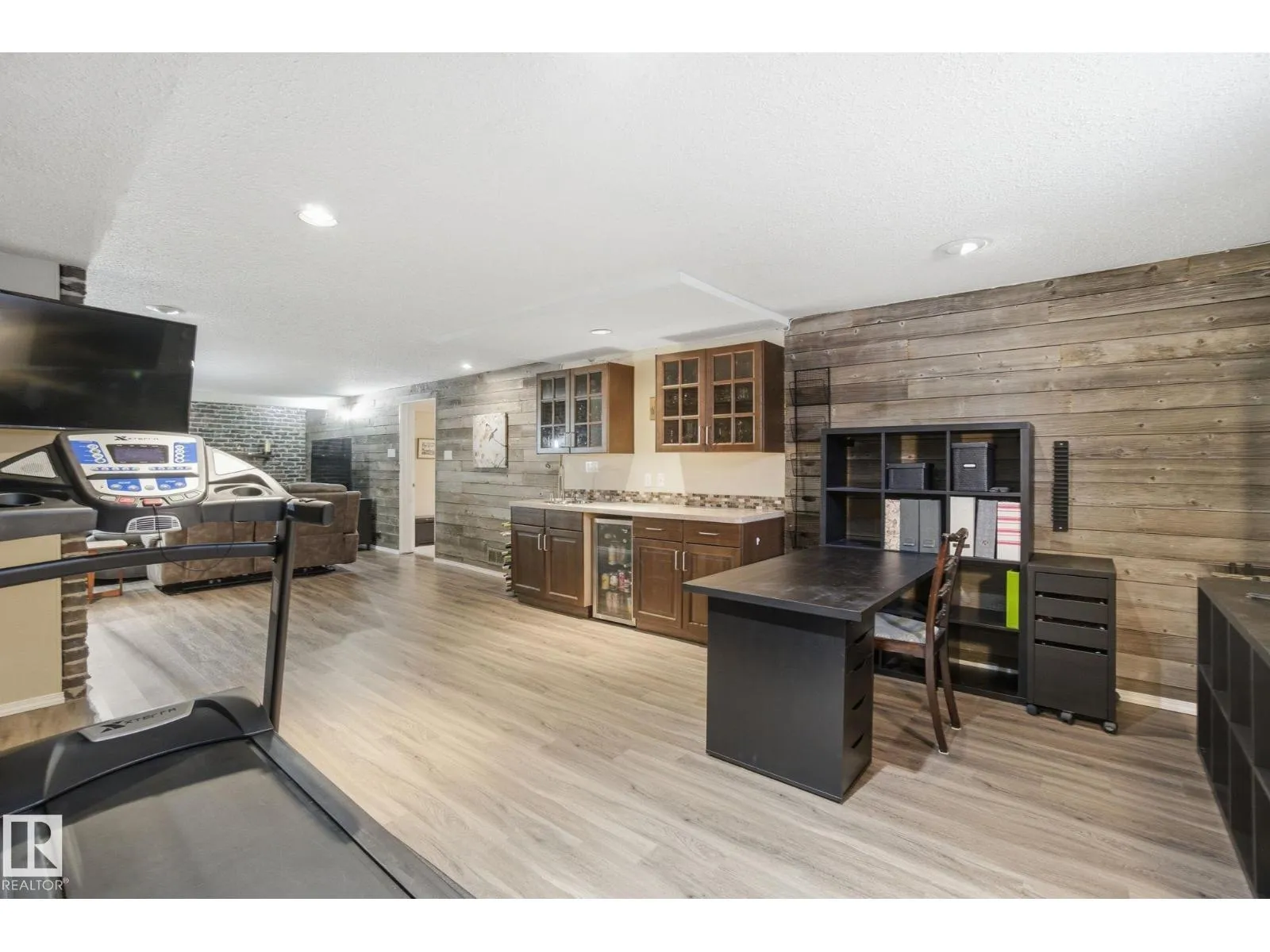 BACKING LANSDOWNE PARK! This gorgeous 4 bed 2.5 bath bungalow is perfectly located, spacious, bright and substantially updated! The kitchen has modern 2-tone wood & white cabinets, quartz counters, artisan tile backsplash & stainless steel appliances. There's a breakfast bar for seating & a formal dining area with a modern chandelier & mid-mod built-in china cabinet. The large living room has huge vinyl windows, hardwood floors & a brick wood-burning fireplace. 3 bedrooms on the main, an updated bathroom with quartz counters, 2 sinks, black faucets & custom tile tub surround. The primary has a 2pc ensuite & 2 closets. The basement is fully finished with vinyl flooring & carpet, a 2nd wood burning fireplace in the cozy family room, a flex space which can host an office, gym, or games area. There's also a 4th full bedroom, another full bathroom with a shower, laundry room & storage. Incredible neighbourhood - quick to Whitemud, University / Downtown. Backs onto Lansdowne Park & School / Community Hall. (id:27476)