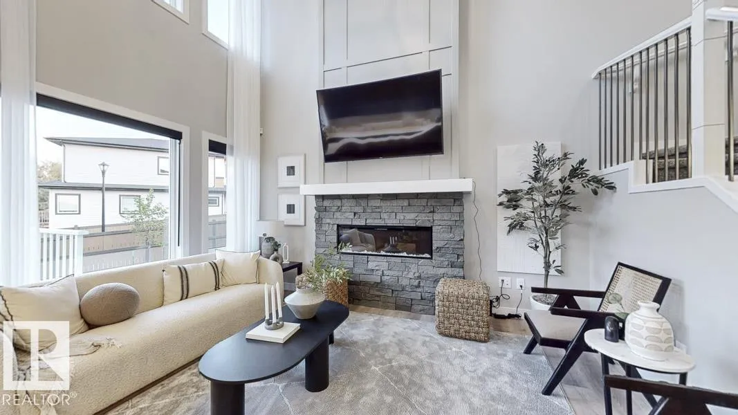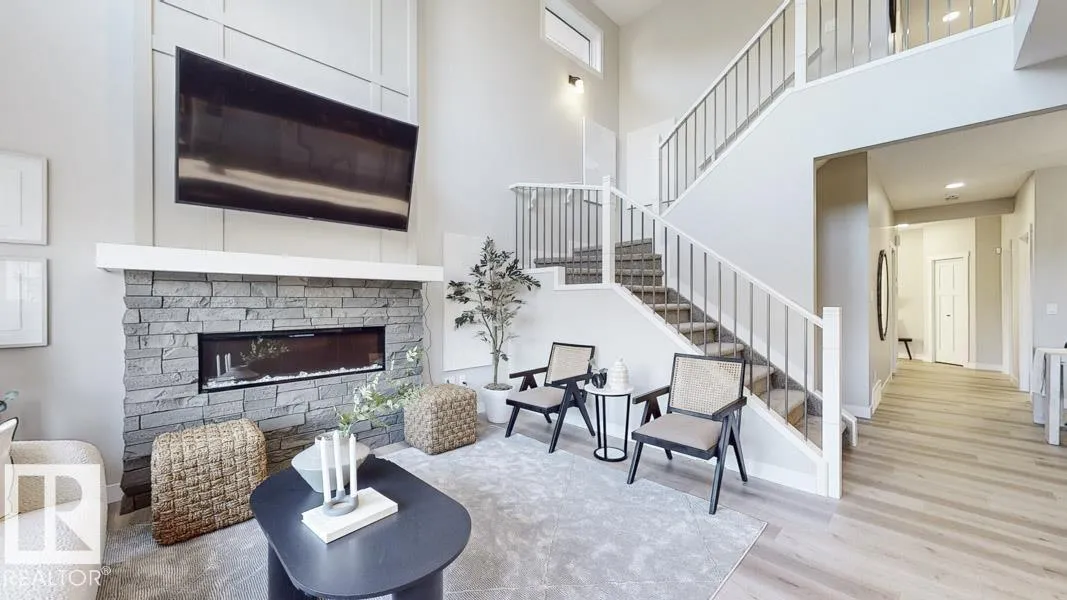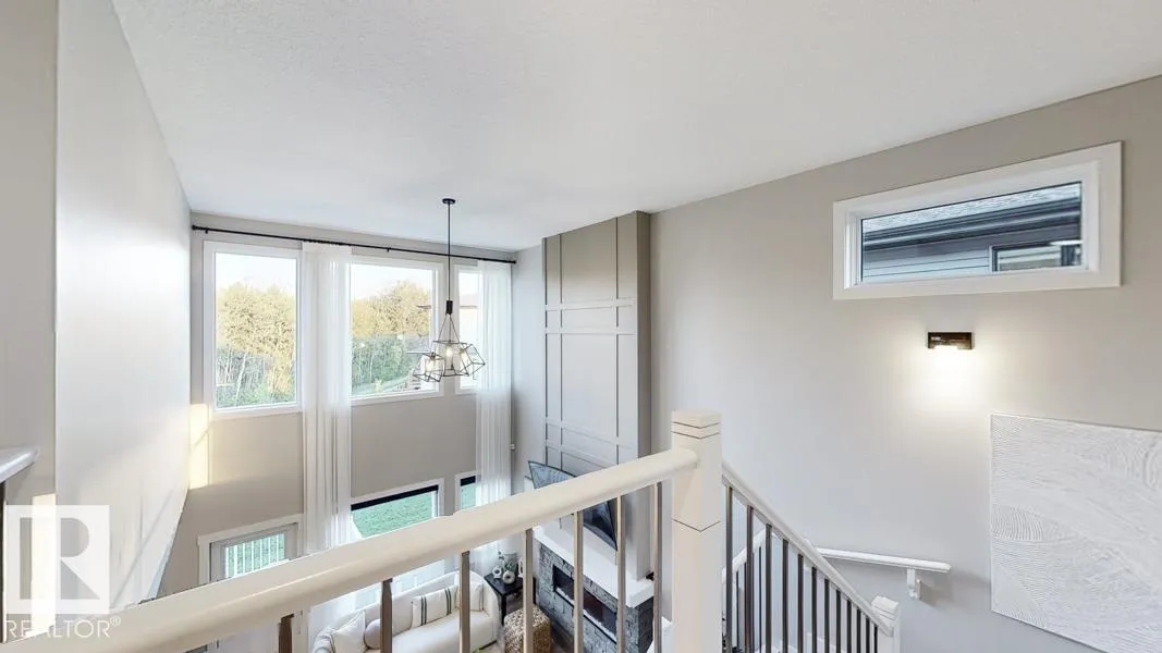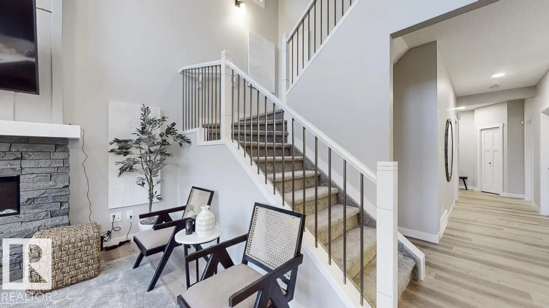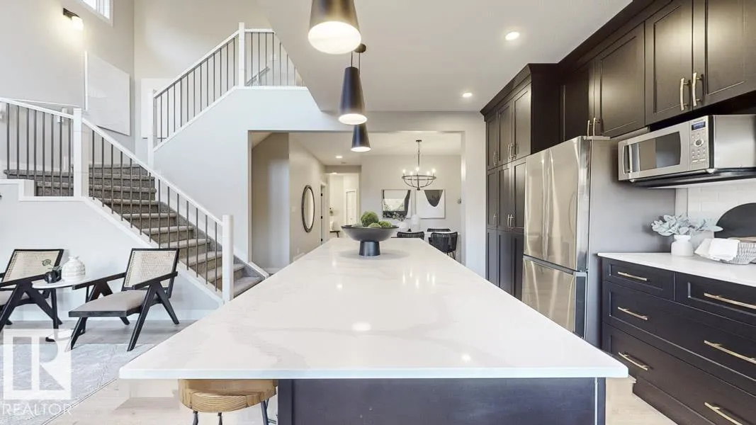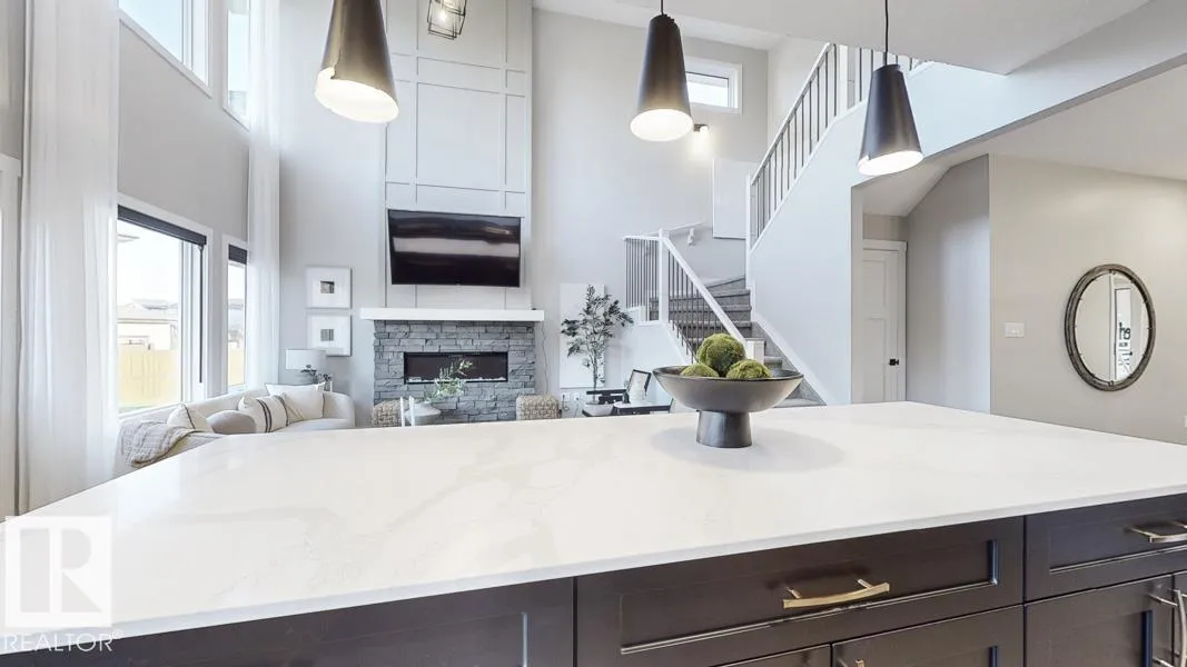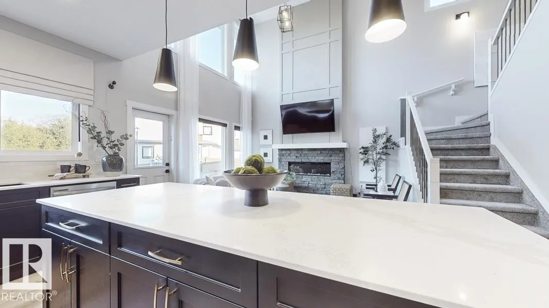 Built by Sterling Homes, this 2,211 sq ft home features a double attached garage with floor drain, 9-ft ceilings on the main and lower floors, side entrance, and luxury vinyl plank flooring on the main and upper levels. The foyer with coat closet opens to a mudroom off the garage, a full 3-pc bath with walk-in shower, and a main-floor bedroom or denâideal for guests or a home office. A formal dining room sits separate from the open great room and kitchen. The kitchen offers quartz countertops, an island with a flush eating ledge and waterfall edge, a Silgranit sink, a built-in microwave, pendant lighting, chimney hood, full-height backsplash, soft-close cabinets with raised doors, and a pantry. The great room features a fireplace, large windows, 17-ft open-to-above ceiling, and a garden door to the deck. Upstairs includes a primary suite with a walk-in closet and a 5-pc ensuite, bonus room, a laundry with cabinets, two additional bedrooms, and a full bath. Basement rough-ins included. (id:27476)