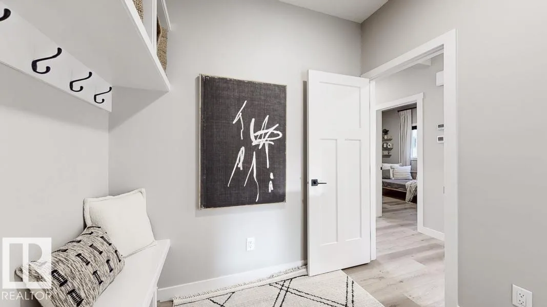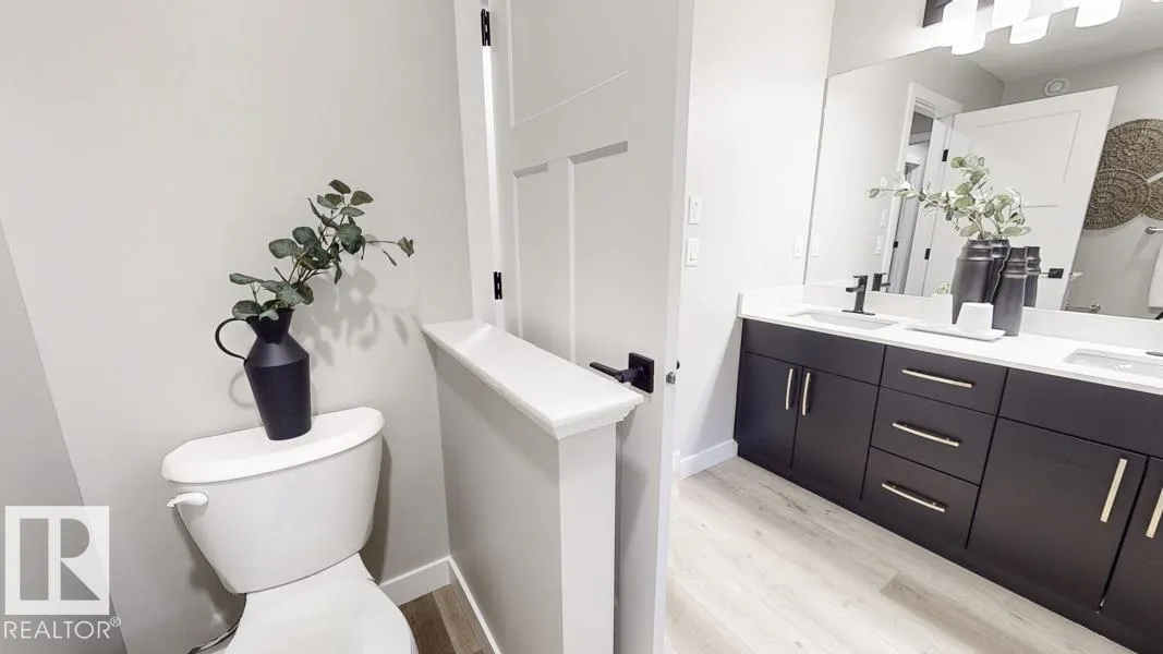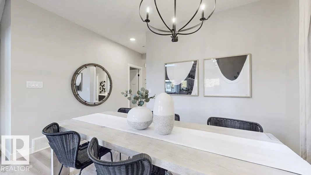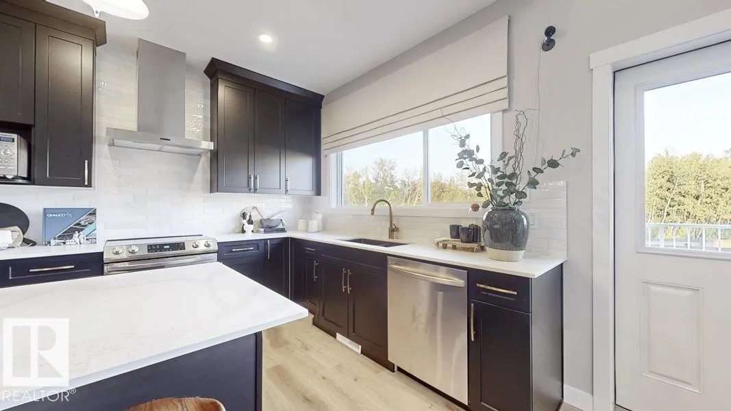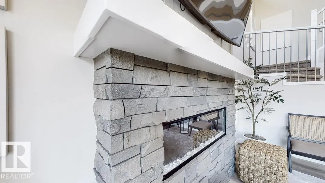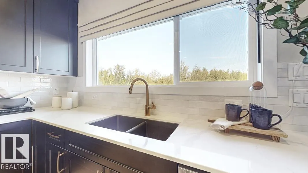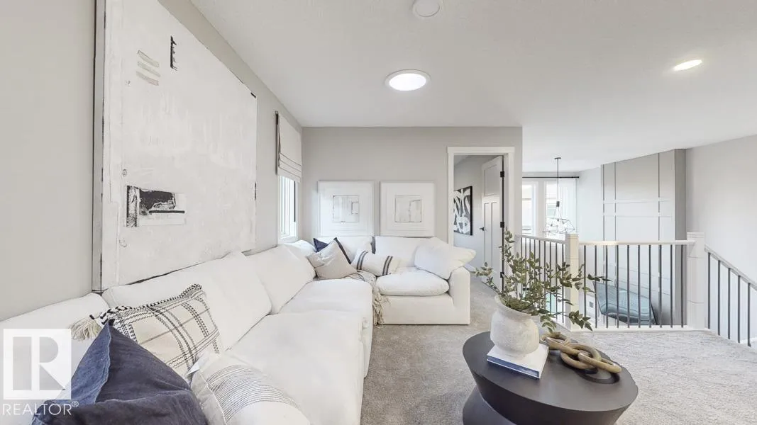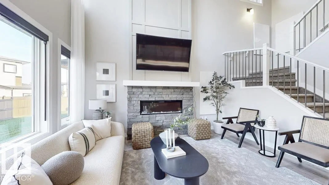 Built by Sterling Homes, this 2,211 sq ft home features a double attached garage with floor drain, 9-ft ceilings on the main and lower floors, side entrance, and luxury vinyl plank flooring on the main and upper levels. The foyer with coat closet opens to a mudroom off the garage, a full 3-pc bath with walk-in shower, and a main-floor bedroom or denâideal for guests or a home office. A formal dining room sits separate from the open great room and kitchen. The kitchen offers quartz countertops, an island with a flush eating ledge and waterfall edge, a Silgranit sink, a built-in microwave, pendant lighting, chimney hood, full-height backsplash, soft-close cabinets with raised doors, and a pantry. The great room features a fireplace, large windows, 17-ft open-to-above ceiling, and a garden door to the deck. Upstairs includes a primary suite with a walk-in closet and a 5-pc ensuite, bonus room, a laundry with cabinets, two additional bedrooms, and a full bath. Basement rough-ins included. (id:27476)