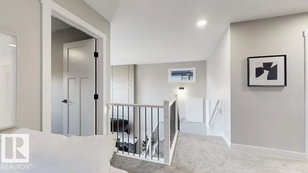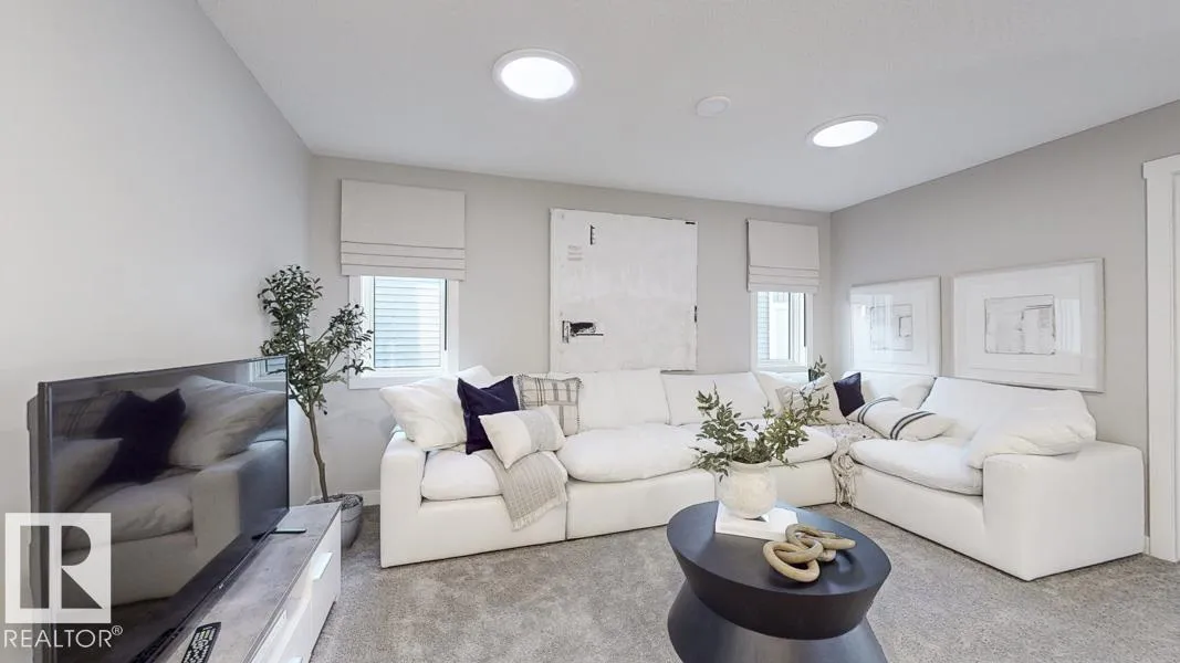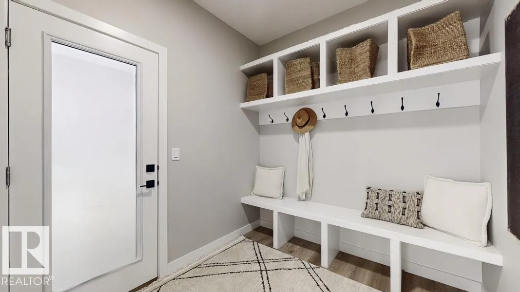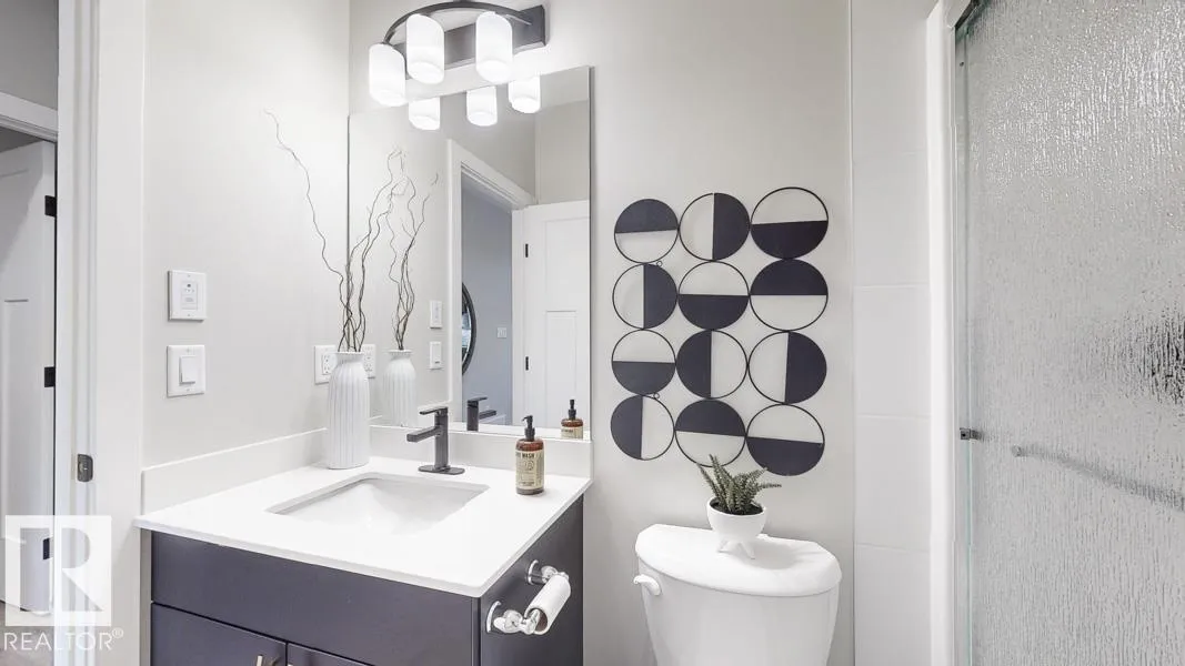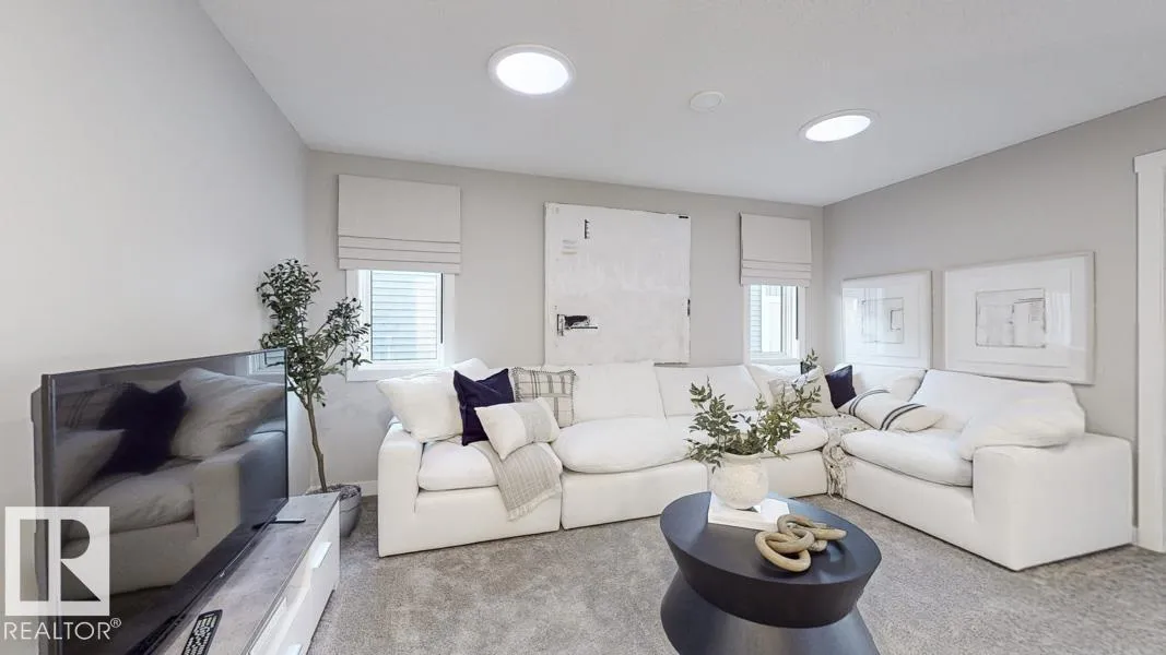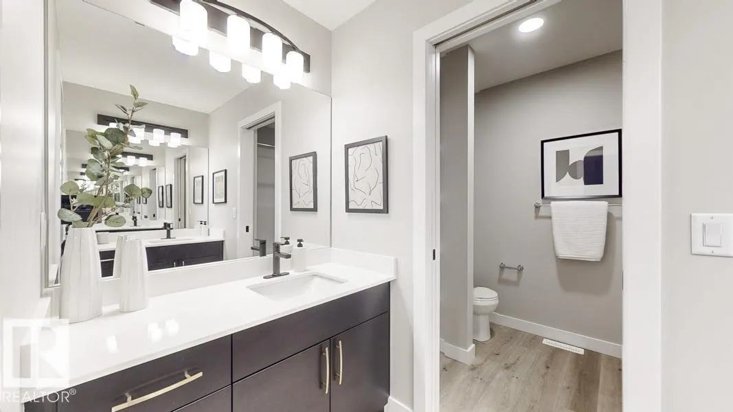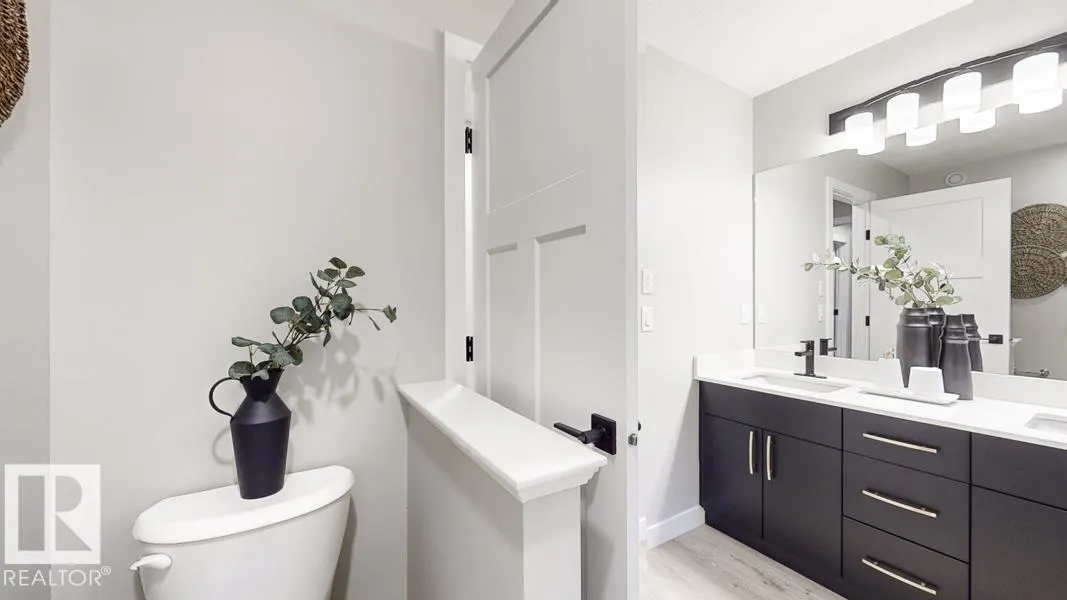Built by Sterling Homes, this 2,211 sq ft home features a double attached garage with floor drain, 9-ft ceilings on the main and lower floors, side entrance, and luxury vinyl plank flooring on the main and upper levels. The foyer with coat closet opens to a mudroom off the garage, a full 3-pc bath with walk-in shower, and a main-floor bedroom or denâideal for guests or a home office. A formal dining room sits separate from the open great room and kitchen. The kitchen offers quartz countertops, an island with a flush eating ledge and waterfall edge, a Silgranit sink, a built-in microwave, pendant lighting, chimney hood, full-height backsplash, soft-close cabinets with raised doors, and a pantry. The great room features a fireplace, large windows, 17-ft open-to-above ceiling, and a garden door to the deck. Upstairs includes a primary suite with a walk-in closet and a 5-pc ensuite, bonus room, a laundry with cabinets, two additional bedrooms, and a full bath. Basement rough-ins included. (id:27476)