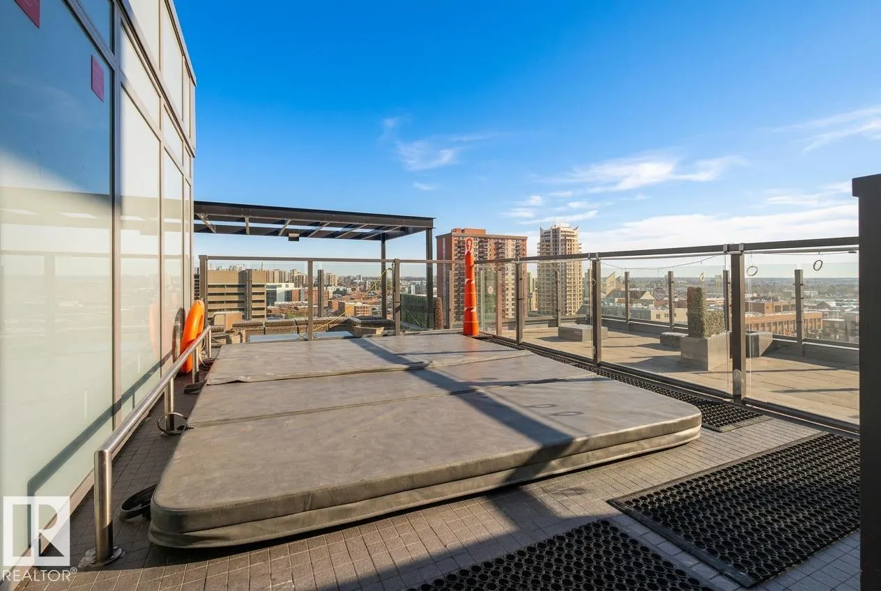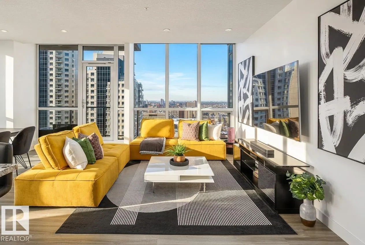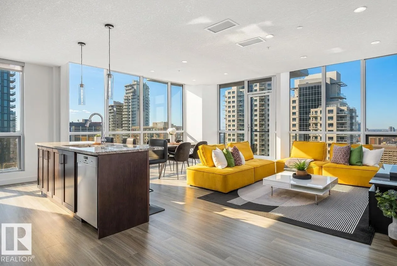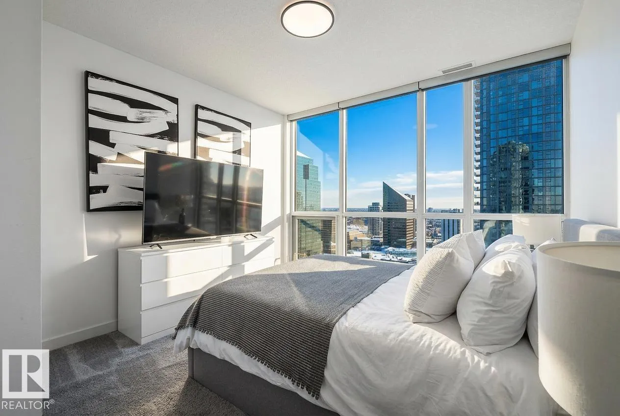 Modern 21st-floor corner unit with panoramic skyline views and floor-to-ceiling windows that bring in incredible natural light. Originally designed as a two-bedroom, the open-concept layout creates a spacious and functional living area perfect for everyday living or entertaining. The kitchen features granite countertops, a large island with seating, and flows seamlessly into the dining and living space. The primary bedroom is complemented by two full bathrooms, offering added comfort and flexibility. Enjoy premium amenities including a fitness centre, social lounge, and outdoor terrace, all steps from downtownâs best restaurants, shopping, Rogers Place, and the Ice District. Includes titled underground parking and central A/C. Exceptional value in a prime downtown location. (id:27476)