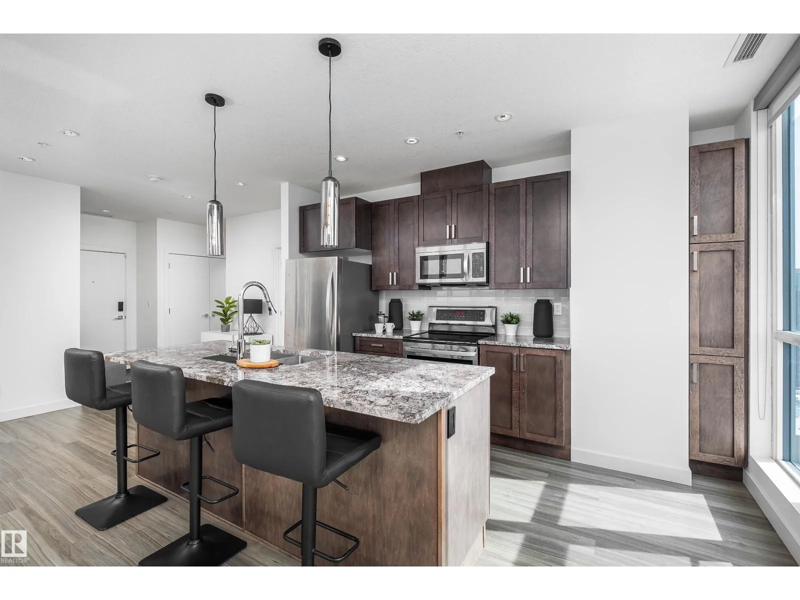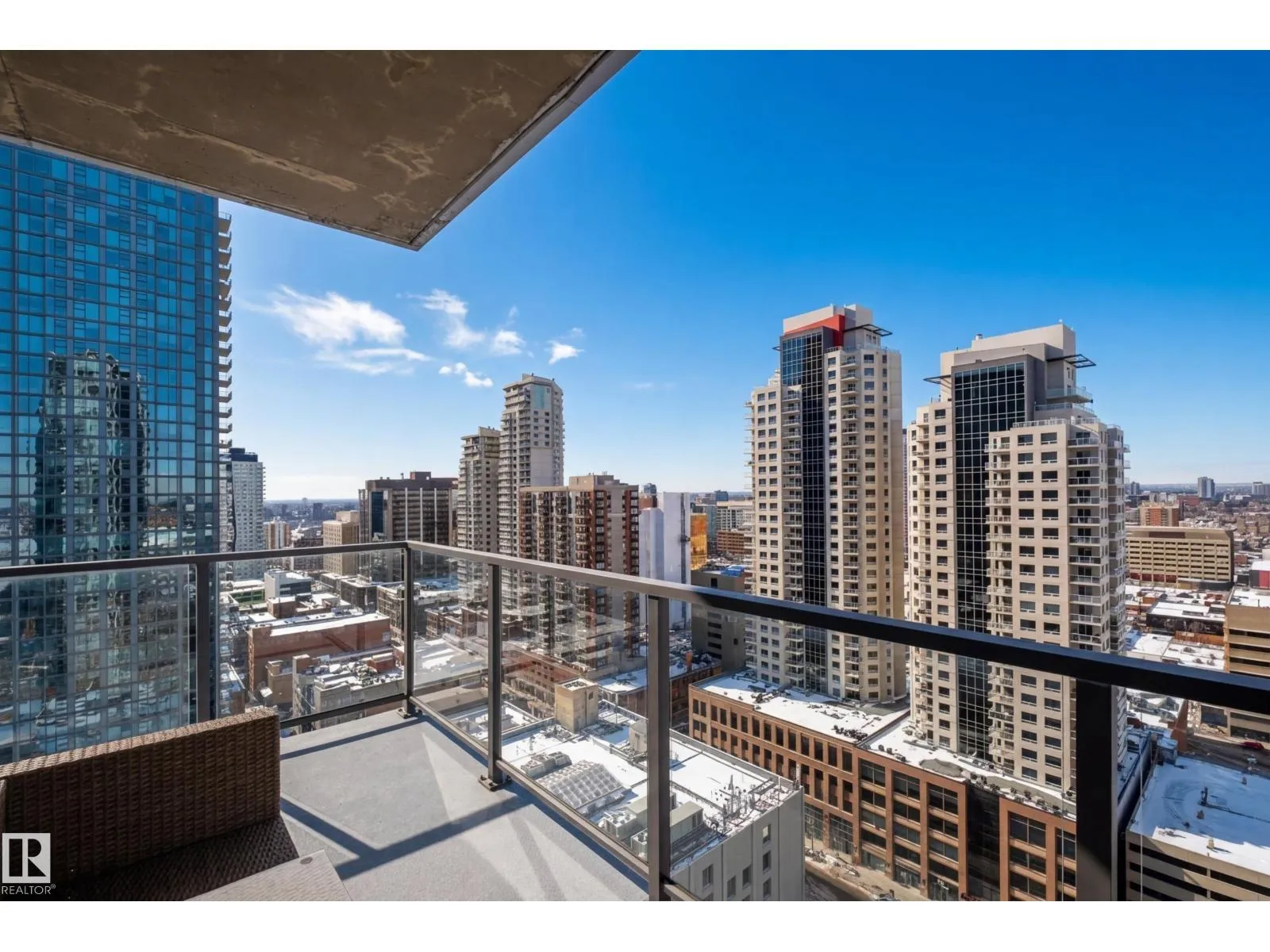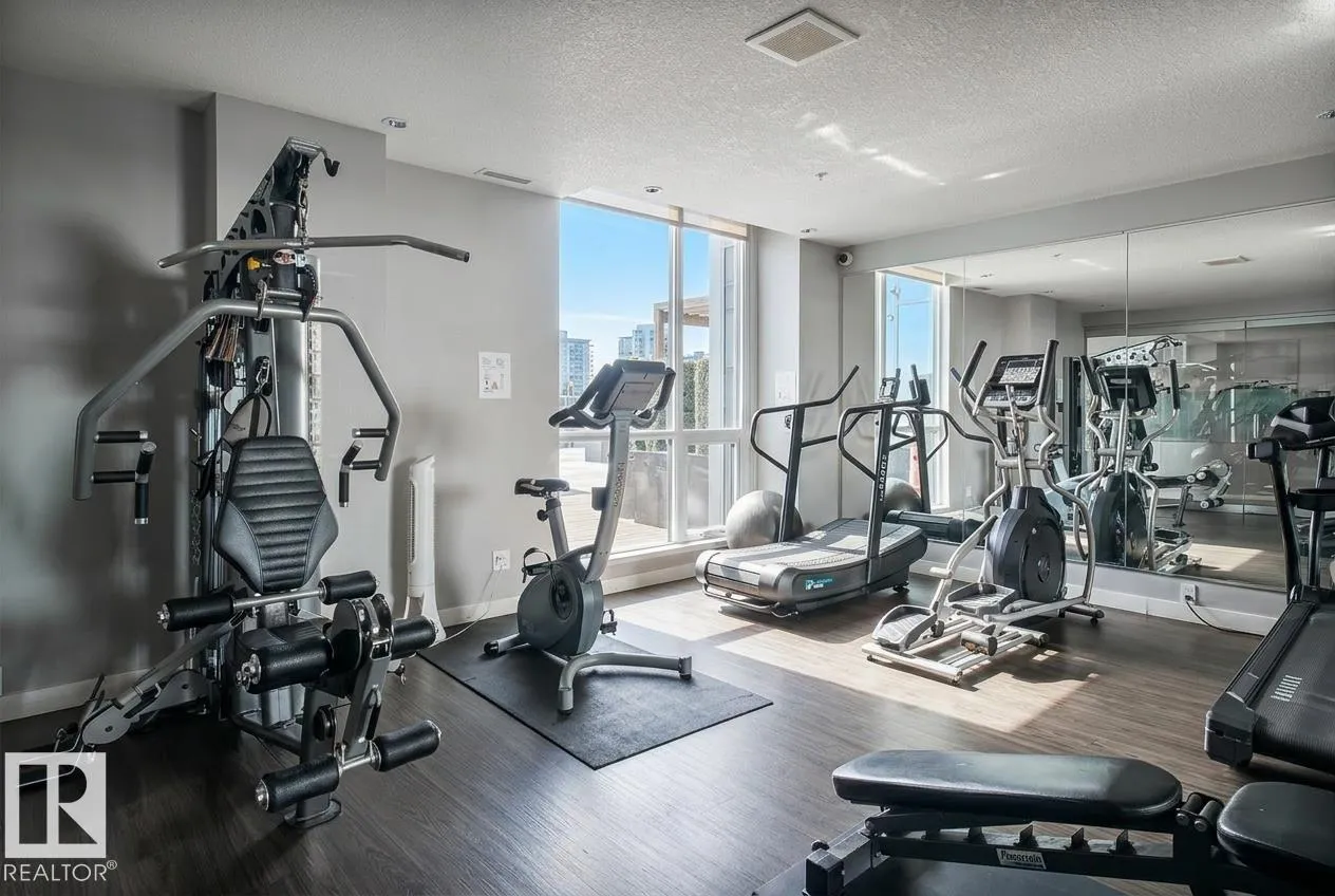 Modern 21st-floor corner unit with panoramic skyline views and floor-to-ceiling windows that bring in incredible natural light. Originally designed as a two-bedroom, the open-concept layout creates a spacious and functional living area perfect for everyday living or entertaining. The kitchen features granite countertops, a large island with seating, and flows seamlessly into the dining and living space. The primary bedroom is complemented by two full bathrooms, offering added comfort and flexibility. Enjoy premium amenities including a fitness centre, social lounge, and outdoor terrace, all steps from downtownâs best restaurants, shopping, Rogers Place, and the Ice District. Includes titled underground parking and central A/C. Exceptional value in a prime downtown location. (id:27476)
