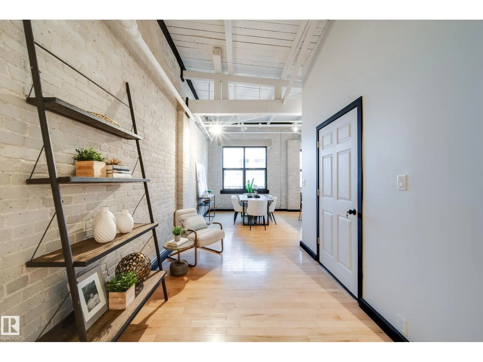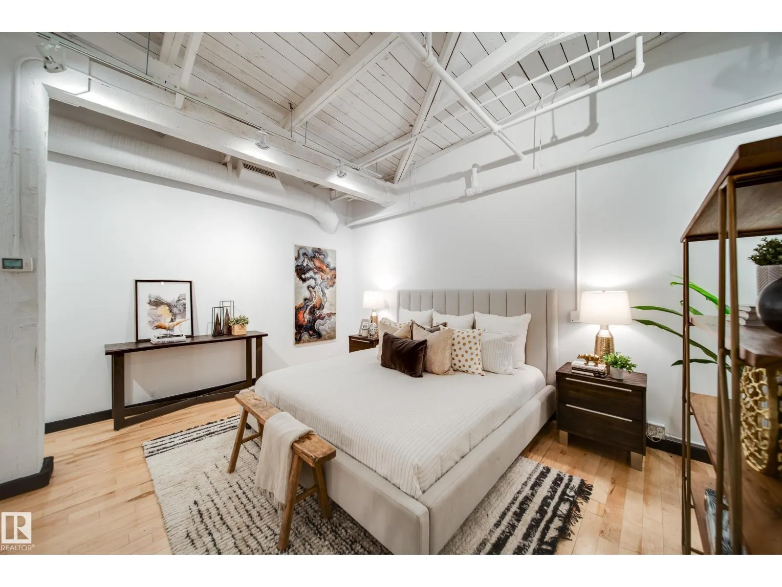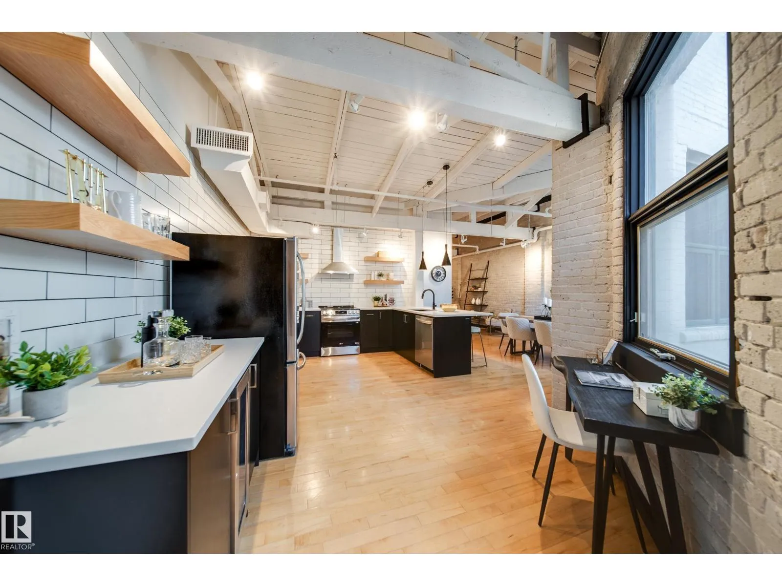 PHILLIPS LOFTS, EDMONTONâS PREMIER LOFT BUILDING, PRESENTS ONE OF THE FINEST UNITS TO HIT THE MARKET! This New York-style loft, steeped in history, is located in the heart of the warehouse districtâideal for those seeking an urban lifestyle with walkability, entertainment, restaurants, and just steps to Rogers Place. Situated on the top floor, this fully renovated unit boasts 13' ceilings and original beams that are over 100 years old. Every inch of this space has been updated with high-quality renovations, including a brand-new bathroom and kitchen featuring custom cabinetry, tile work, appliances, plumbing, and counters. The large bedroom area, dining space, and dedicated home office make it a perfect fit for modern living. Few units offer a balcony, but this one does! With central AC, pet-friendly policies, and access to a rooftop patio, this lock-and-leave property is an entertainer's dream. Donât miss out! (id:27476)