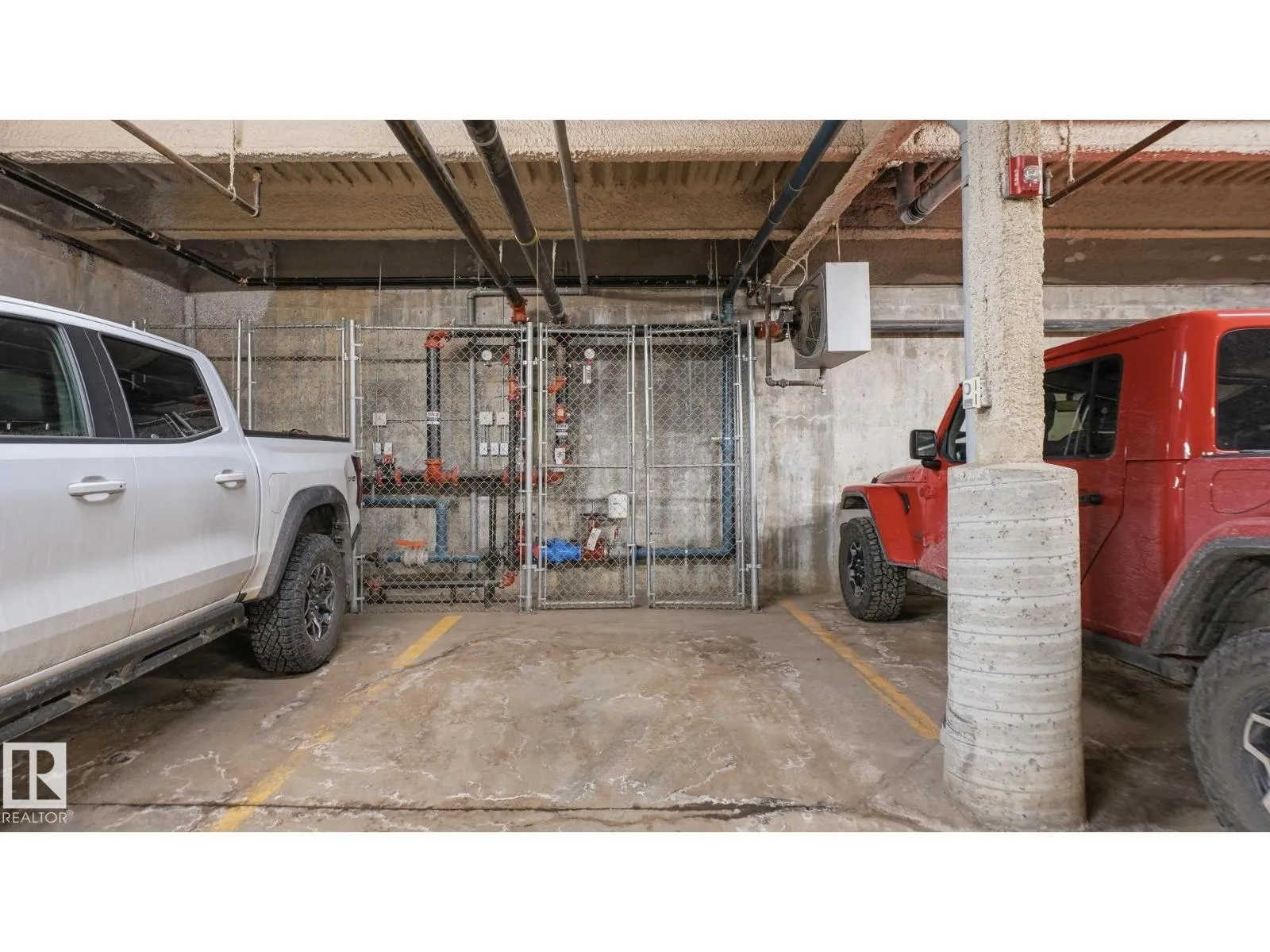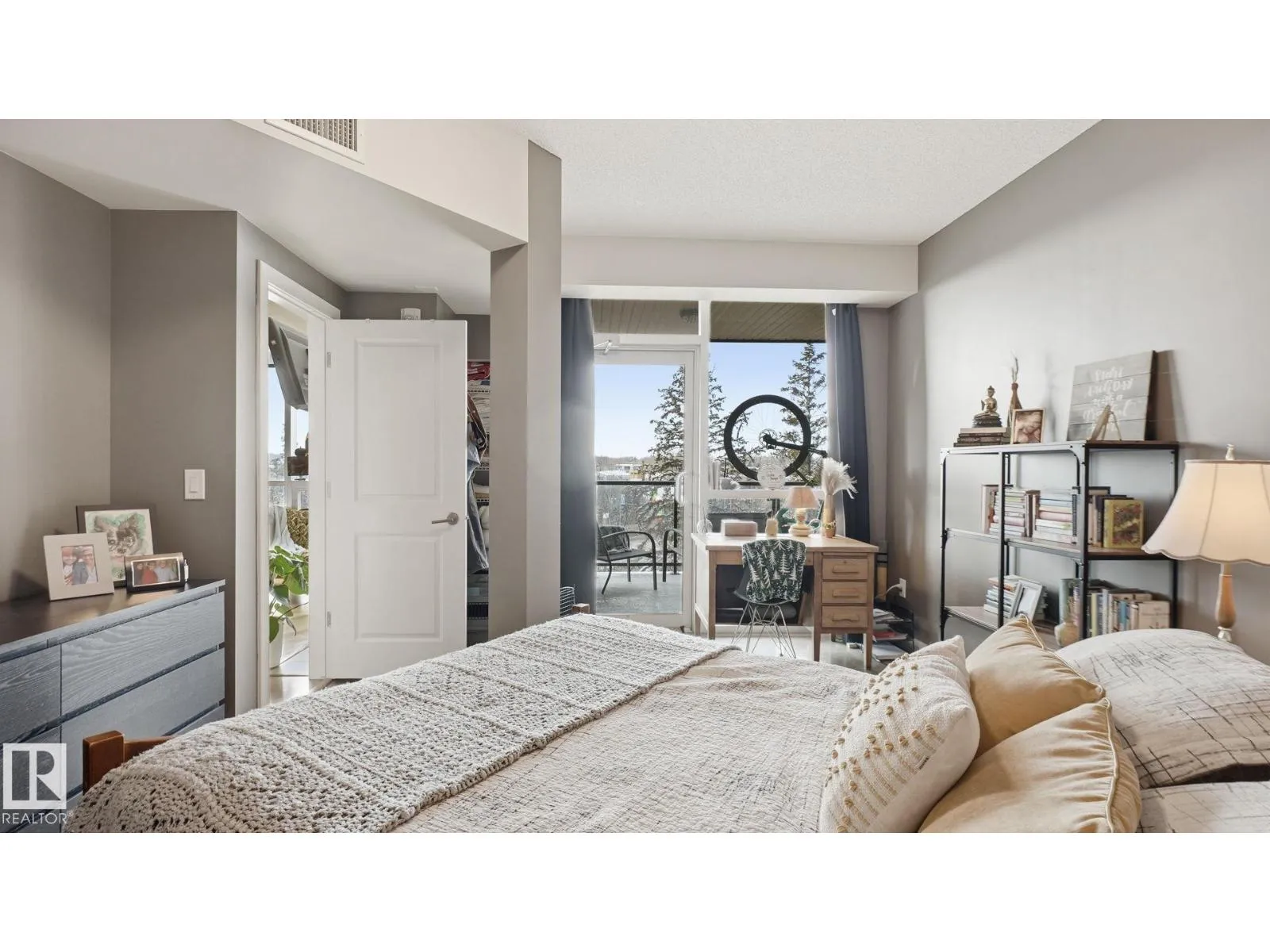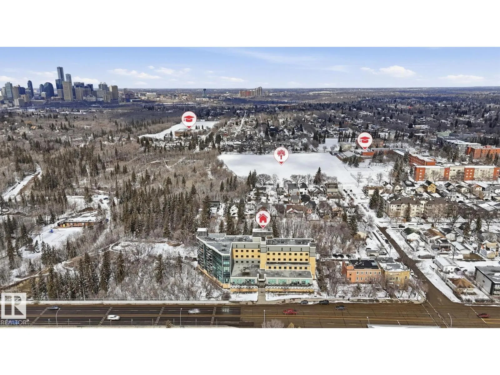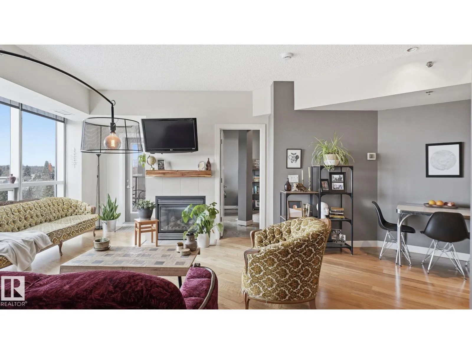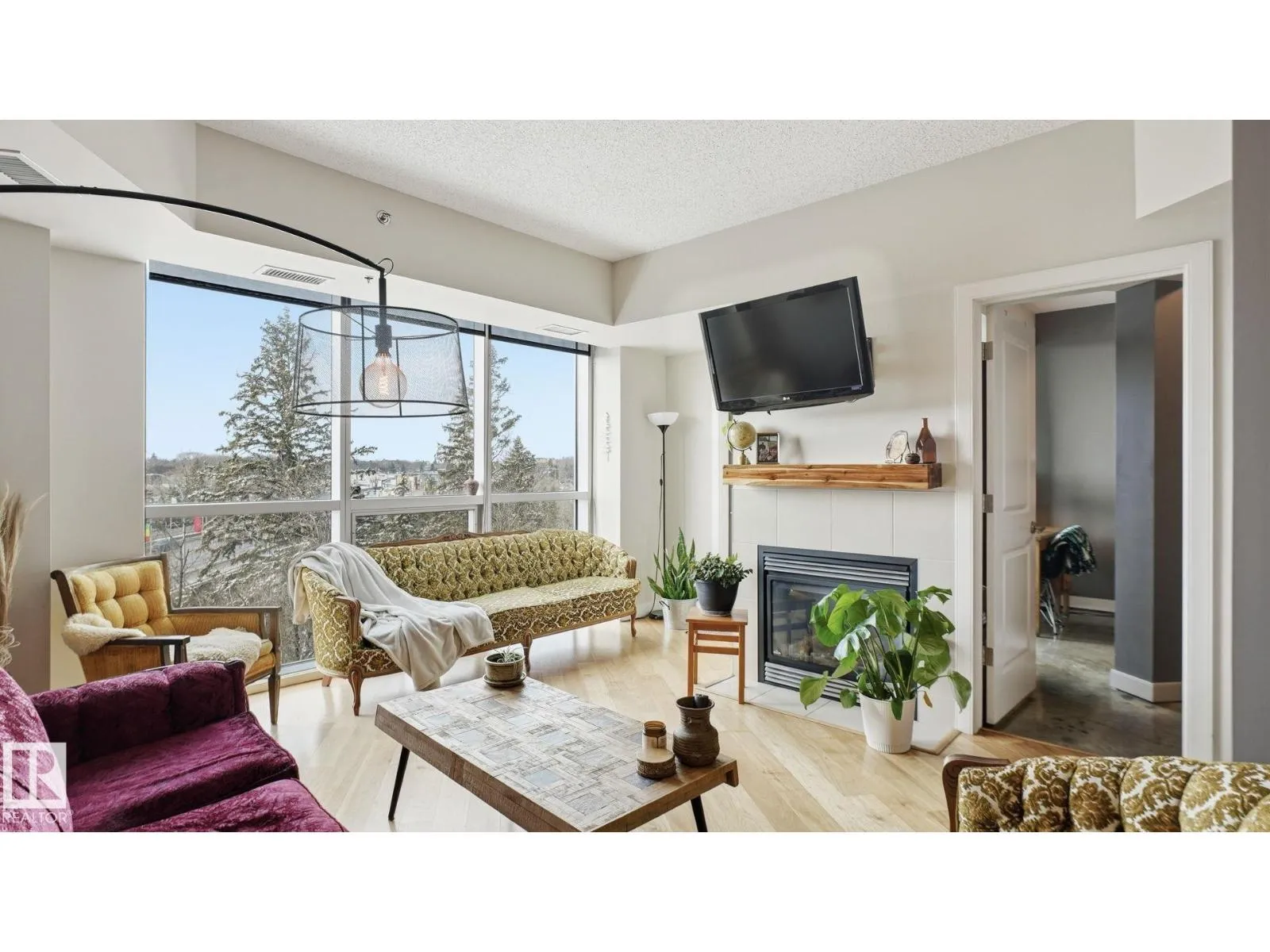 Inviting condo located in Trinity Pointe, a boutique concrete & steel building in Bonnie Doon, steps from Mill Creek Ravine. This bright unit features expansive windows, and a spacious open-concept living area anchored by a cozy gas fireplace. The well-appointed kitchen offers a gas range, built-in oven, dishwasher, and ample cabinetryâperfect for everyday living and entertaining. The spacious corner layout provides excellent natural light and direct access to a private balcony with treed views. The generous primary bedroom includes a walk-in closet and access to a full bath, while in-suite laundry adds everyday ease. Includes 1 underground parking stall and additional storage. Pet friendly building with great amenities featuring a fitness room and secure parkade. Walk to ravine trails, cafés, Whyte Ave, and the Valley Line LRT. Ideal for professionals, students, or investors seeking a low-maintenance lifestyle. (id:27476)