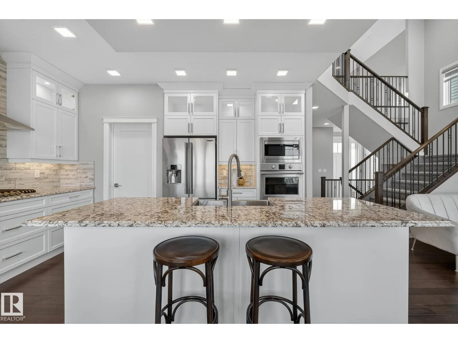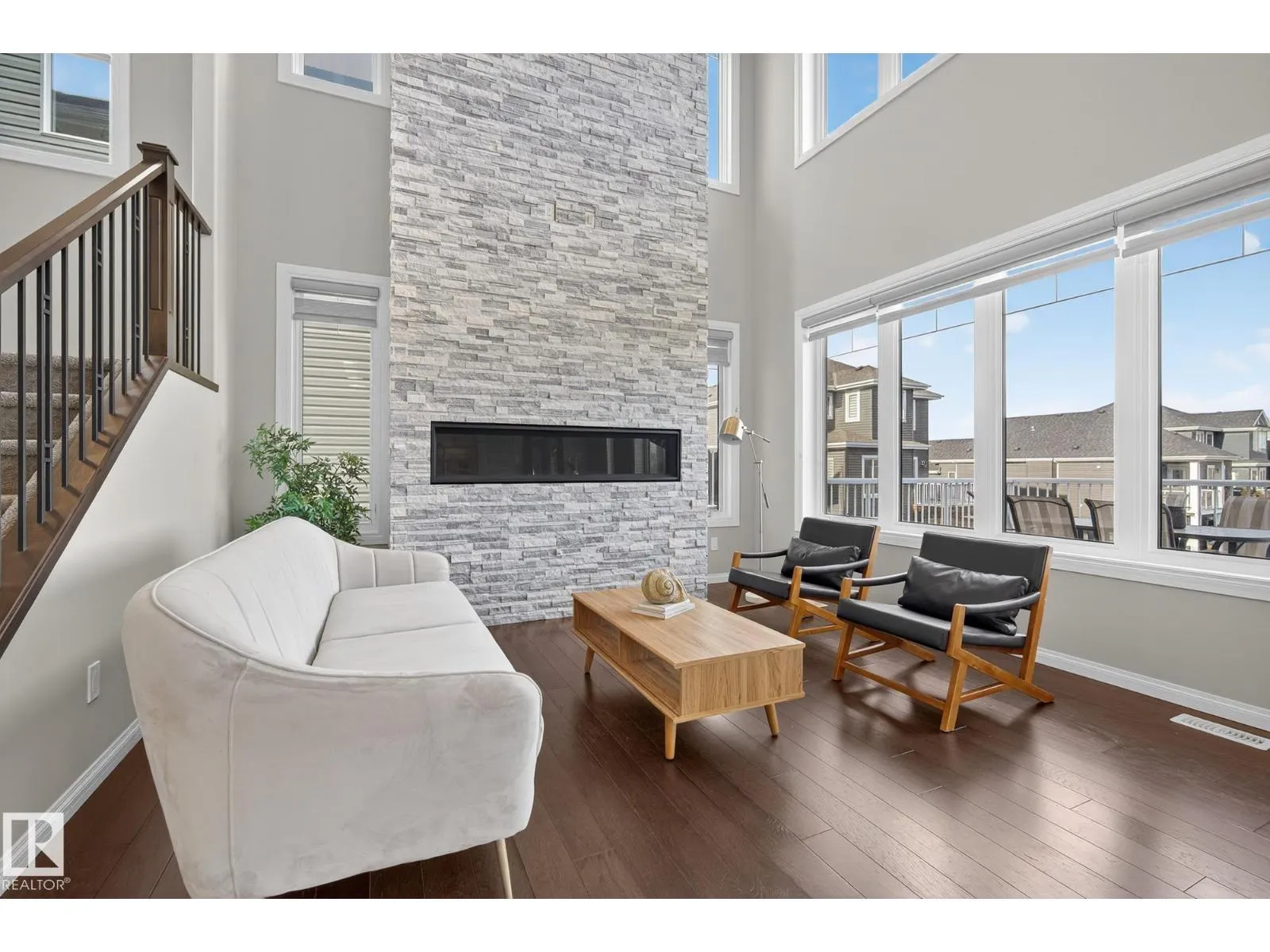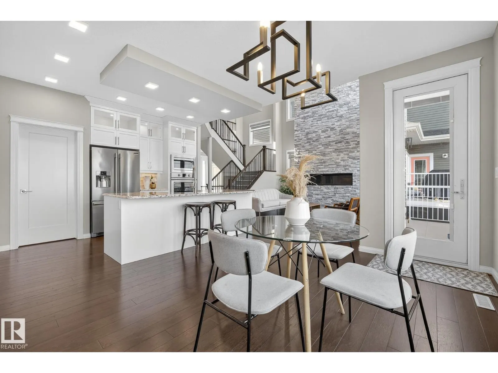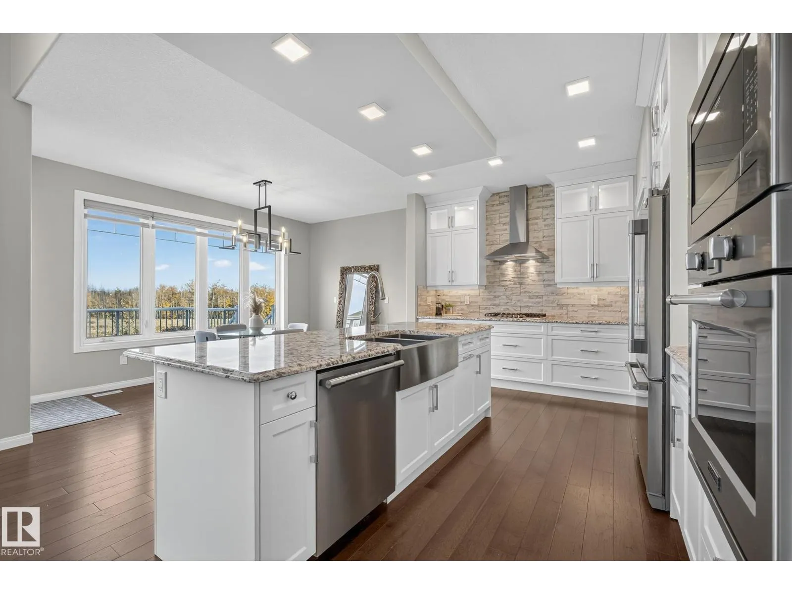 Turnkey and impeccably maintained, this custom-built walkout two-storey offers refined living BACKING DIRECTLY ONTO THE POND in the heart of Starling. Soaring 18-ft ceilings and a dramatic open-to-above great room are framed by a 4-panel window wall, flooding the home with natural light and capturing uninterrupted water views. The kitchen is elegantly appointed with European-style cabinetry, Frigidaire Professional appliances, gas range, and beveled granite countertops. Upstairs features a spacious bonus room, a private primary retreat with walk-in closet connecting to the laundry room, and two additional bedroomsâeach with its own ensuite. The fully finished walkout basement is designed for entertaining with a custom wet bar, rec space with stone fireplace, fourth bedroom, and access to a beautifully finished lower patio overlooking the pond. A rare offering combining design, function, and stunning views. (id:27476)