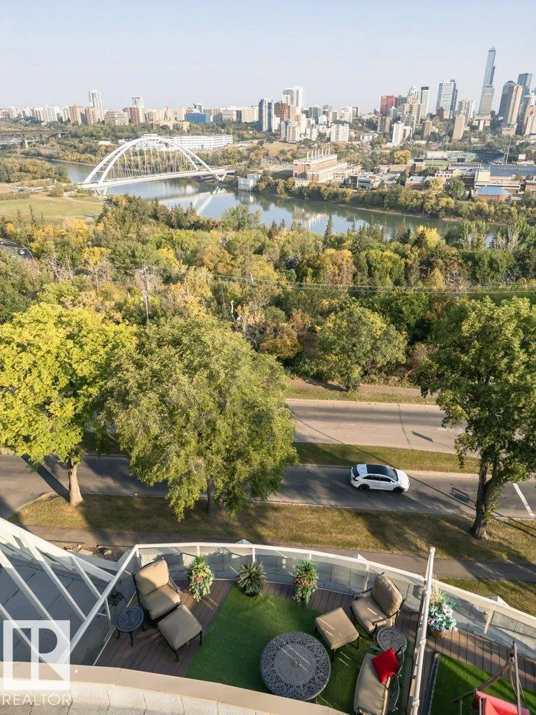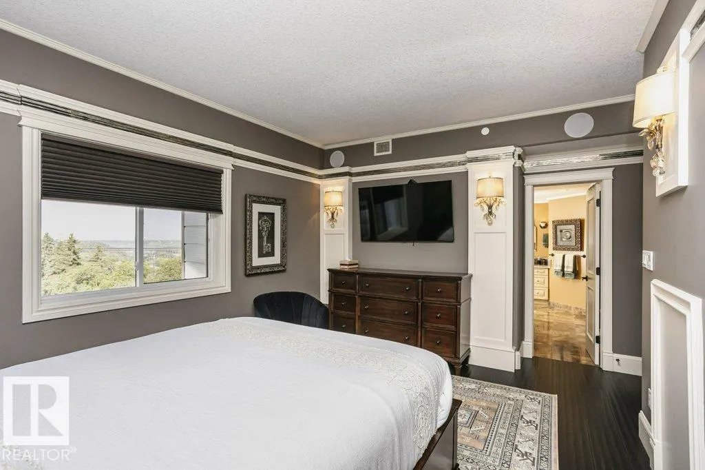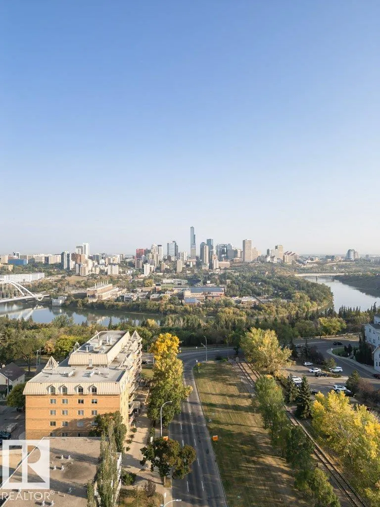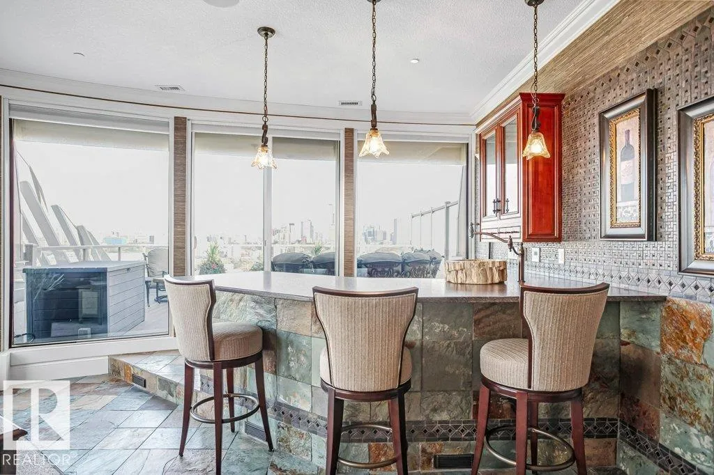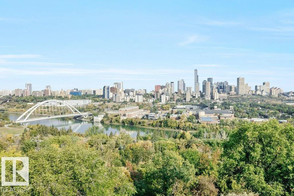 PENTHOUSE UNDER $1M! Breathtaking views from this fully renovated 2-storey residence on prestigious Saskatchewan Dr. Offering 2 bedrooms, 3 full bathrooms & 2 u/g stalls, this pet friendly home delivers exceptional value with river valley & downtown views from every window. Over 2,190 sq ft plus 2 balconies, ideal for entertaining & summer evenings. Chef-inspired kitchen with built-in appliances, massive granite island, custom backsplash & walk-in pantry. Open concept layout with bright living rm, panoramic views & spacious dining area. Features include fireplace, motorized blinds, hand-scraped hardwood, in-floor heating, A/C, modern lighting & built-in sound.Main floolr primary suite with in-suite laundry & spa-like baths finished in marble, glass & mosaic tile. Upper level offers family room with custom bar, built-in office & balcony access overlooking the skyline. Rare opportunity in a premier location. (id:27476)
