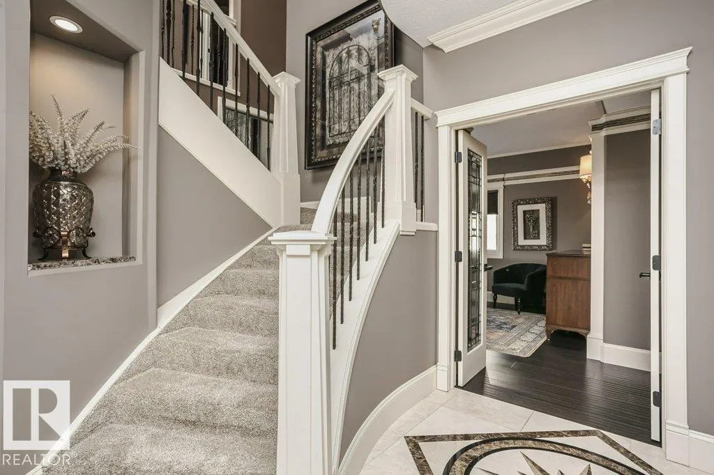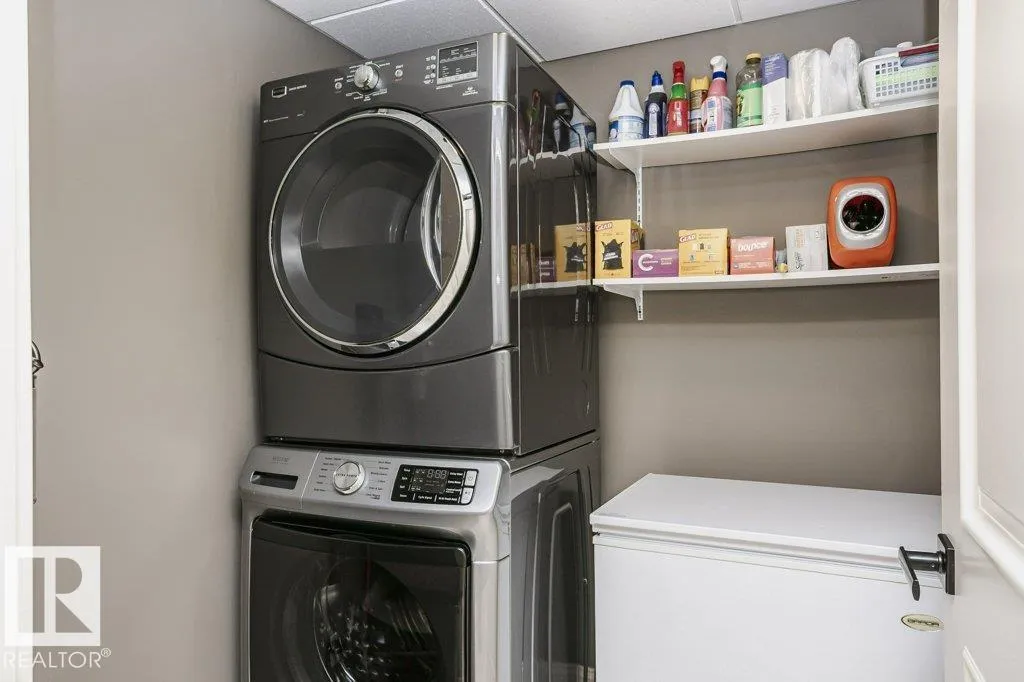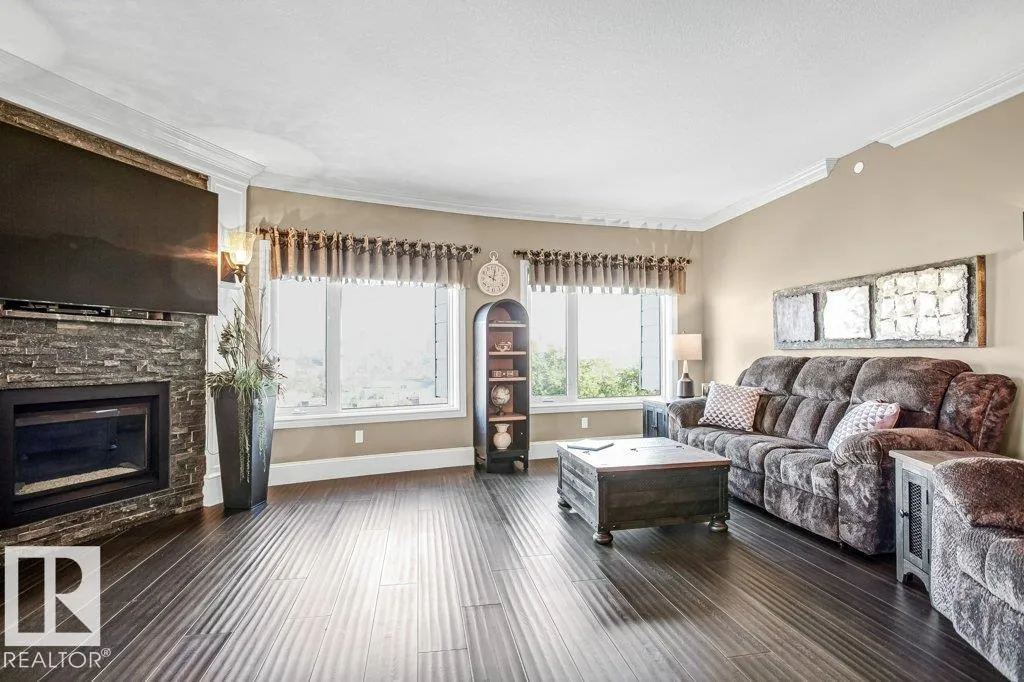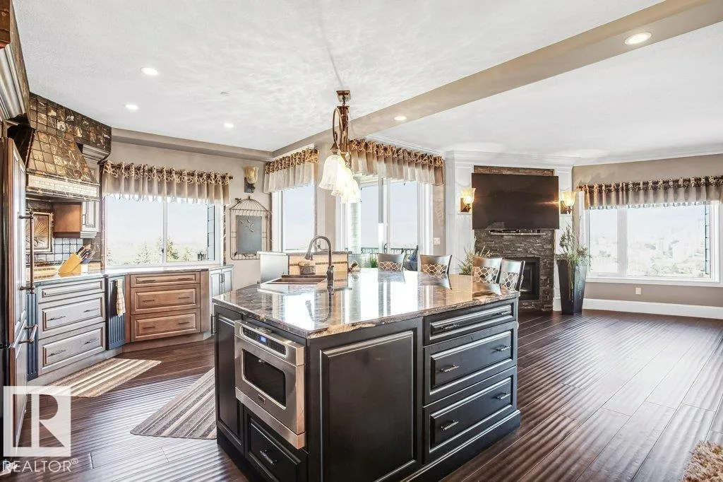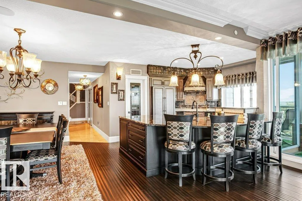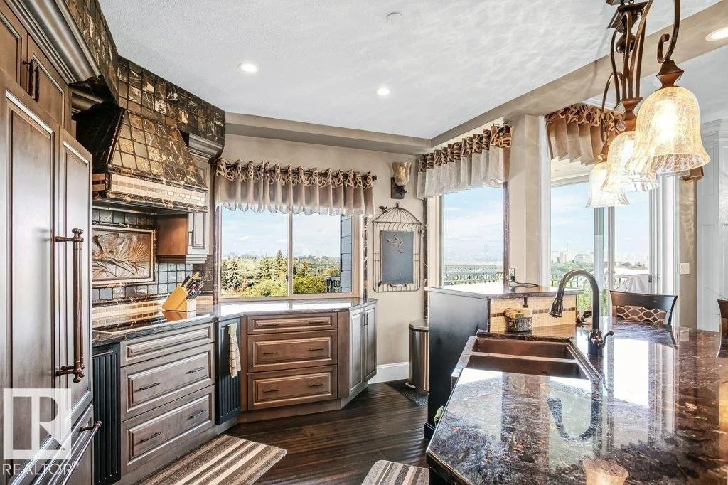 PENTHOUSE UNDER $1M! Breathtaking views from this fully renovated 2-storey residence on prestigious Saskatchewan Dr. Offering 2 bedrooms, 3 full bathrooms & 2 u/g stalls, this pet friendly home delivers exceptional value with river valley & downtown views from every window. Over 2,190 sq ft plus 2 balconies, ideal for entertaining & summer evenings. Chef-inspired kitchen with built-in appliances, massive granite island, custom backsplash & walk-in pantry. Open concept layout with bright living rm, panoramic views & spacious dining area. Features include fireplace, motorized blinds, hand-scraped hardwood, in-floor heating, A/C, modern lighting & built-in sound.Main floolr primary suite with in-suite laundry & spa-like baths finished in marble, glass & mosaic tile. Upper level offers family room with custom bar, built-in office & balcony access overlooking the skyline. Rare opportunity in a premier location. (id:27476)