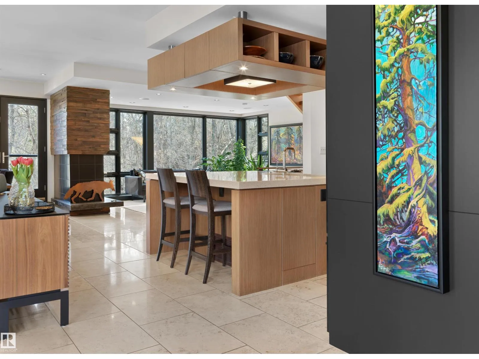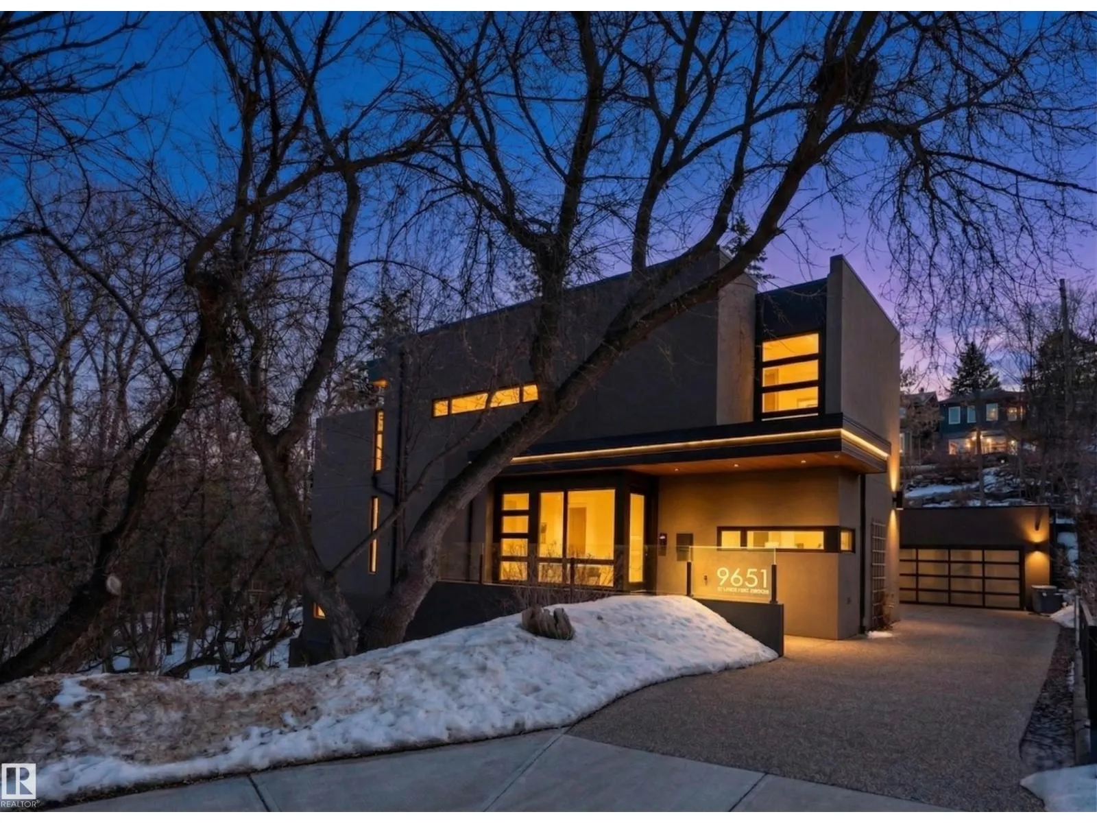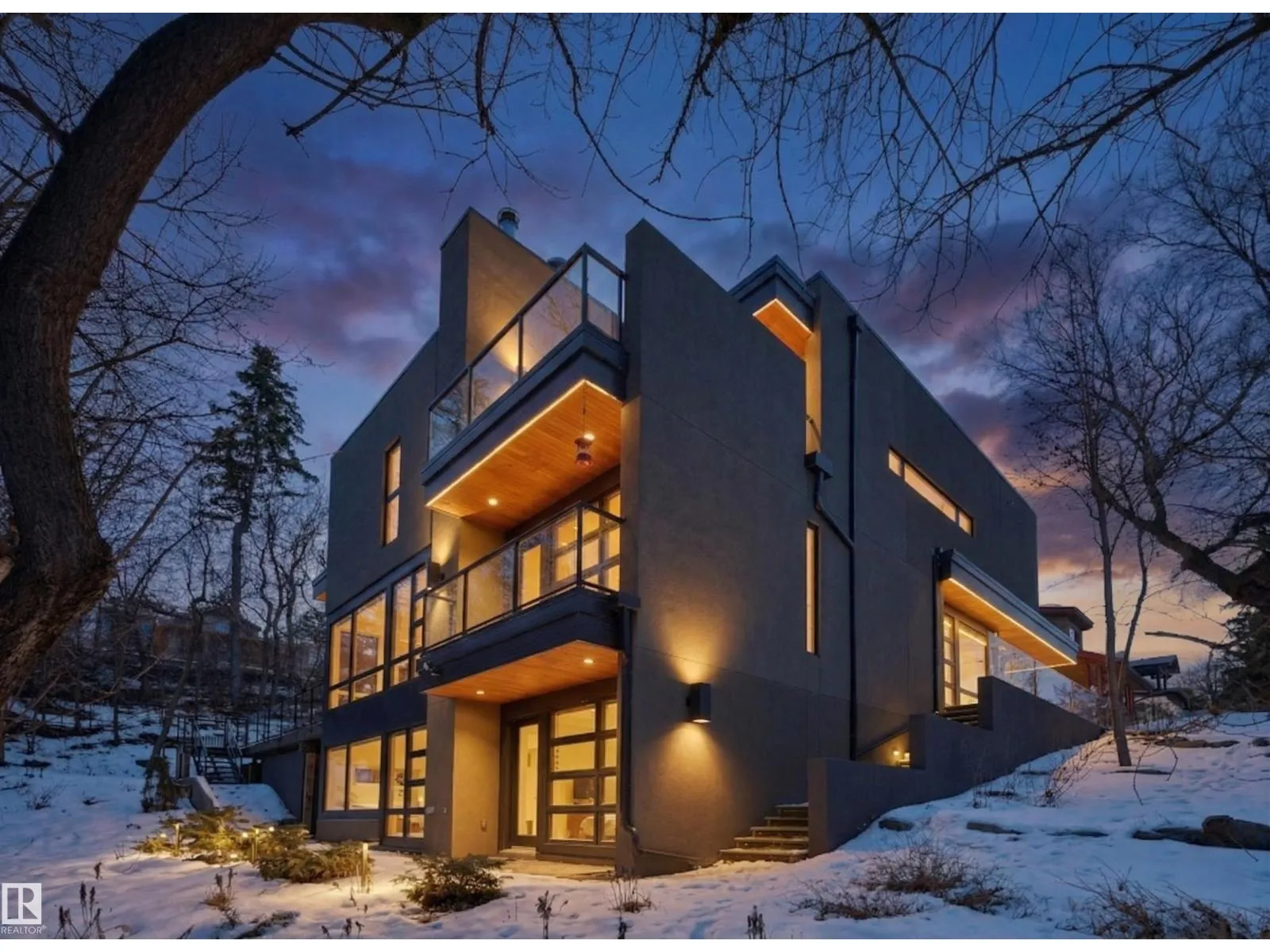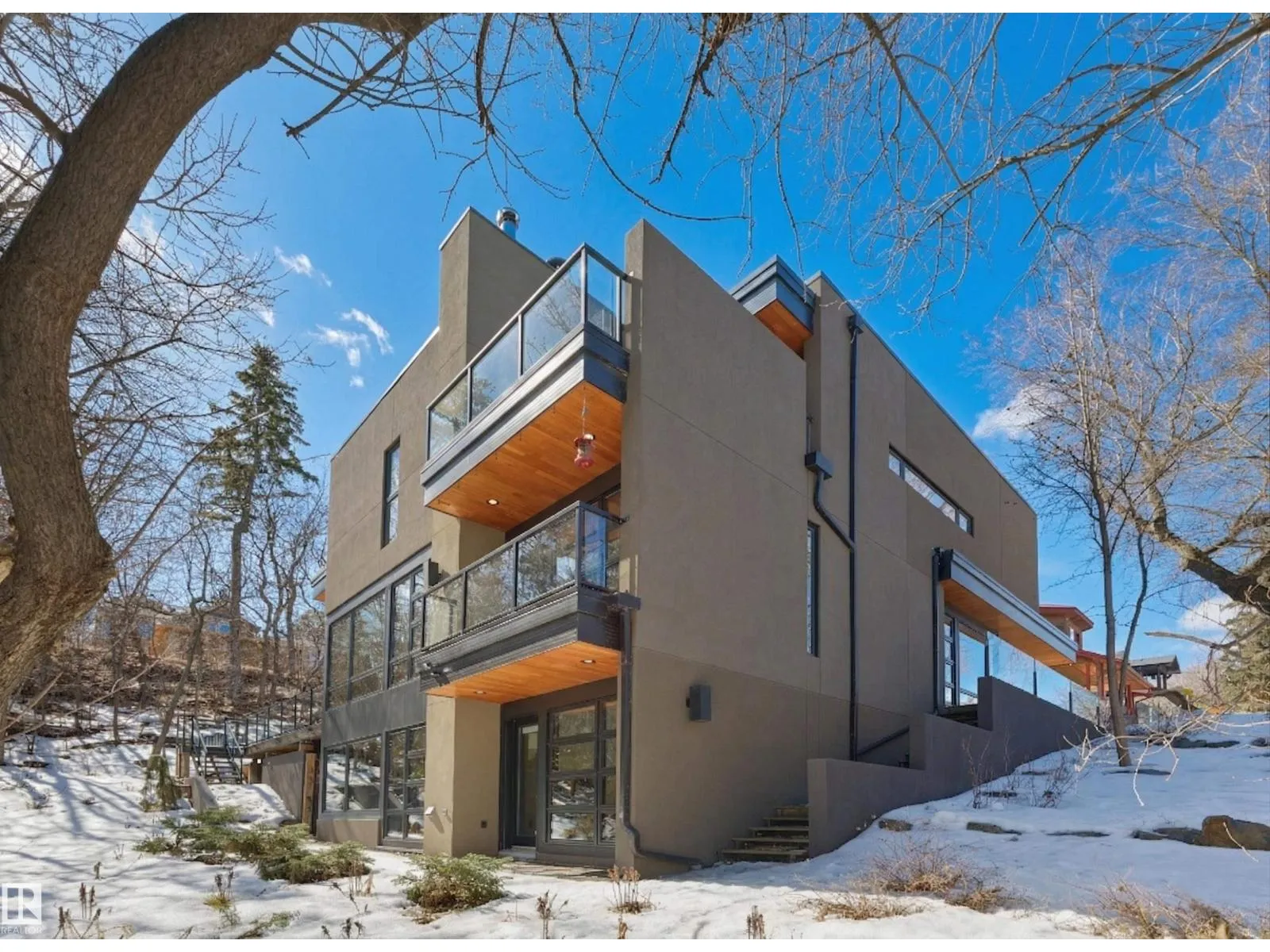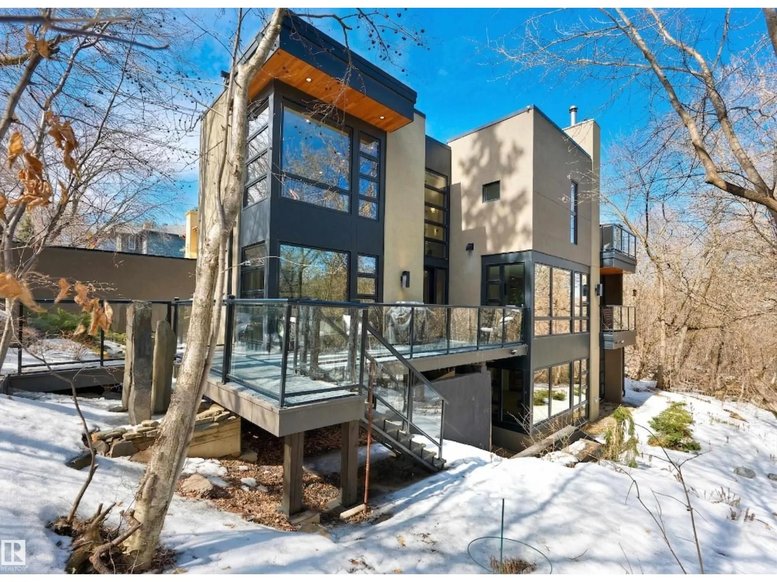 Set discreetly into the hillside on a rare double lot and surrounded by Mill Creek Ravine on 3 sides, this architecturally significant 2 storey walkout custom residence is a masterclass in site-responsive design. Conceived to honour its natural setting, the home is defined by intentional massing, soaring volumes, and walls of glass that dissolve the boundary between indoors and out. Warm modern interiors feature Savana limestone, walnut cabinetry, custom ironwork, solid teak soffits, bespoke millwork, and statement designer lighting. The kitchen is both sculptural and functional, appointed with premium appliances, imported mosaic tile, a large island, and walk-in pantry. Floating stairs, curated materiality, and 3 private decks immersed in the forest canopy create a truly immersive living experience. With 4 bedrooms, 4.5 baths, a serene spa-inspired primary retreat, in-floor heat on all 3 levels, A/C, and a heated detached double garage, this is refined ravine architecture at its finest. (id:27476)