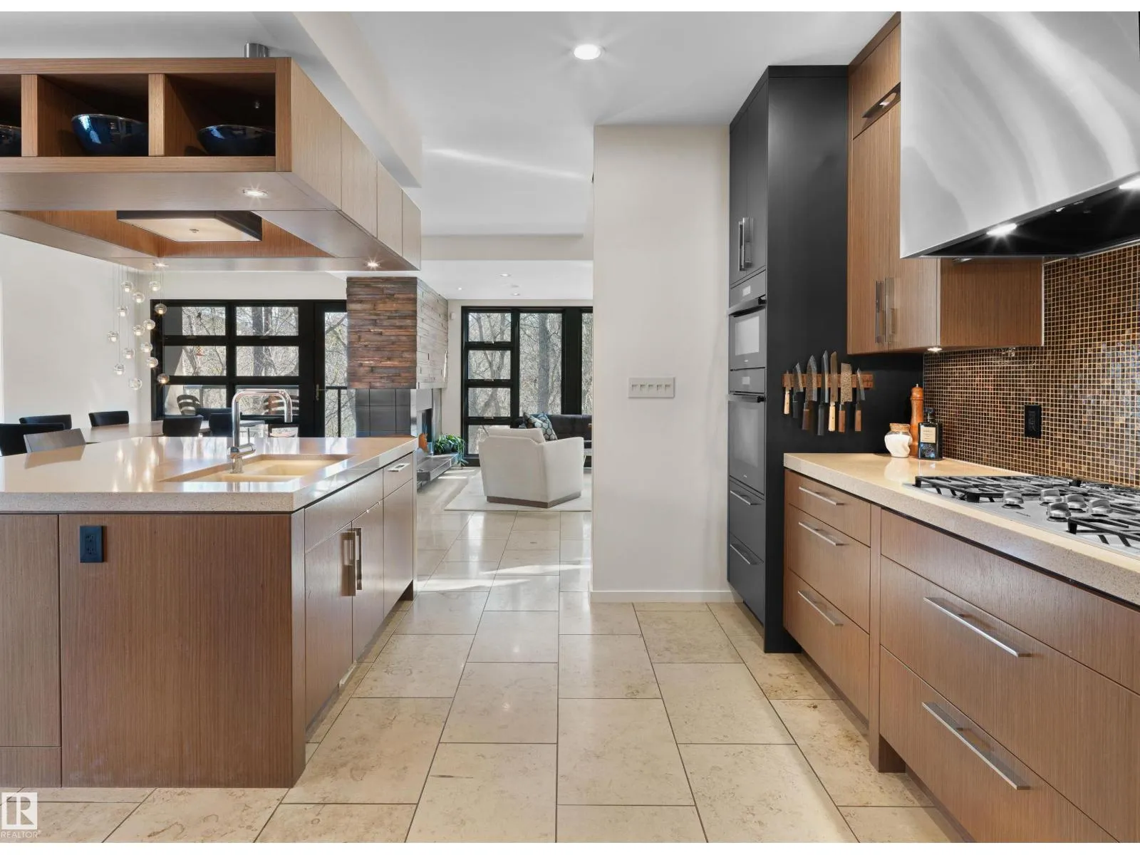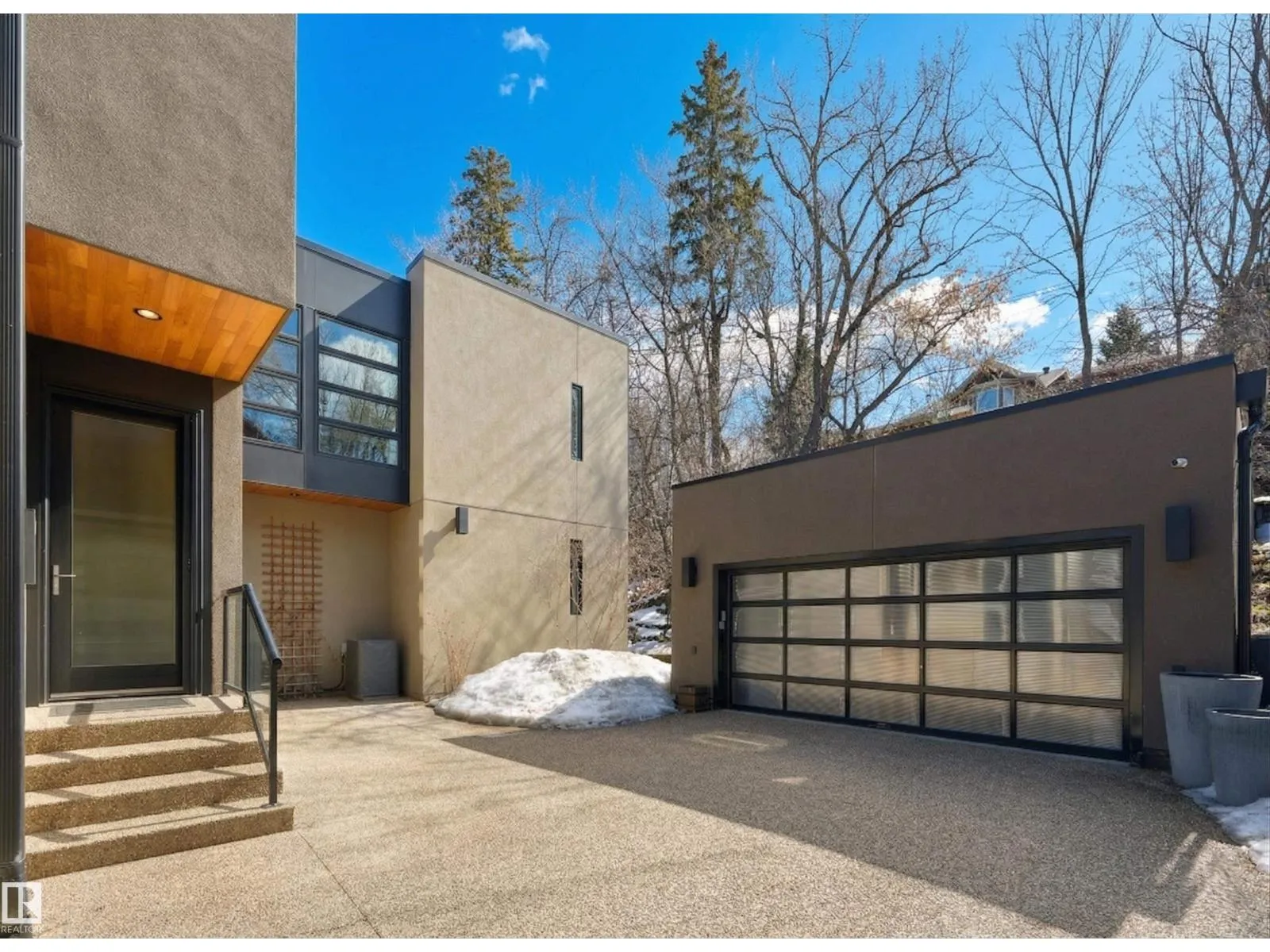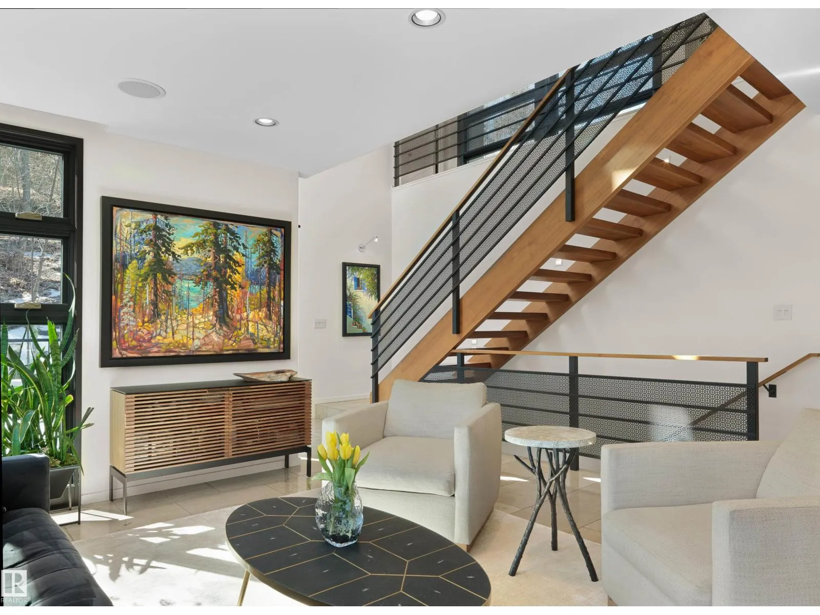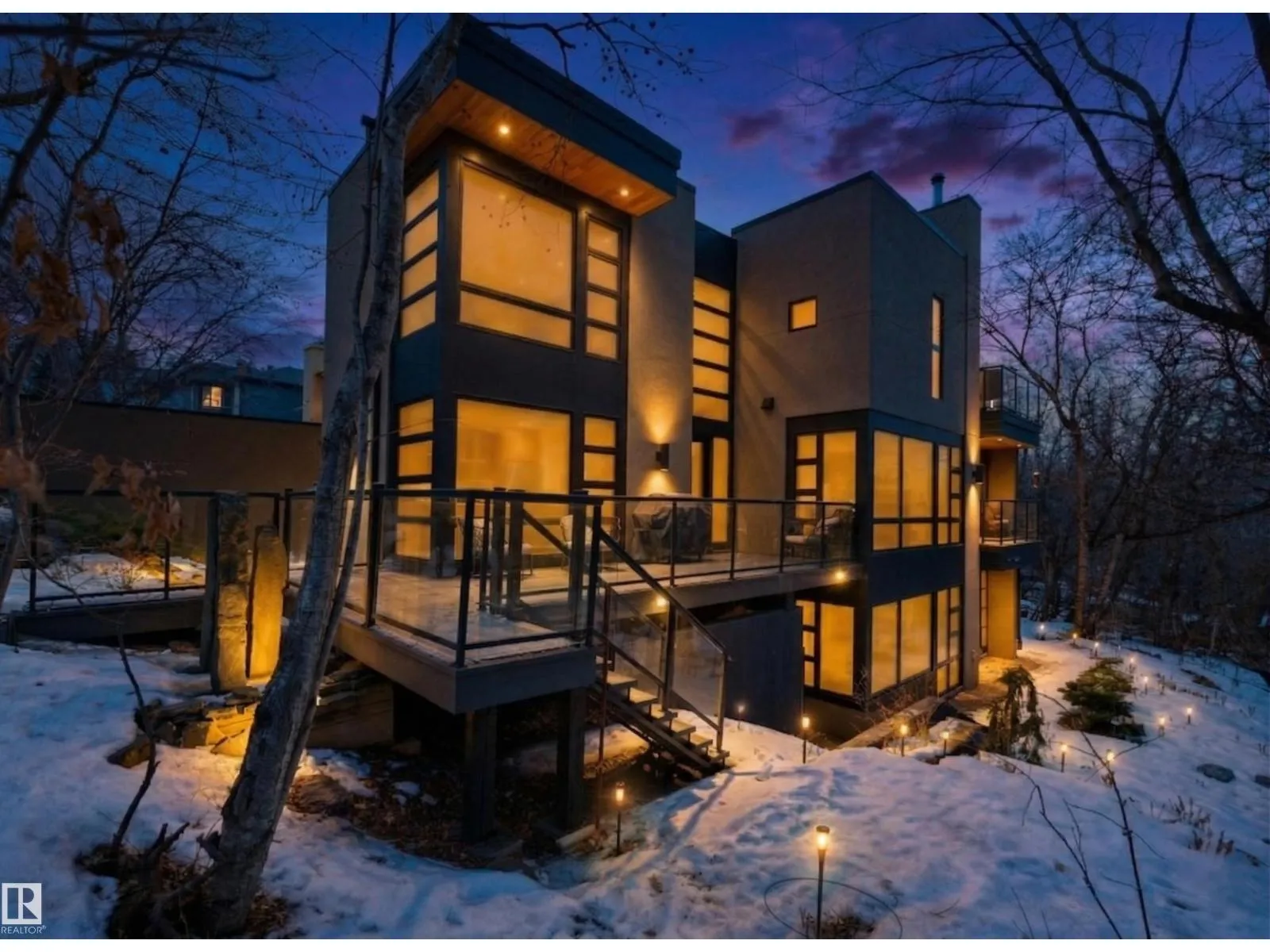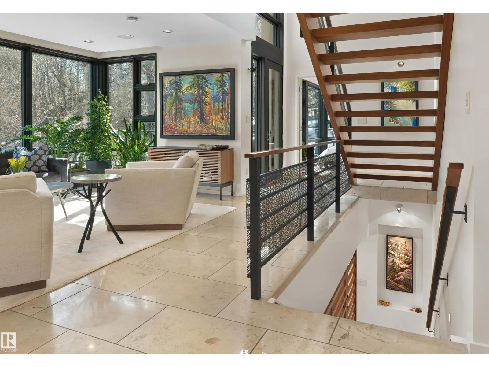 Set discreetly into the hillside on a rare double lot and surrounded by Mill Creek Ravine on 3 sides, this architecturally significant 2 storey walkout custom residence is a masterclass in site-responsive design. Conceived to honour its natural setting, the home is defined by intentional massing, soaring volumes, and walls of glass that dissolve the boundary between indoors and out. Warm modern interiors feature Savana limestone, walnut cabinetry, custom ironwork, solid teak soffits, bespoke millwork, and statement designer lighting. The kitchen is both sculptural and functional, appointed with premium appliances, imported mosaic tile, a large island, and walk-in pantry. Floating stairs, curated materiality, and 3 private decks immersed in the forest canopy create a truly immersive living experience. With 4 bedrooms, 4.5 baths, a serene spa-inspired primary retreat, in-floor heat on all 3 levels, A/C, and a heated detached double garage, this is refined ravine architecture at its finest. (id:27476)