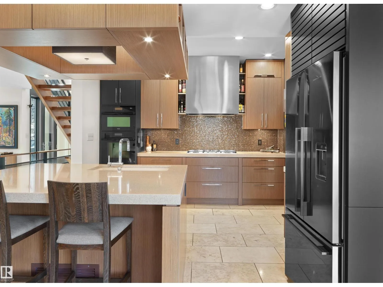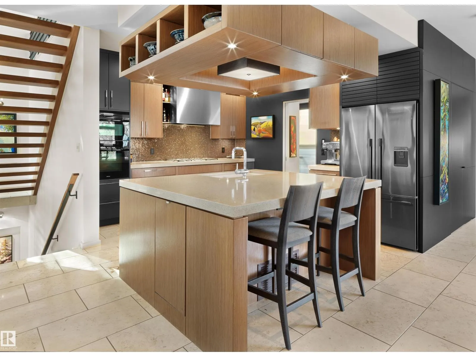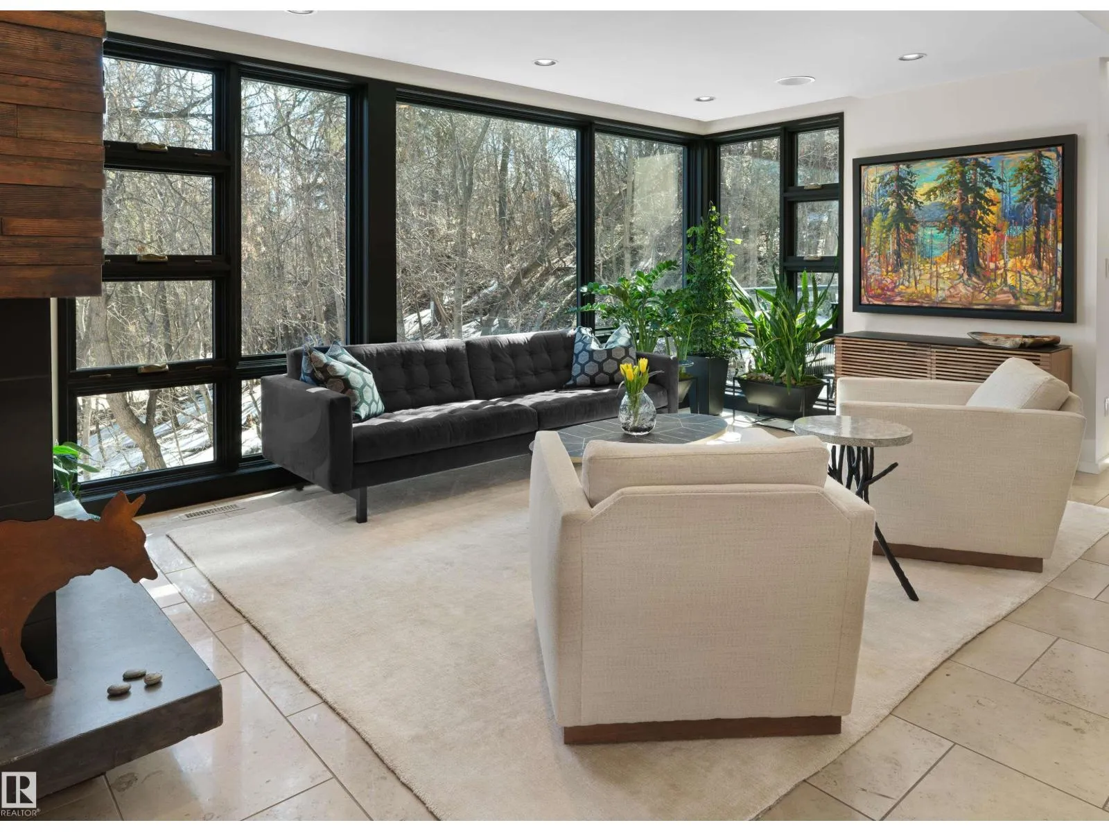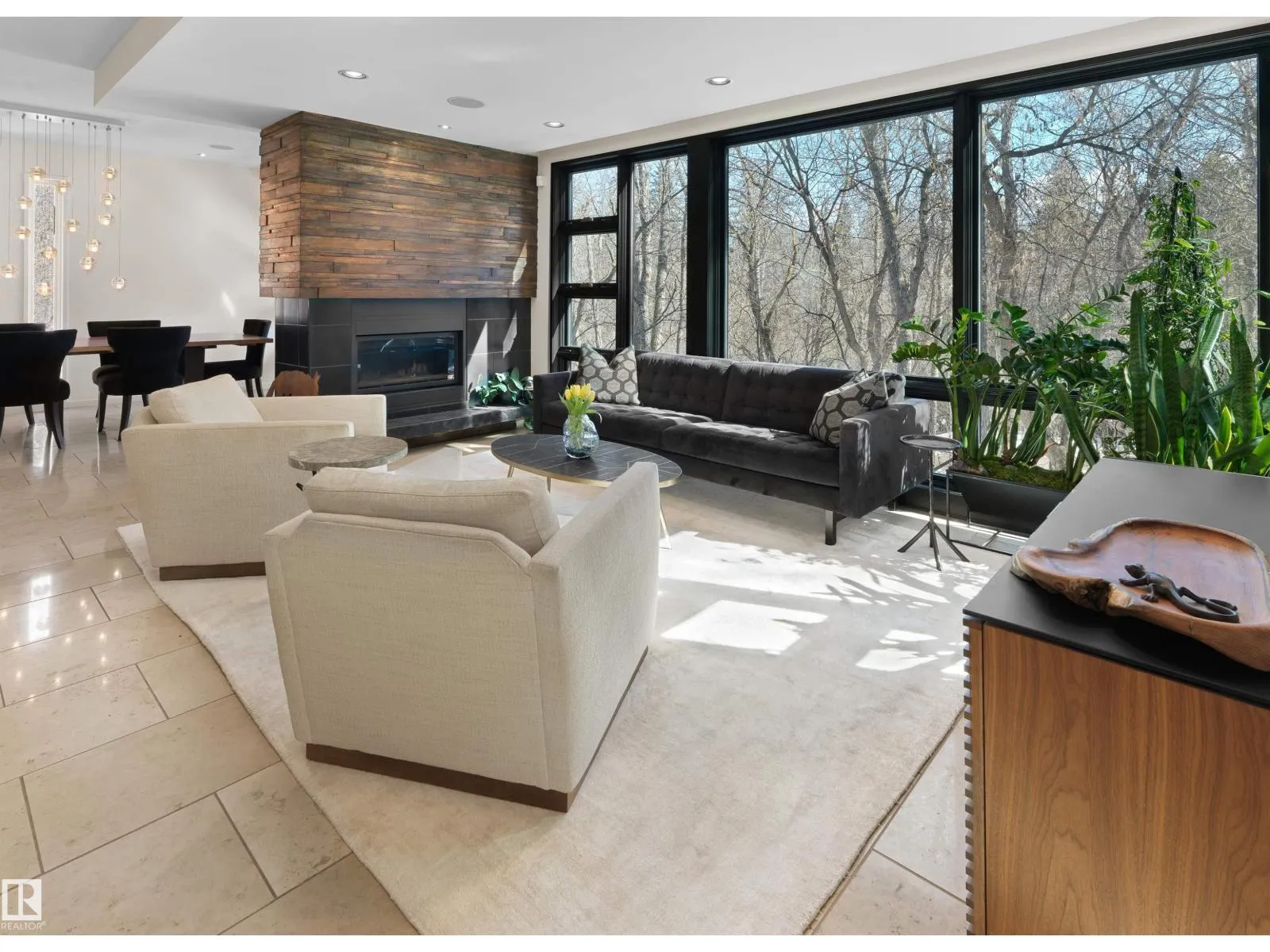 Set discreetly into the hillside on a rare double lot and surrounded by Mill Creek Ravine on 3 sides, this architecturally significant 2 storey walkout custom residence is a masterclass in site-responsive design. Conceived to honour its natural setting, the home is defined by intentional massing, soaring volumes, and walls of glass that dissolve the boundary between indoors and out. Warm modern interiors feature Savana limestone, walnut cabinetry, custom ironwork, solid teak soffits, bespoke millwork, and statement designer lighting. The kitchen is both sculptural and functional, appointed with premium appliances, imported mosaic tile, a large island, and walk-in pantry. Floating stairs, curated materiality, and 3 private decks immersed in the forest canopy create a truly immersive living experience. With 4 bedrooms, 4.5 baths, a serene spa-inspired primary retreat, in-floor heat on all 3 levels, A/C, and a heated detached double garage, this is refined ravine architecture at its finest. (id:27476)