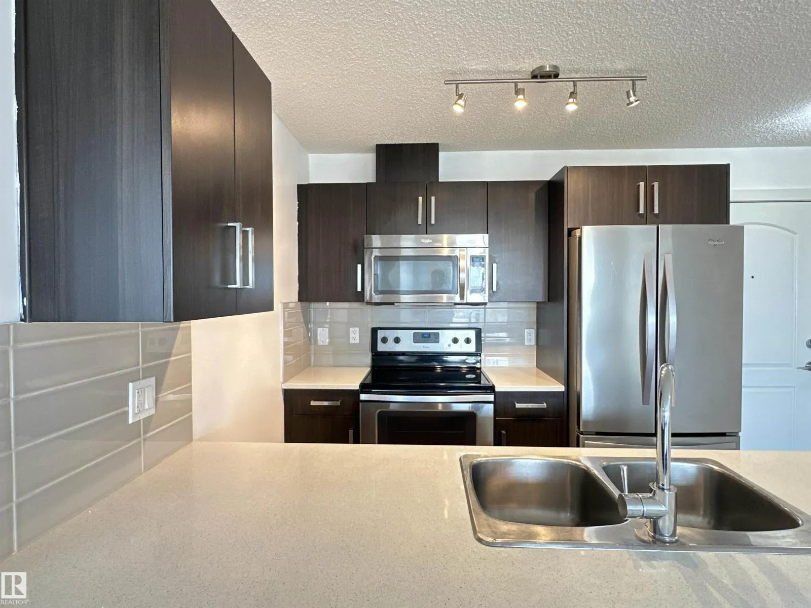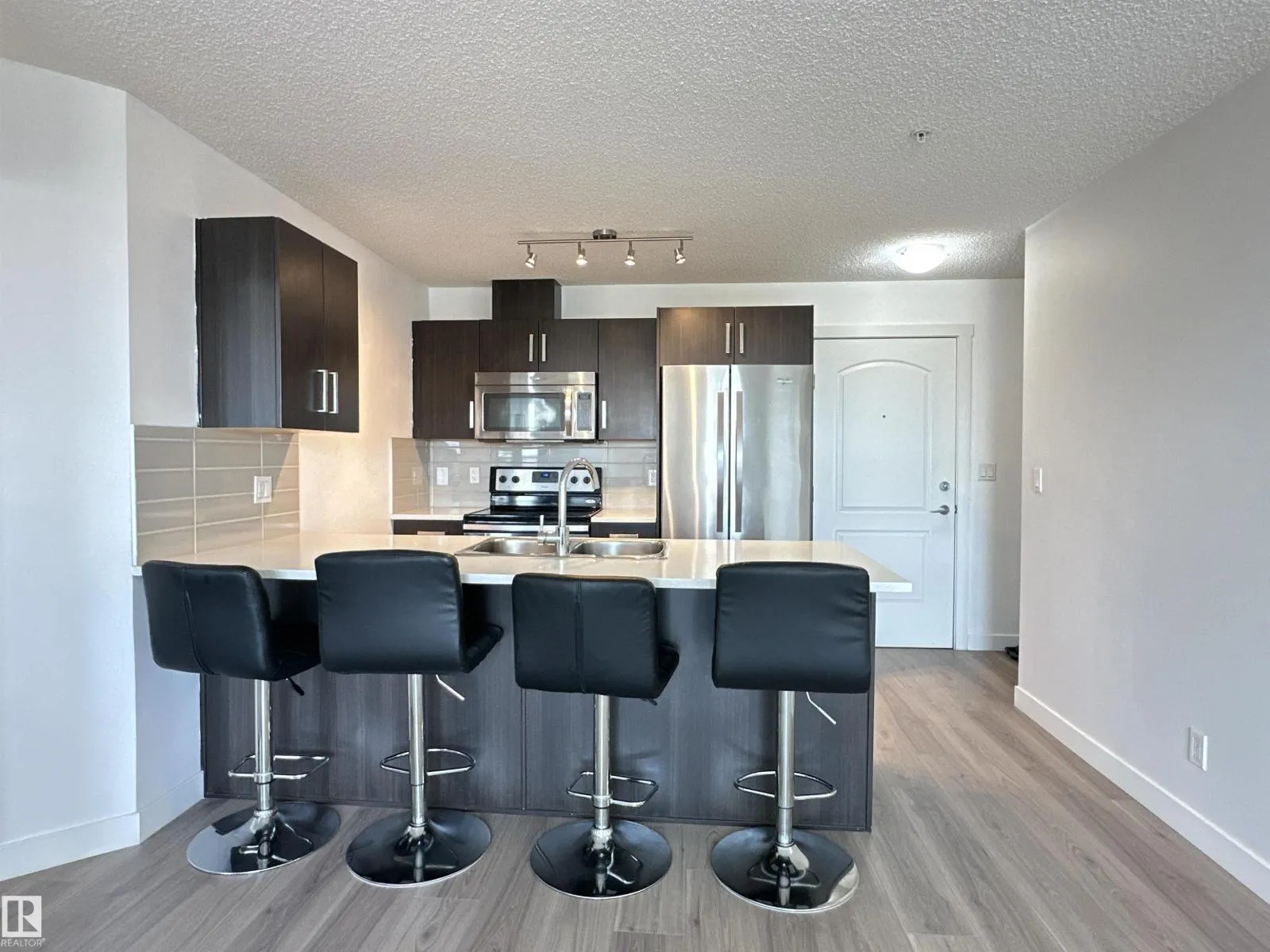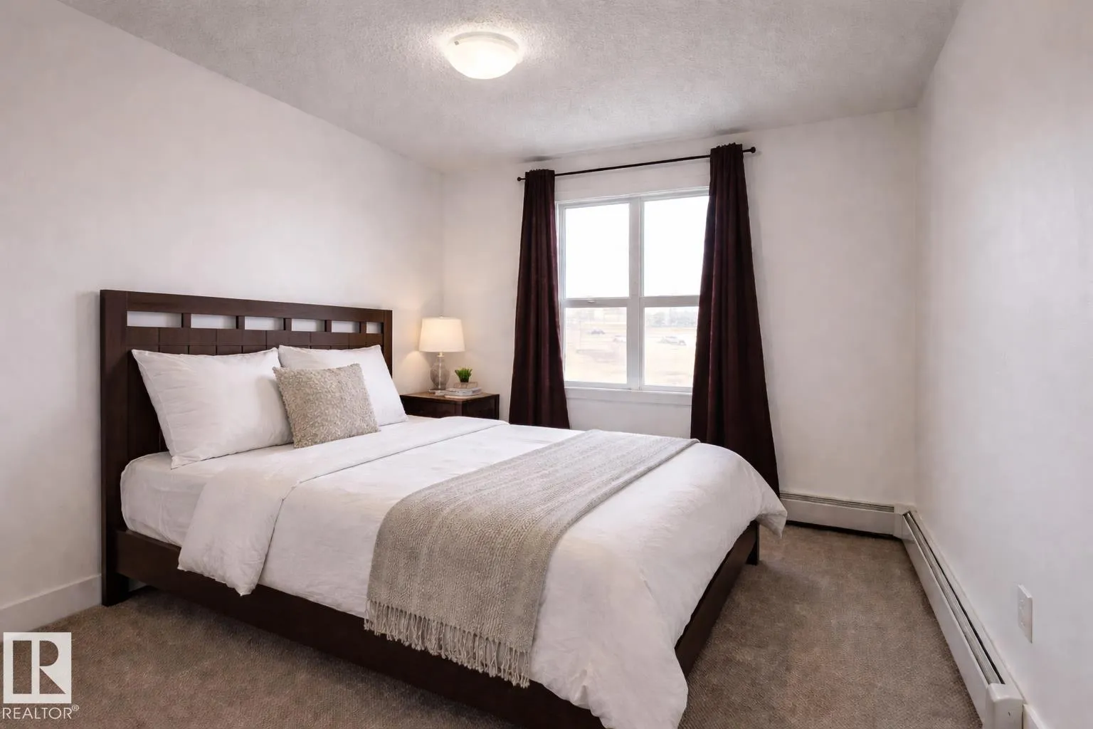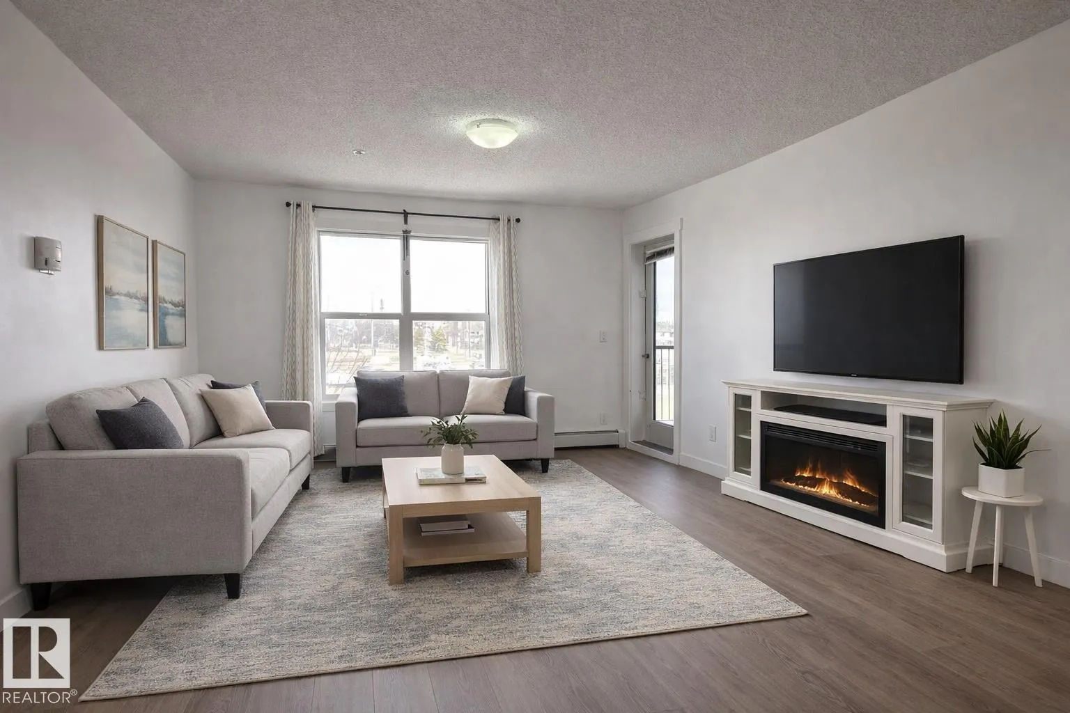 Welcome home to this bright & spacious 2 bed, 2 bath apartment in a highly coveted South Edmonton location. Well-designed unit, modern kitchen with SS appliances, quartz countertop & a generous bar seating. Open-concept living area is filled w/ natural light, direct access to your private covered balcony. The primary bedroom offers a peaceful retreat w/ a walk-through closet & a 4-pc ensuite. The second bedroom is positioned on the opposite side for maximum privacy, conveniently located next to 4-pc bath & in-suite laundry. A versatile den provides flexible space for a home office, guest room or additional living area. Enjoy the secured building access, elevator service, plus titled underground parking & a dedicated storage unit. Quick access to Highway 2, Anthony Henday Dr, 10 mins to South Common, 20 mins to YEG Airport & Premium Outlet. Steps to bus stops, Walmart, Sobeys, Real Canadian, restaurants, shopping, and all major amenities. Please note some pictures are virtually staged including fireplace. (id:27476)