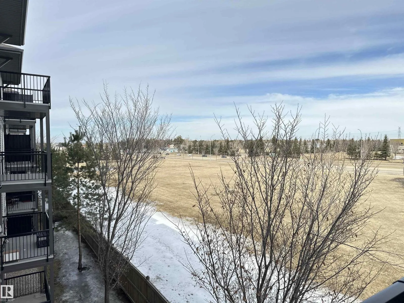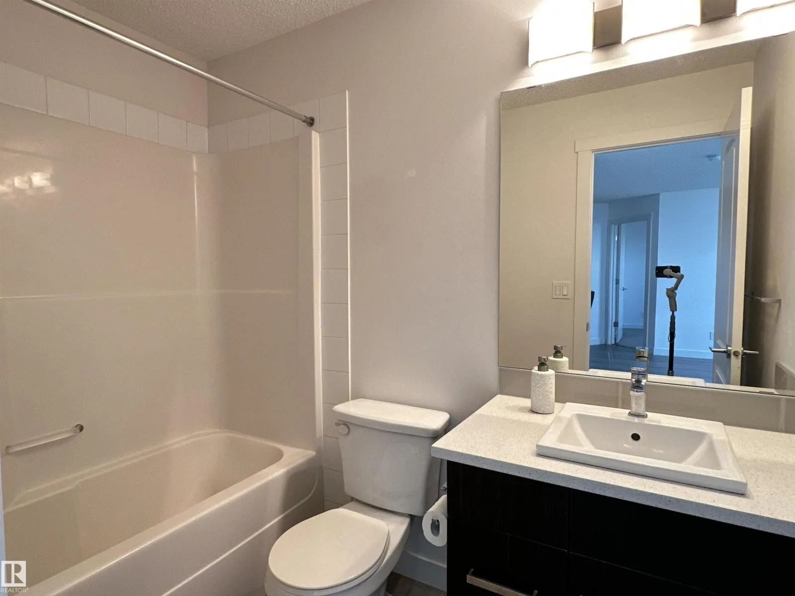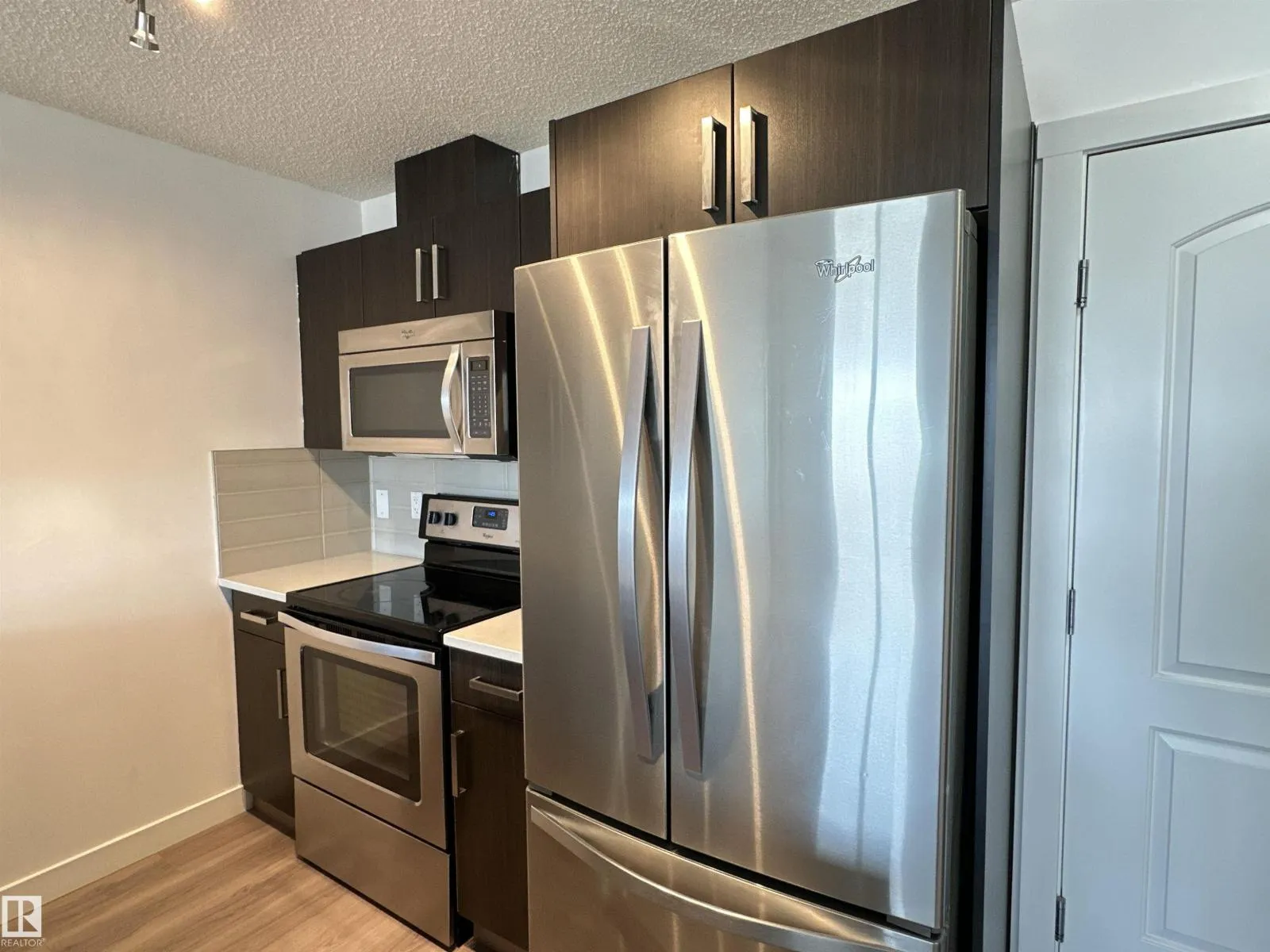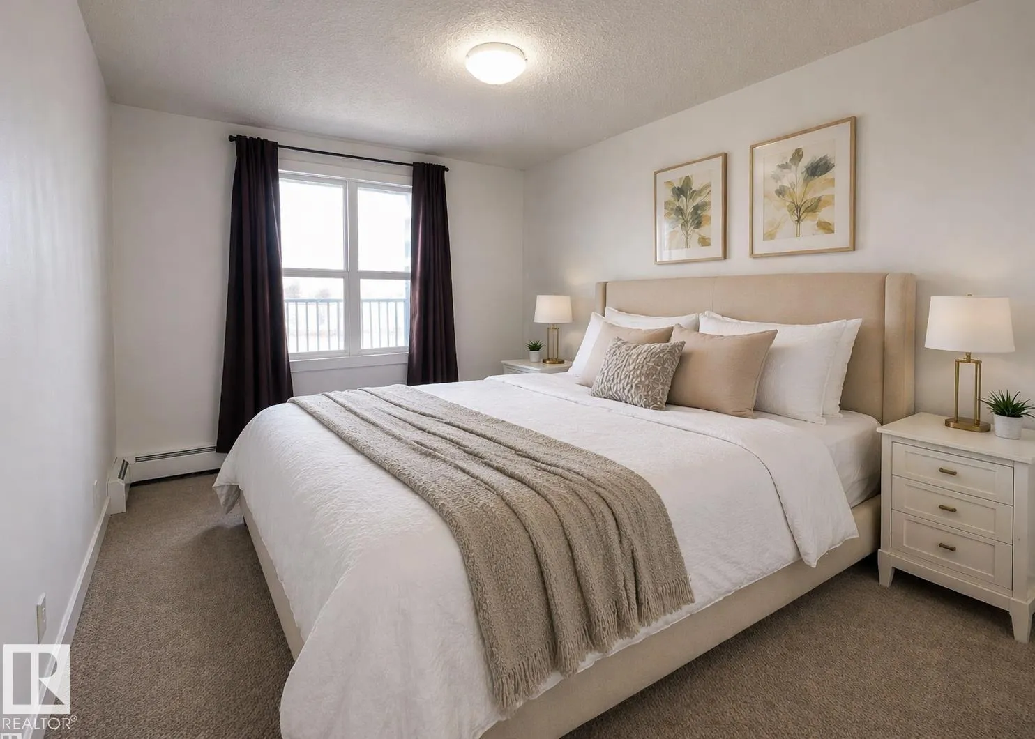 Welcome home to this bright & spacious 2 bed, 2 bath apartment in a highly coveted South Edmonton location. Well-designed unit, modern kitchen with SS appliances, quartz countertop & a generous bar seating. Open-concept living area is filled w/ natural light, direct access to your private covered balcony. The primary bedroom offers a peaceful retreat w/ a walk-through closet & a 4-pc ensuite. The second bedroom is positioned on the opposite side for maximum privacy, conveniently located next to 4-pc bath & in-suite laundry. A versatile den provides flexible space for a home office, guest room or additional living area. Enjoy the secured building access, elevator service, plus titled underground parking & a dedicated storage unit. Quick access to Highway 2, Anthony Henday Dr, 10 mins to South Common, 20 mins to YEG Airport & Premium Outlet. Steps to bus stops, Walmart, Sobeys, Real Canadian, restaurants, shopping, and all major amenities. Please note some pictures are virtually staged including fireplace. (id:27476)