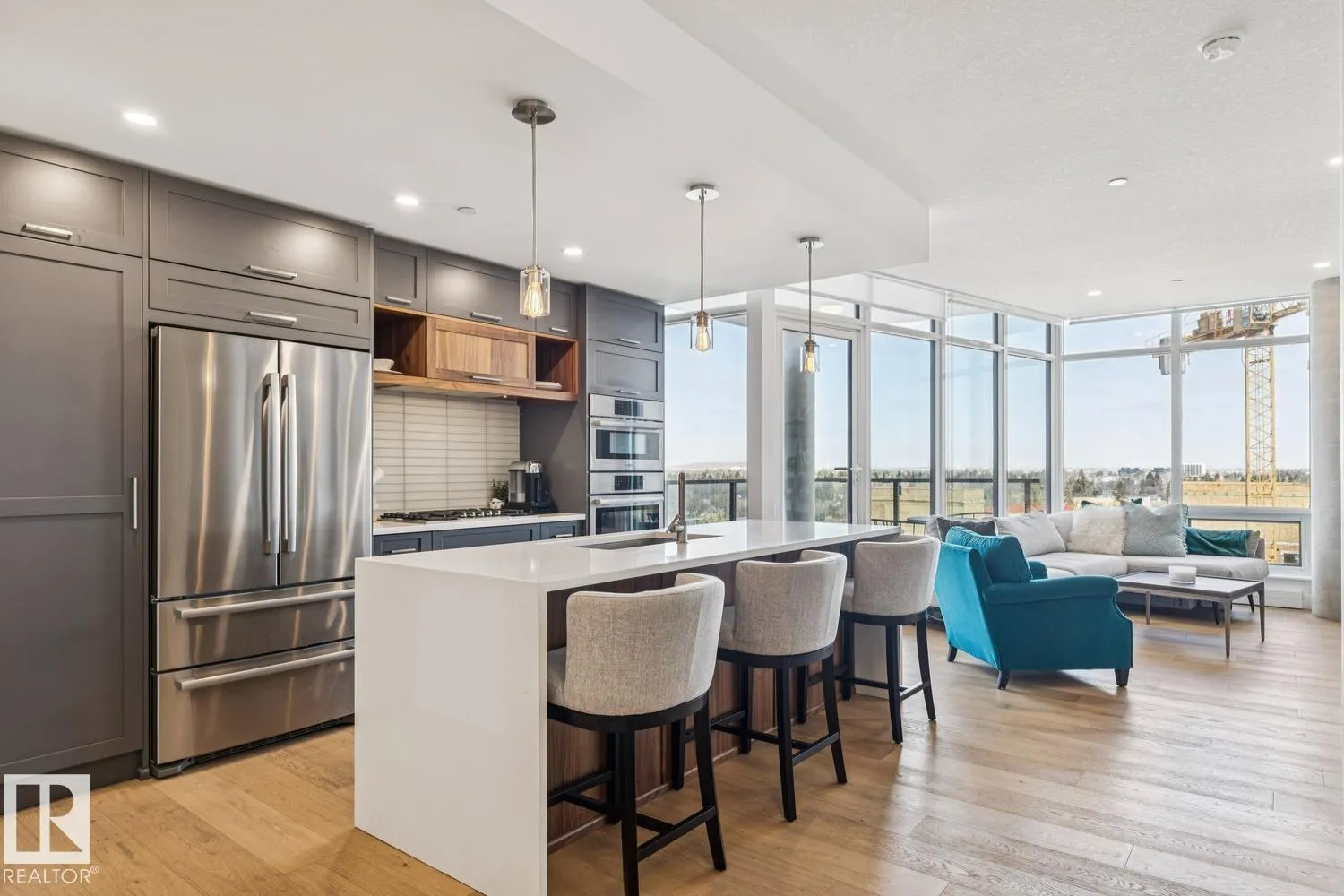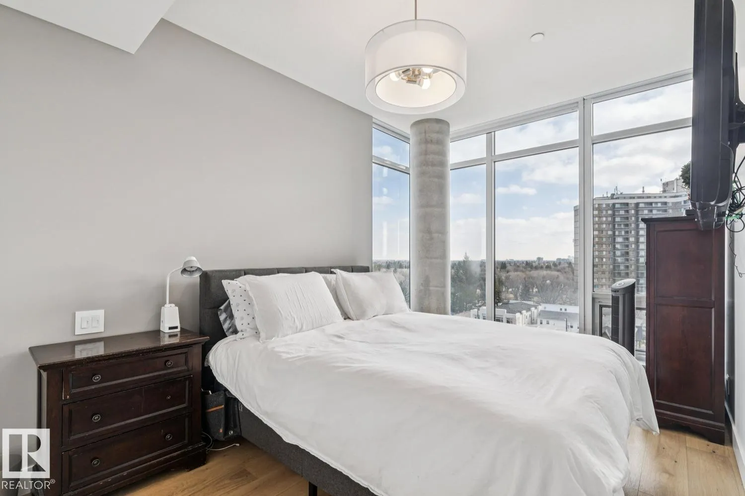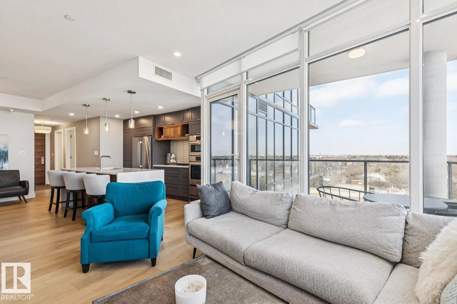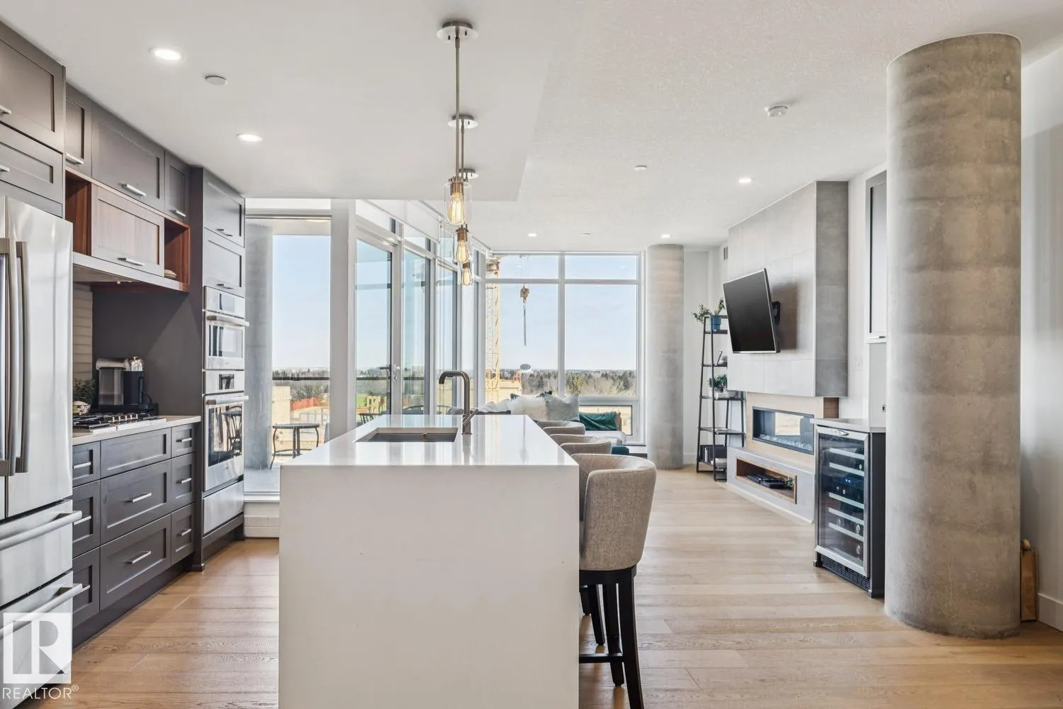 Luxury living at The West Block in Glenora, just minutes to downtown Edmonton. This stunning 7th-floor corner unit offers 2 bedrooms and 2 bathrooms, showcasing high-end finishes throughout, including wide plank hardwood floors and floor-to-ceiling windows with breathtaking skyline views from the northwest-facing balcony. The chef-inspired kitchen features quartz countertops, a gas stove, and a wine barâperfect for entertaining. The primary bedroom includes a spa-like ensuite with a jetted tub & double closets. The second bedroom is equipped with a Murphy bed and wardrobe for added flexibility. Enjoy premium comforts such as in-floor heating in the bathrooms, air conditioning, full-size in-suite laundry, one titled underground parking stall, and a storage cage. Exceptional building amenities include concierge service, a rooftop lounge, indoor games room, guest suite, fitness centre, car dog wash station, and rooftop dog space. (id:27476)