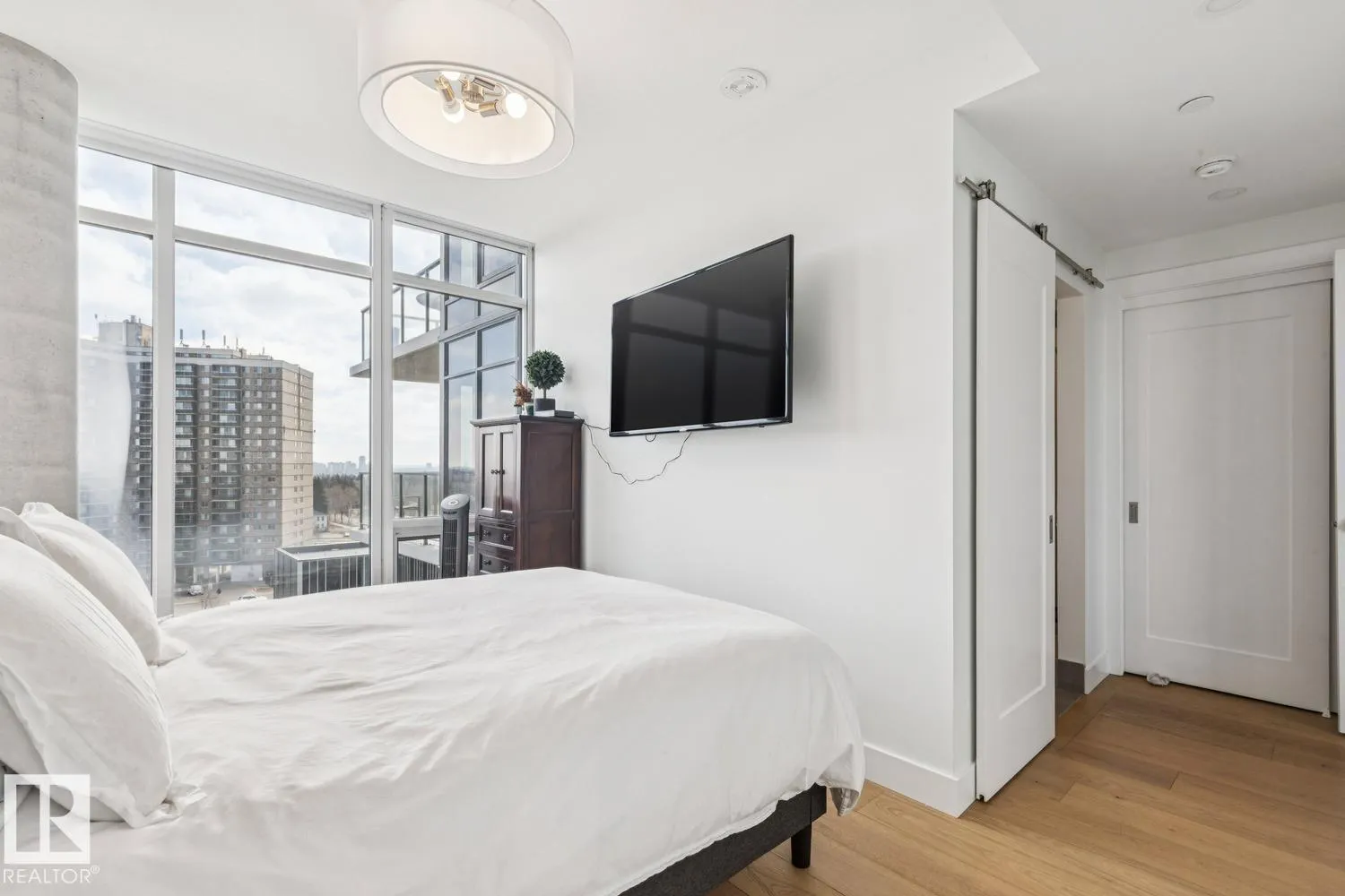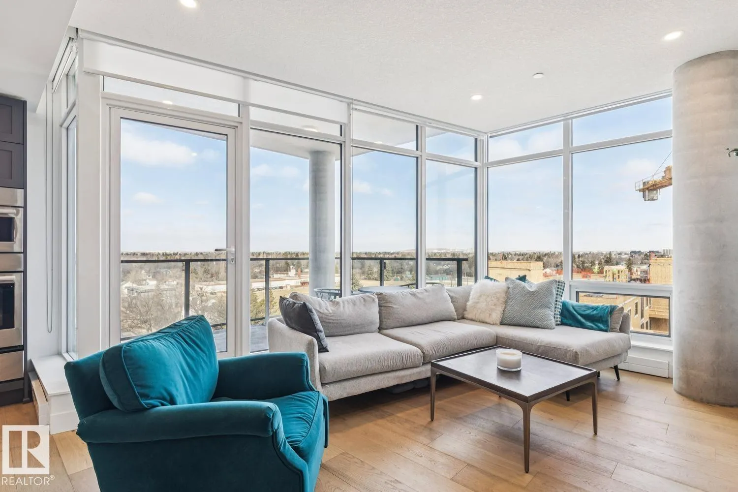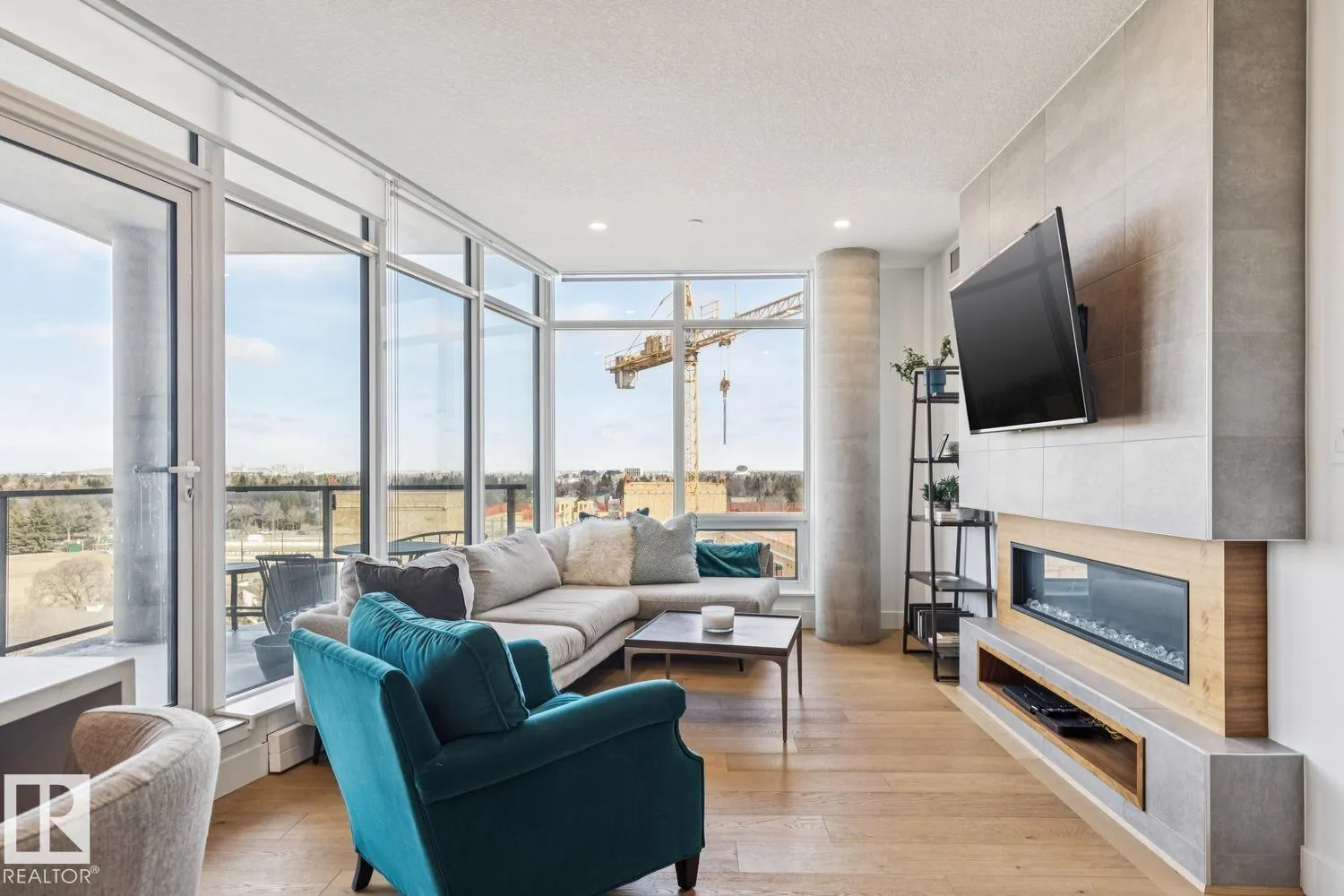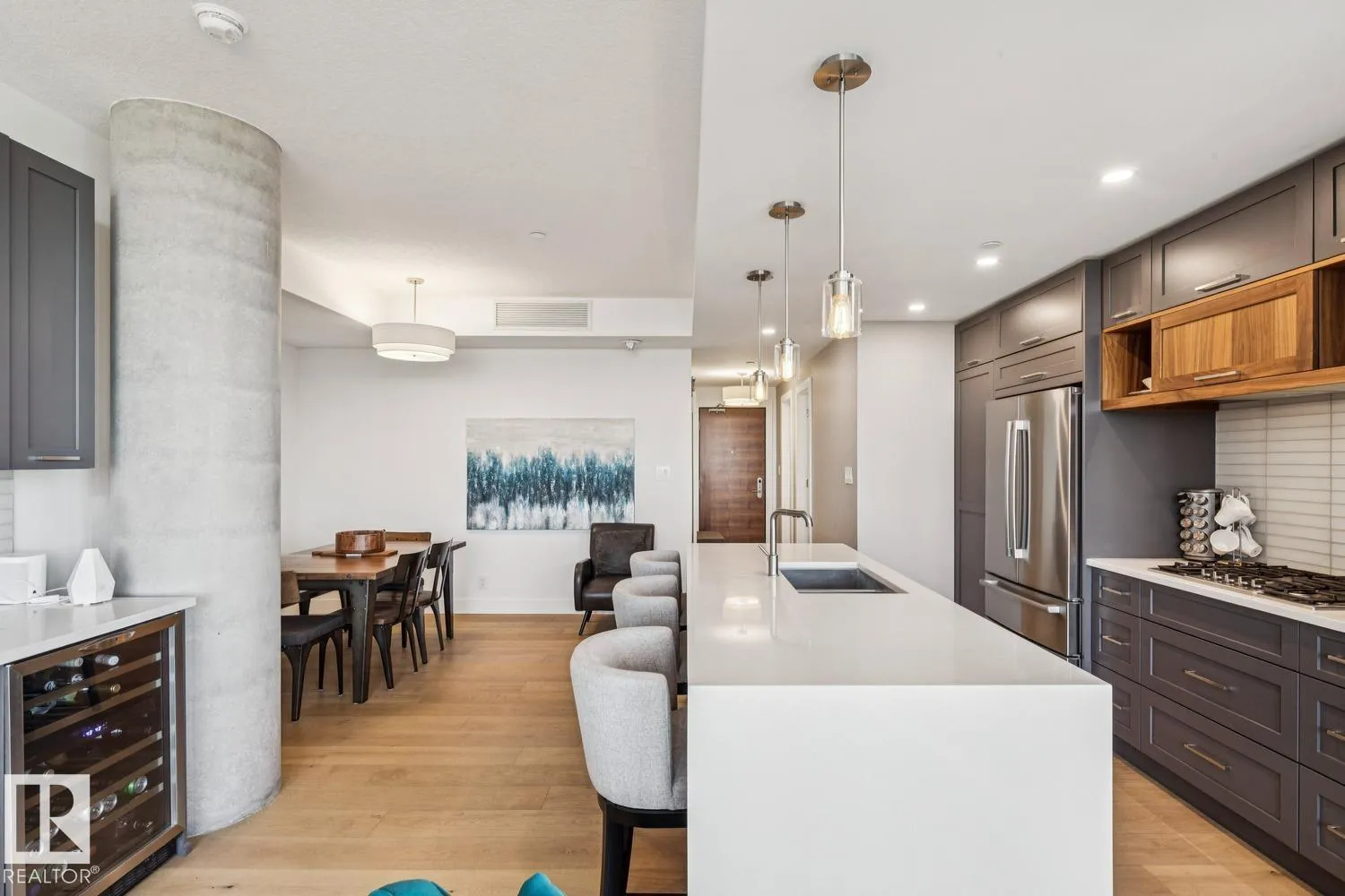 Luxury living at The West Block in Glenora, just minutes to downtown Edmonton. This stunning 7th-floor corner unit offers 2 bedrooms and 2 bathrooms, showcasing high-end finishes throughout, including wide plank hardwood floors and floor-to-ceiling windows with breathtaking skyline views from the northwest-facing balcony. The chef-inspired kitchen features quartz countertops, a gas stove, and a wine barâperfect for entertaining. The primary bedroom includes a spa-like ensuite with a jetted tub & double closets. The second bedroom is equipped with a Murphy bed and wardrobe for added flexibility. Enjoy premium comforts such as in-floor heating in the bathrooms, air conditioning, full-size in-suite laundry, one titled underground parking stall, and a storage cage. Exceptional building amenities include concierge service, a rooftop lounge, indoor games room, guest suite, fitness centre, car dog wash station, and rooftop dog space. (id:27476)