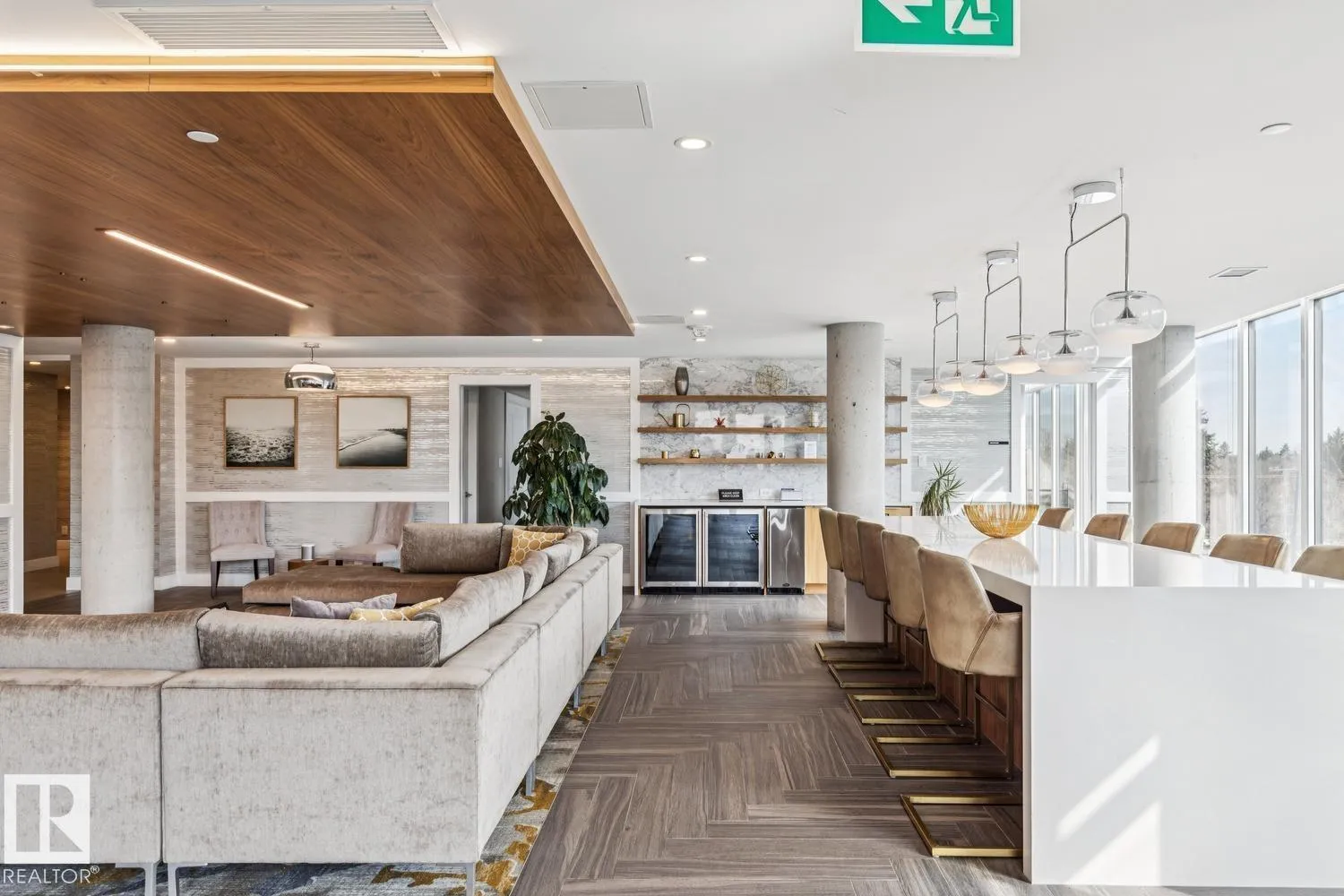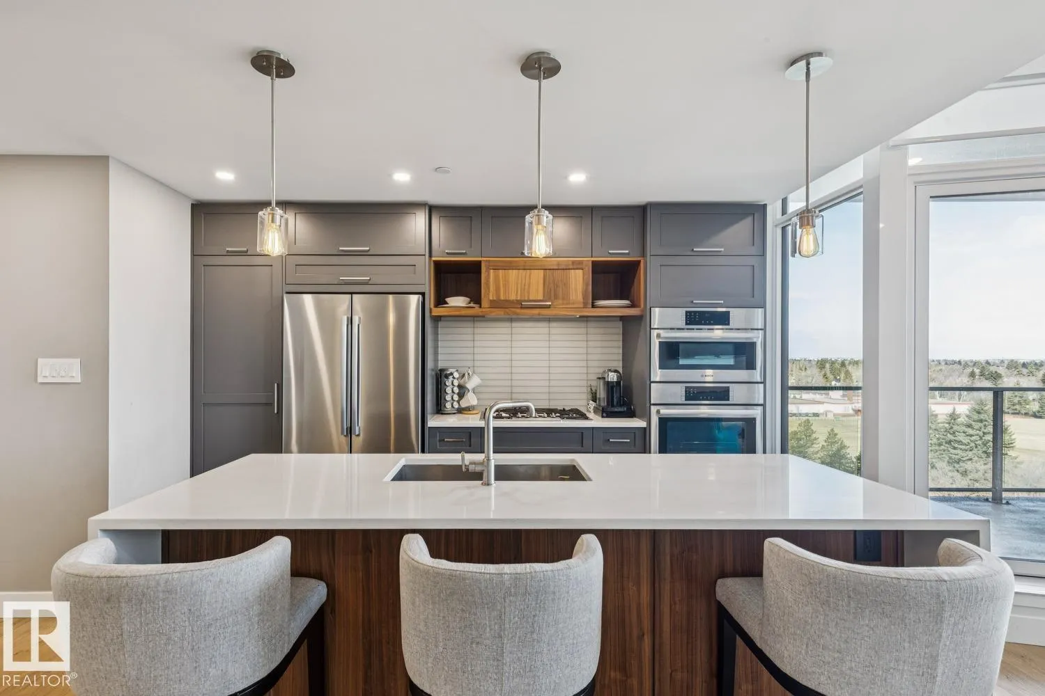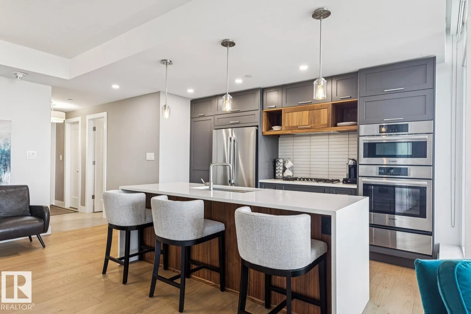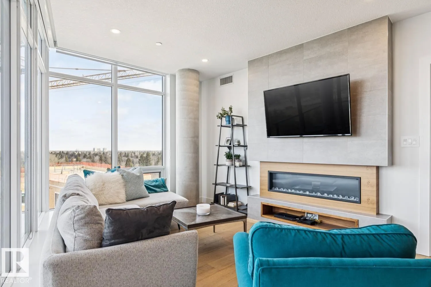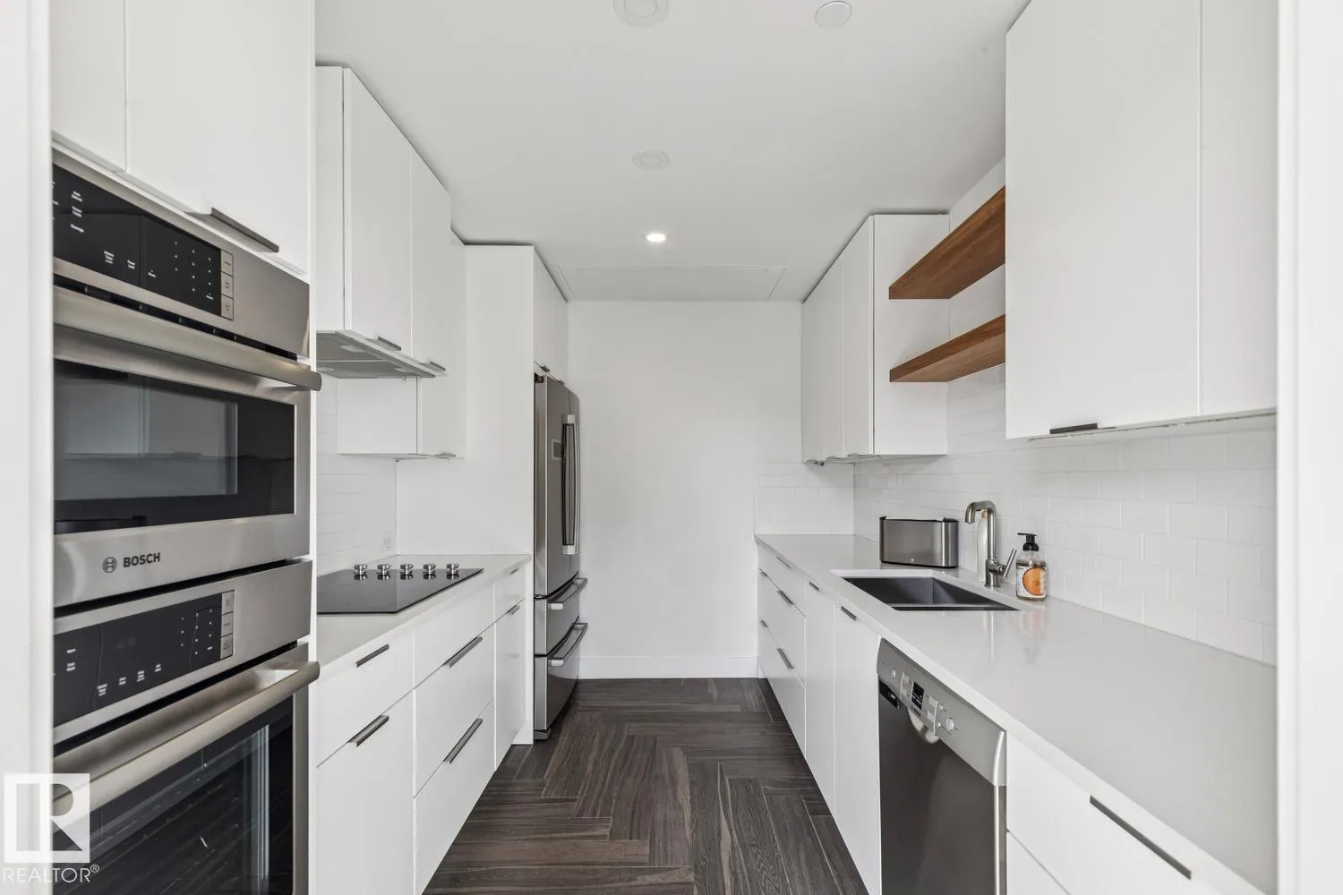 Luxury living at The West Block in Glenora, just minutes to downtown Edmonton. This stunning 7th-floor corner unit offers 2 bedrooms and 2 bathrooms, showcasing high-end finishes throughout, including wide plank hardwood floors and floor-to-ceiling windows with breathtaking skyline views from the northwest-facing balcony. The chef-inspired kitchen features quartz countertops, a gas stove, and a wine barâperfect for entertaining. The primary bedroom includes a spa-like ensuite with a jetted tub & double closets. The second bedroom is equipped with a Murphy bed and wardrobe for added flexibility. Enjoy premium comforts such as in-floor heating in the bathrooms, air conditioning, full-size in-suite laundry, one titled underground parking stall, and a storage cage. Exceptional building amenities include concierge service, a rooftop lounge, indoor games room, guest suite, fitness centre, car dog wash station, and rooftop dog space. (id:27476)