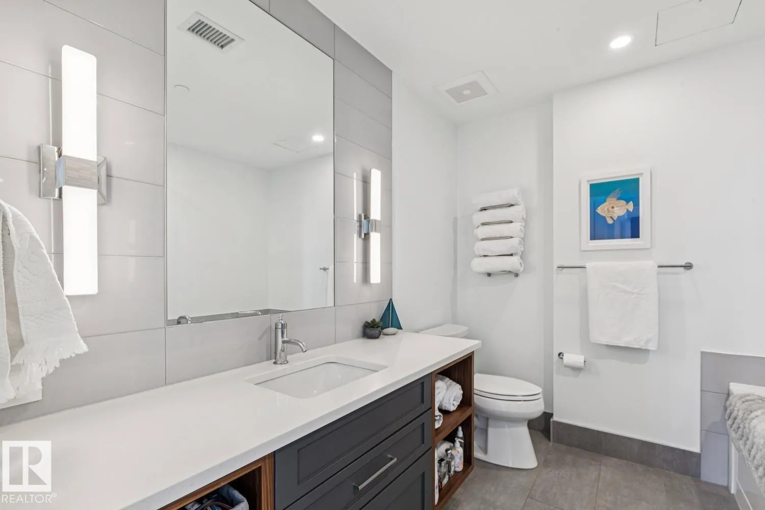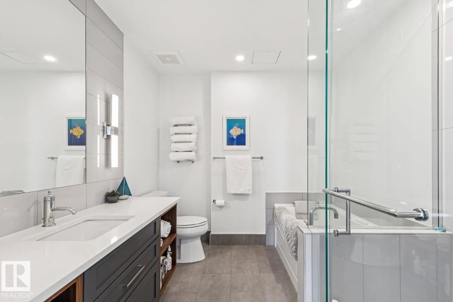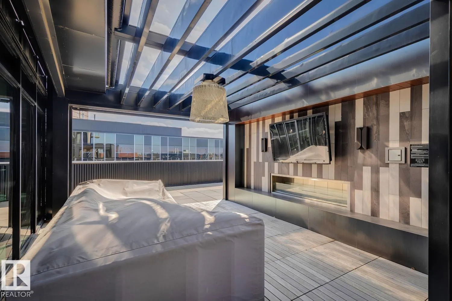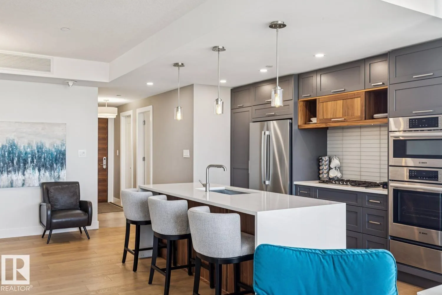 Luxury living at The West Block in Glenora, just minutes to downtown Edmonton. This stunning 7th-floor corner unit offers 2 bedrooms and 2 bathrooms, showcasing high-end finishes throughout, including wide plank hardwood floors and floor-to-ceiling windows with breathtaking skyline views from the northwest-facing balcony. The chef-inspired kitchen features quartz countertops, a gas stove, and a wine barâperfect for entertaining. The primary bedroom includes a spa-like ensuite with a jetted tub & double closets. The second bedroom is equipped with a Murphy bed and wardrobe for added flexibility. Enjoy premium comforts such as in-floor heating in the bathrooms, air conditioning, full-size in-suite laundry, one titled underground parking stall, and a storage cage. Exceptional building amenities include concierge service, a rooftop lounge, indoor games room, guest suite, fitness centre, car dog wash station, and rooftop dog space. (id:27476)