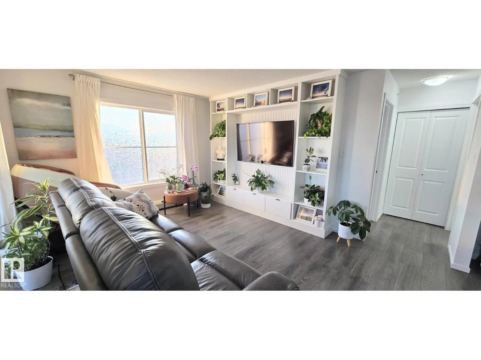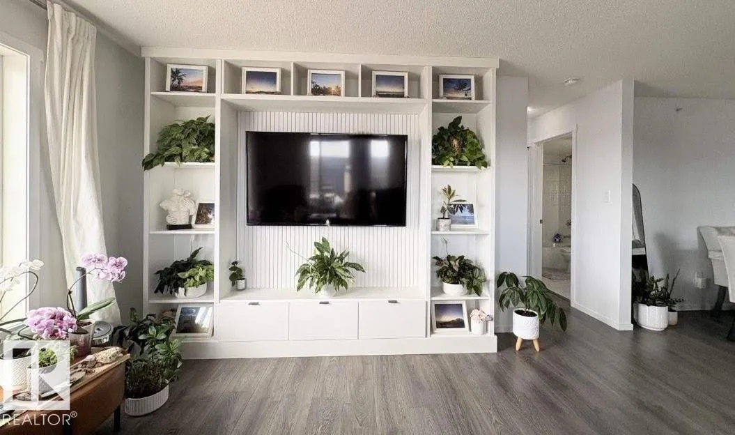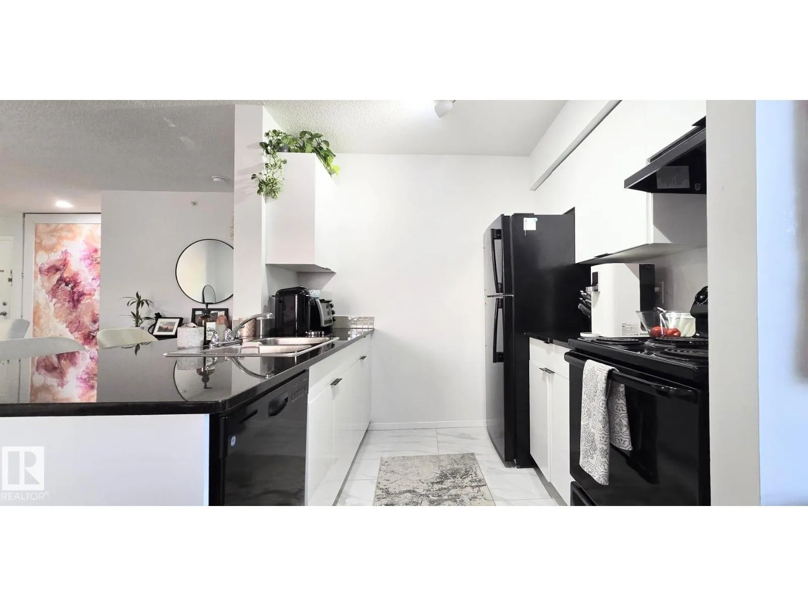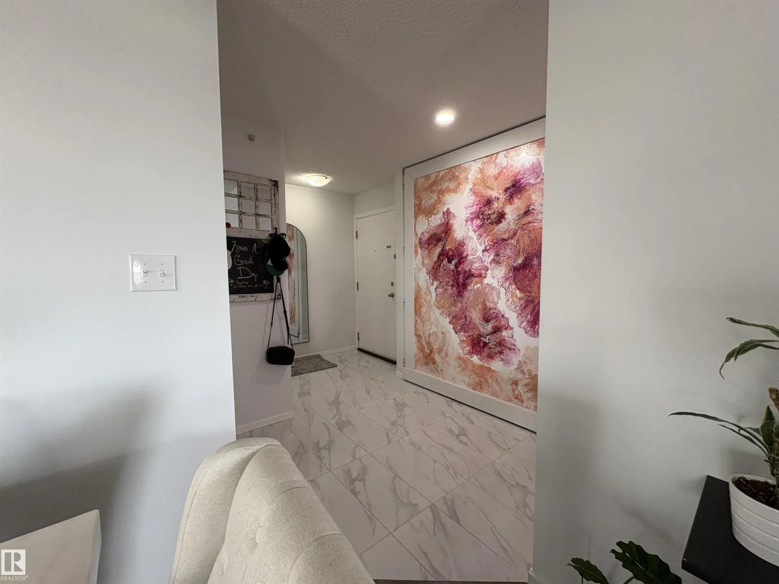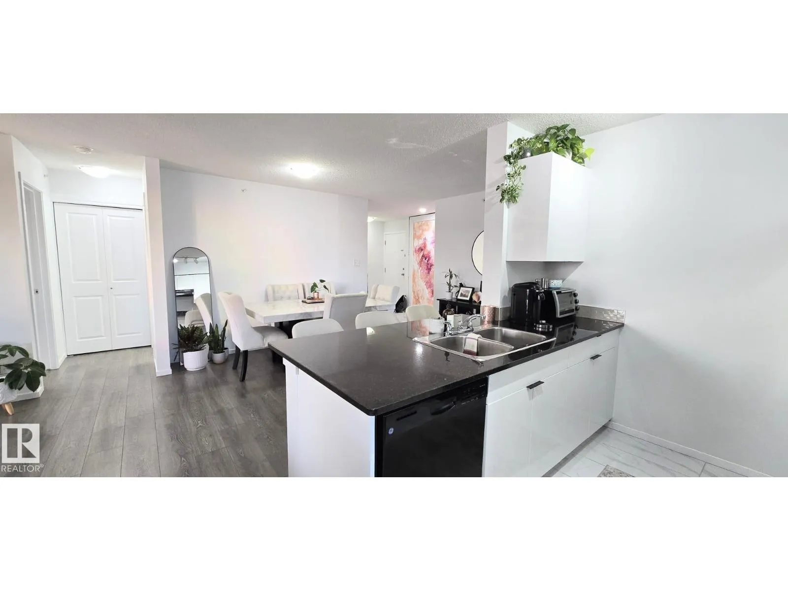Bright, sunny top-floor corner unit with 2 bedrooms, 2 baths, den with desirable south-west exposure with lake views! This beautifully renovated home features a brand-new kitchen with quartz countertops, ceramic tile floors, fresh paint, plush carpeting, updated bathrooms, and stylish lighting throughout, as well as a custom-built-in TV wall unit and a new washer-dryer. All renovations have been completed within the last year, offering modern comfort and peace of mind. Step out onto the private deck and enjoy the serene surroundings and downtown skyline view. This spacious layout includes two bedrooms plus a den/office, with loads of windows that flood the home with natural light. A cleverly designed hidden office adds both functionality and charm, making this space truly unique. Includes a titled heated underground parking stall for added comfort and convenience. Shows fantasticâmove-in ready! (id:27476)